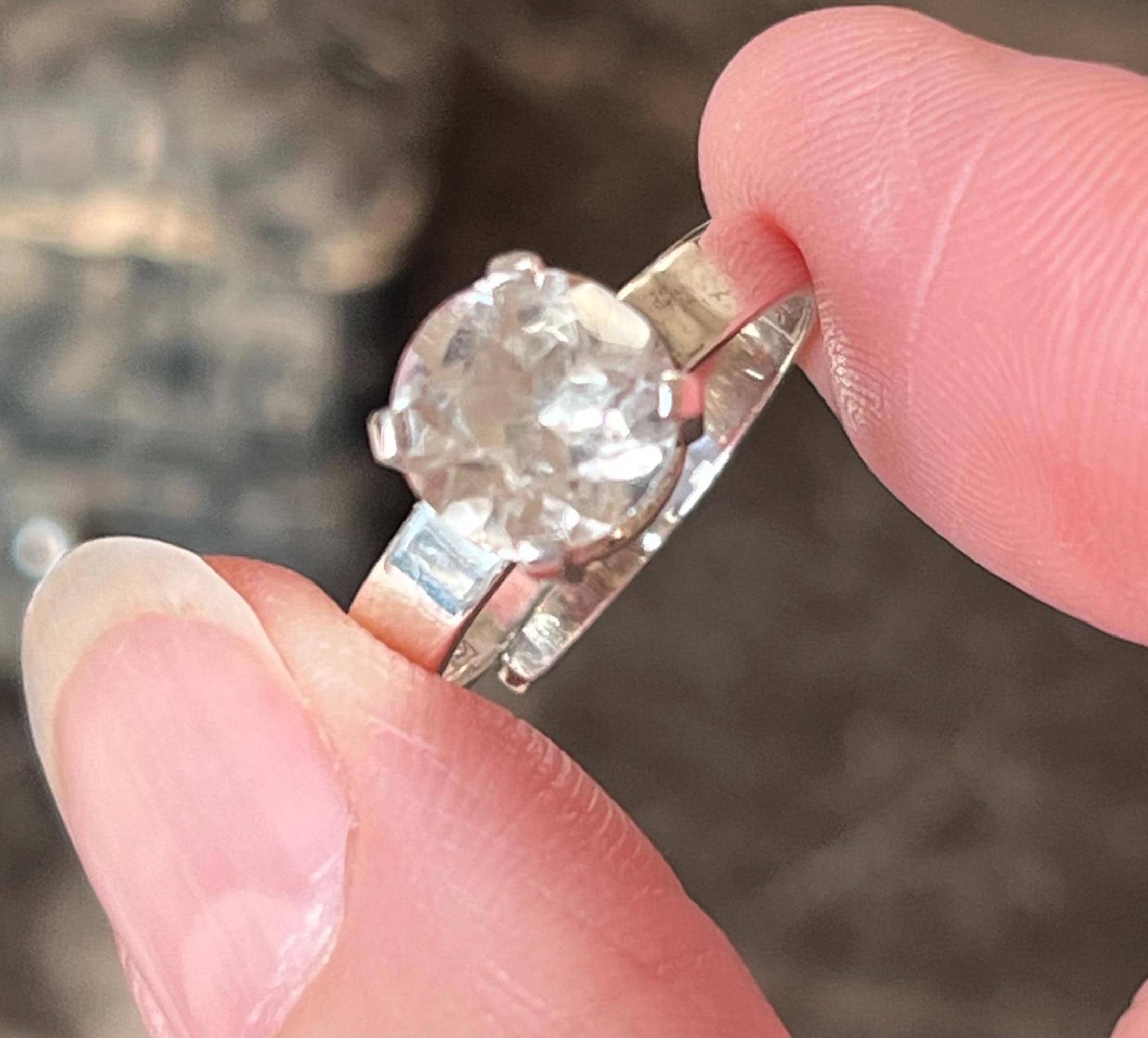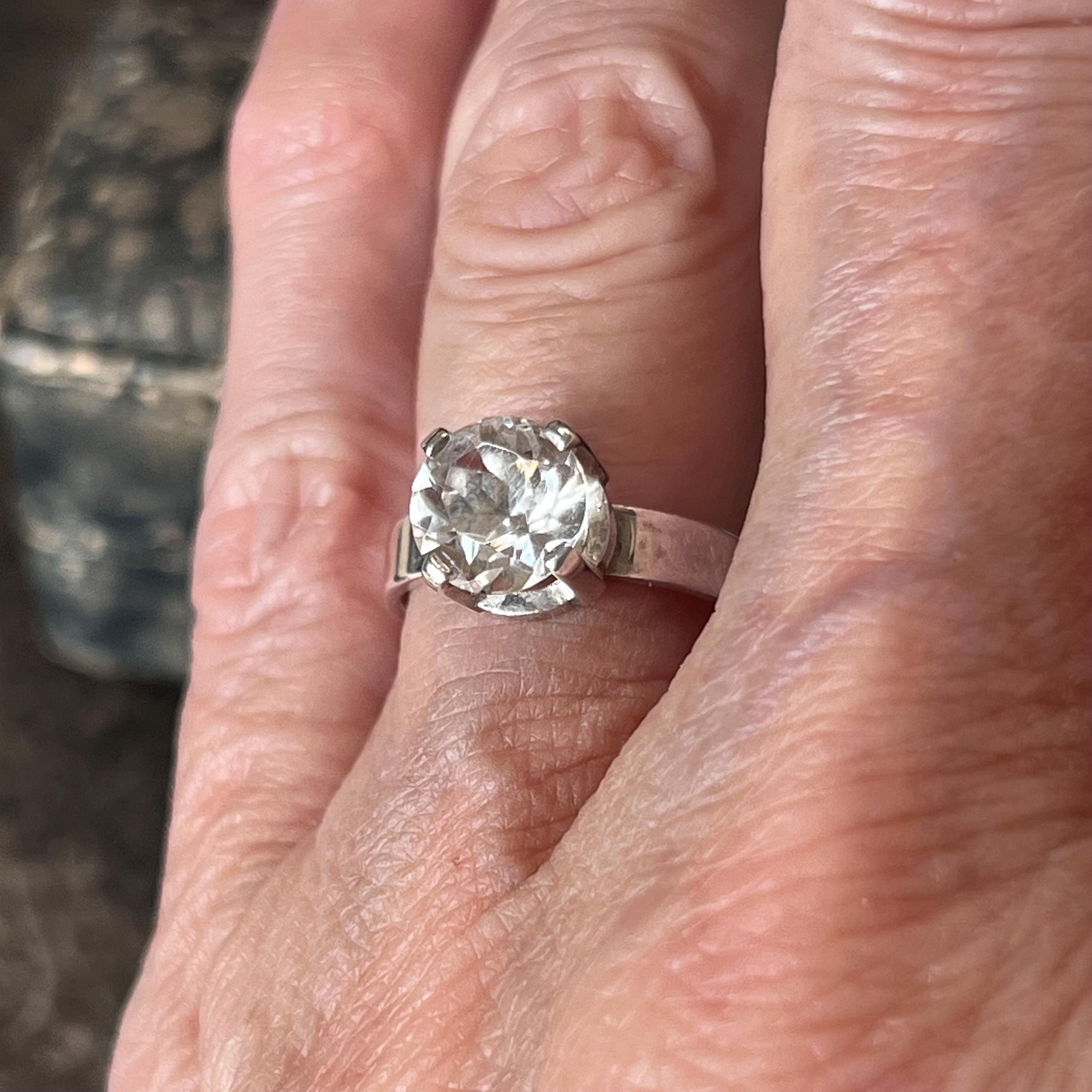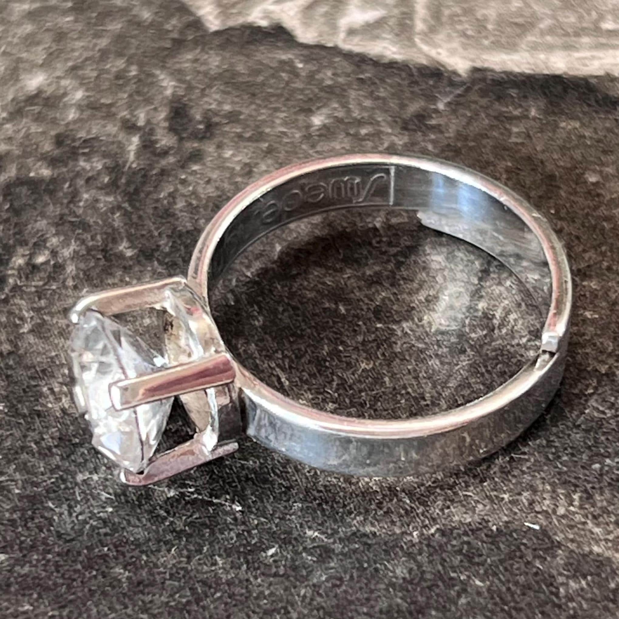 A striking vintage Swedish rock crystal ring by renowned designer Bengt Hallberg, crafted circa 1975 in solid 925 sterling silver. This collectible Scandinavian piece features a 7.5 mm round-cut rock crystal, sparkling with crisp, icy brilliance. Fully stamped ‘BeH’ (Bengt Hallberg), ‘Swedesign’, ‘925S’, and ‘BSP’ for Bent Stausholm Polsen of Denmark, confirming authenticity and origin.