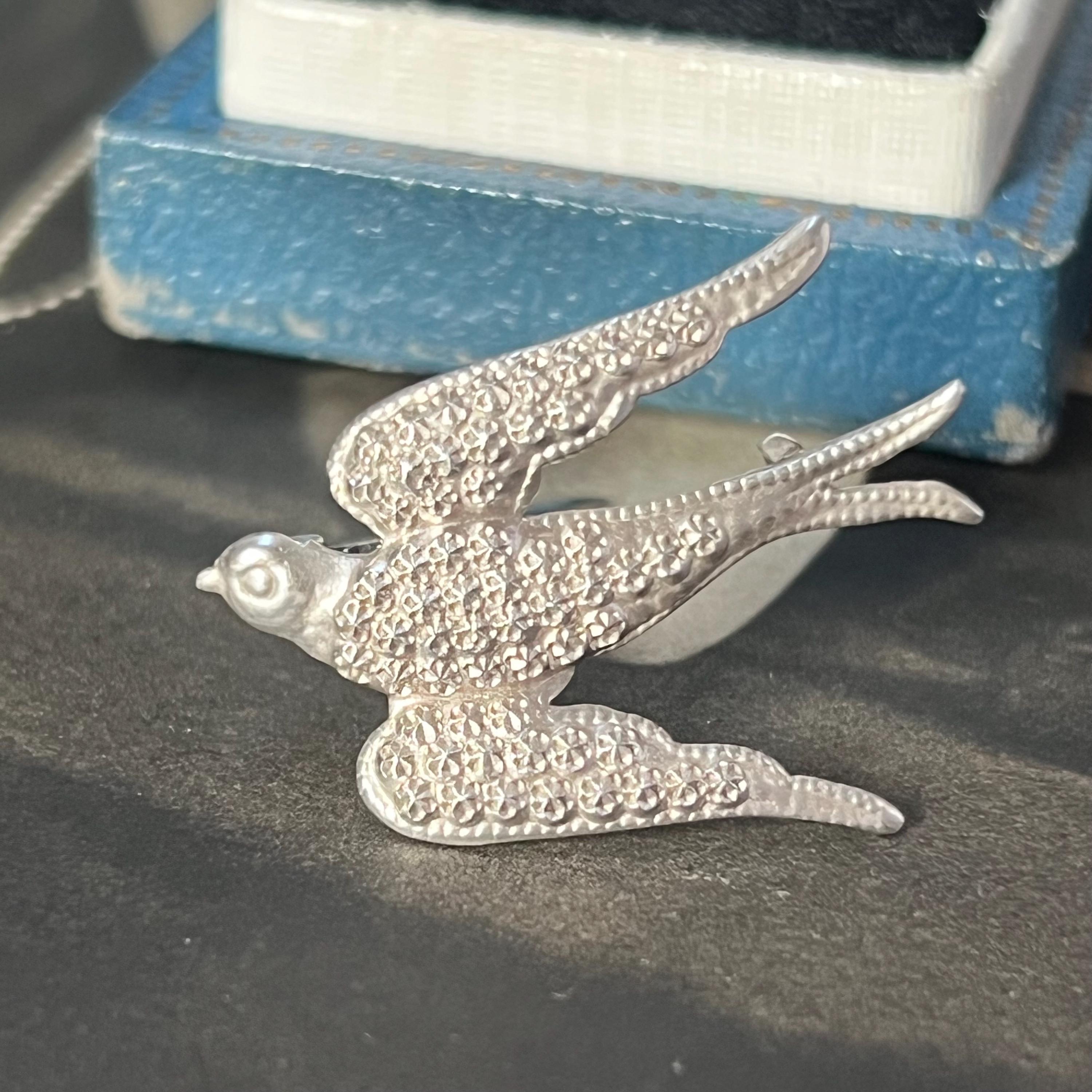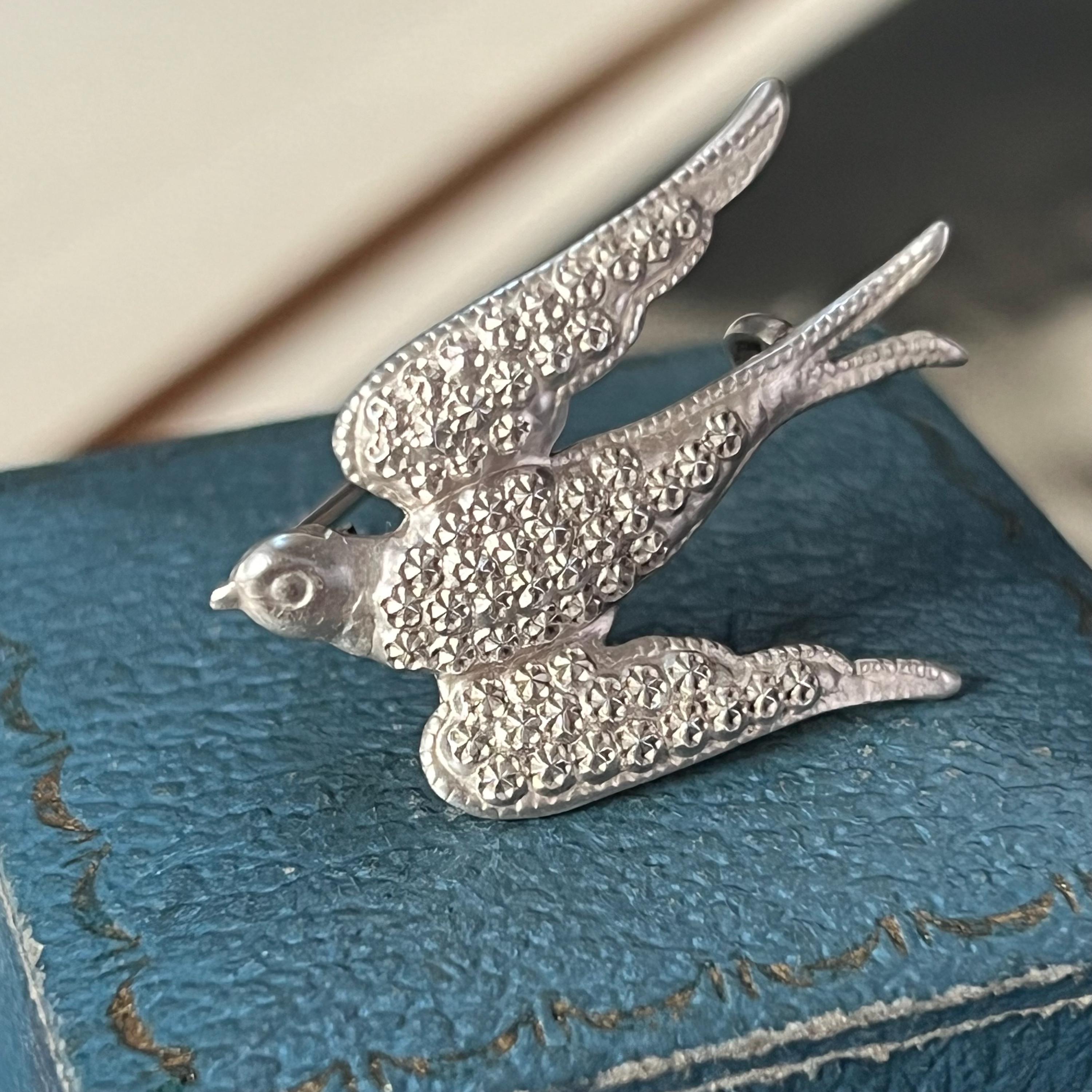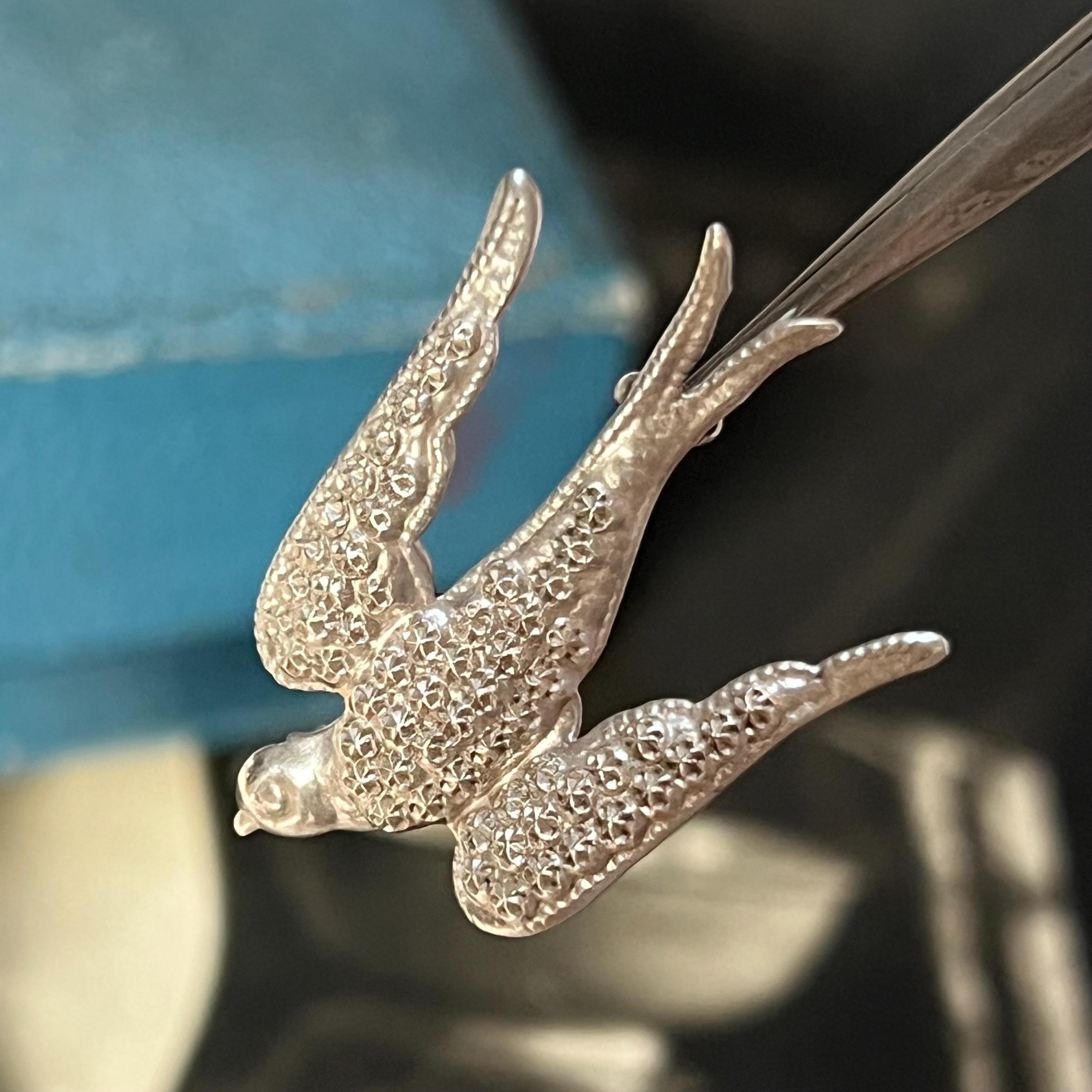 A charming Victorian antique silver swallow brooch, featuring a beautifully detailed bird in flight crafted from lightweight pressed silver, a popular technique of the late 19th century during the rise of industrial jewellery making. The textured raised star-pattern finish mimics repousse work, giving this small brooch impressive depth and sparkle. Measuring 29.5 mm from beak to tail and 22.5 mm across, it secures with an original C-hook fastener, typical of genuine Victorian pieces. Symbolic Victorian swallow motif representing love, loyalty, and safe return. Hidden meanings are a unique part of antique jewellery design.