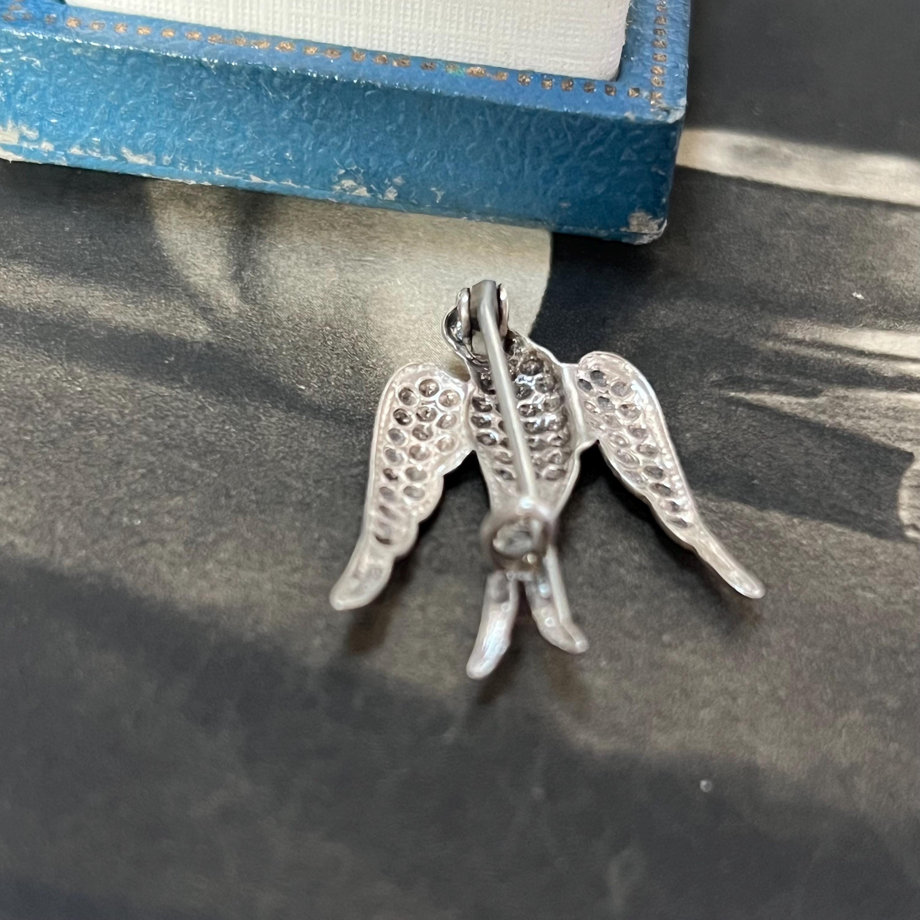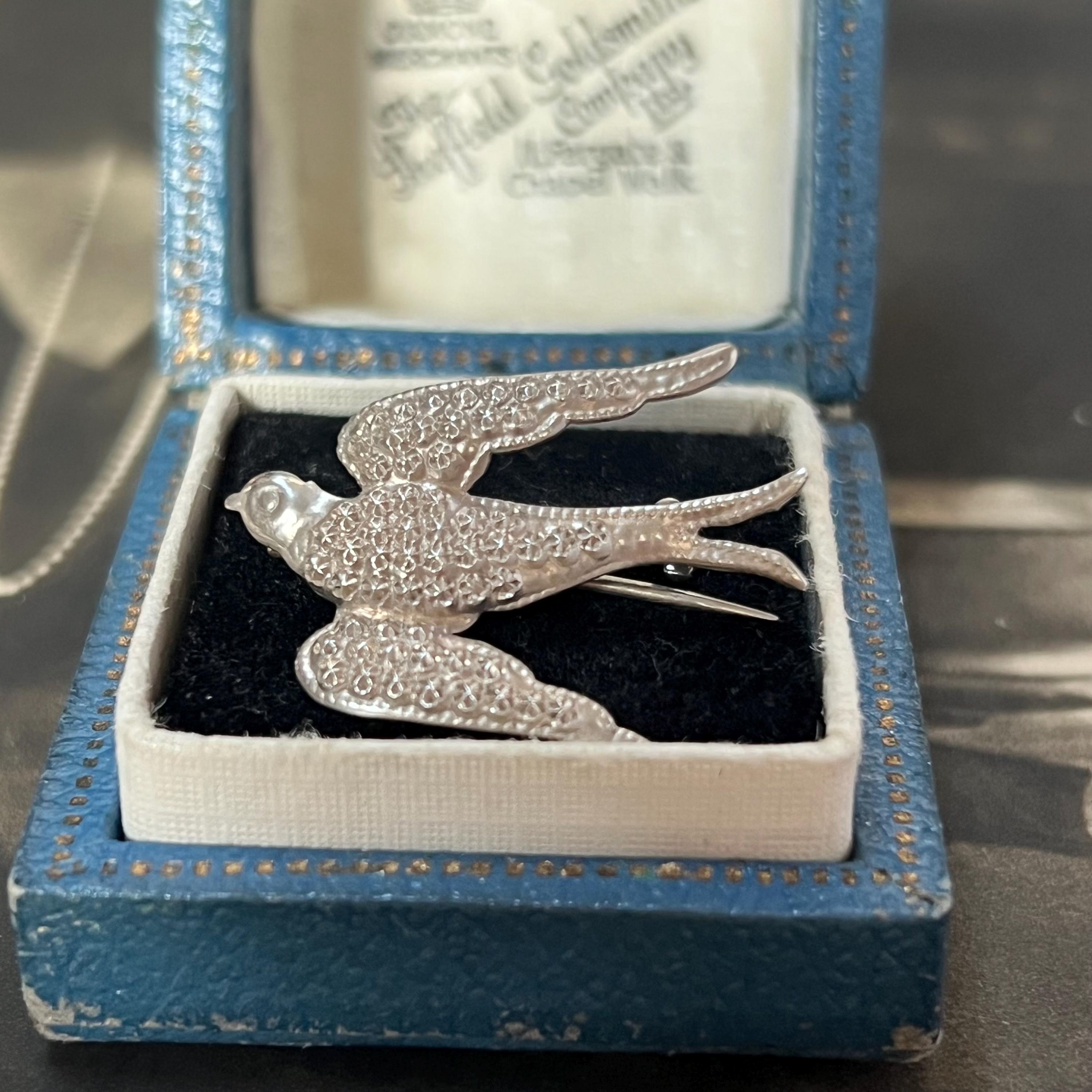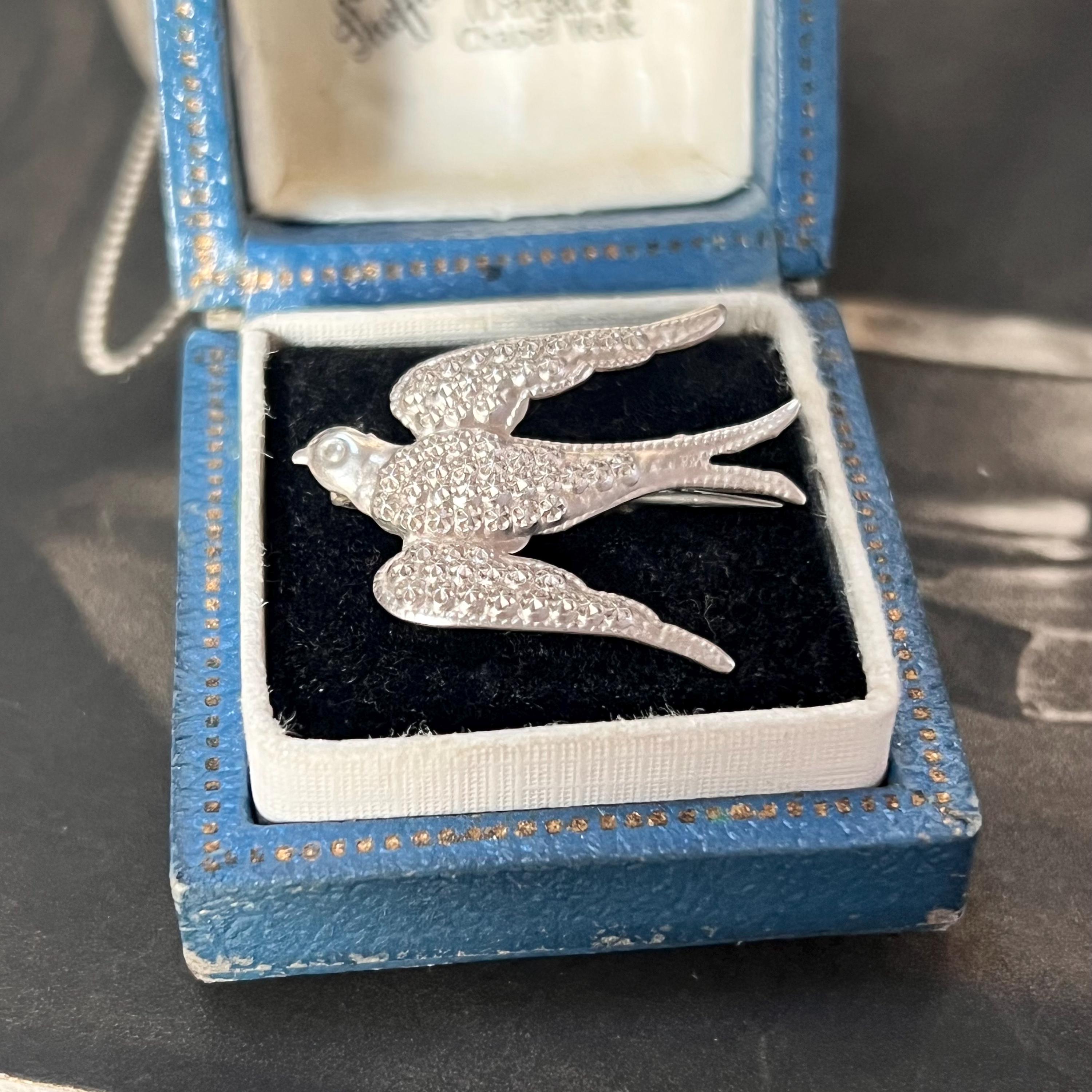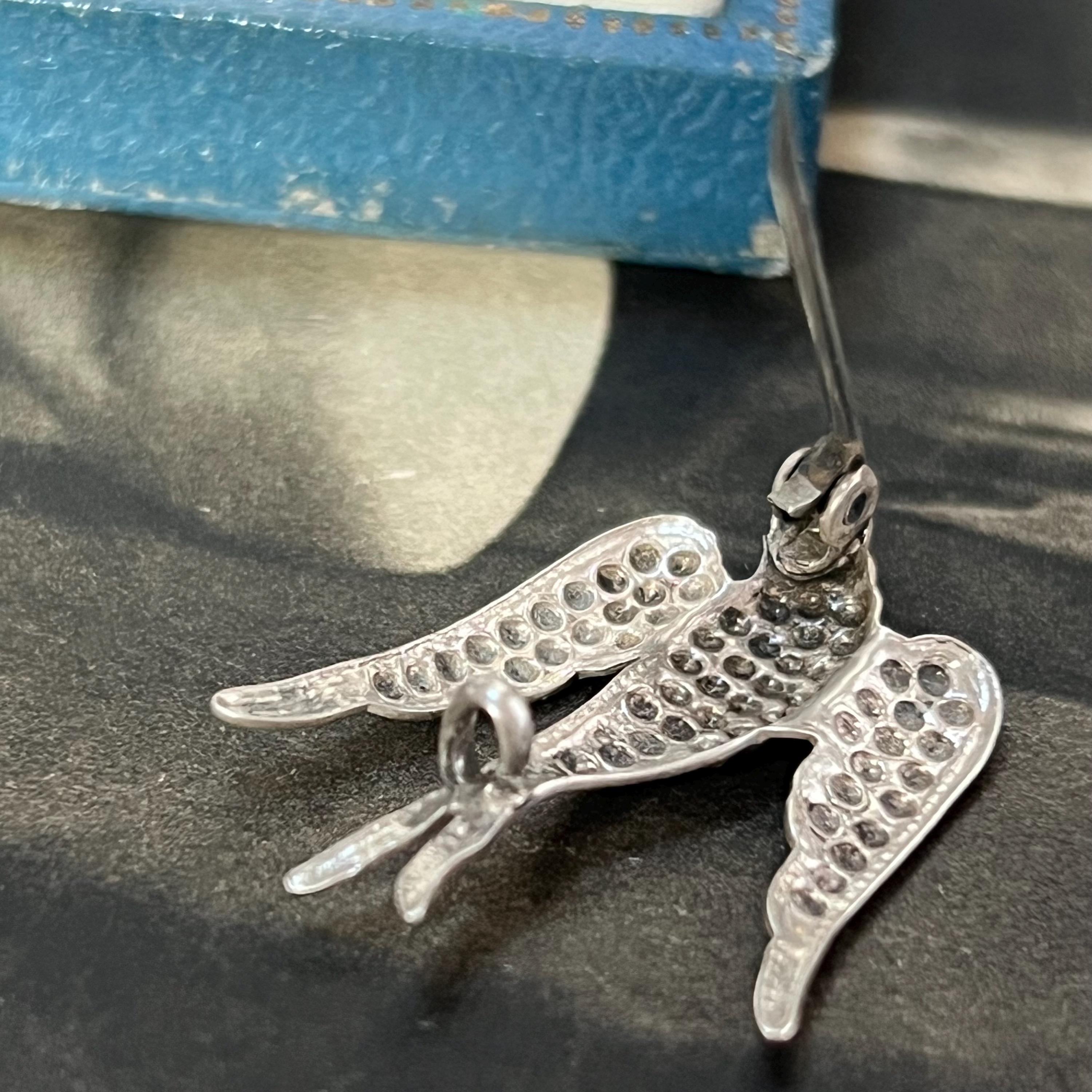 A charming Victorian antique silver swallow brooch, featuring a beautifully detailed bird in flight crafted from lightweight pressed silver, a popular technique of the late 19th century during the rise of industrial jewellery making. The textured raised star-pattern finish mimics repousse work, giving this small brooch impressive depth and sparkle. Measuring 29.5 mm from beak to tail and 22.5 mm across, it secures with an original C-hook fastener, typical of genuine Victorian pieces. Symbolic Victorian swallow motif representing love, loyalty, and safe return. Hidden meanings are a unique part of antique jewellery design.