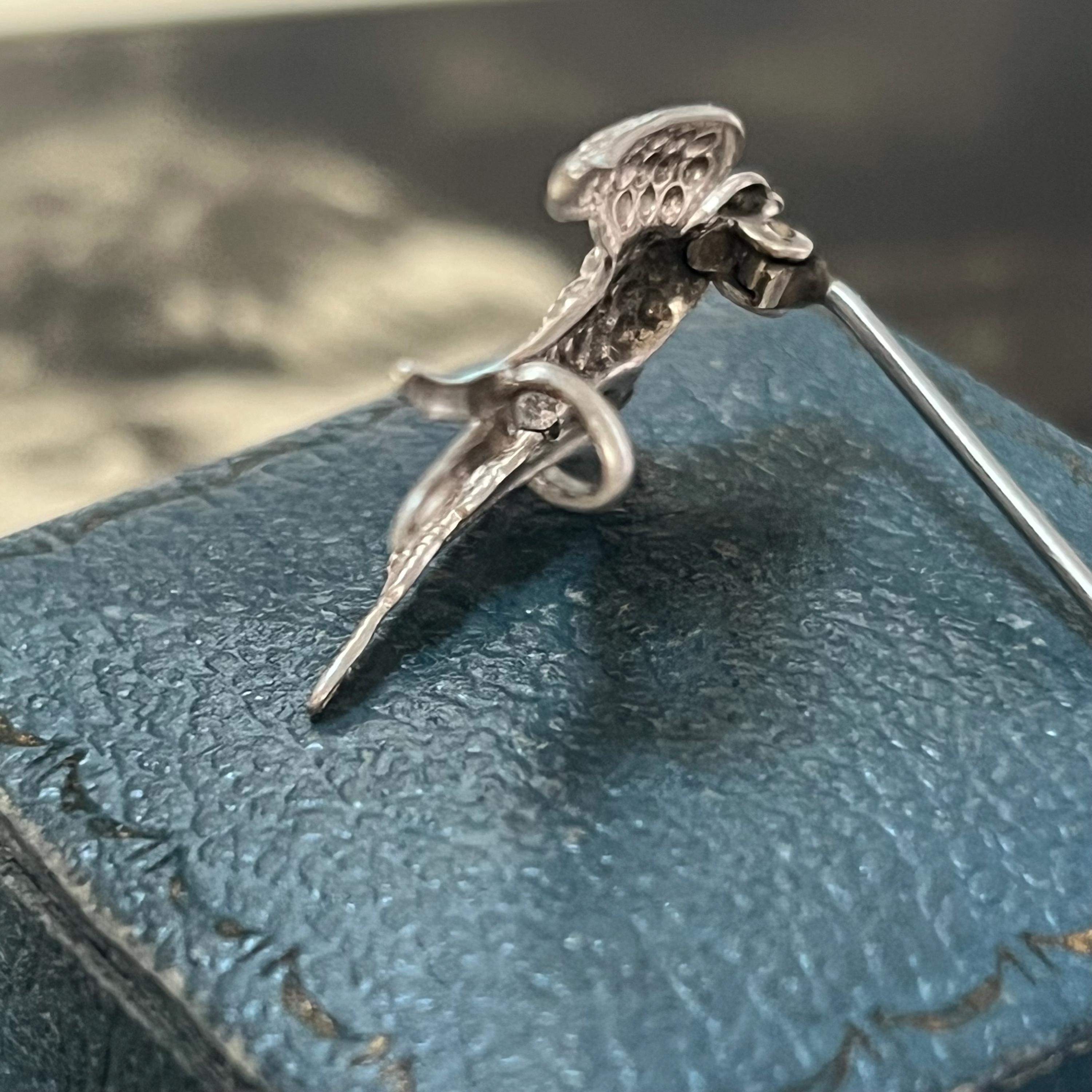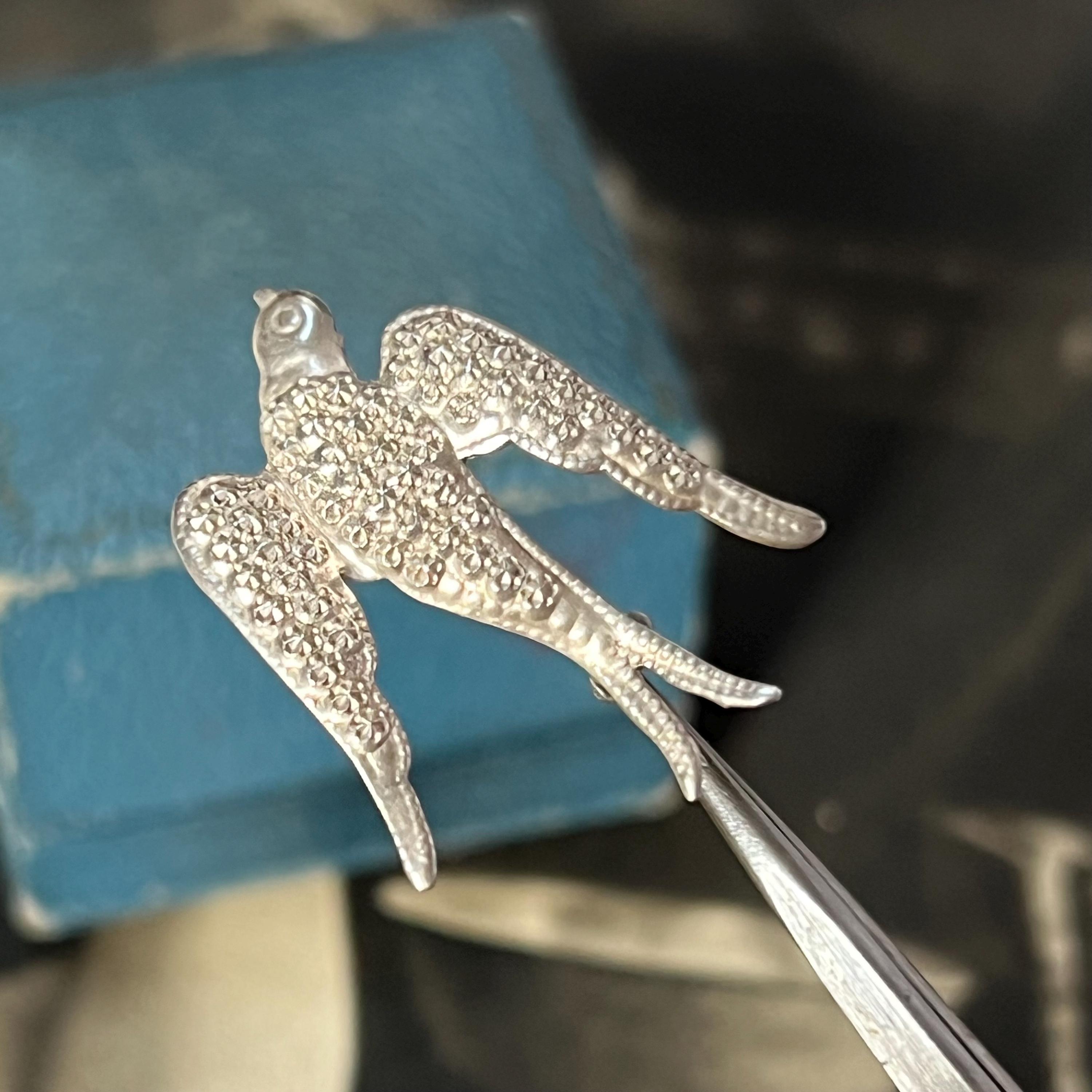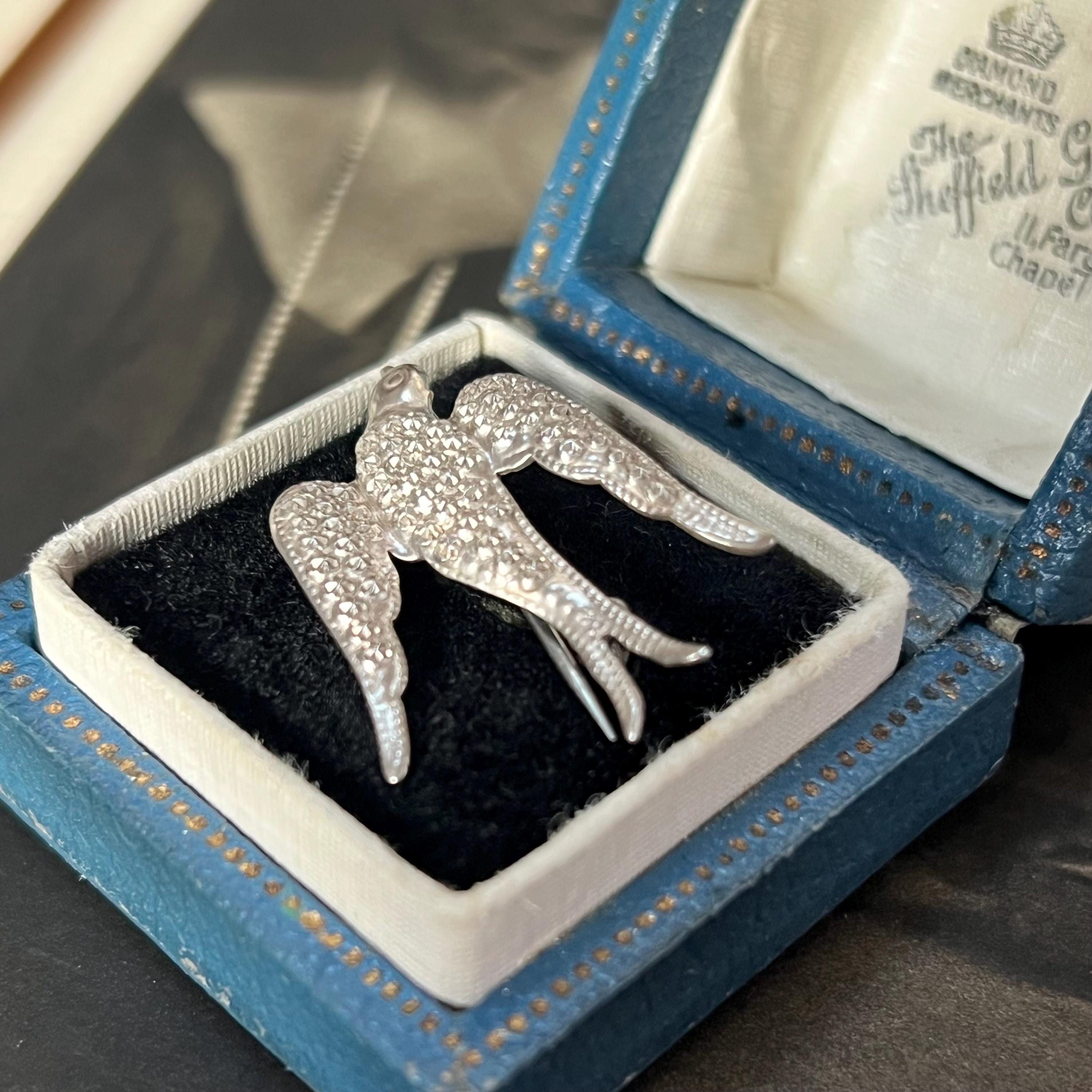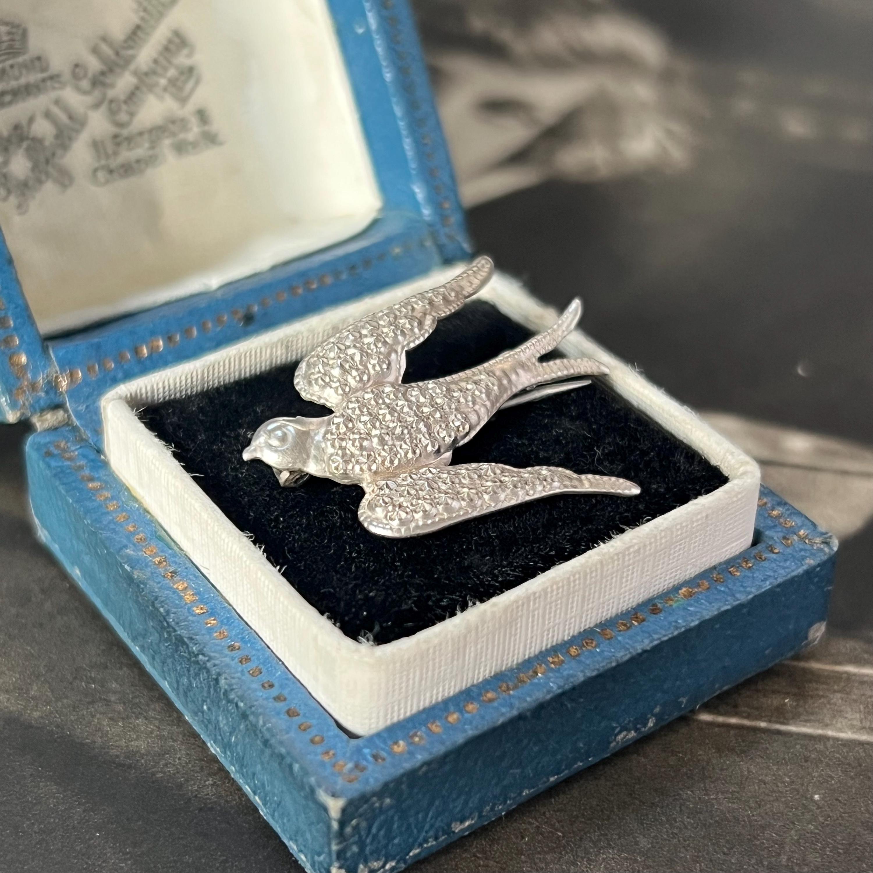 Weighing just 1.6 grams, this delicate swallow dress pin comes presented in a blue antique blue box with worn gold detailing and interior stamped The Sheffield Goldsmith Company Ltd, Diamond Merchants. A beautiful and unusual collector’s brooch—full of history, symbolism, and Victorian charm.