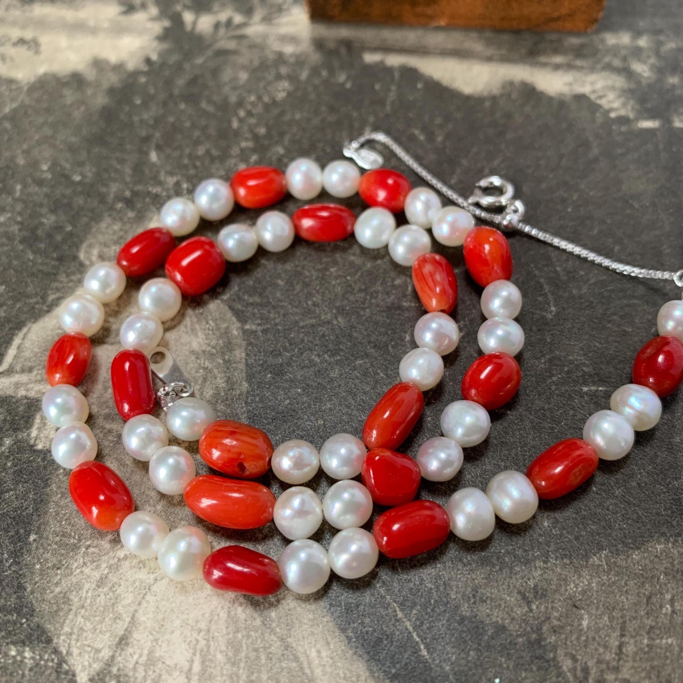 Beautiful red coral and white freshwater pearl necklace with sterling silver 925 clasp and fittings. This lovely necklace is made from richly coloured tumbled coral gemstone beads that are approx 7mm which are white coral dyed red and are ‘A’ grade quality. The freshwater pearls are white and approx 5mm in size and are also a superior quality having a superb lustre and reflective luminosity. This lovely necklace has a sterling silver chain fastener to its end (stamped 925) which has a unique slider action to the chain which allows it to extend it from 37 cm - to approx 42 cm at its longest.