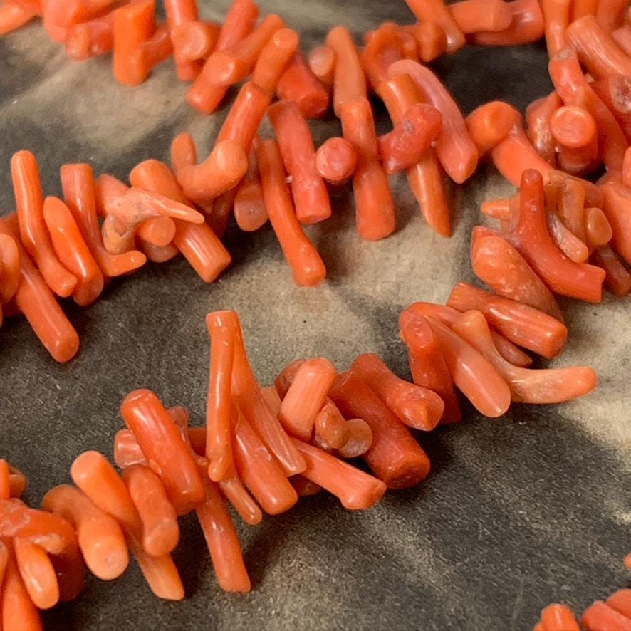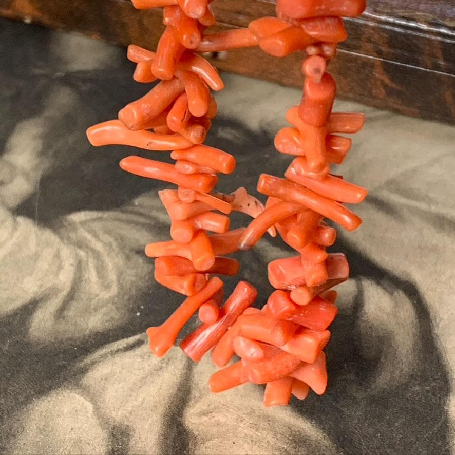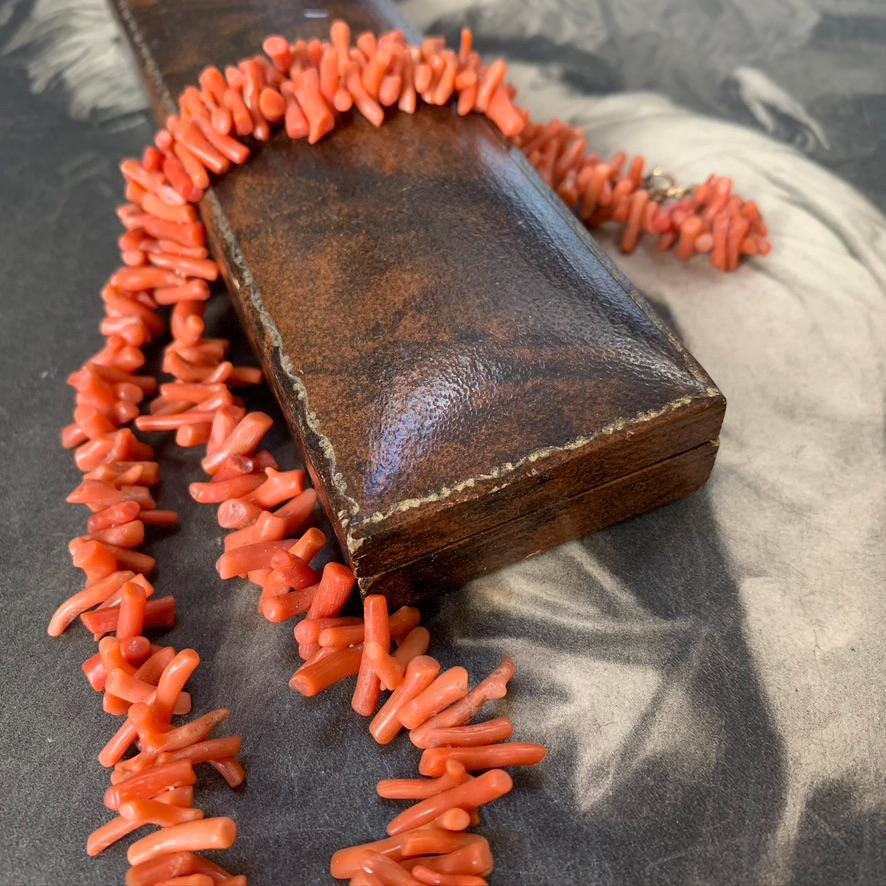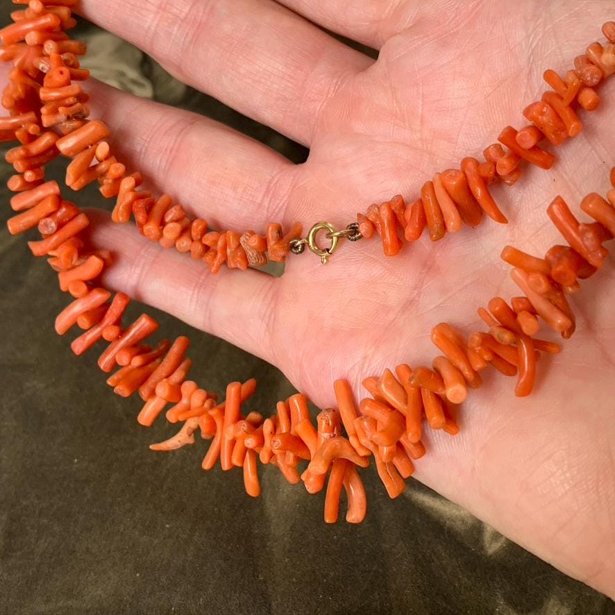 The elegance of the Art Deco era - 9ct gold natural graduated coral branch necklace, crafted in the early 20th century. This striking necklace features fine natural orange coral branches, carefully graduated for a balanced, organic look. Each coral branch is unique, showcasing natural texture and rich colour. The necklace is fitted with a 9ct gold bolt-ring clasp, stamped 9ct, adding a touch of warm vintage luxury. Colour Variation: Natural coral exhibit subtle colour inconsistencies or minor white streaks, and these variations, along with the striations, are normal characteristics of top-quality, untreated coral.
