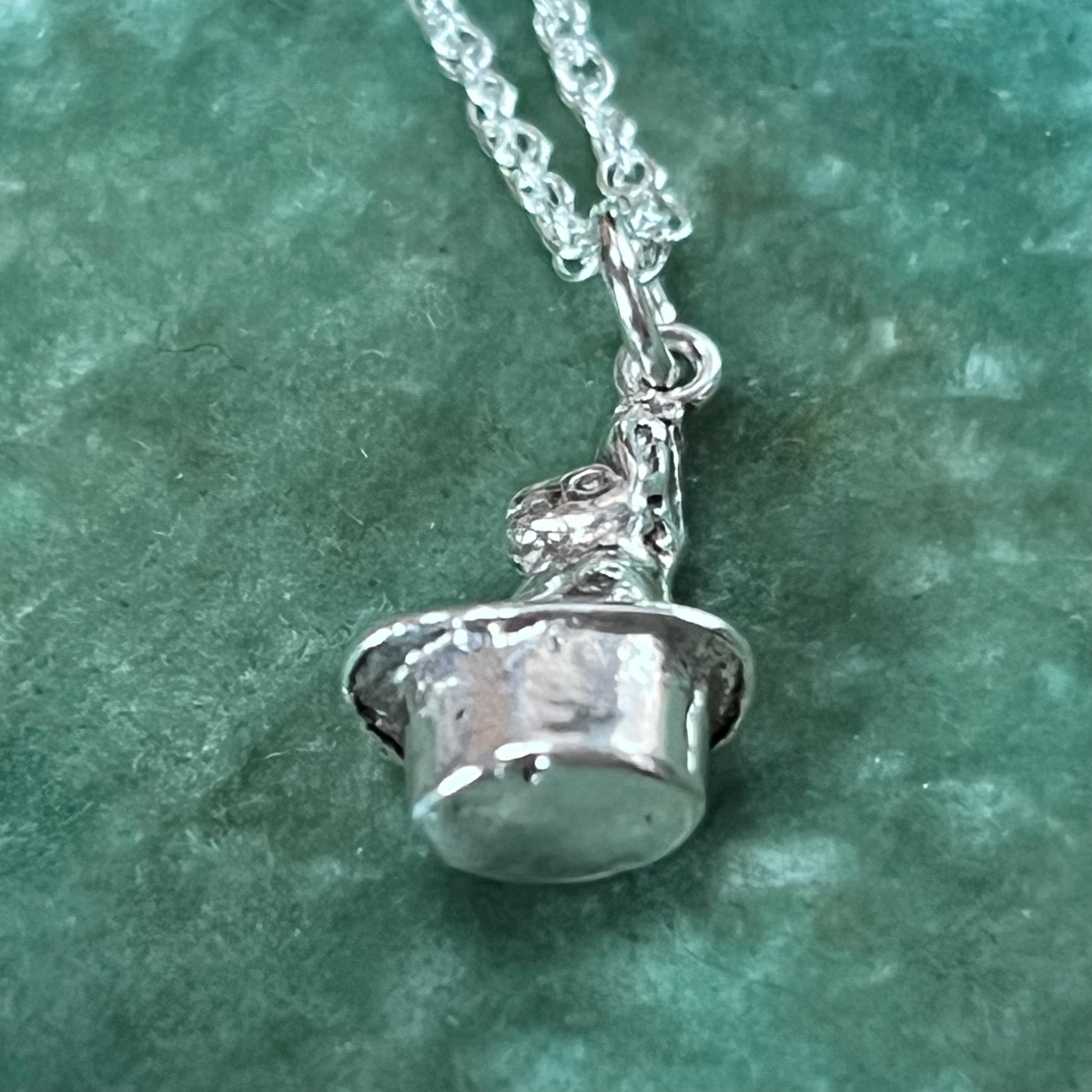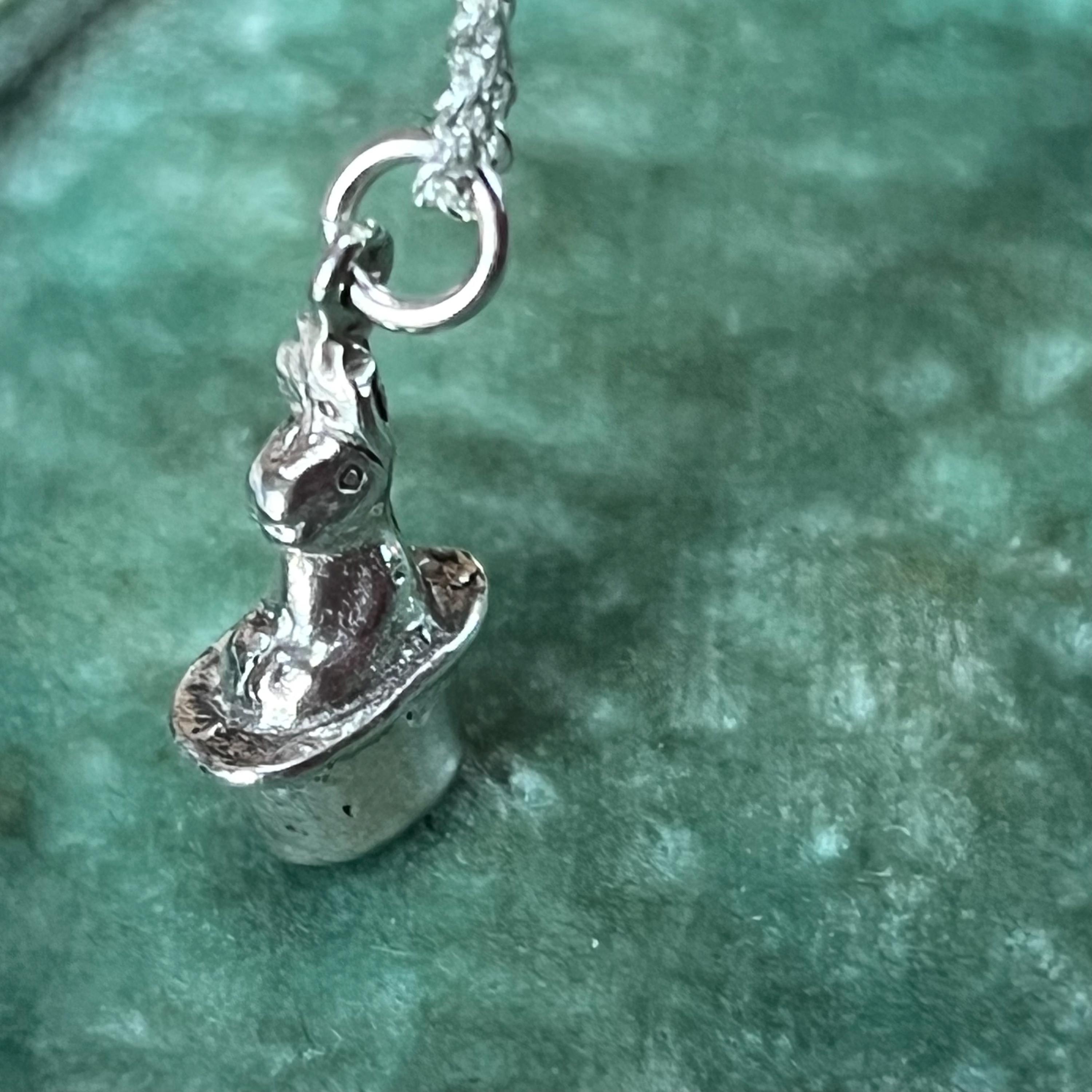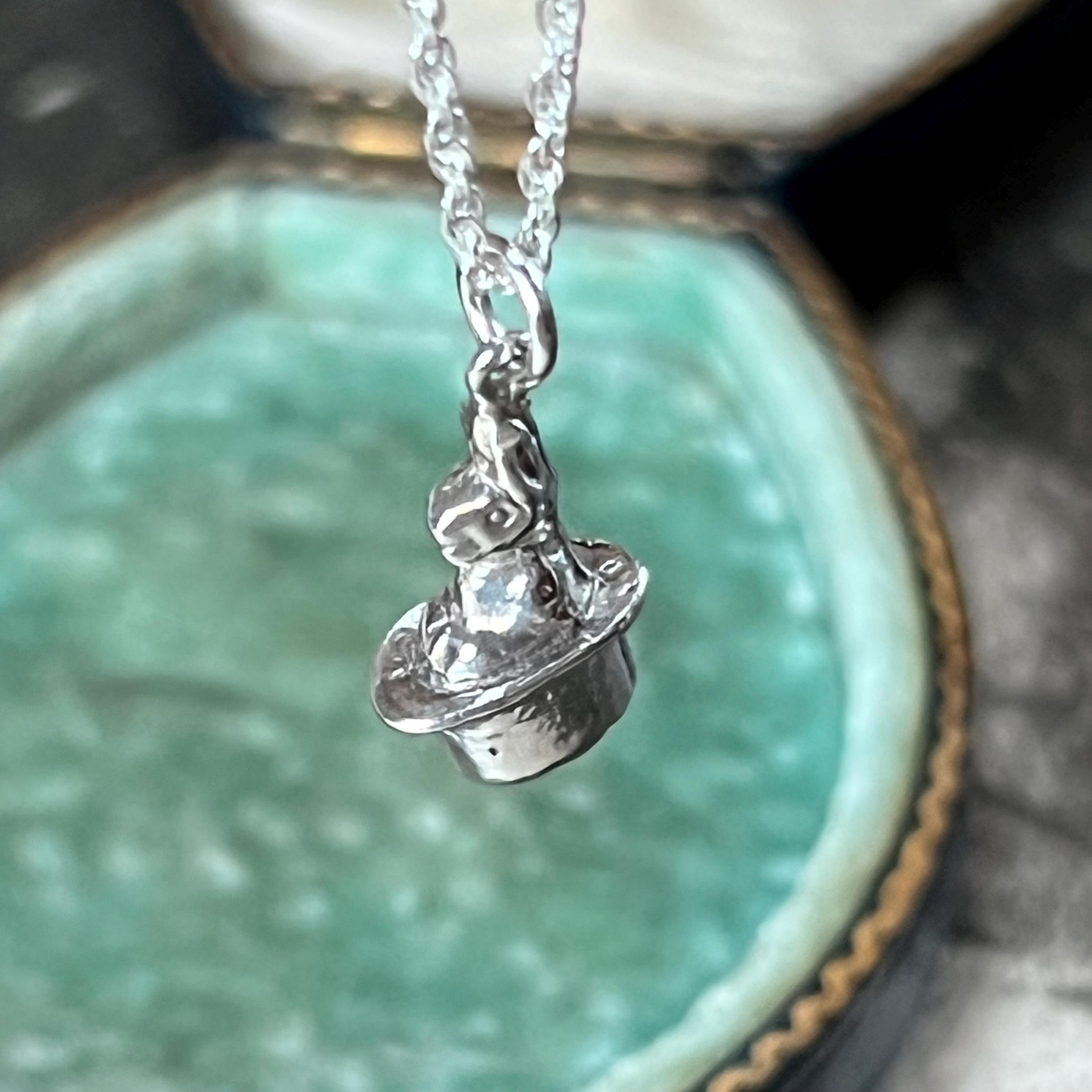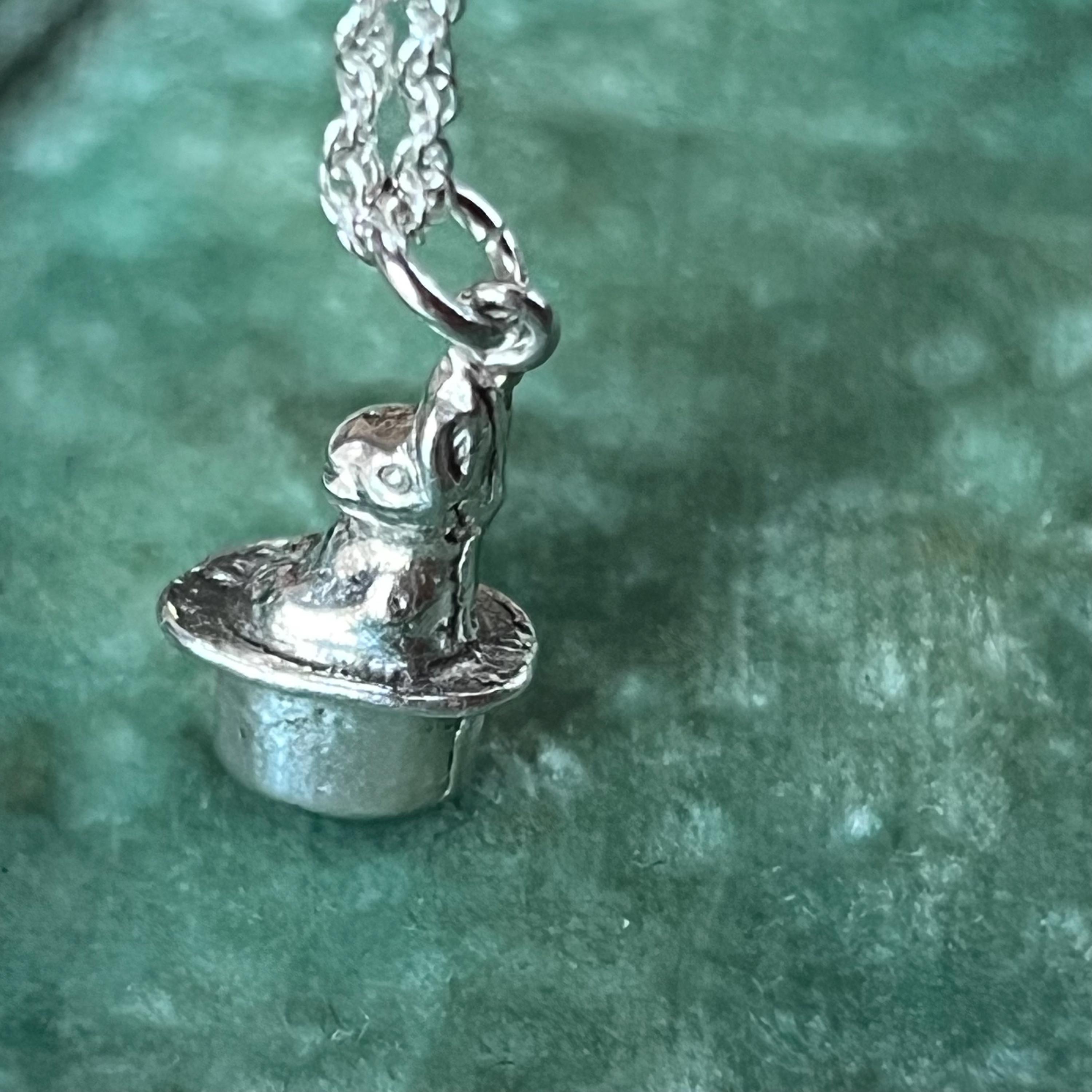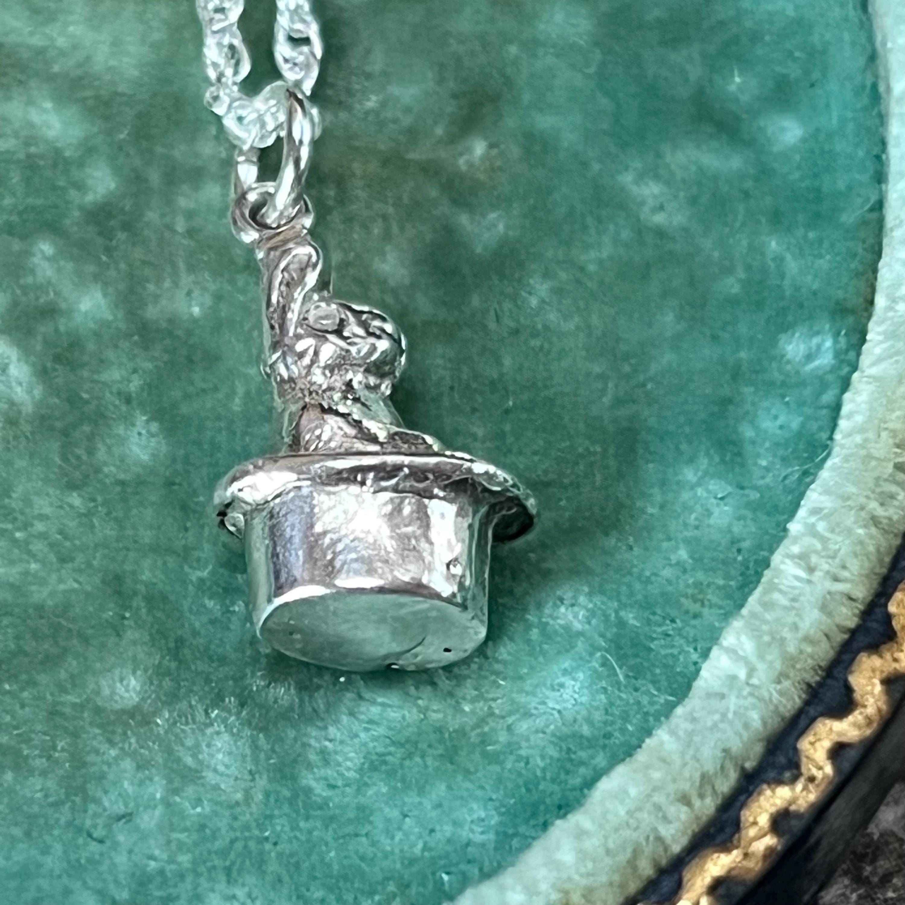 Bring a touch of whimsical charm to your jewellery collection with this vintage silver rabbit in a hat charm pendant, complete with an eco-friendly 18" (45 cm) recycled 925 sterling silver rope chain. This delightful lucky rabbit design makes a meaningful and memorable gift for vintage lovers, charm collectors, or anyone who enjoys quirky, magical motifs. Note antique boxes are not included, this will come in eco-friendly packaging.
