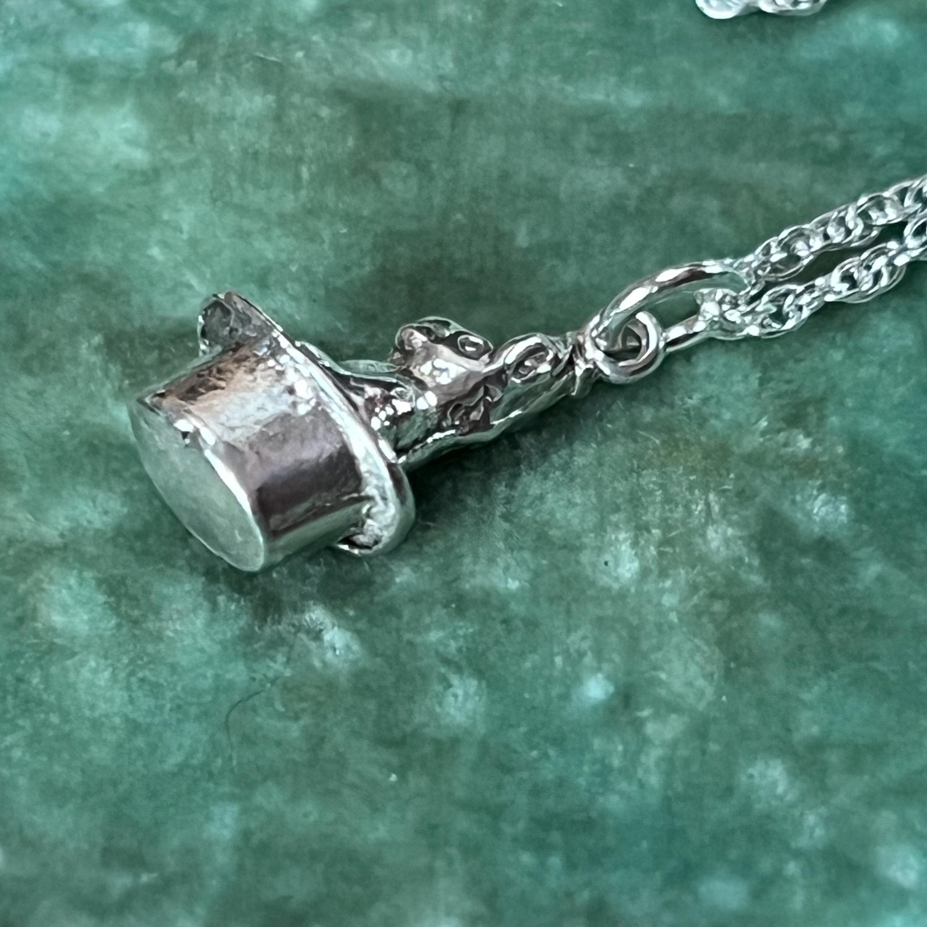 This charming little rabbit in a hat adds personality to any outfit. Its vintage character and lucky symbolism make it a heartfelt piece to treasure or gift. Bring home a bit of magic with this adorable vintage silver rabbit charm necklace!