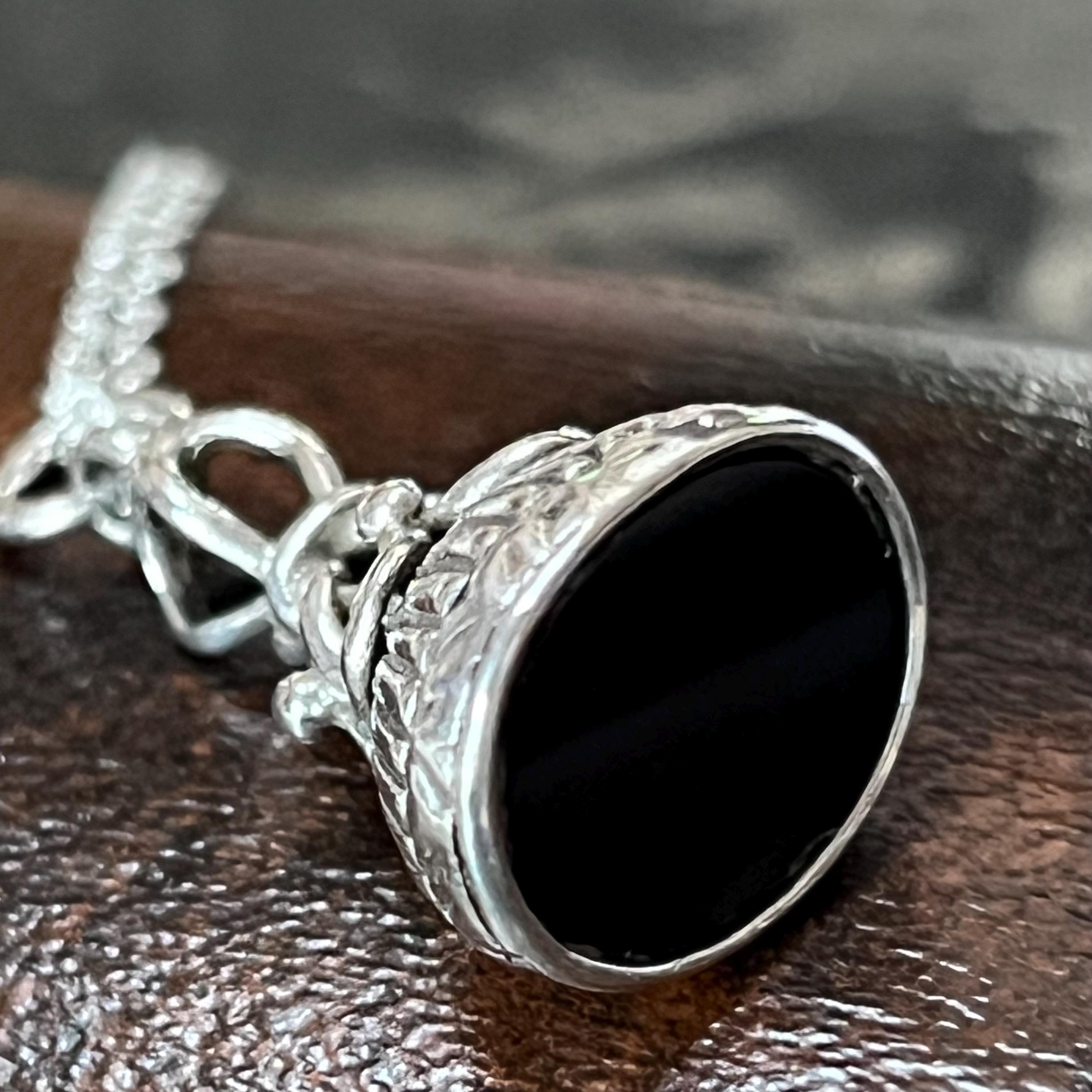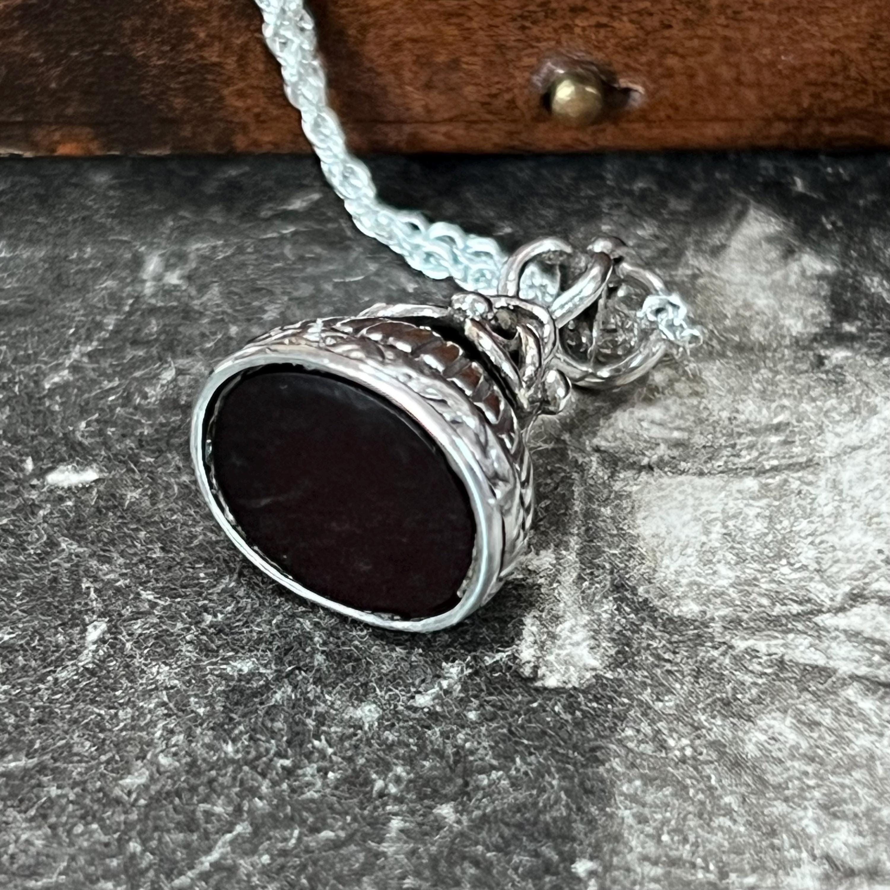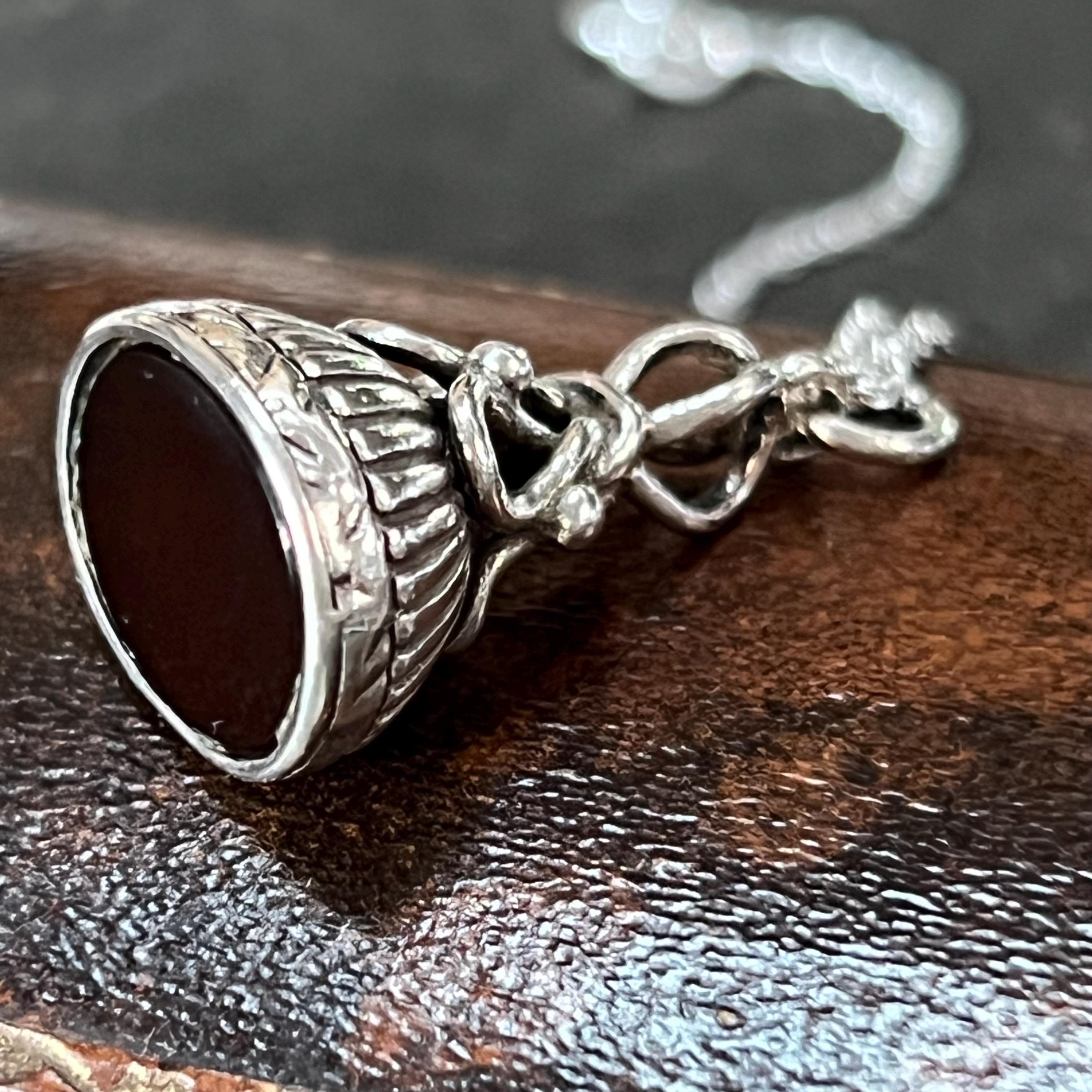 This Antique Victorian silver agate fob charm pendant features a beautifully rich dark red agate—appearing almost black in certain light—and hangs from an eco-friendly 18" (45 cm) recycled 925 sterling silver rope chain. A classic piece of Victorian jewellery, this fob charm carries the era’s signature craftsmanship and makes a meaningful, unique gift for antique lovers and gemstone enthusiasts.