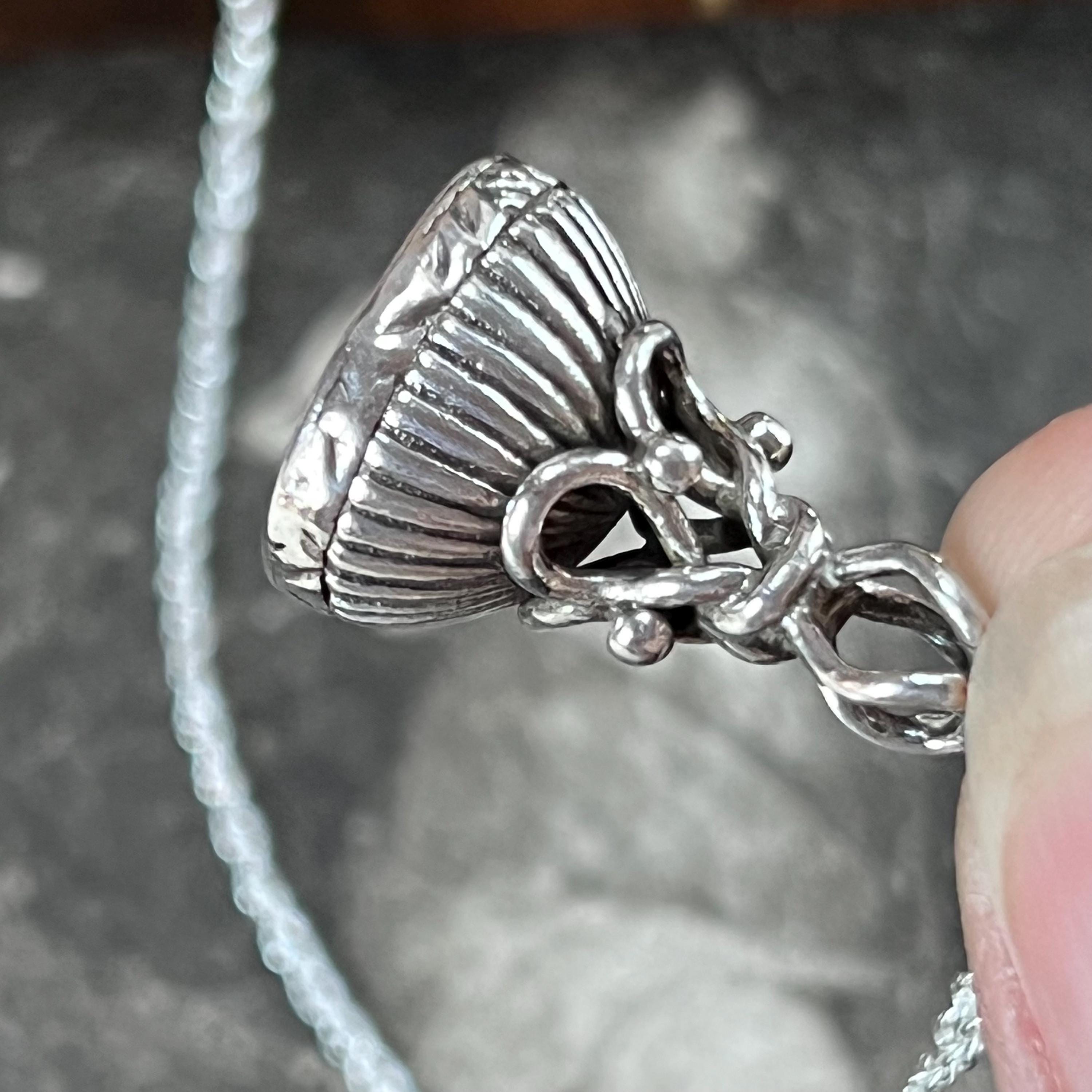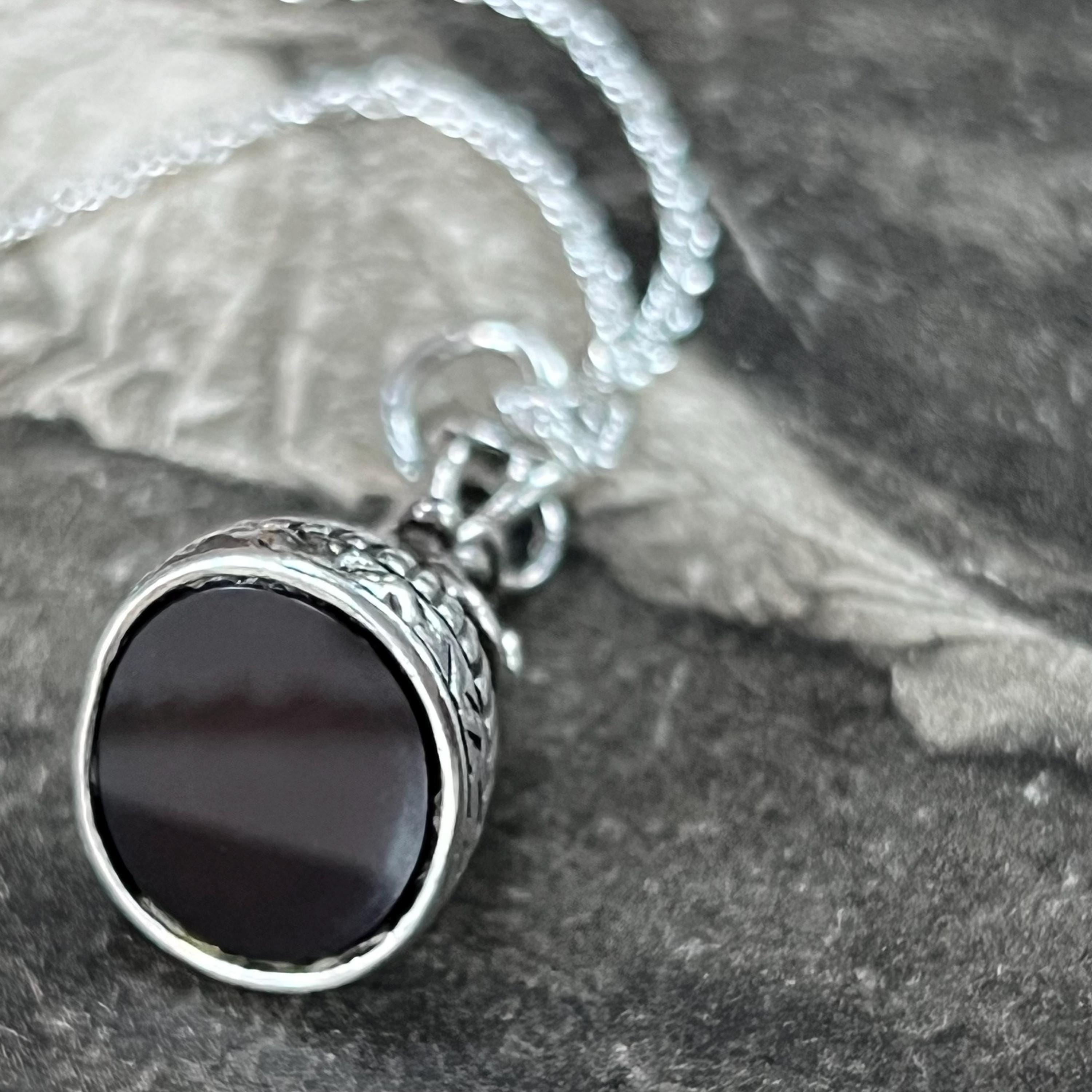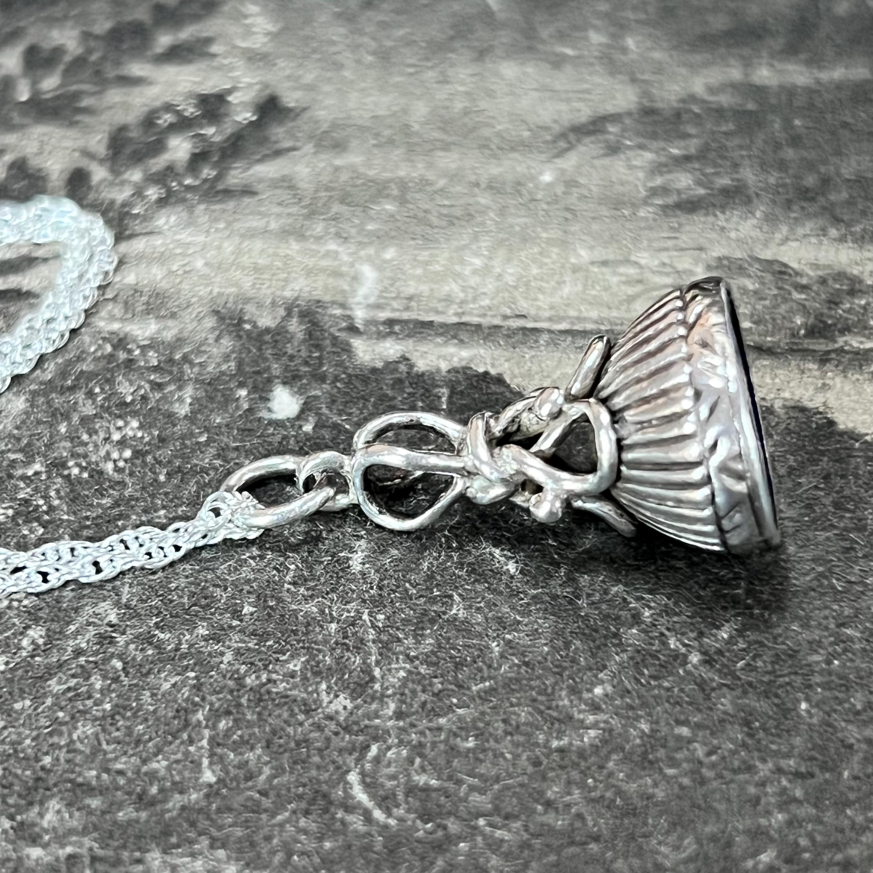 This Antique Victorian silver agate fob charm pendant features a beautifully rich dark red agate—appearing almost black in certain light—and hangs from an eco-friendly 18" (45 cm) recycled 925 sterling silver rope chain. A classic piece of Victorian jewellery, this fob charm carries the era’s signature craftsmanship and makes a meaningful, unique gift for antique lovers and gemstone enthusiasts.