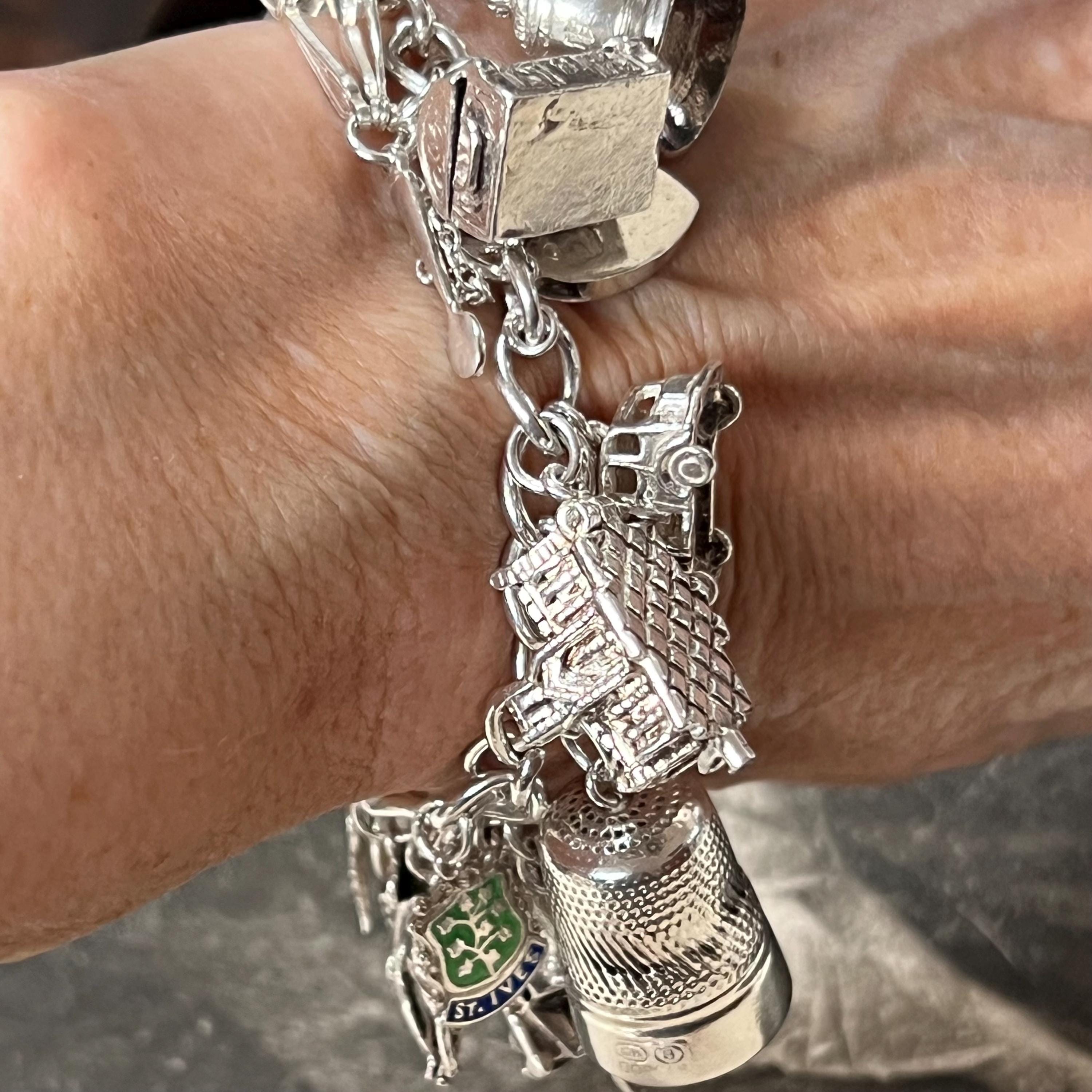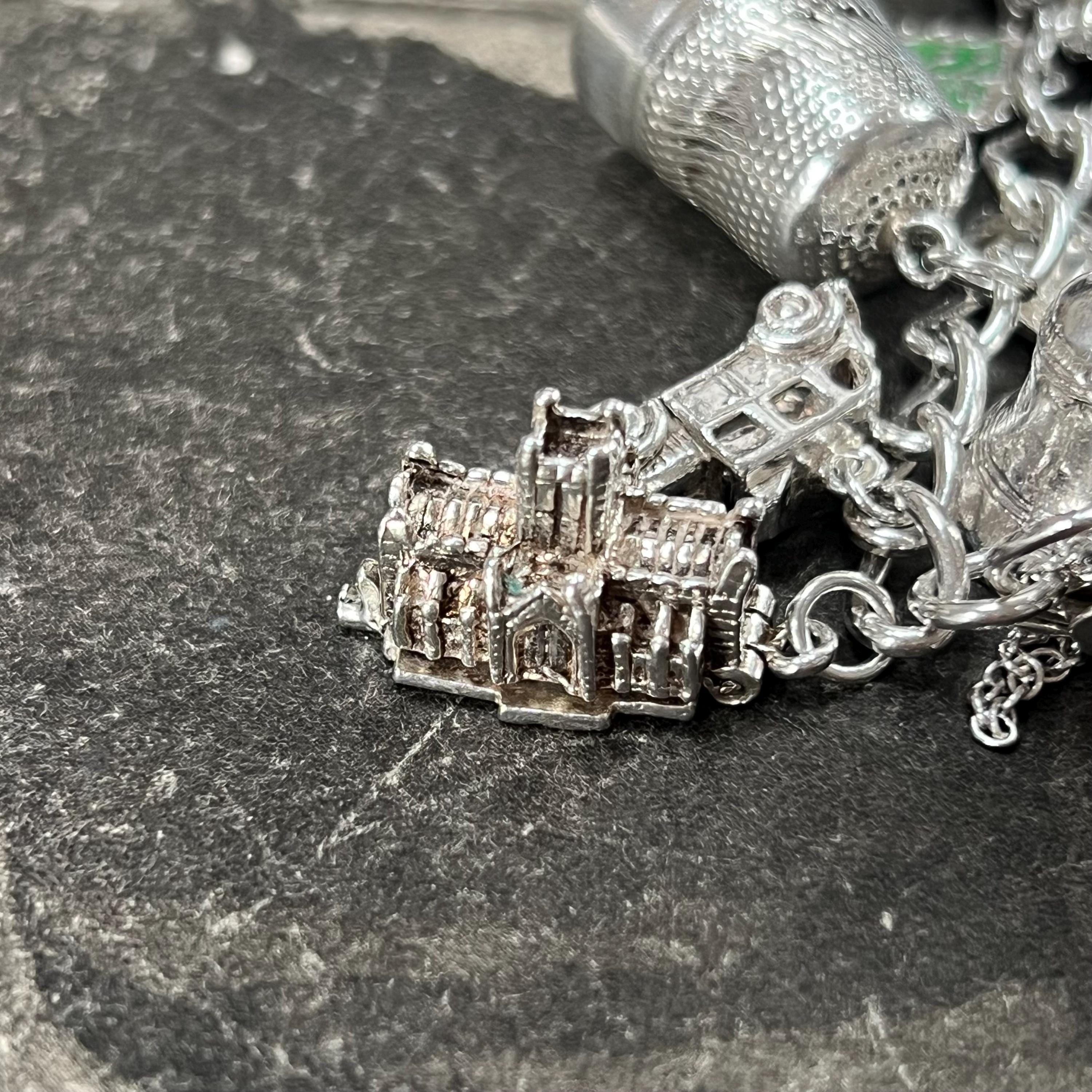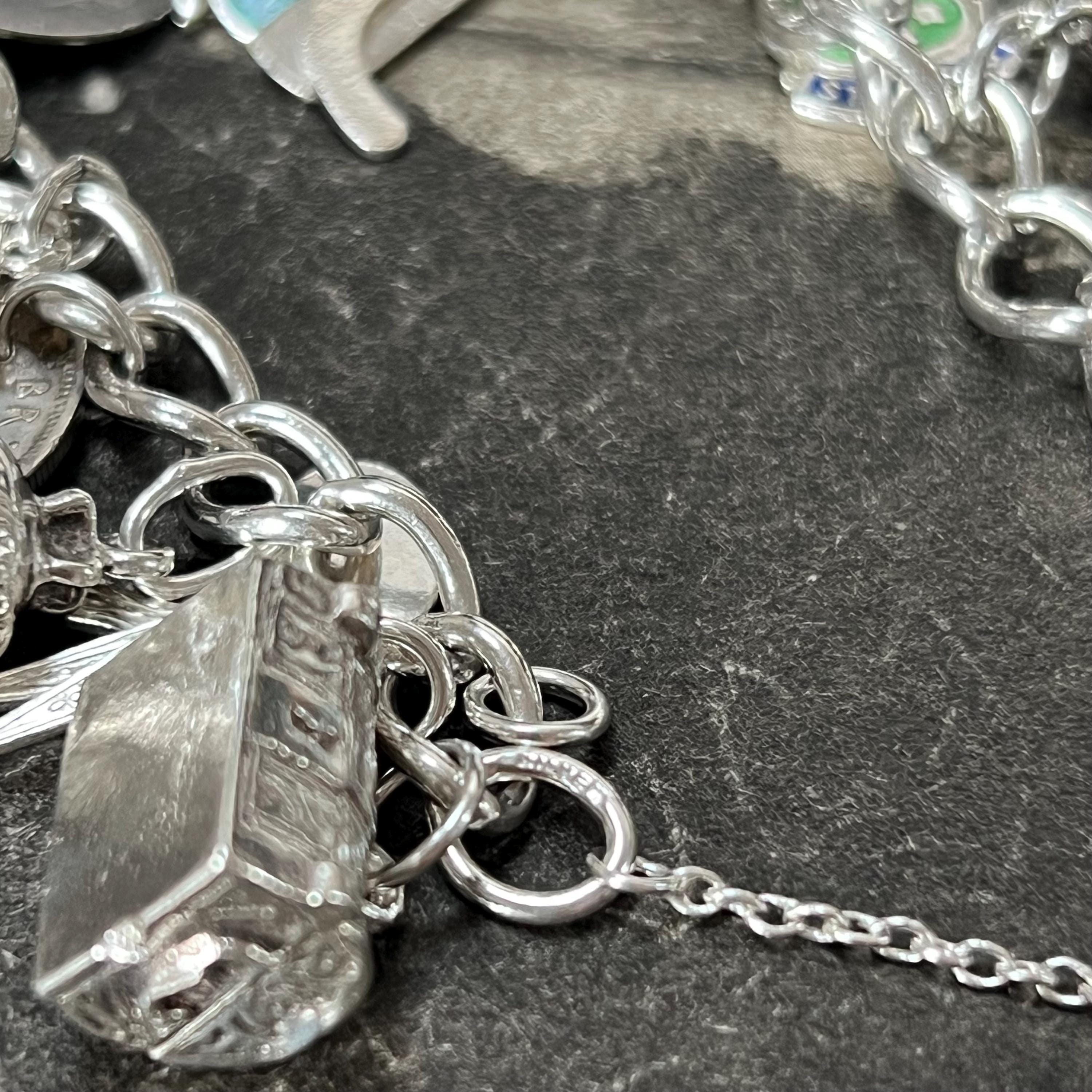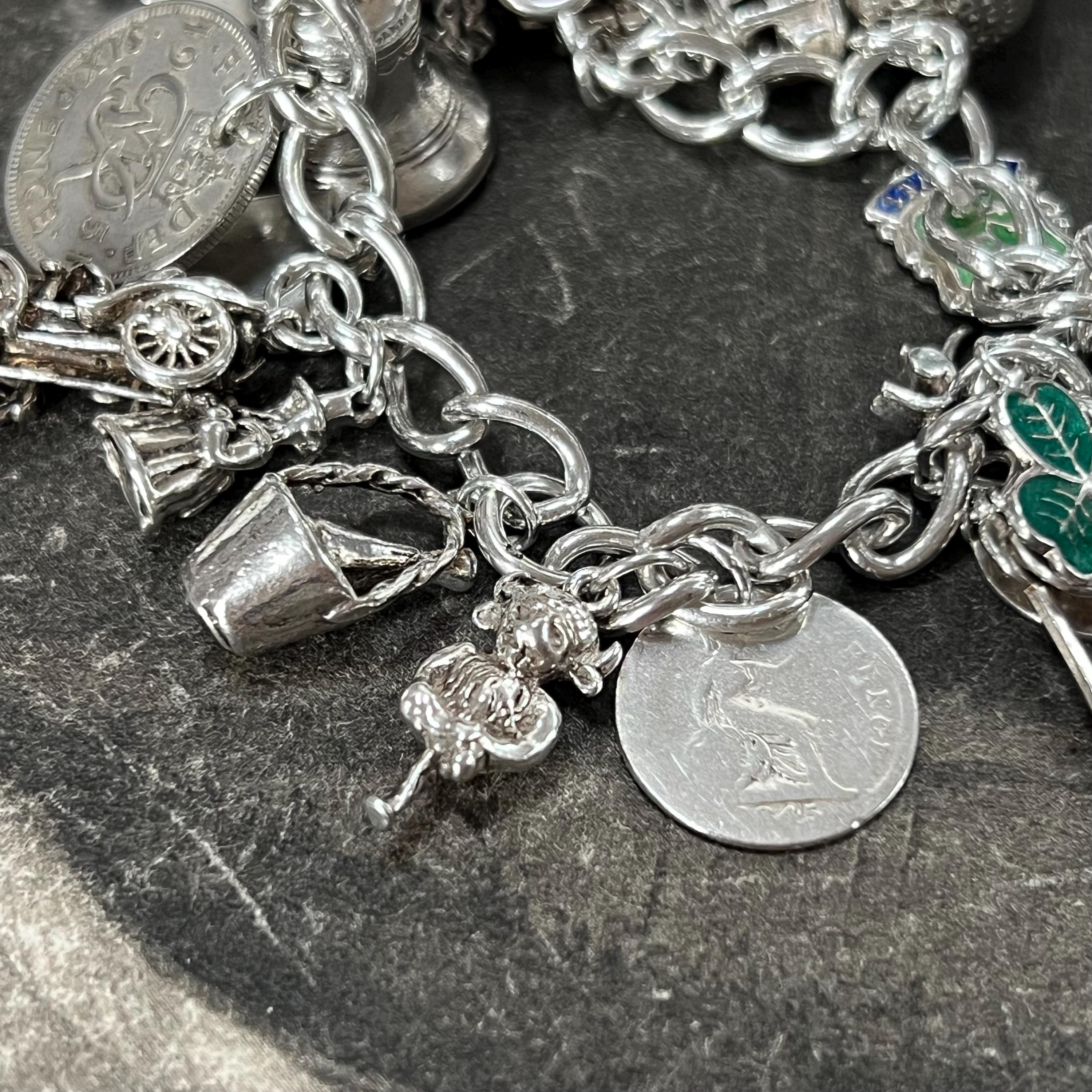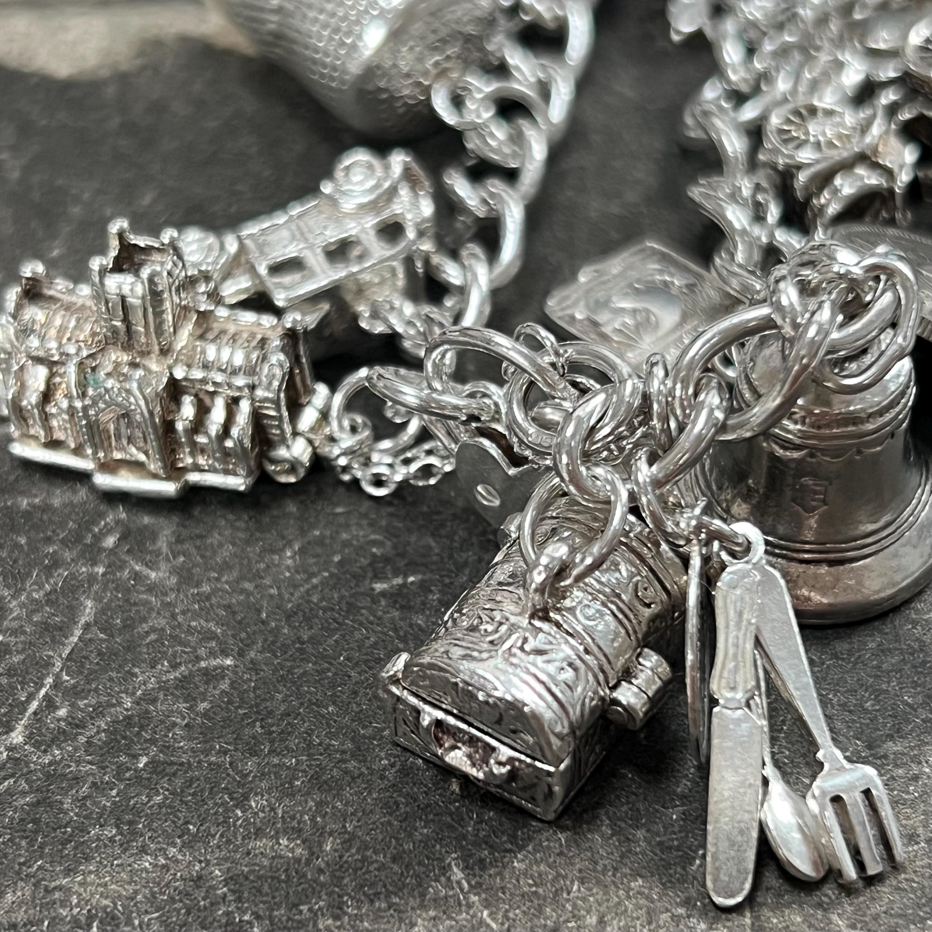 This bracelet offers a wonderful mix of travel, history, folklore, sport, and whimsical themes, making it a standout piece of vintage charm jewellery. Each charm adds its own story and character, creating a wearable collection of memories and symbols.