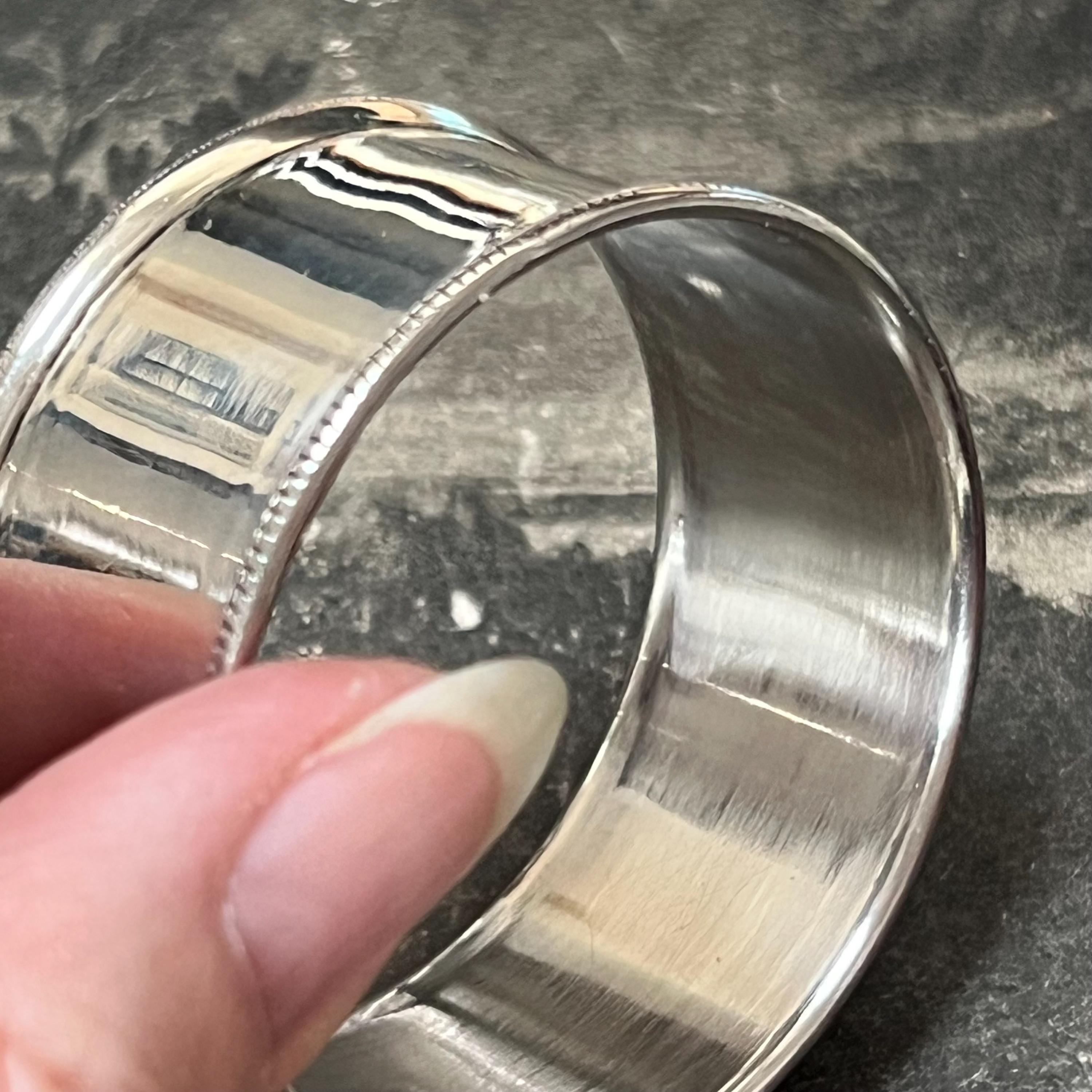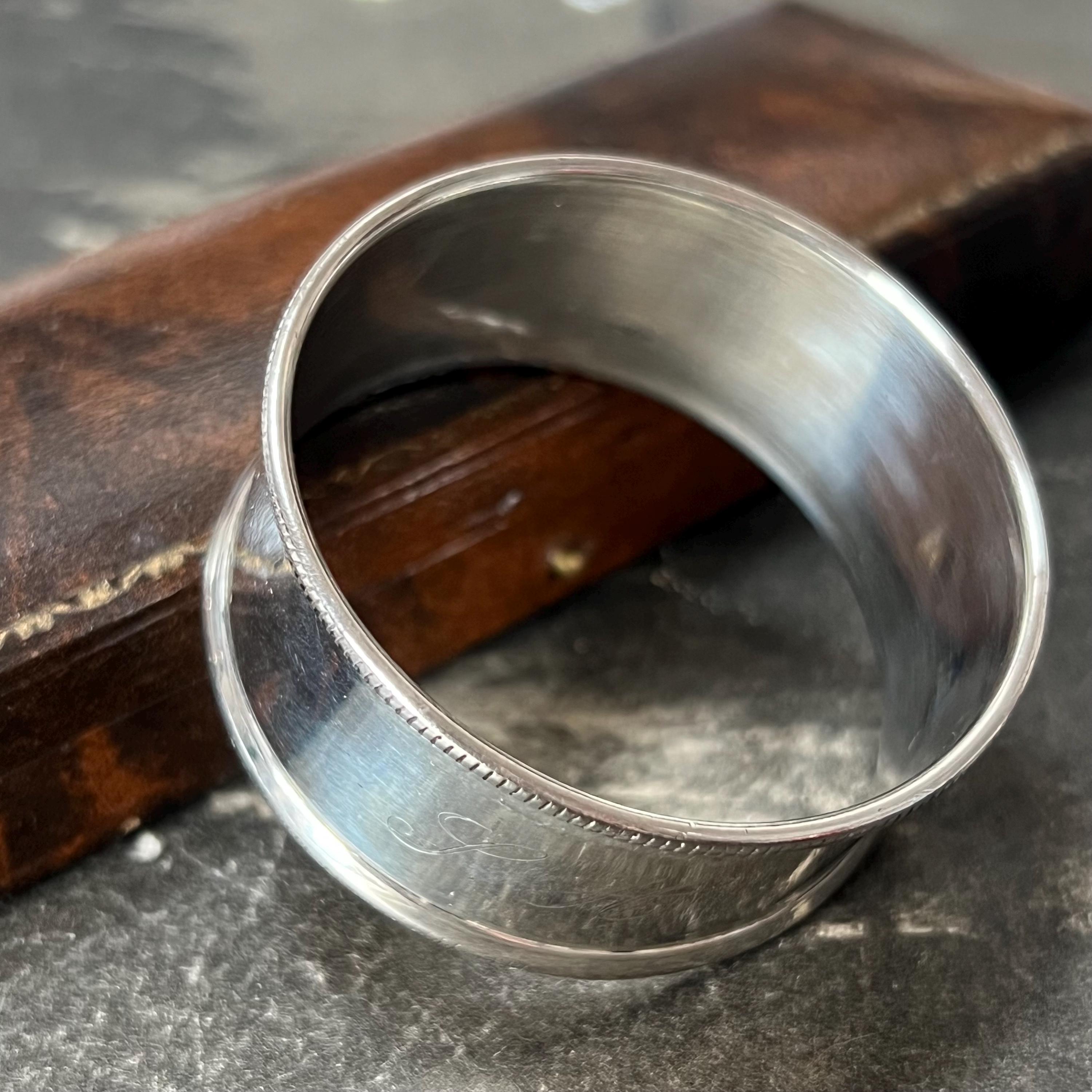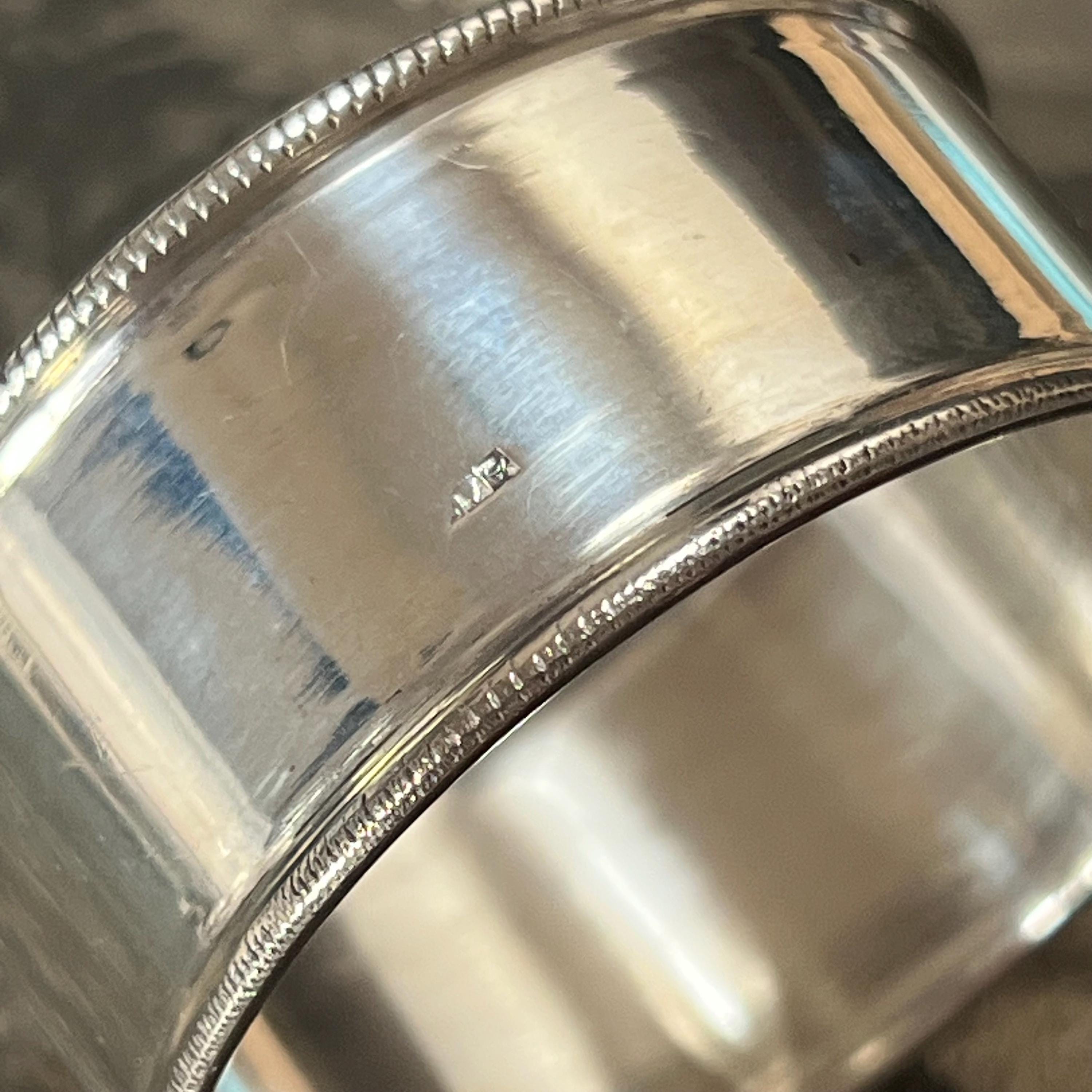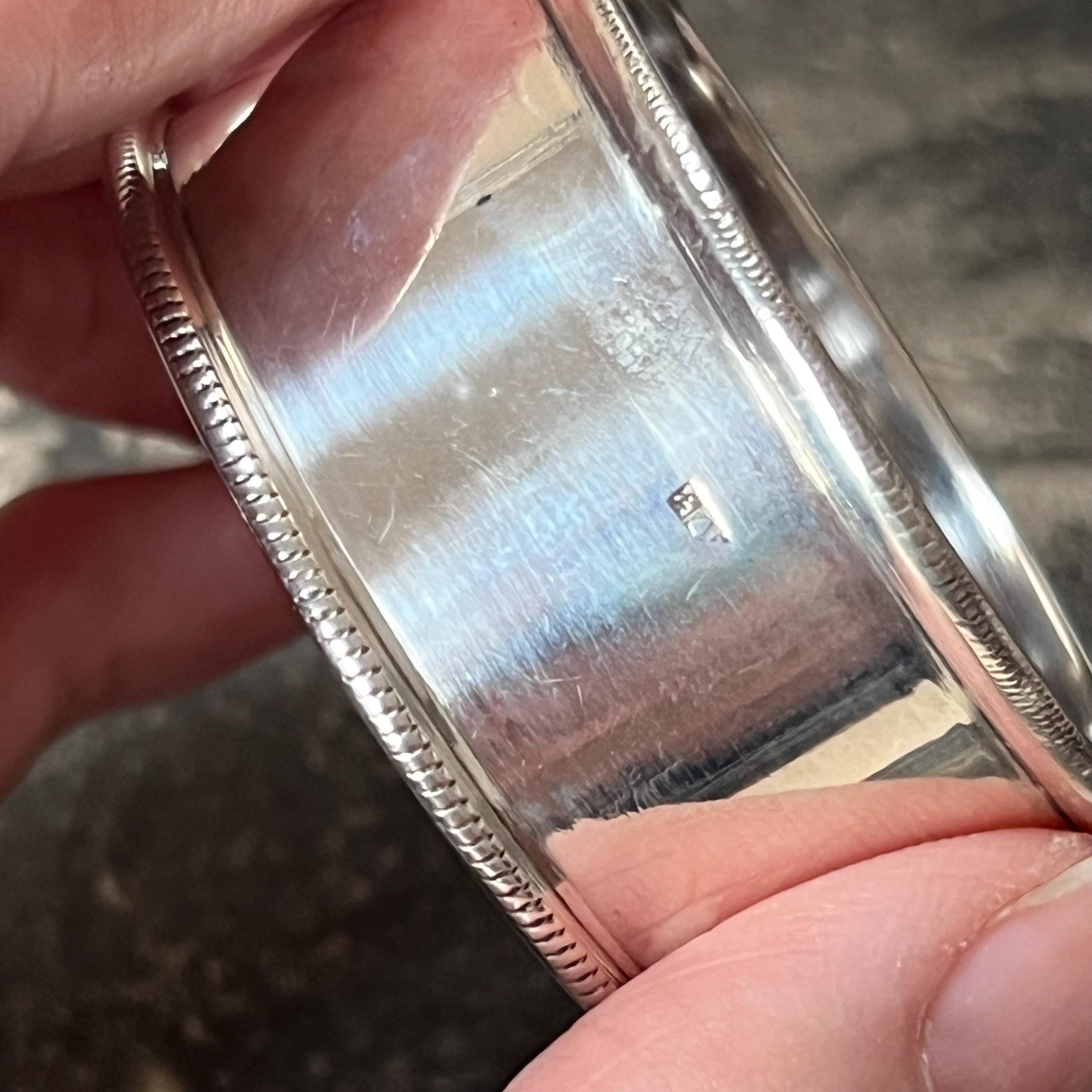 This early 20th-century solid silver napkin ring features a worn continental hallmark resembling a bell—most likely from Alexandria, Egypt—and has been silver-tested for authenticity. Dating from around the 1930s–1940s, it has a classic plain central band with fine rope-twist styled edging and faint engraved initials (possibly J and H). Measuring 23.5 mm wide and weighing 22.8 grams, it’s a wonderful collectible for lovers of antique silver tableware.