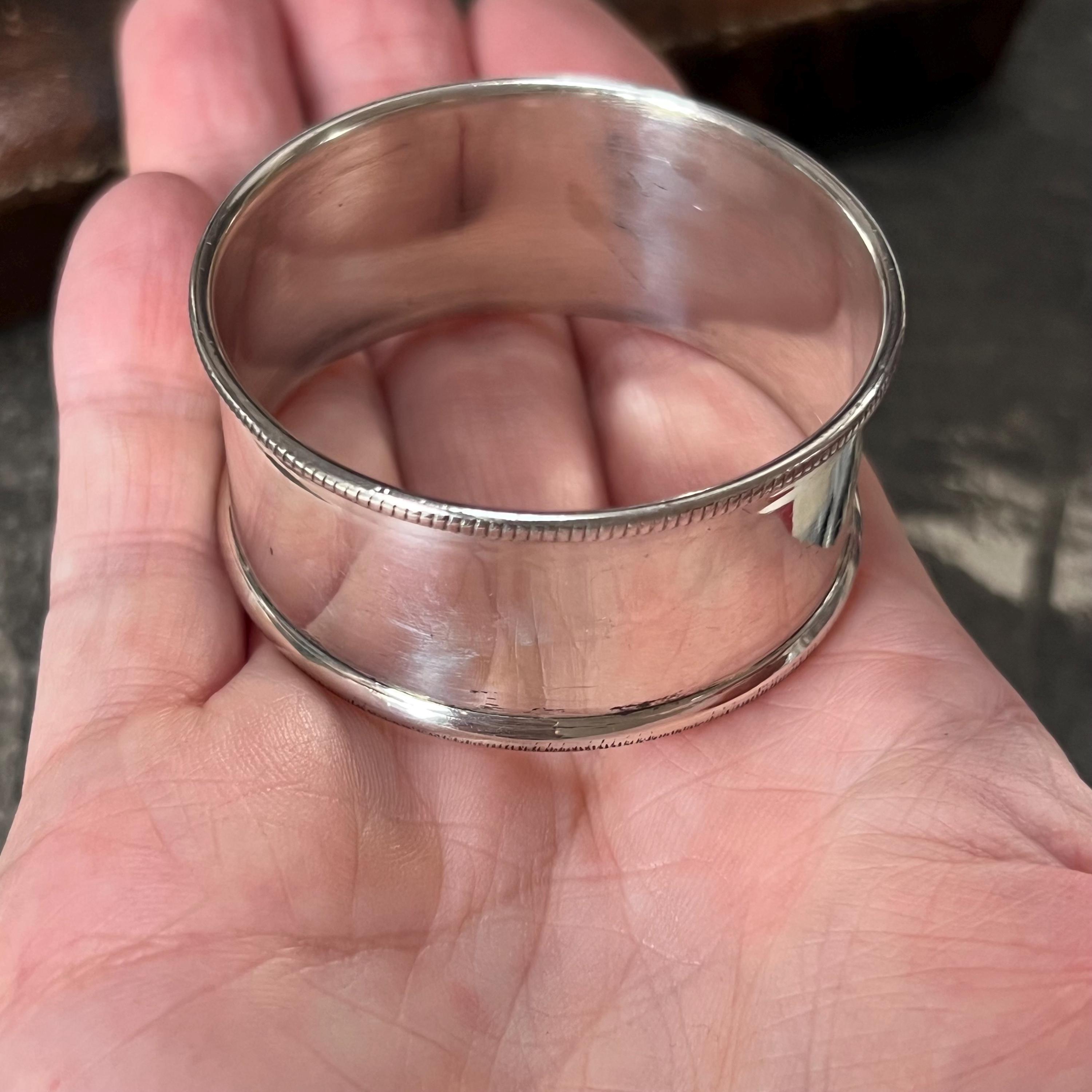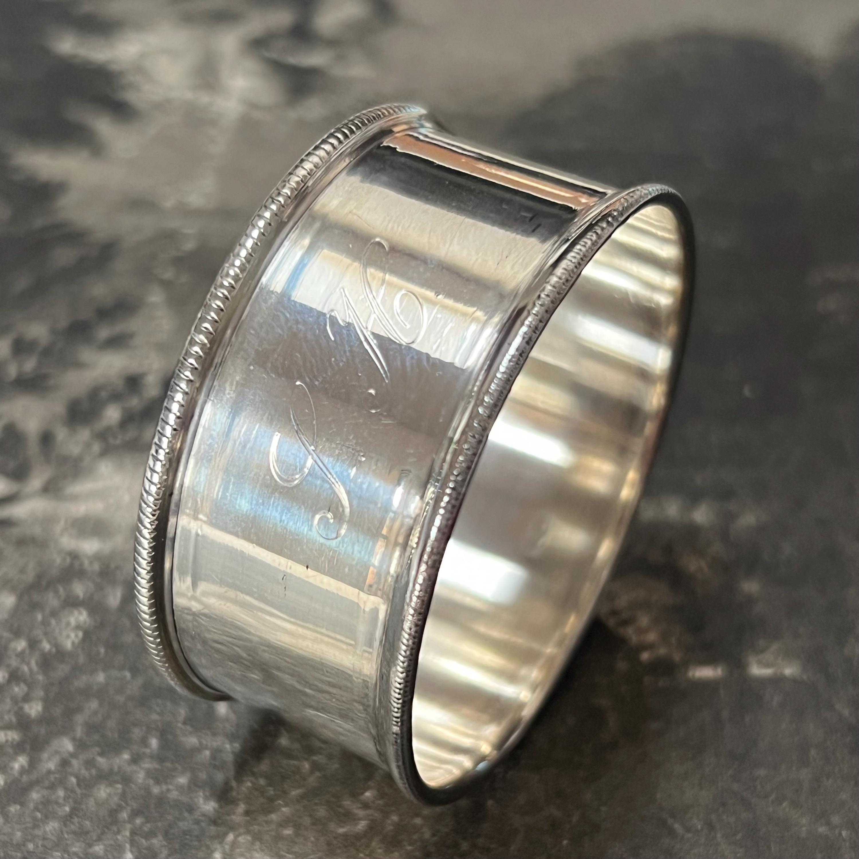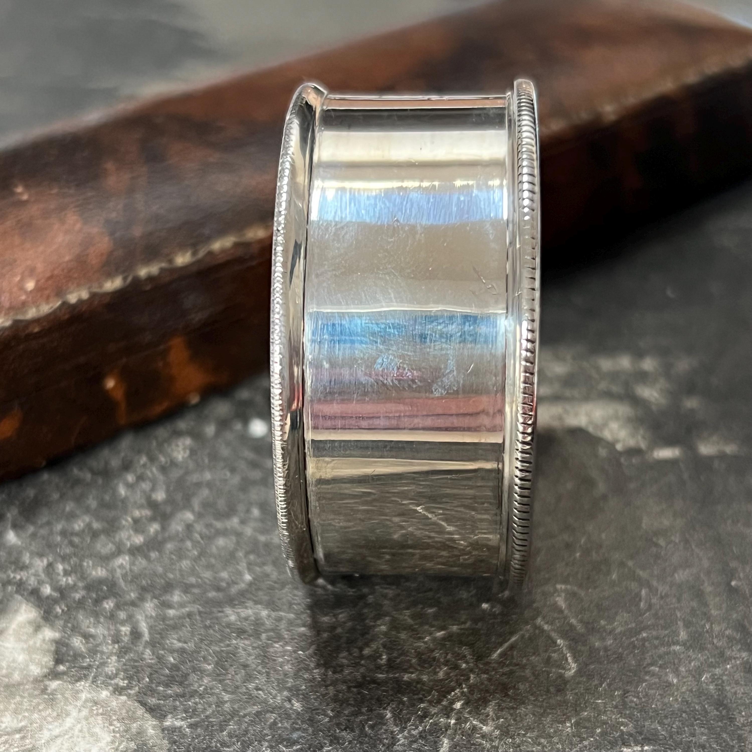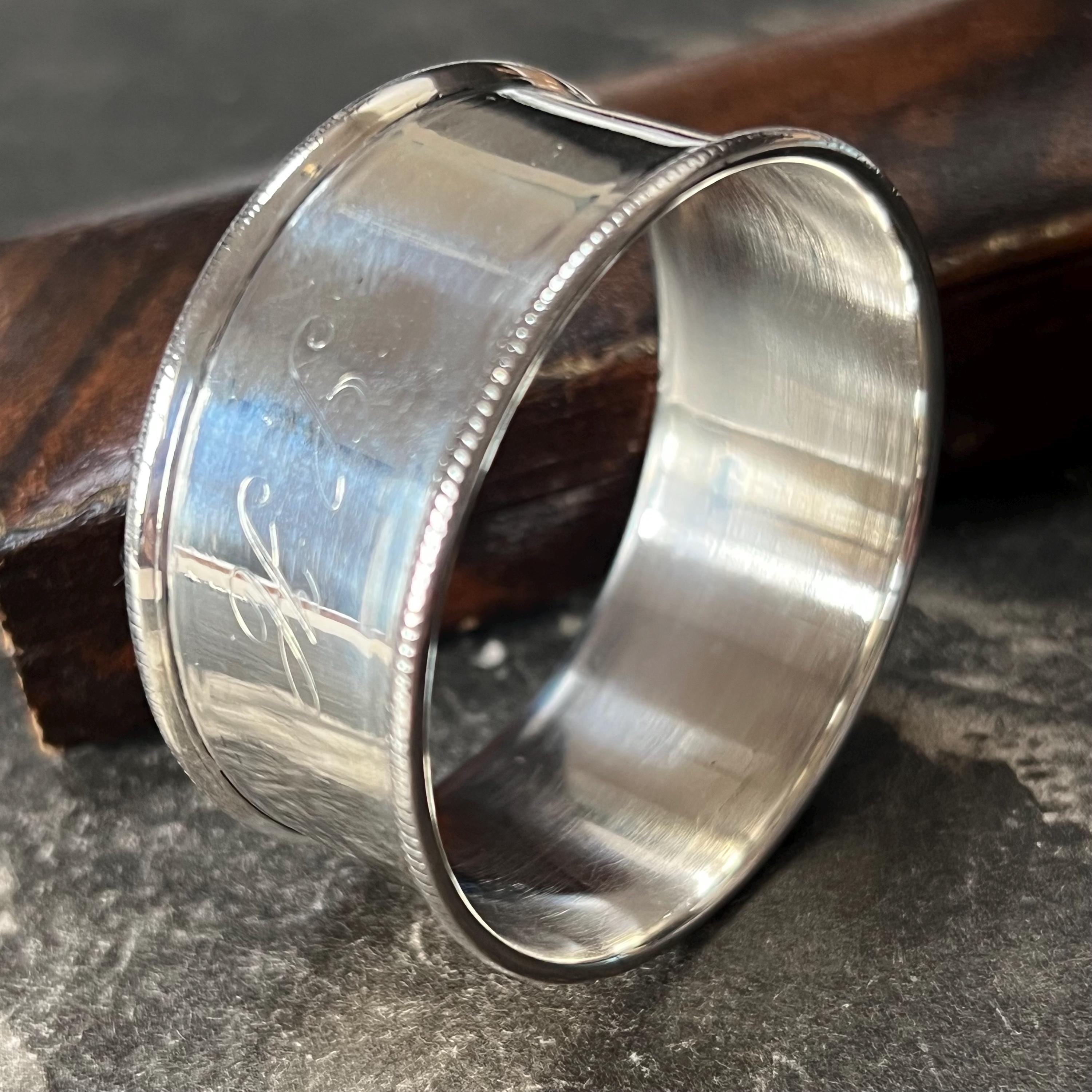 This early 20th-century solid silver napkin ring features a worn continental hallmark resembling a bell—most likely from Alexandria, Egypt—and has been silver-tested for authenticity. Dating from around the 1930s–1940s, it has a classic plain central band with fine rope-twist styled edging and faint engraved initials (possibly J and H). Measuring 23.5 mm wide and weighing 22.8 grams, it’s a wonderful collectible for lovers of antique silver tableware.