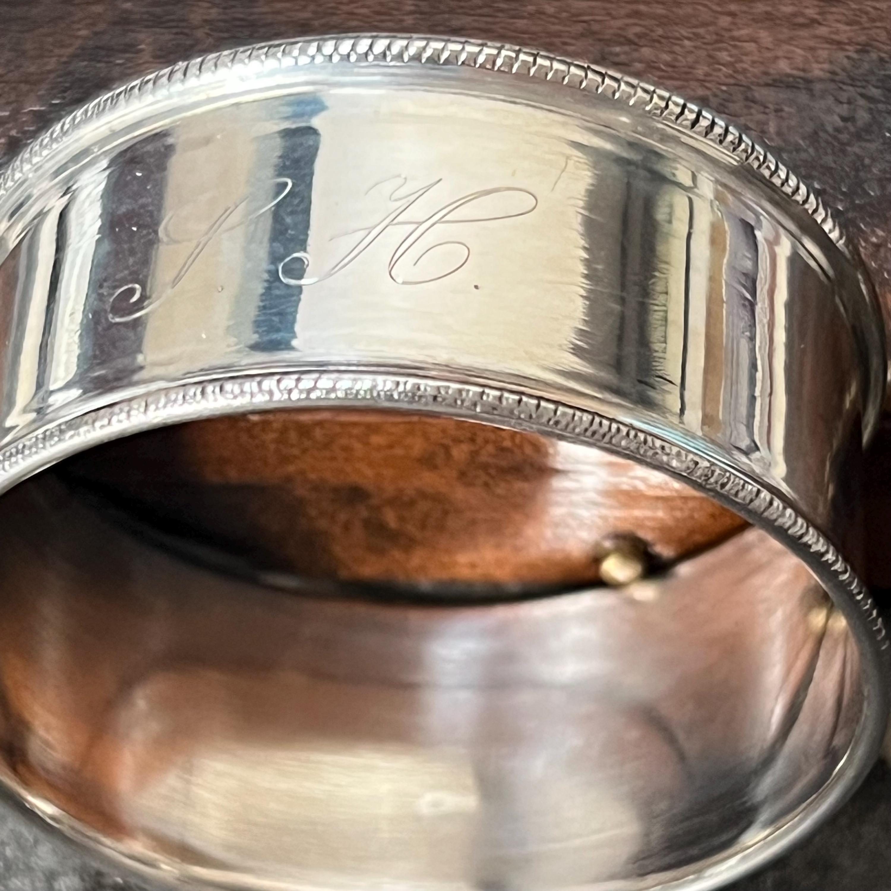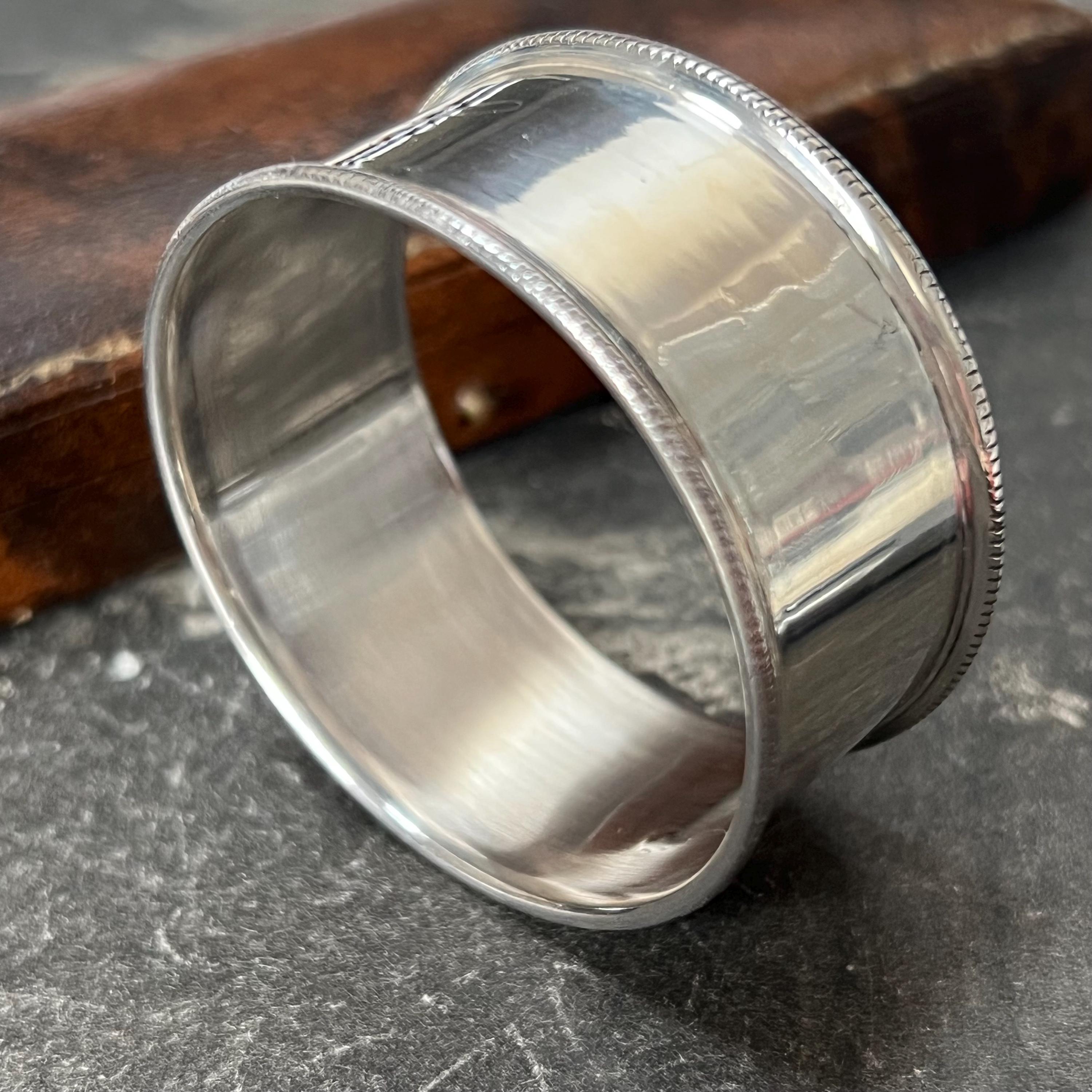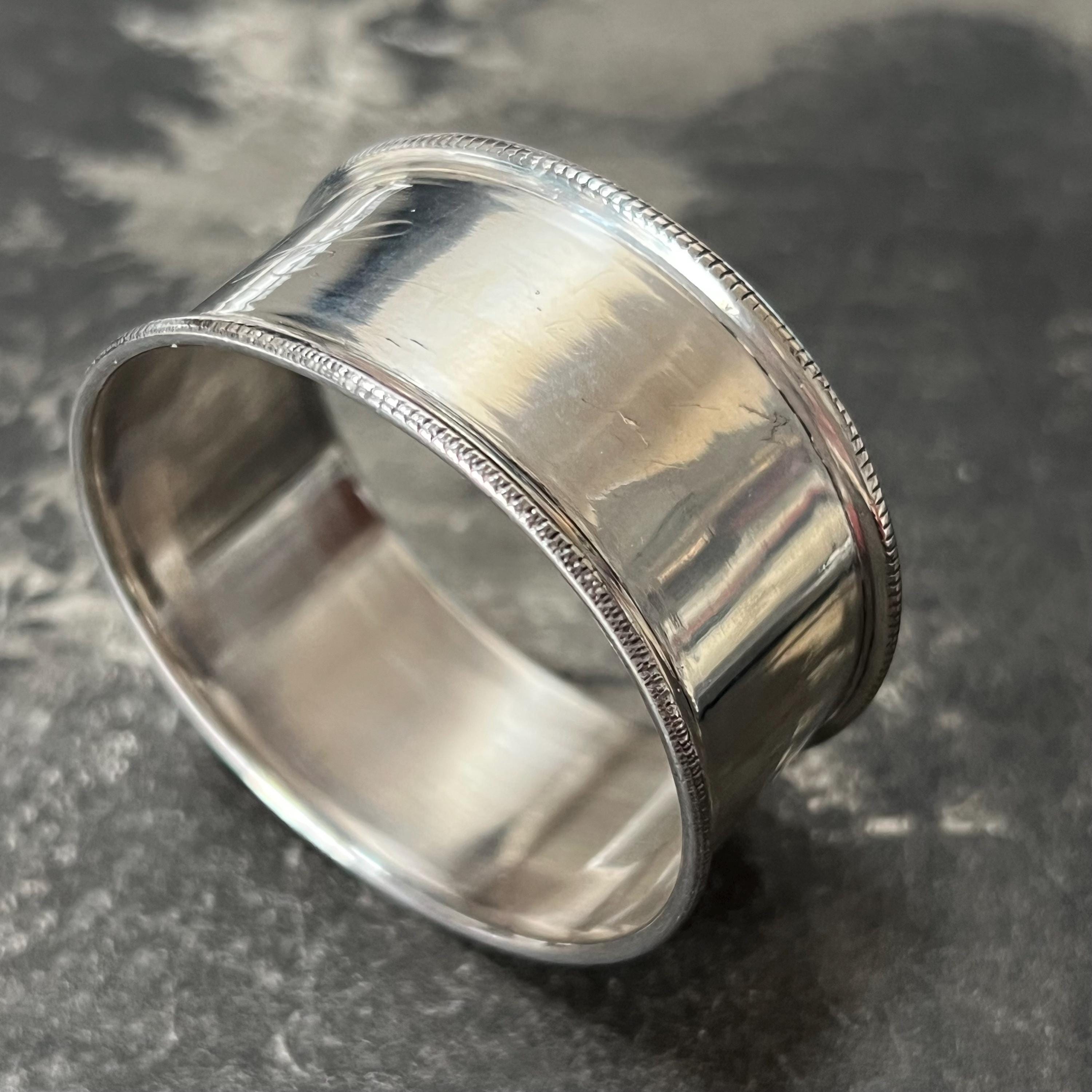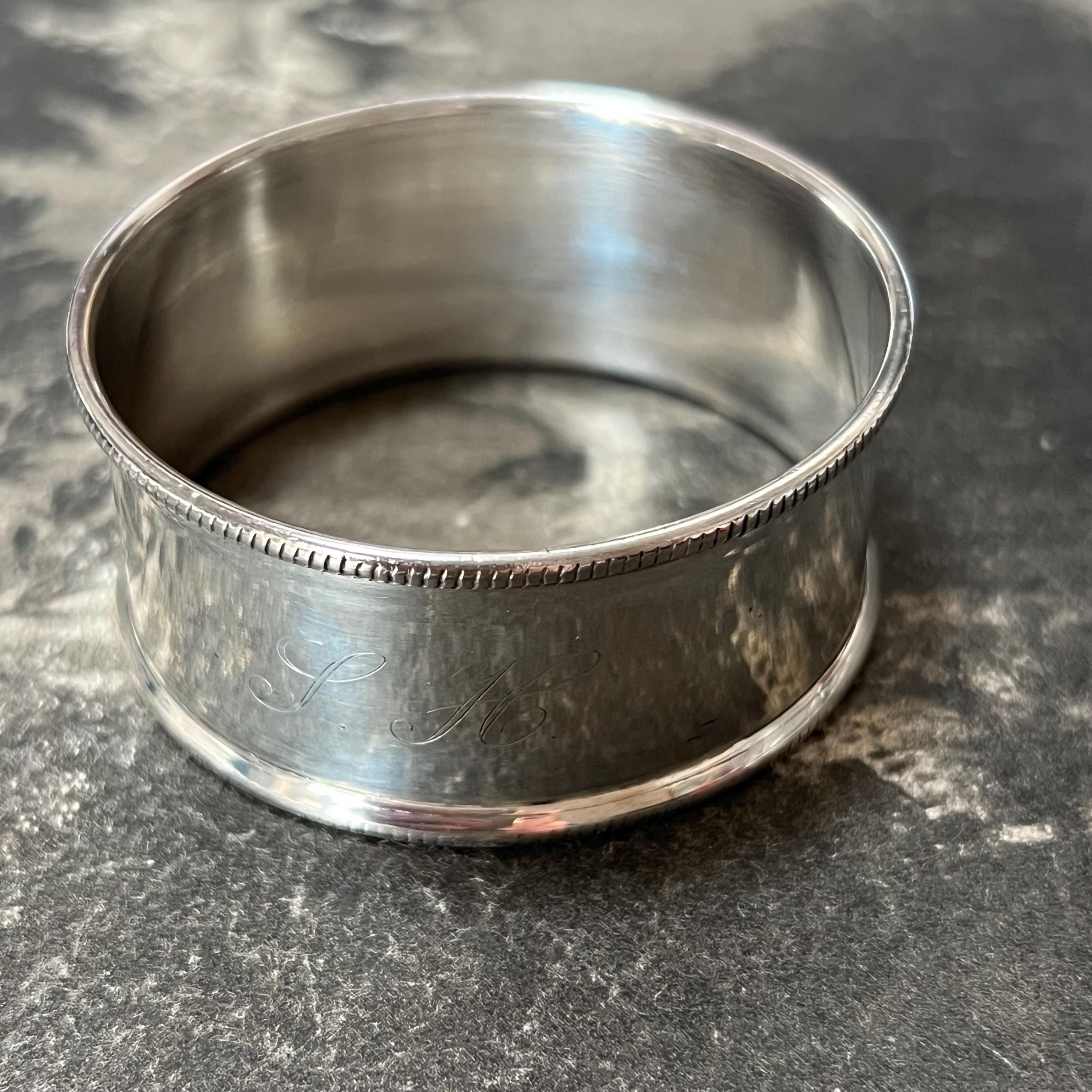 This early 20th-century solid silver napkin ring features a worn continental hallmark resembling a bell—most likely from Alexandria, Egypt—and has been silver-tested for authenticity. Dating from around the 1930s–1940s, it has a classic plain central band with fine rope-twist styled edging and faint engraved initials (possibly J and H). Measuring 23.5 mm wide and weighing 22.8 grams, it’s a wonderful collectible for lovers of antique silver tableware.