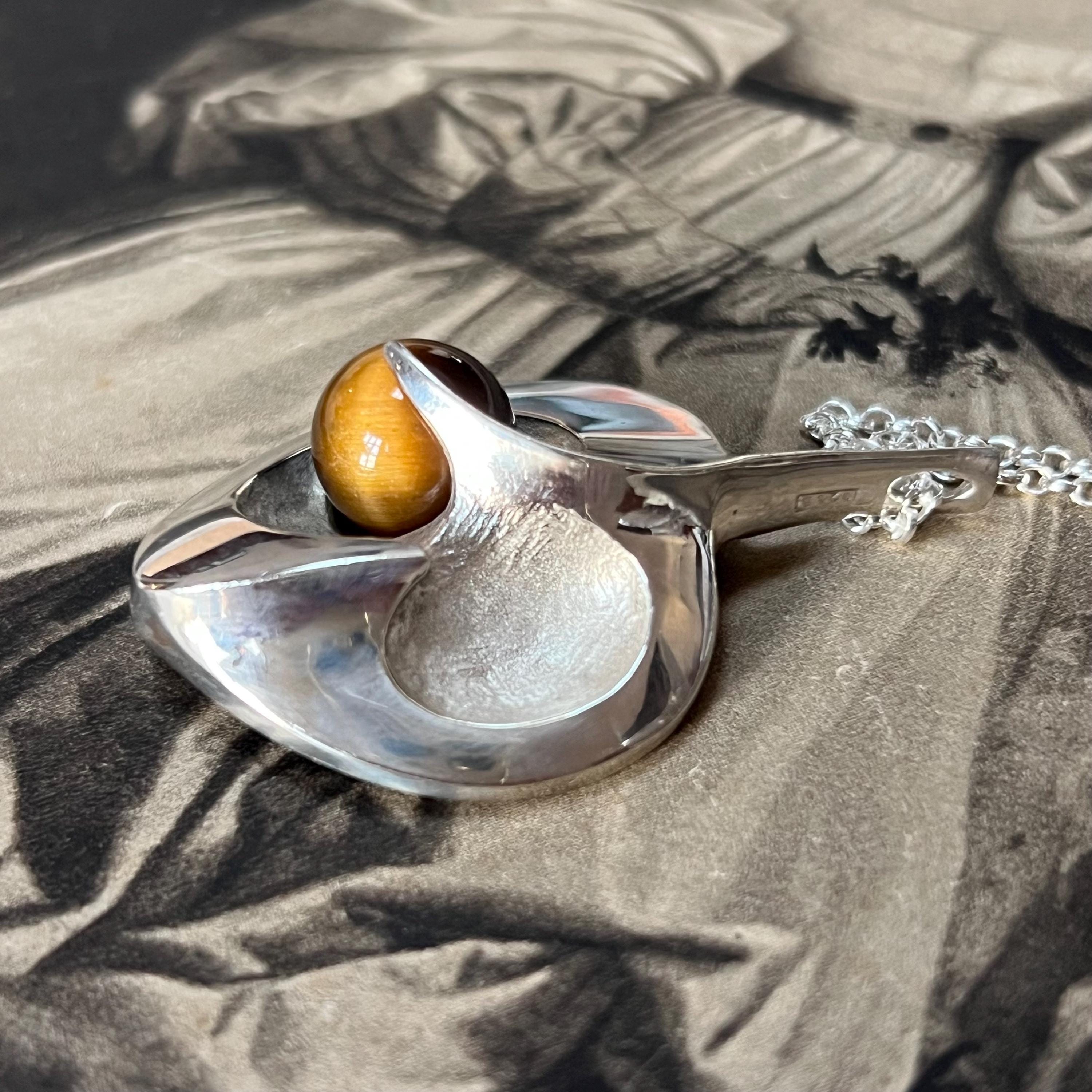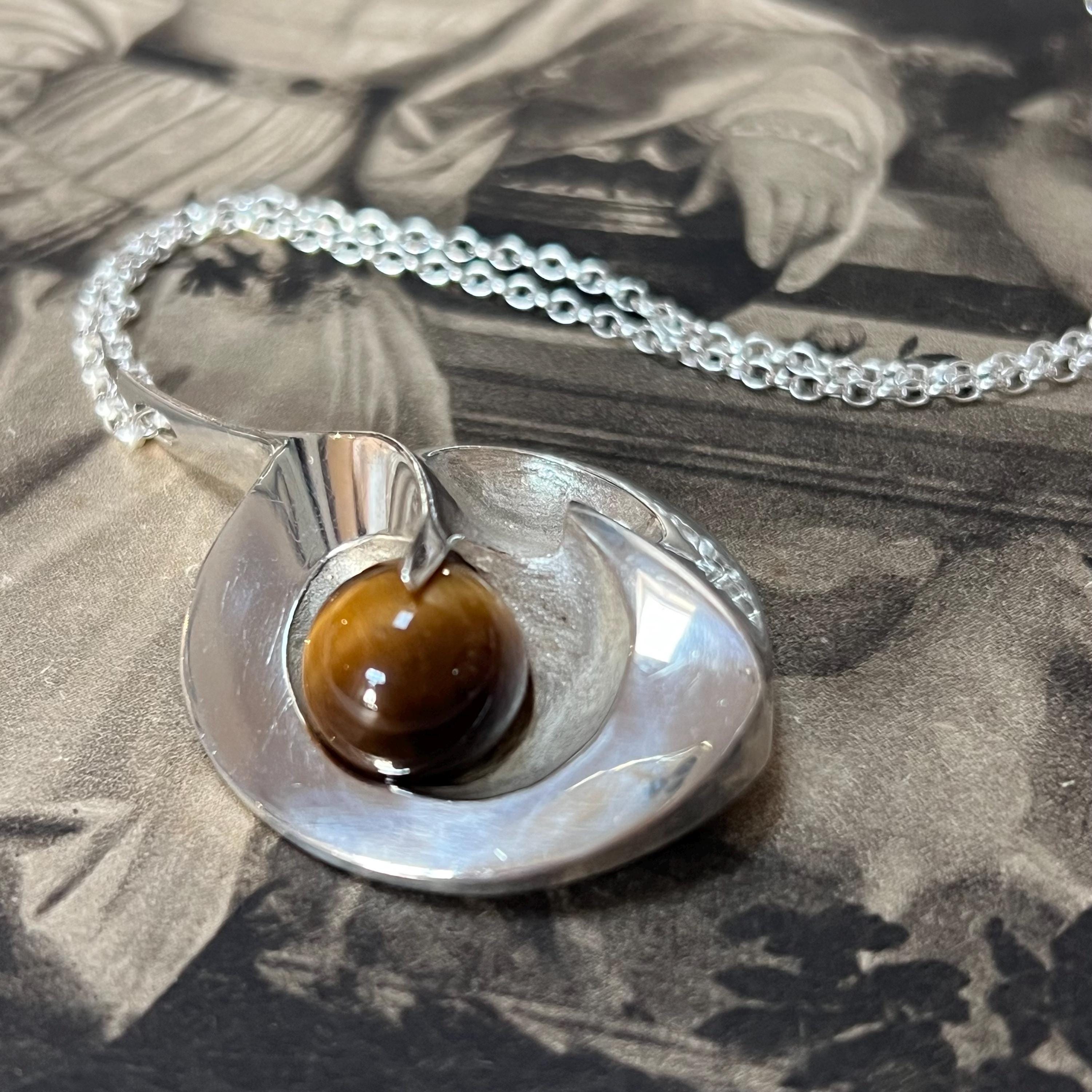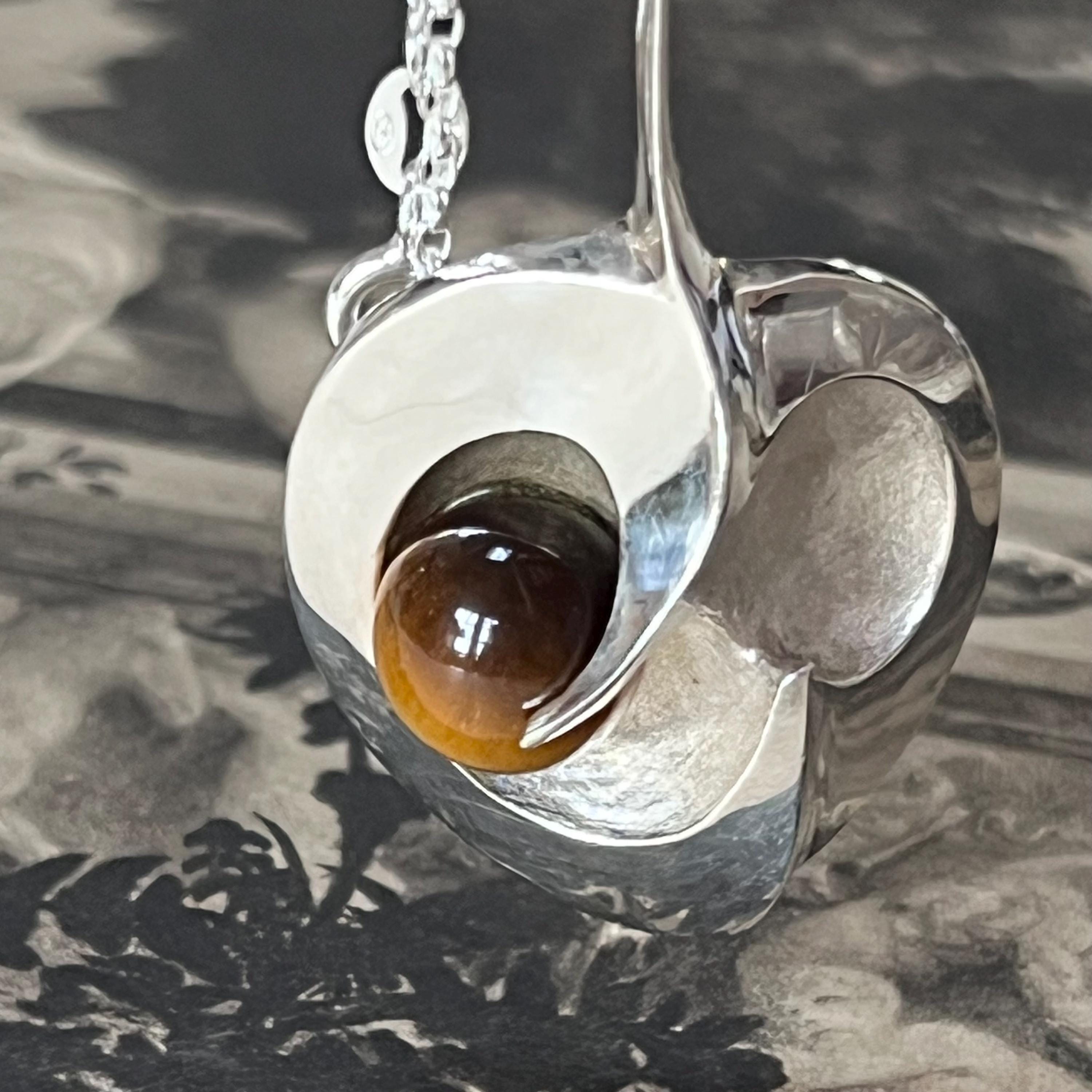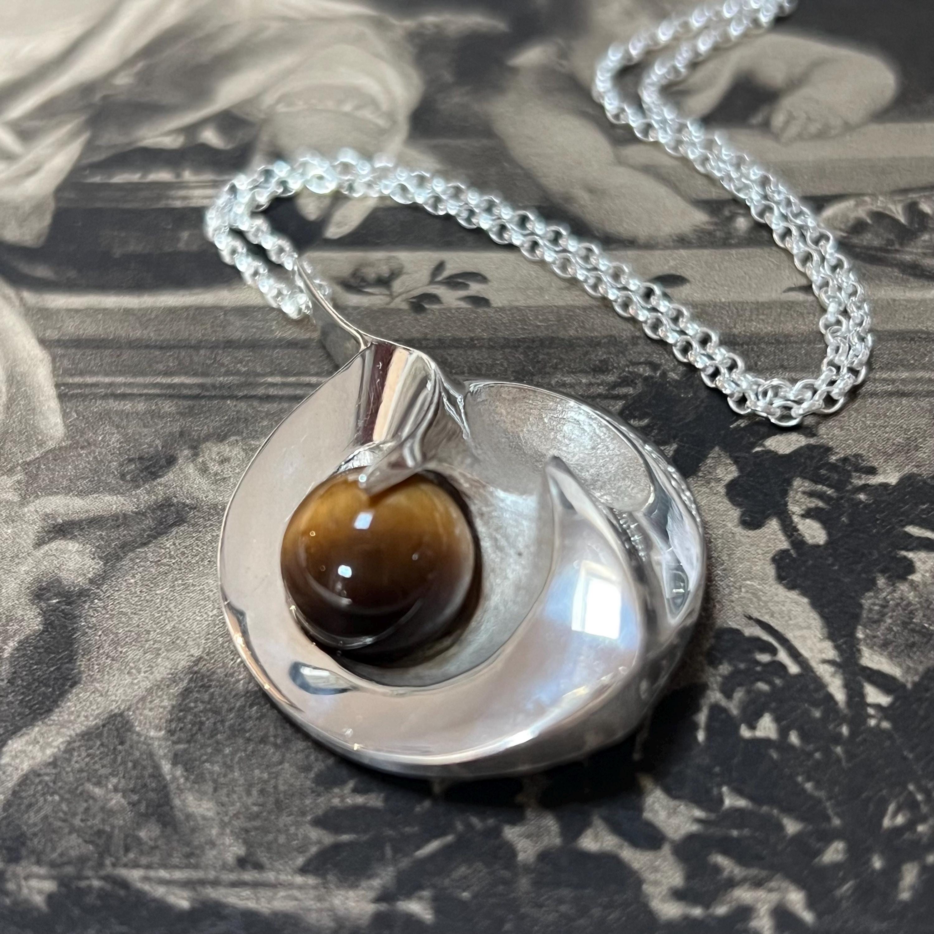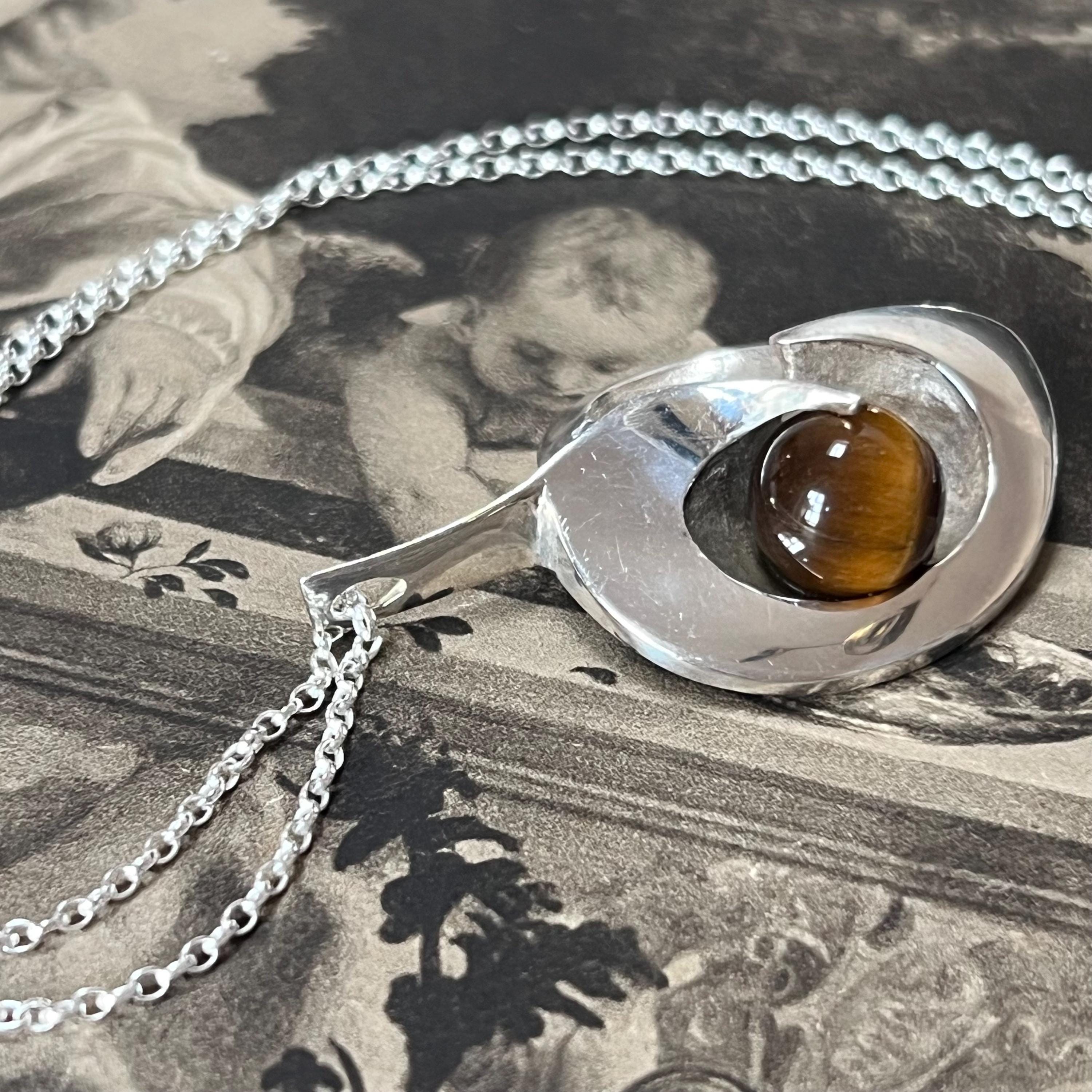 Discover a beautiful blend of Scandinavian craftsmanship and natural gemstone charm with this vintage 925S silver heart pendant set with a stunning 11 mm Tiger’s Eye cabochon. Designed in an elegant Yin-Yang inspired heart shape, this piece radiates balance, warmth, and timeless style.