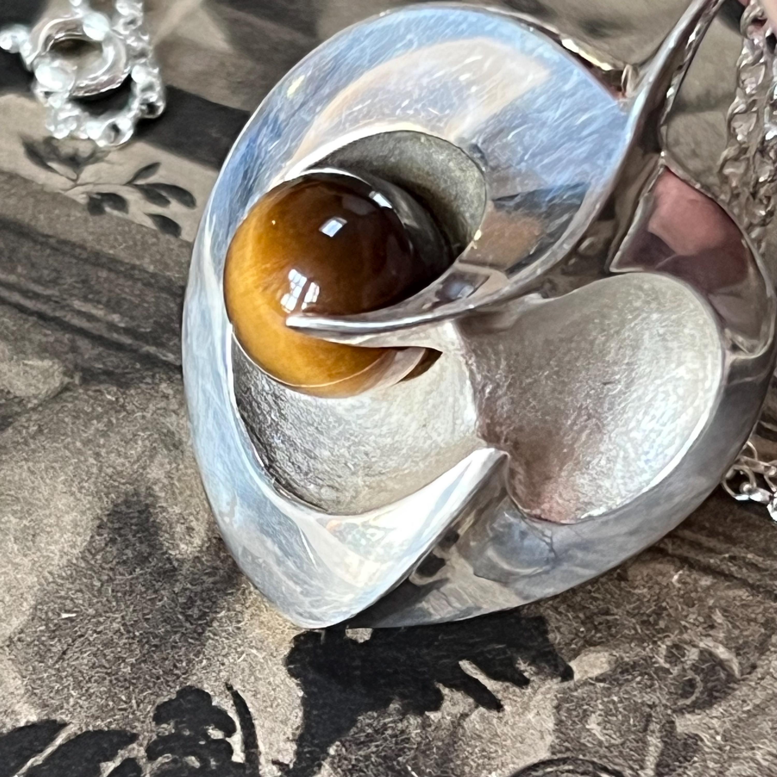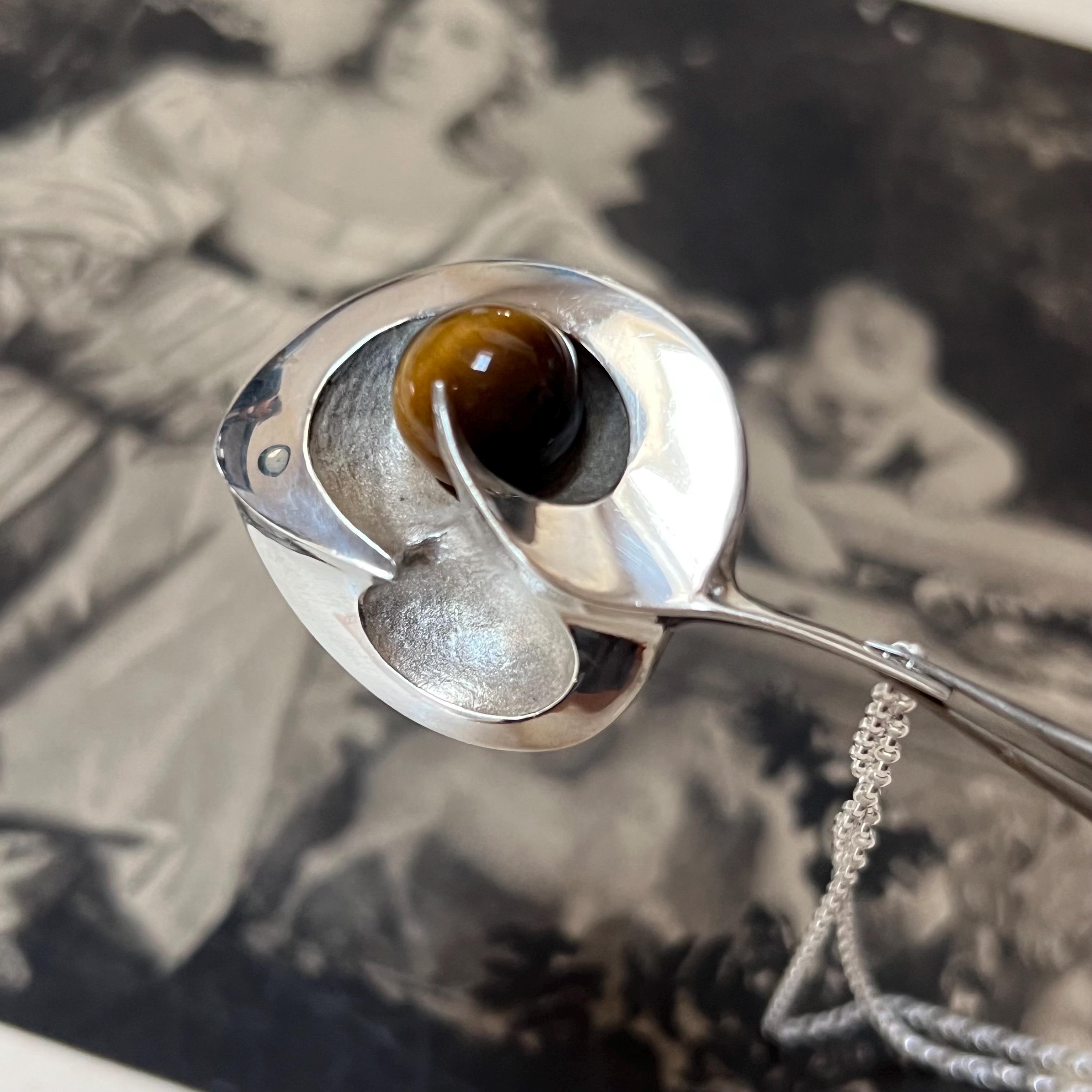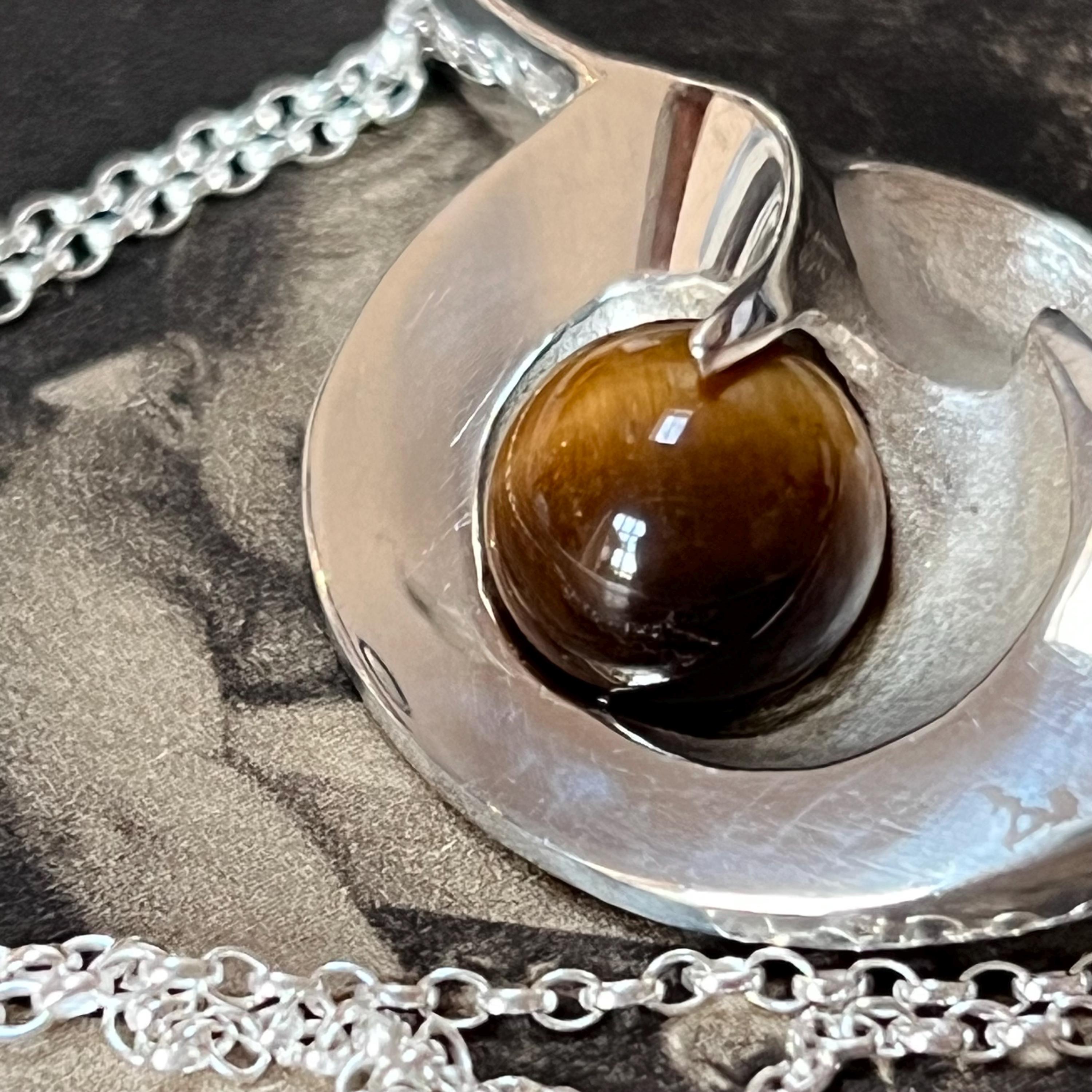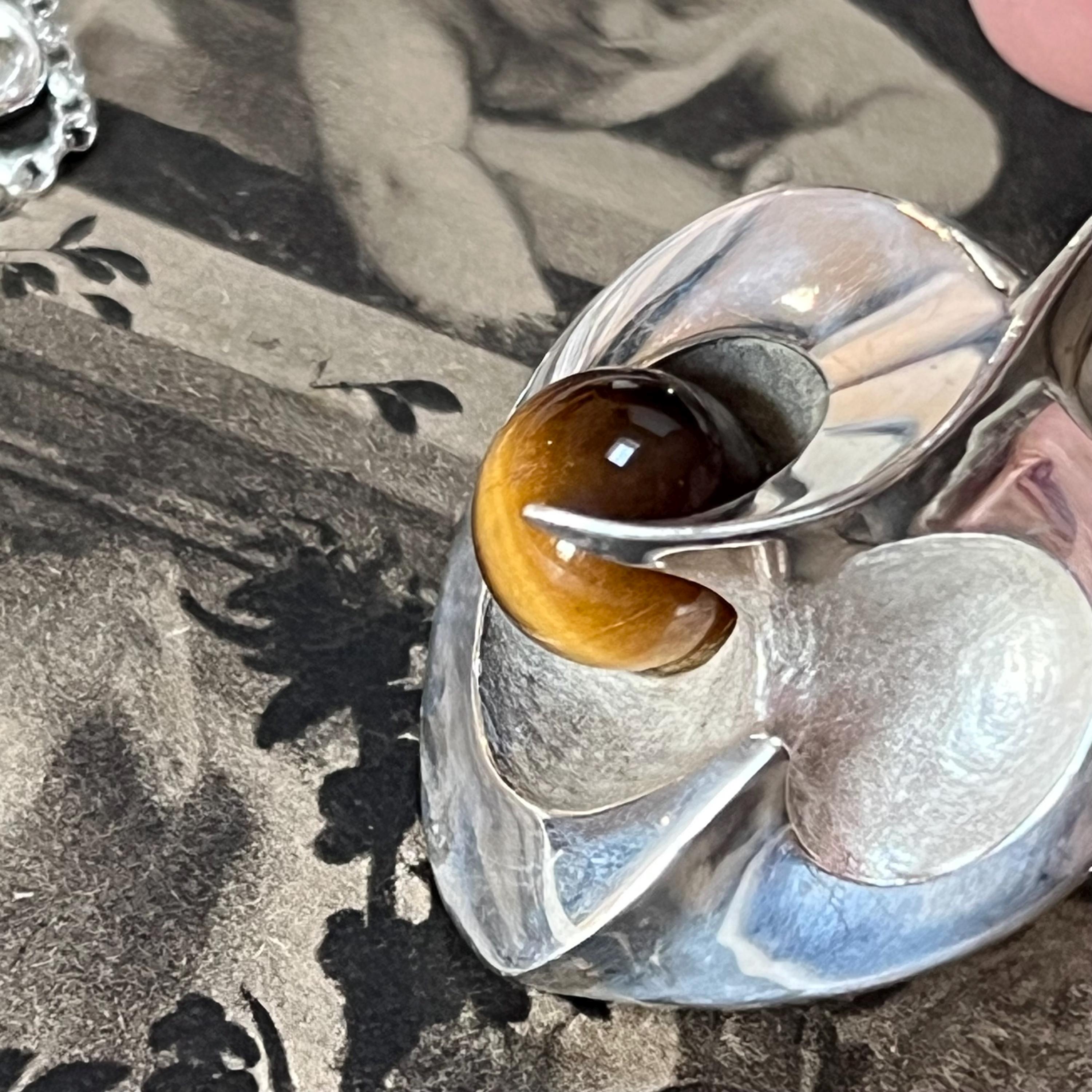 Although the pendant carries the authentic 925S Scandinavian silver stamp, it has no maker’s mark—adding a touch of mystery to its vintage story. The silverwork is smooth, weighty, and beautifully crafted, showcasing the rich brown-gold chatoyancy of the Tiger’s Eye at the edge of the heart’s sweeping curve. An exceptional and outstanding quality piece, one of the best we have seen.