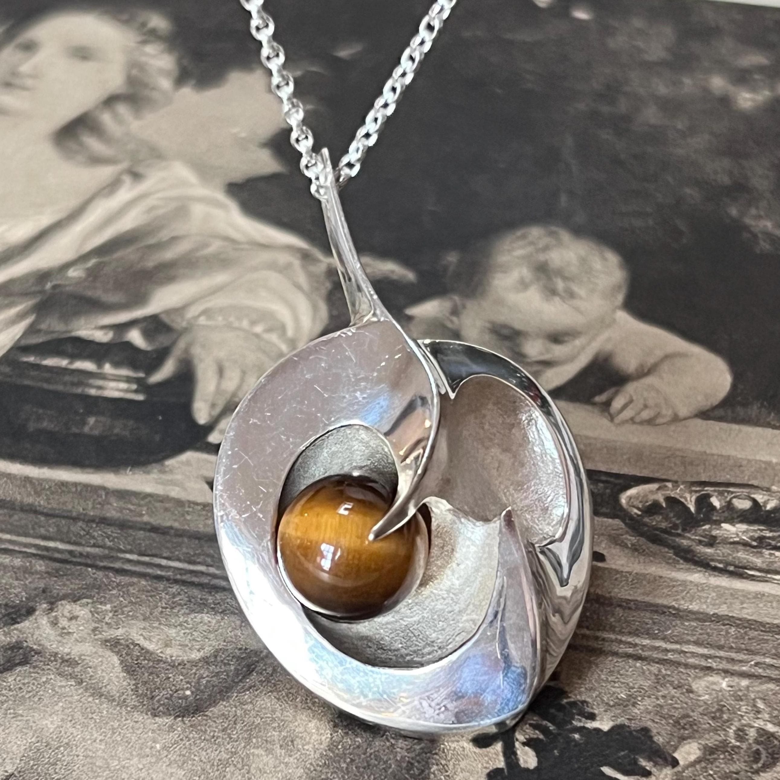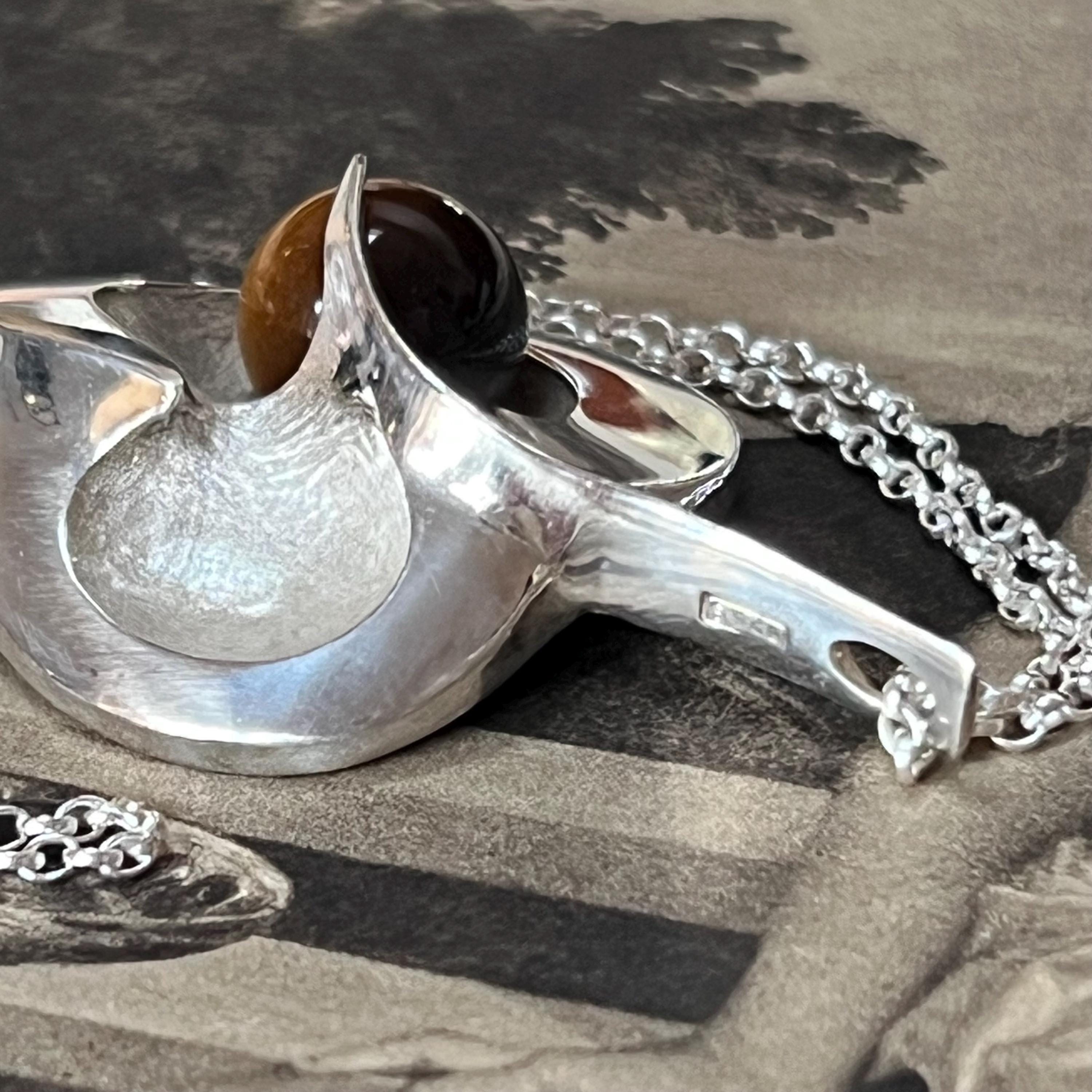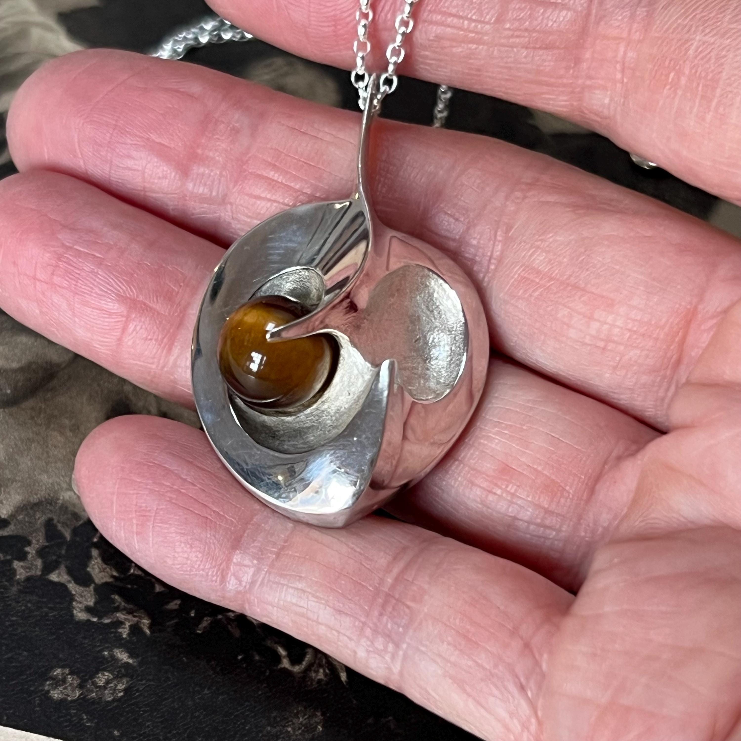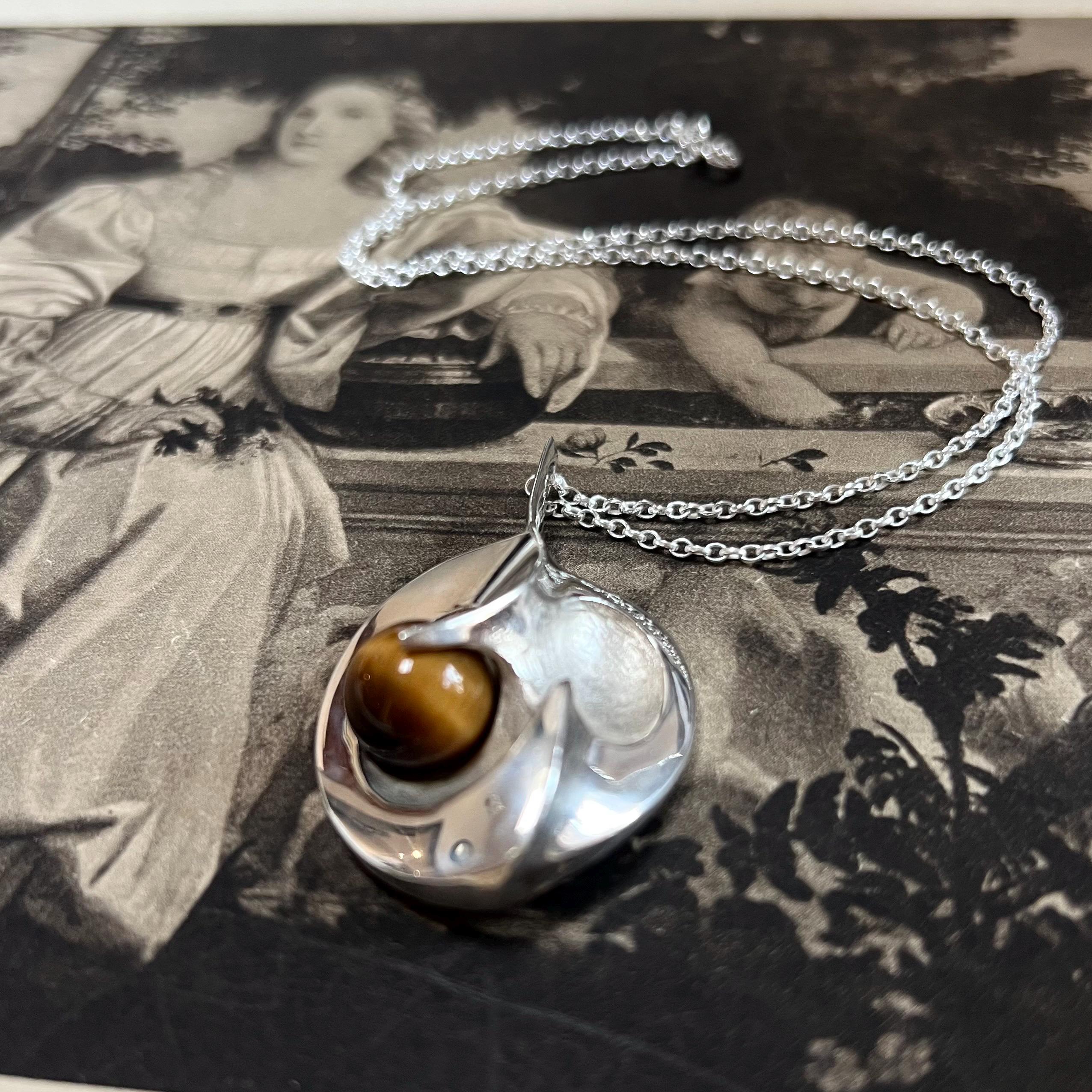 Although the pendant carries the authentic 925S Scandinavian silver stamp, it has no maker’s mark—adding a touch of mystery to its vintage story. The silverwork is smooth, weighty, and beautifully crafted, showcasing the rich brown-gold chatoyancy of the Tiger’s Eye at the edge of the heart’s sweeping curve. An exceptional and outstanding quality piece, one of the best we have seen.