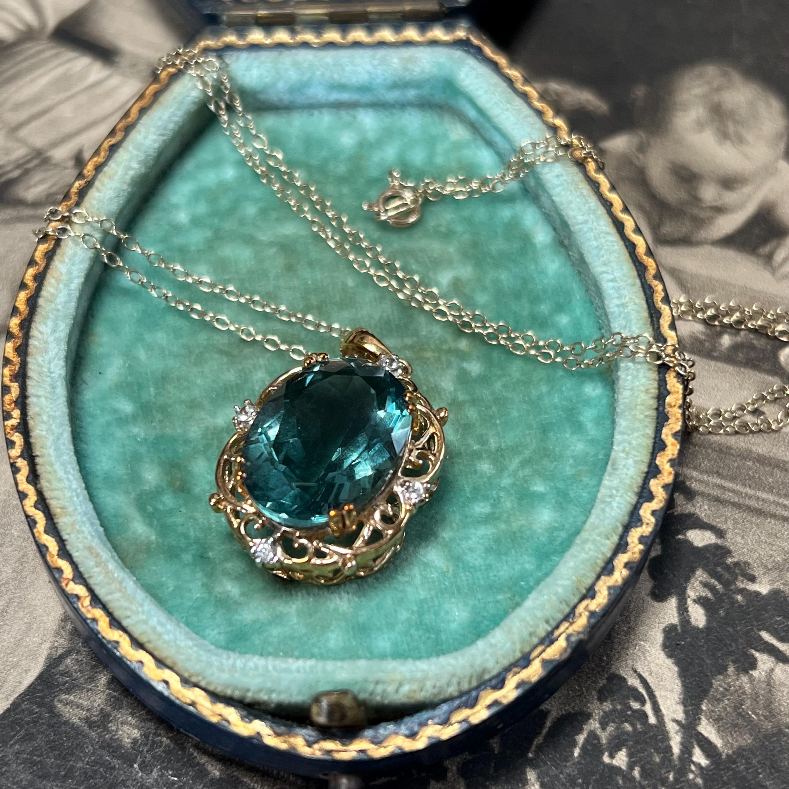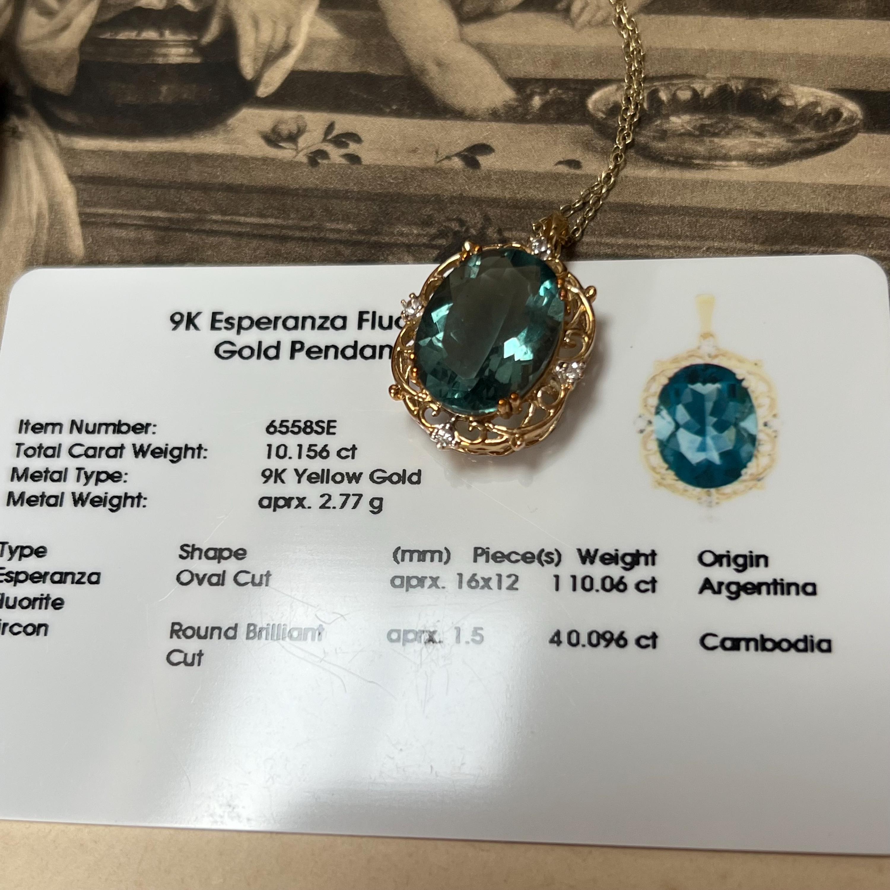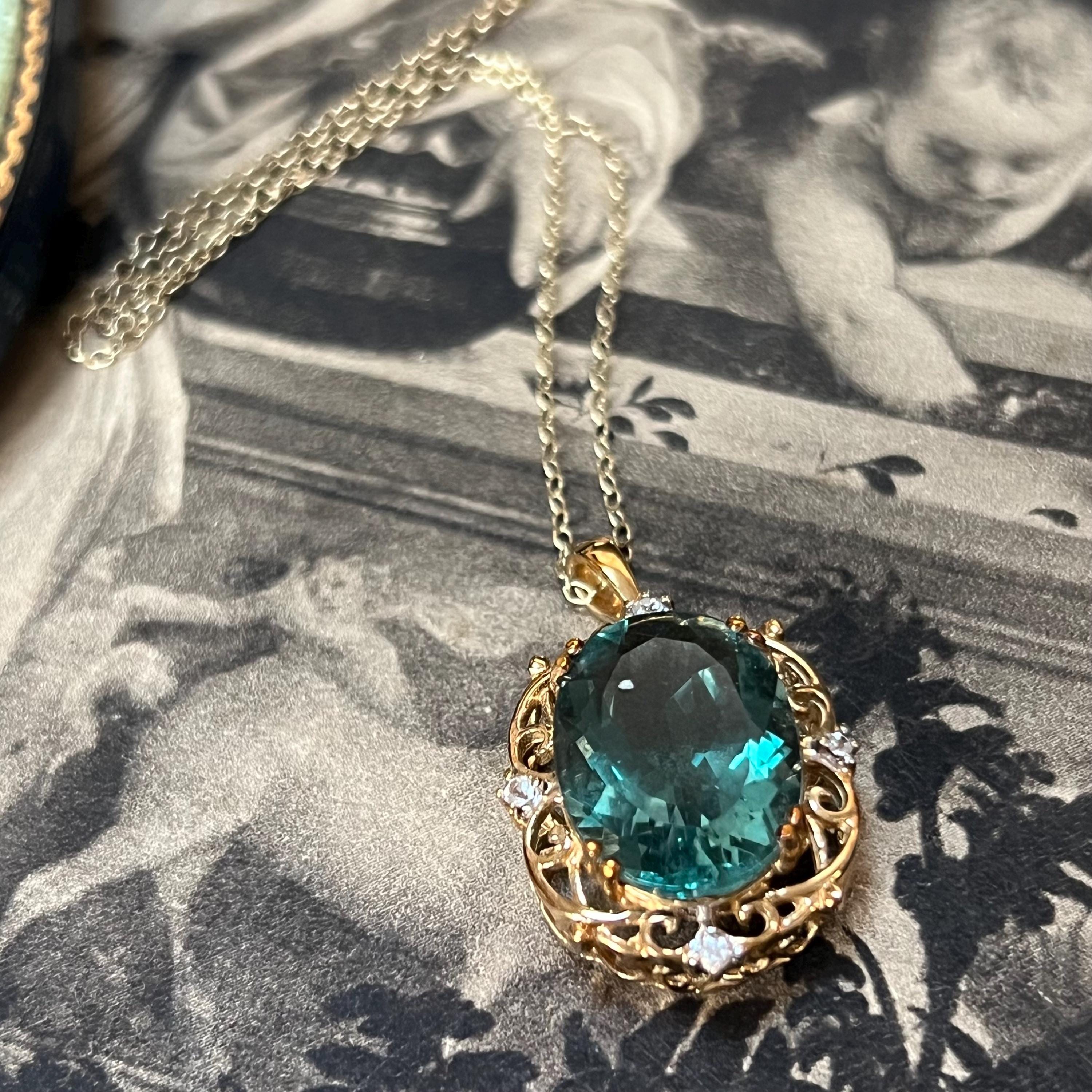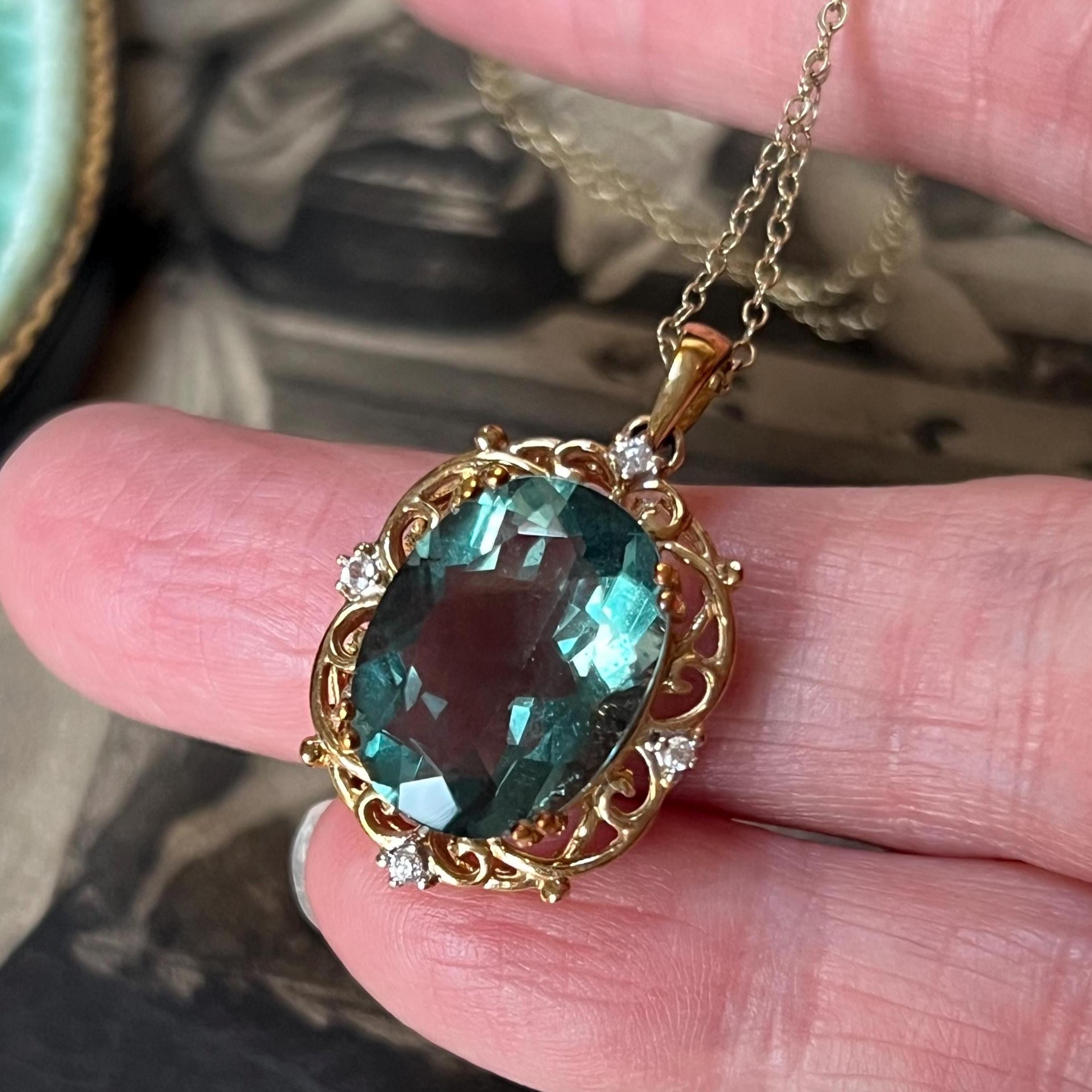 Green Fluorite Oval Cut Pendant in 9k Yellow Gold with White Zircon Accents — 10.06ct Certified Gemstone. Vintage 375 (9k) solid gold chain, measuring 19" / 48 cm. Designed in an antique-inspired mount.