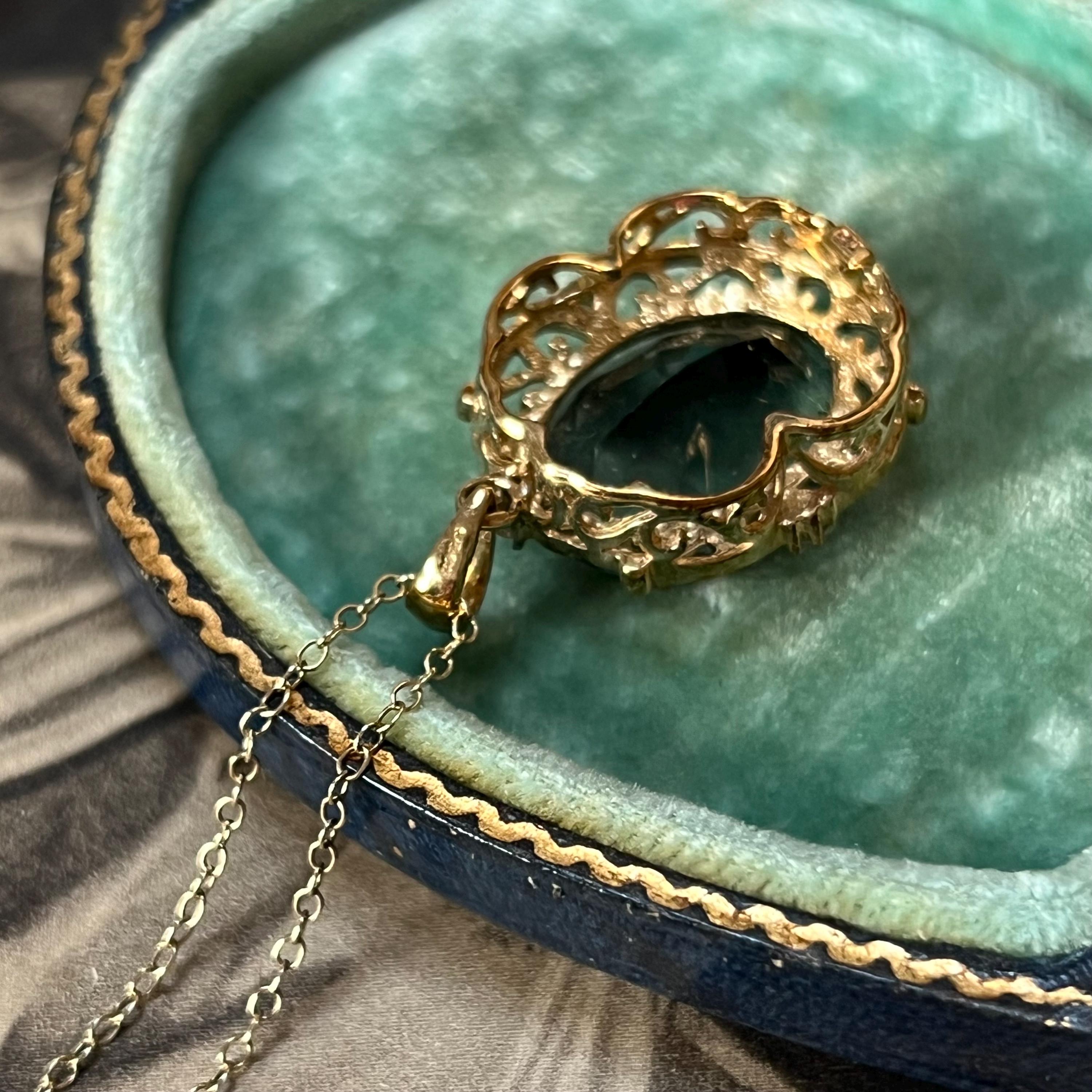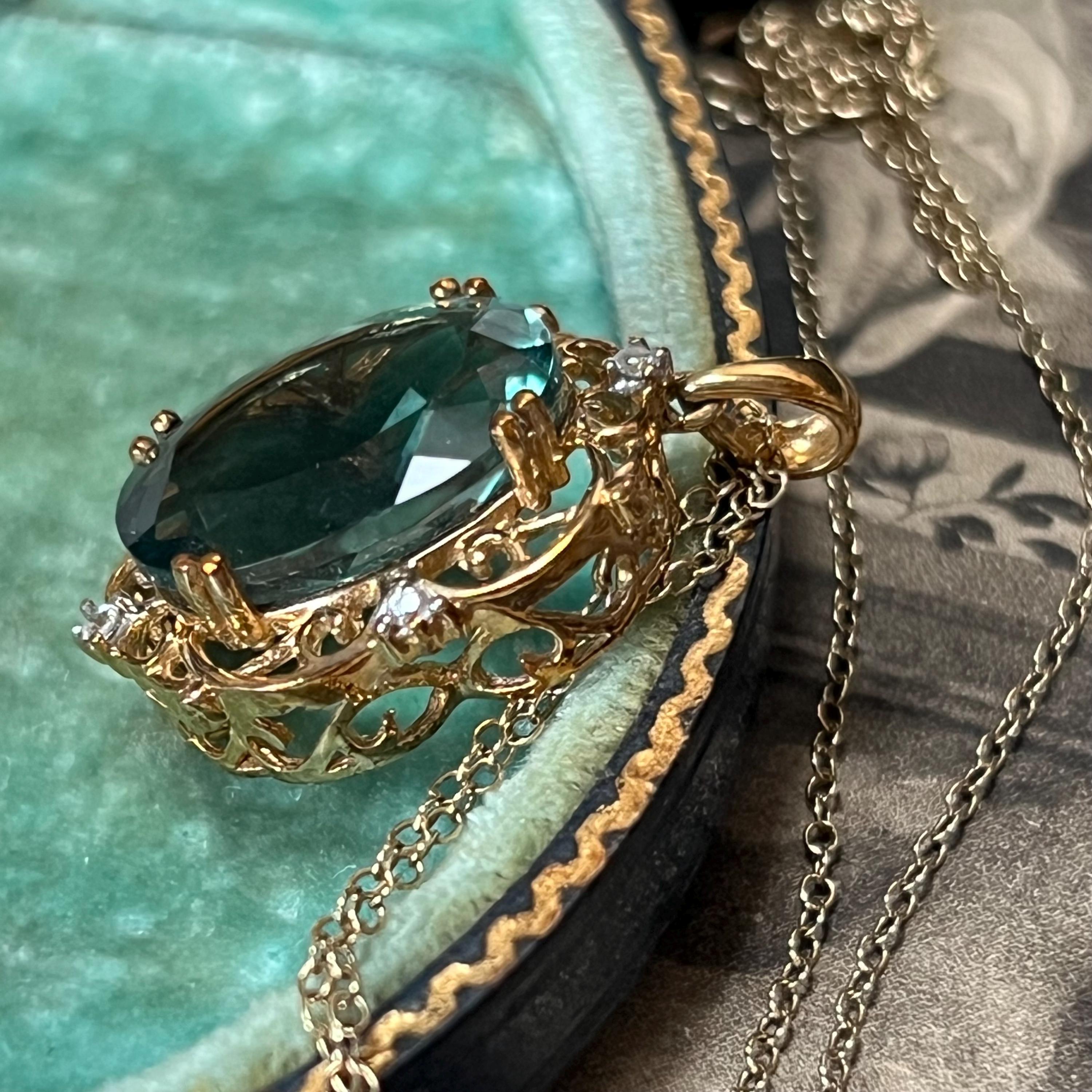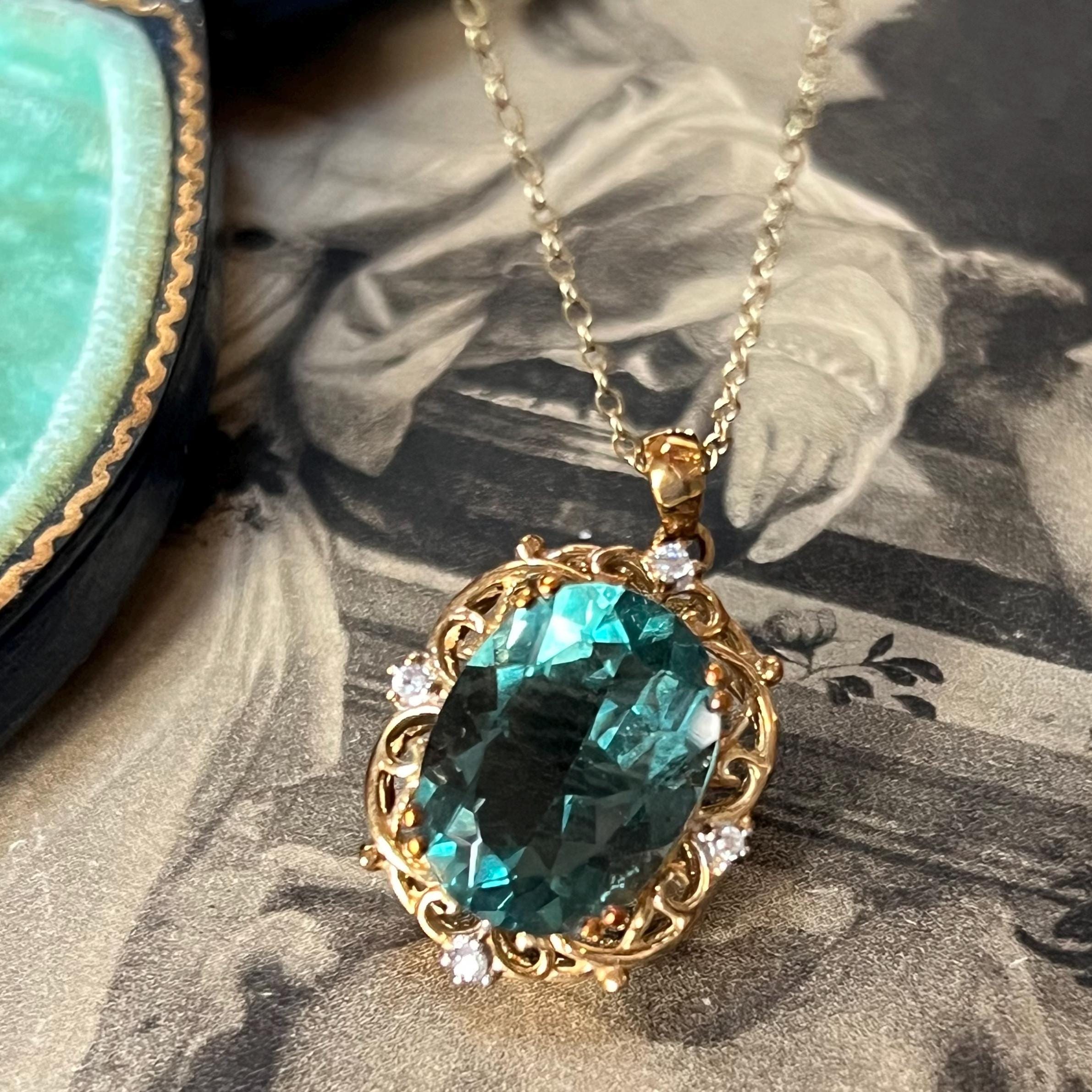 Green Fluorite Oval Cut Pendant in 9k Yellow Gold with White Zircon Accents — 10.06ct Certified Gemstone. Vintage 375 (9k) solid gold chain, measuring 19" / 48 cm. Designed in an antique-inspired mount.