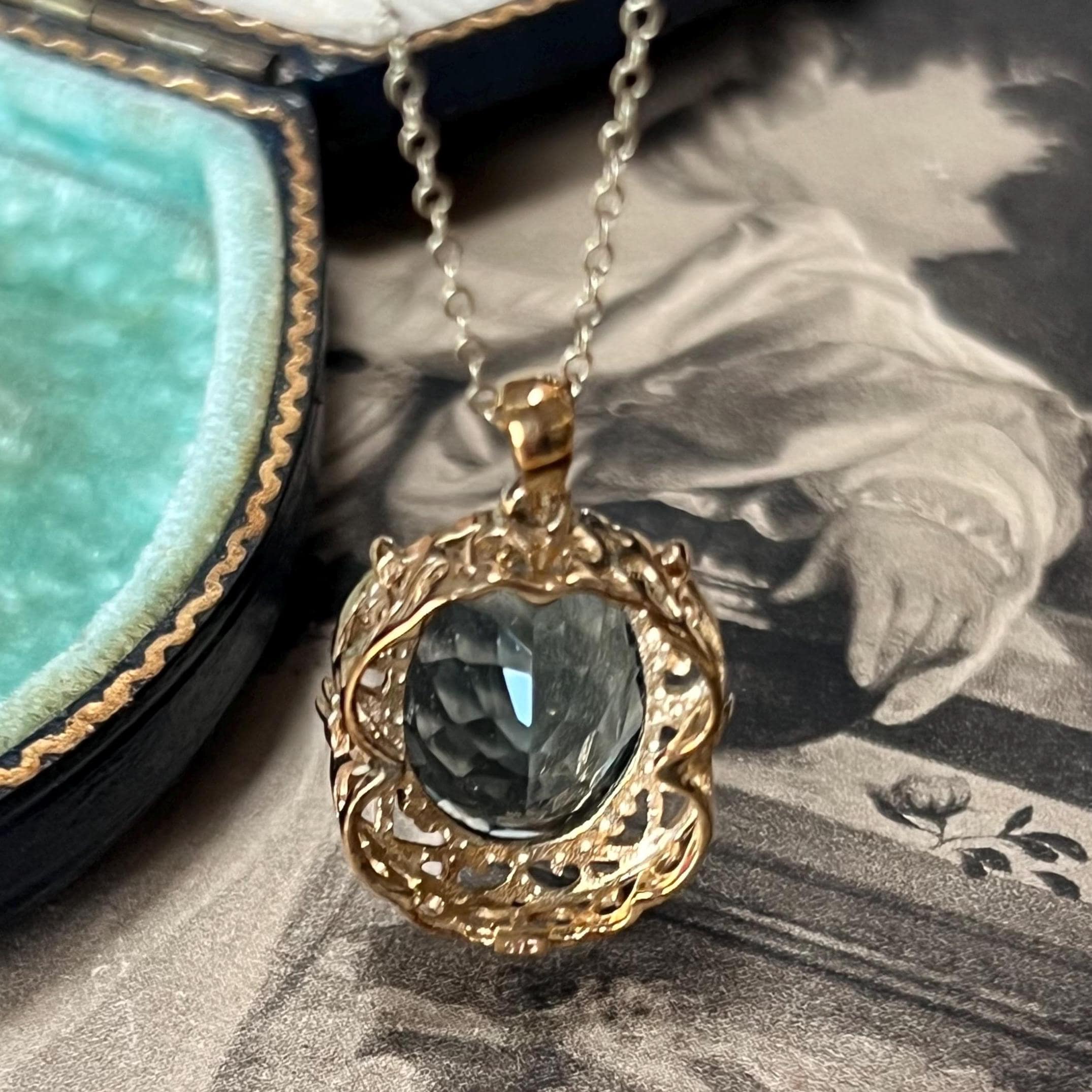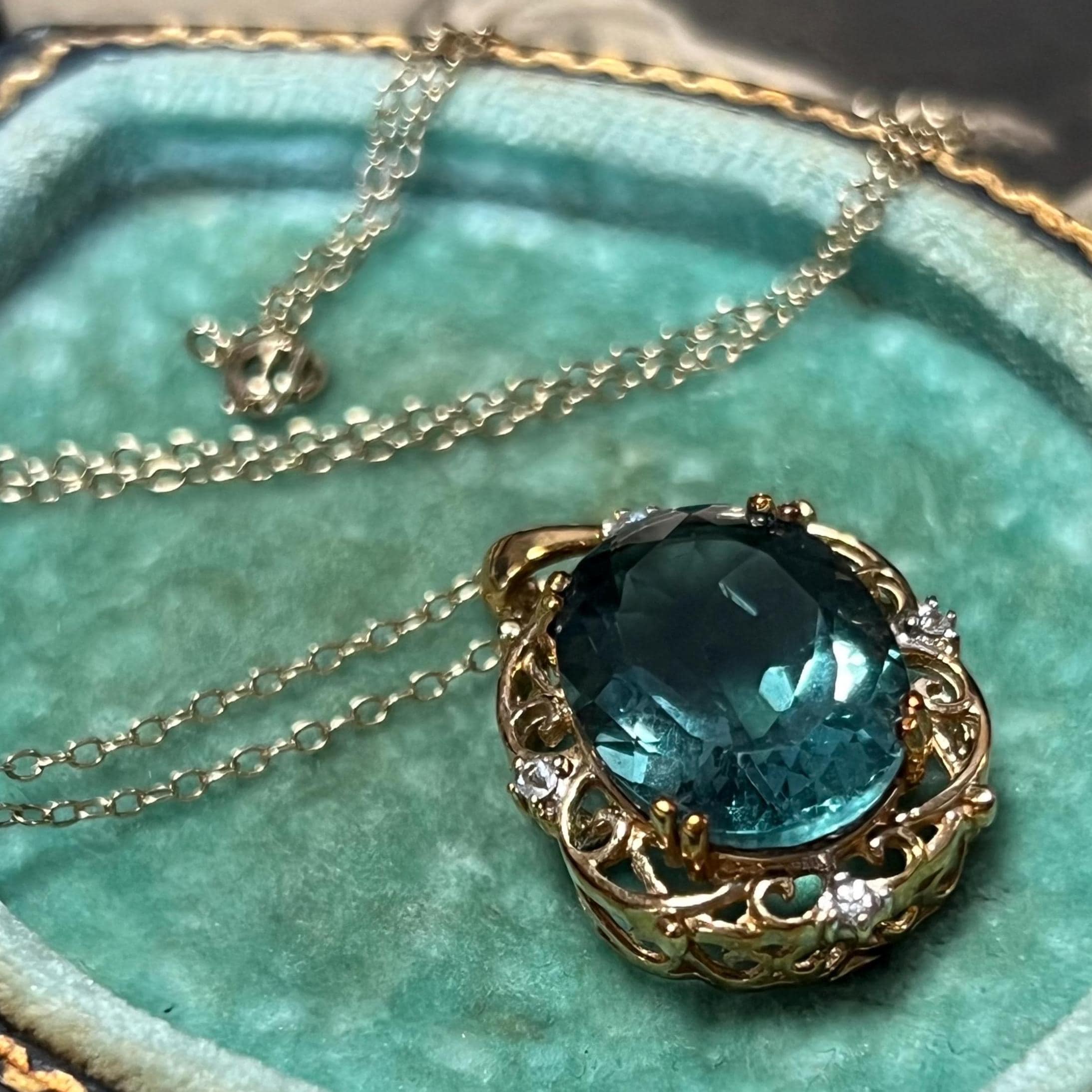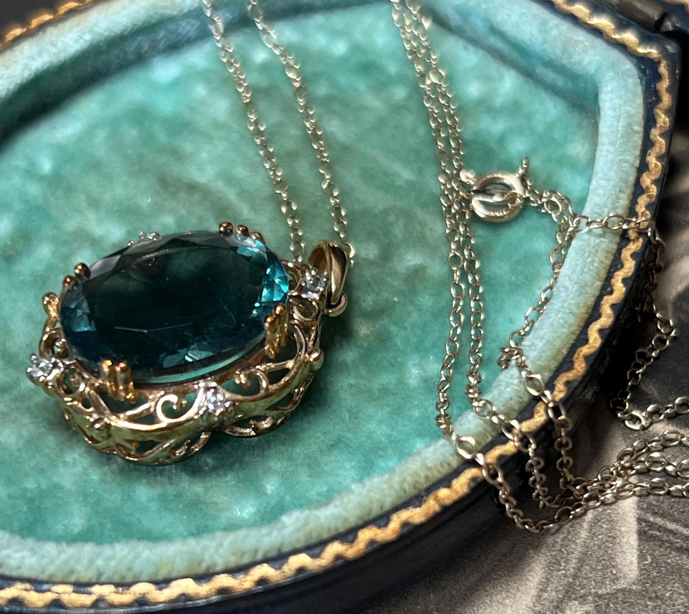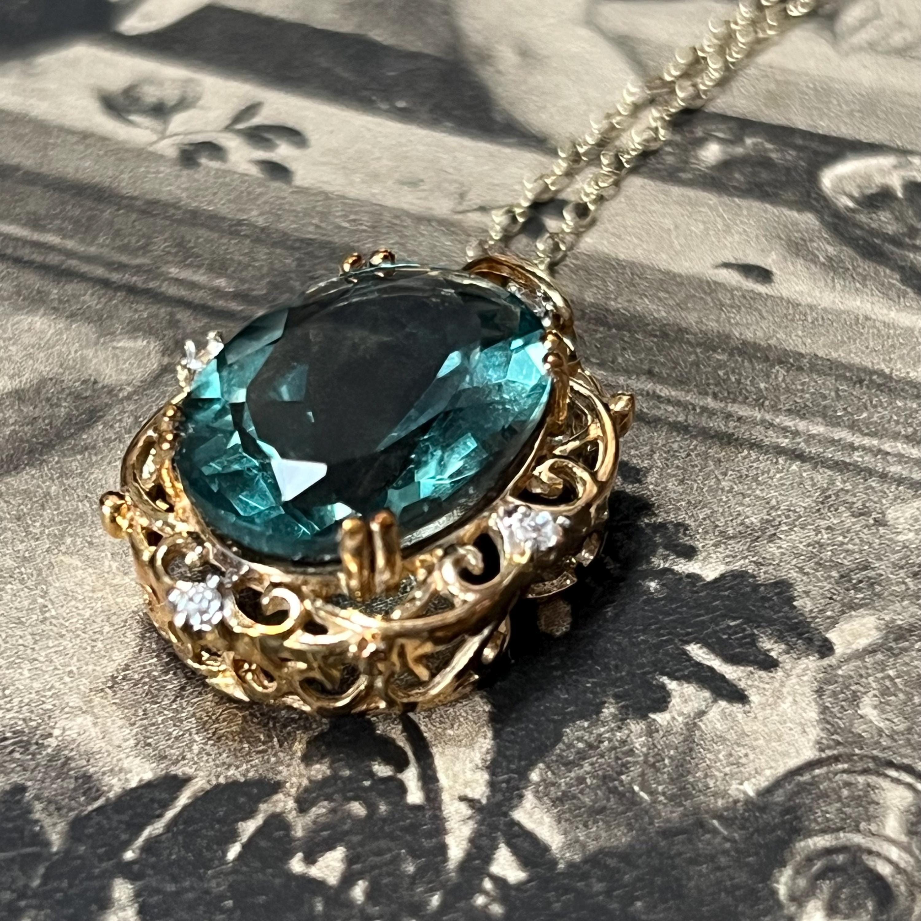 Green Fluorite Oval Cut Pendant in 9k Yellow Gold with White Zircon Accents — 10.06ct Certified Gemstone. Vintage 375 (9k) solid gold chain, measuring 19" / 48 cm. Designed in an antique-inspired mount.
