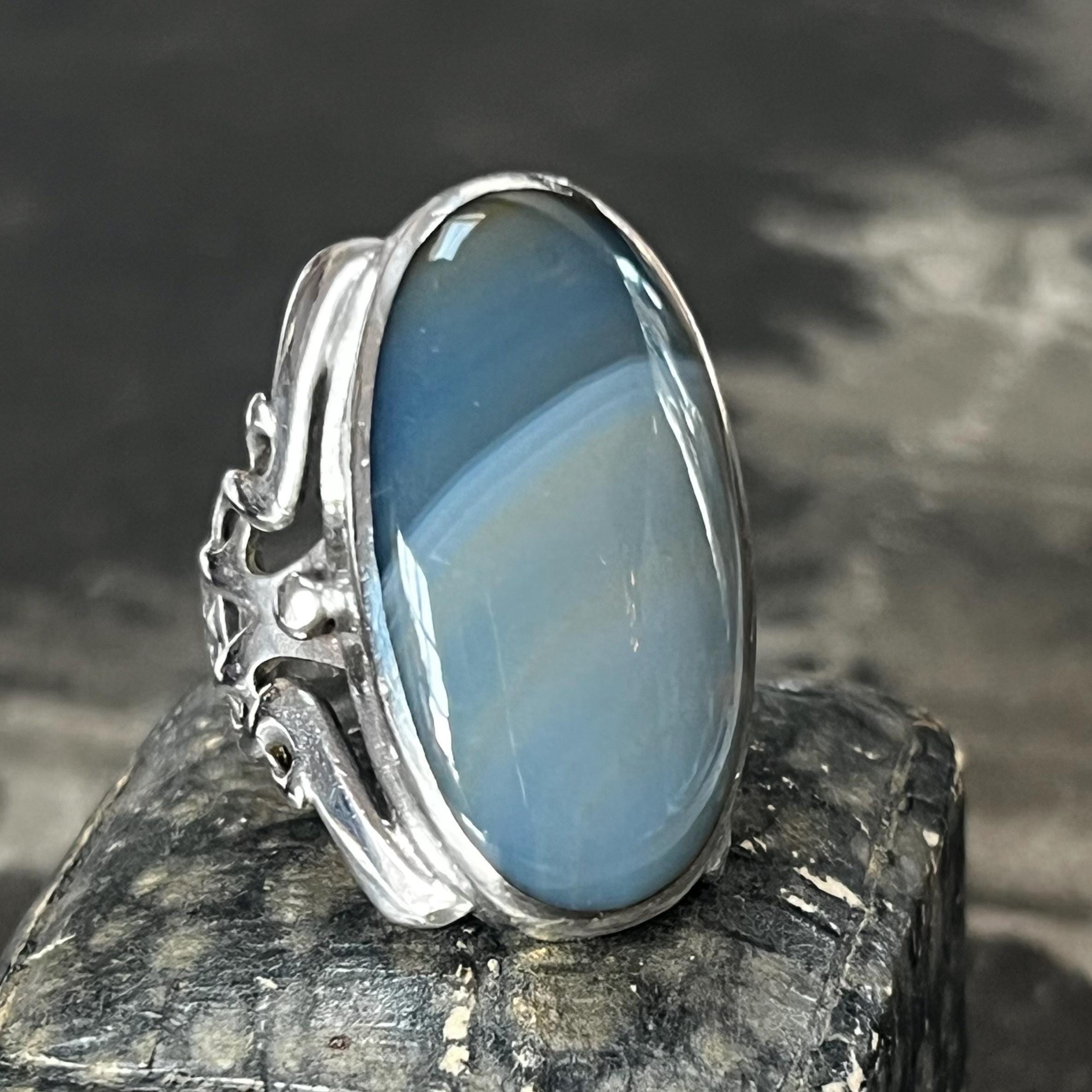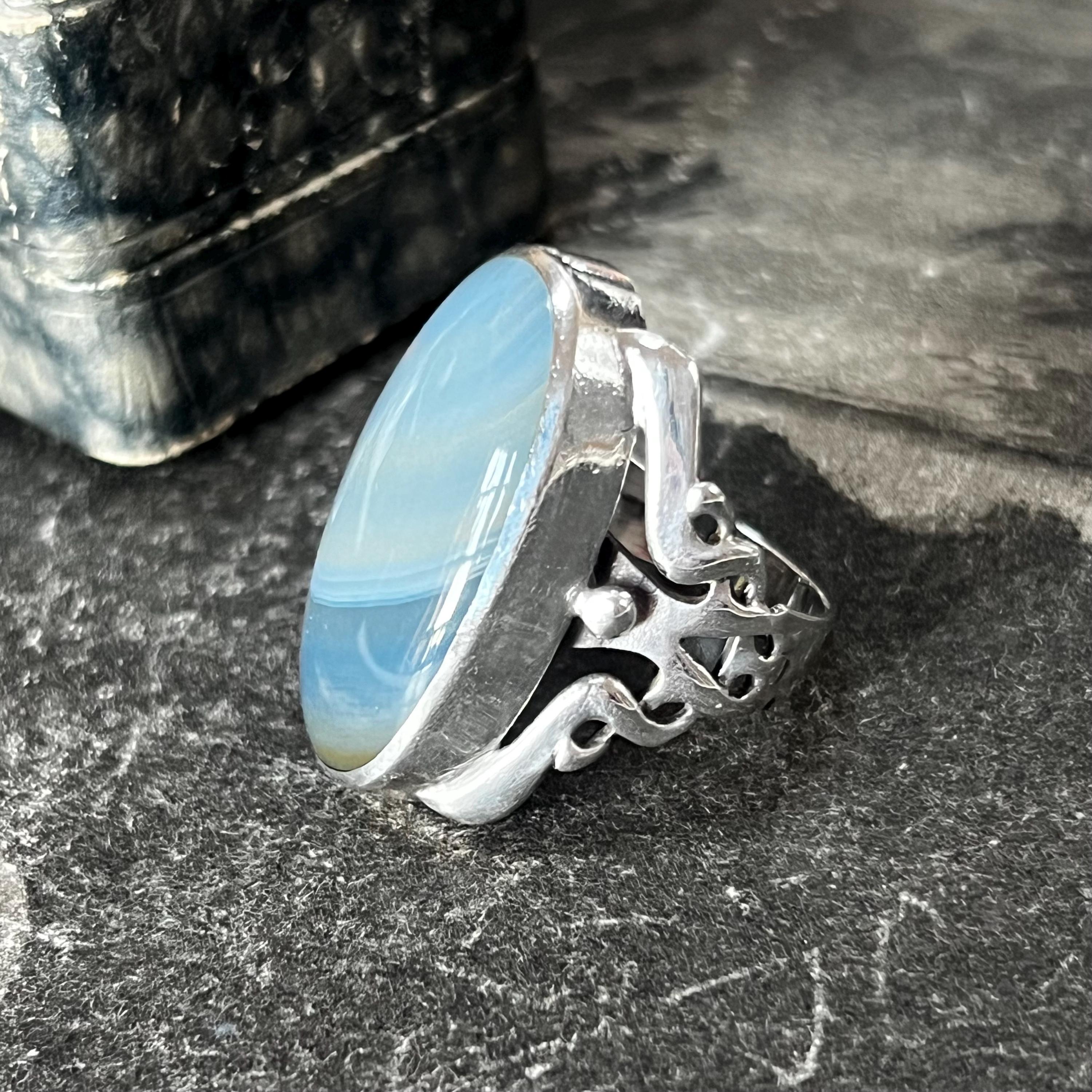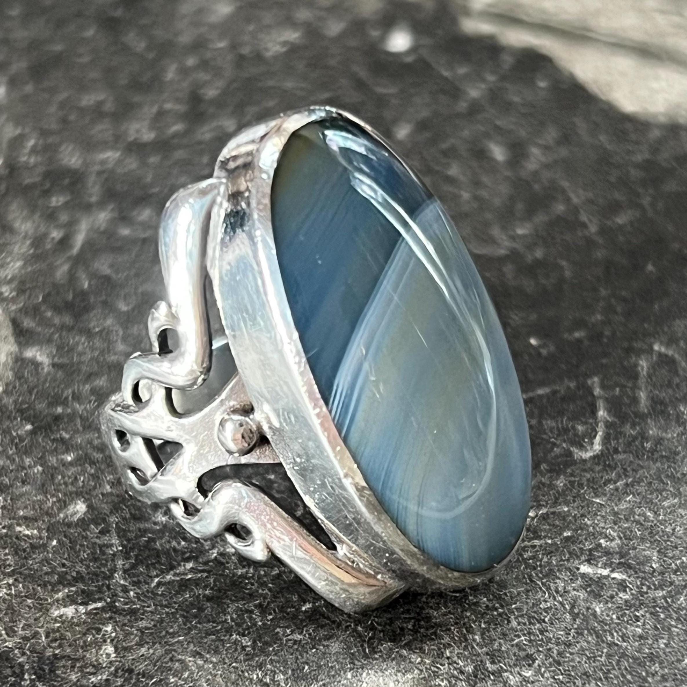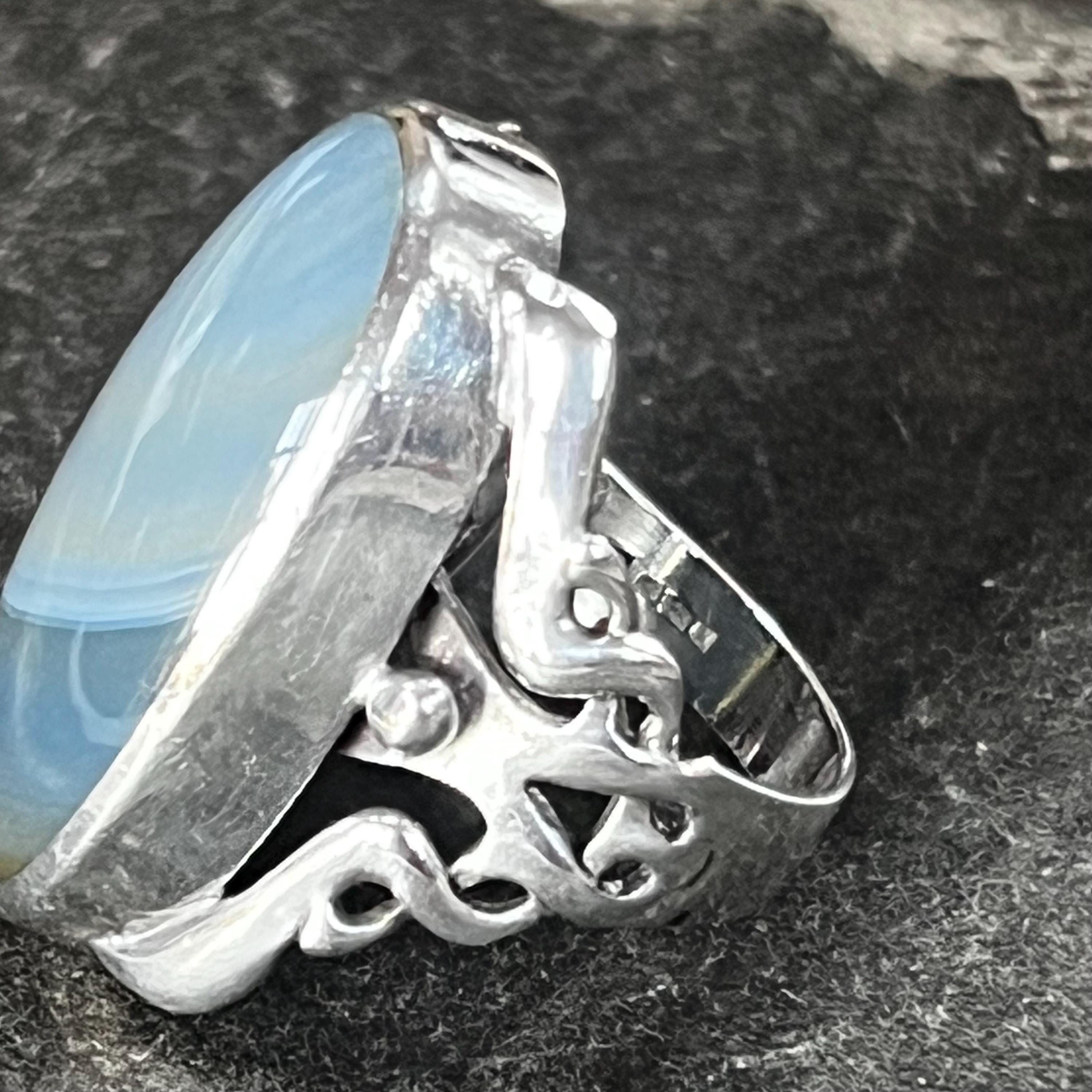 A beautifully crafted vintage sterling silver statement ring by respected British silversmith David Scott Walker (DSW), fully hallmarked and dating to 1998. This striking ring features a large oval blue agate cabochon in a soft, smoky blue tone, deeply bezel set to emphasise the stone’s natural depth and translucence. The agate is perfectly contrasted by the ring’s ornately styled shoulders, while a mother of pearl backing adds an extra layer of subtle iridescence and craftsmanship. The ring bears aged hallmarks for DSW, the Lion Passant, 925 sterling silver, and the 1998 date letter, confirming both authenticity and quality.