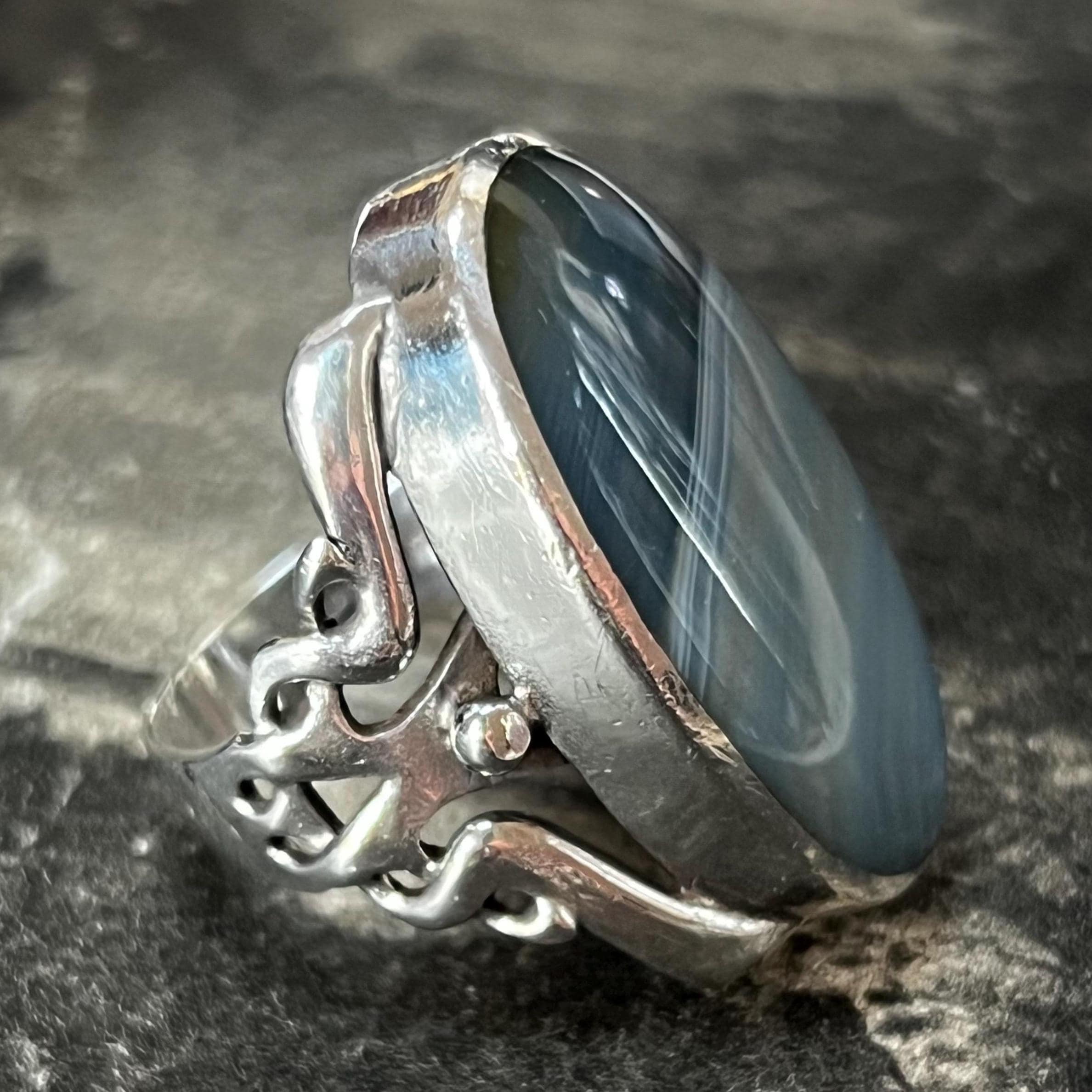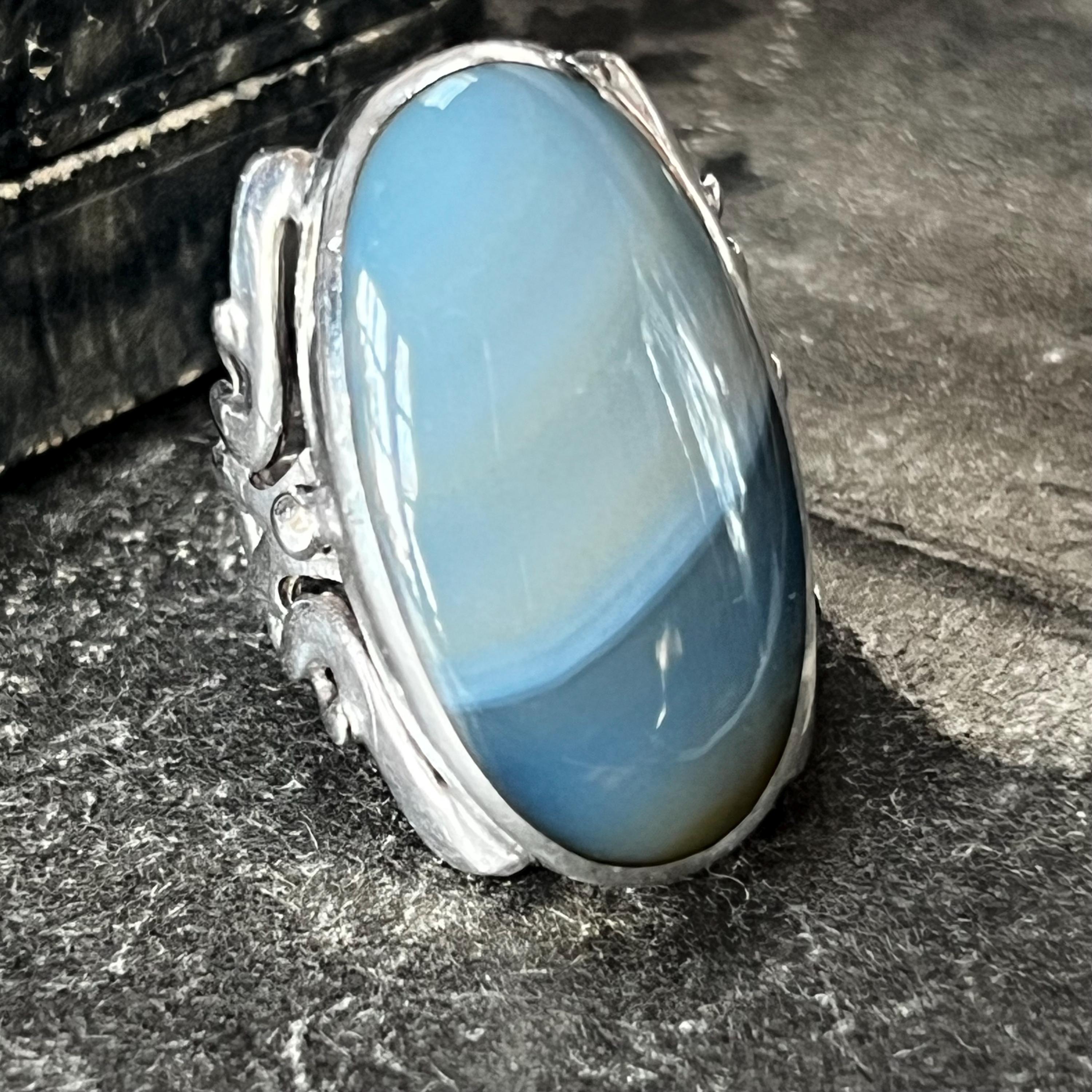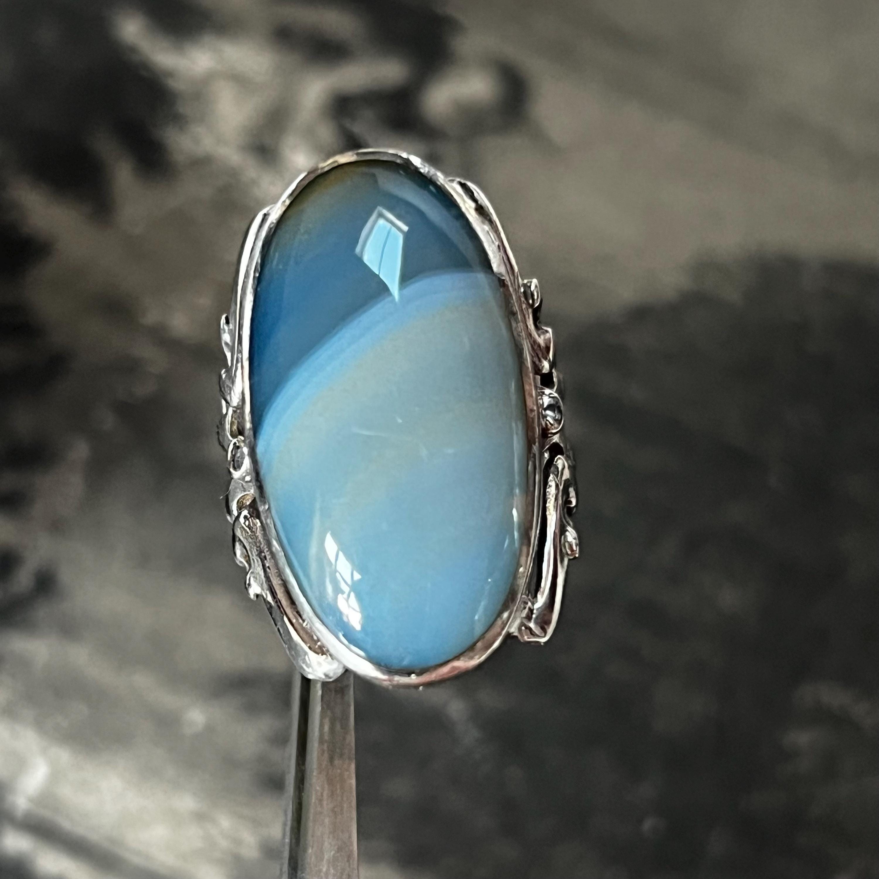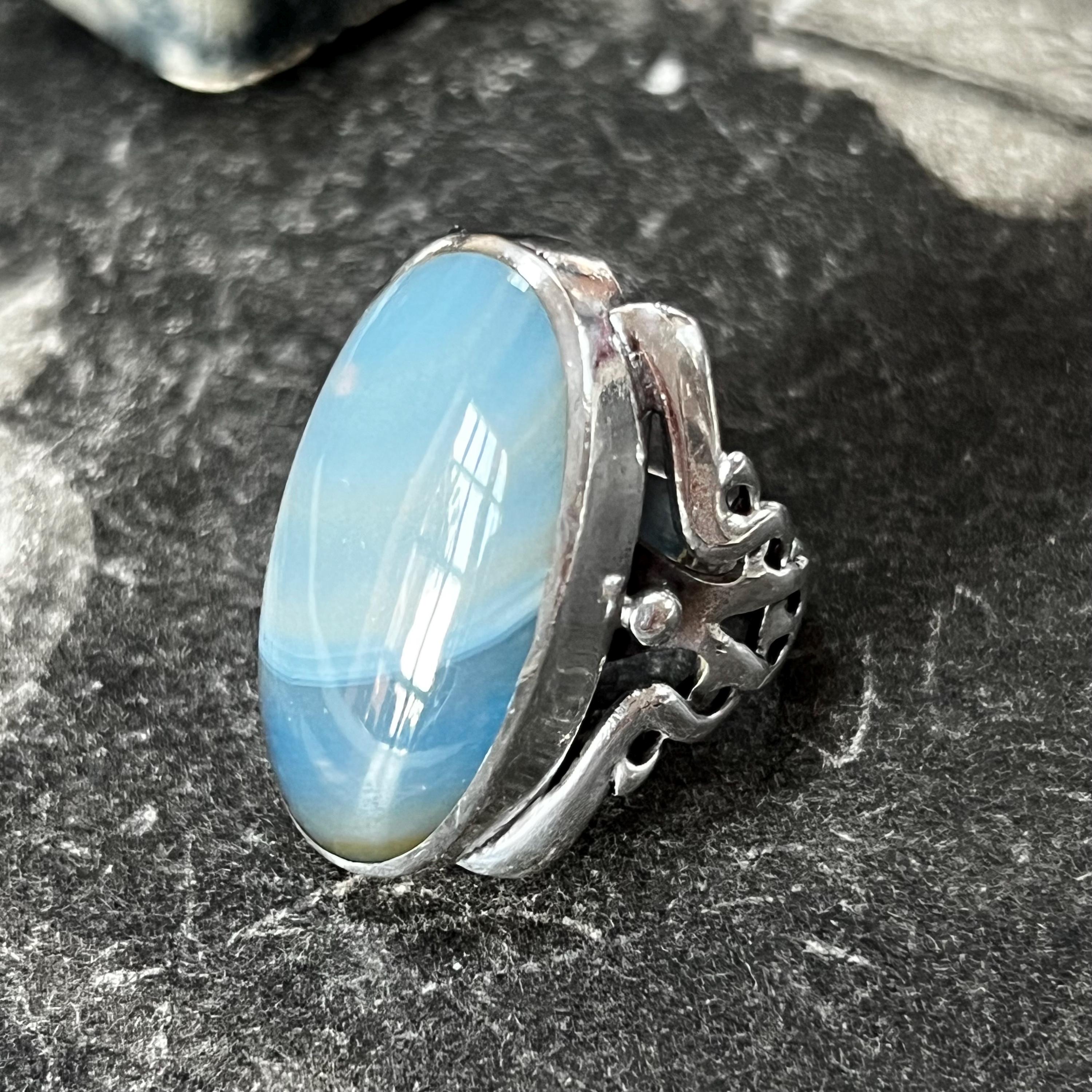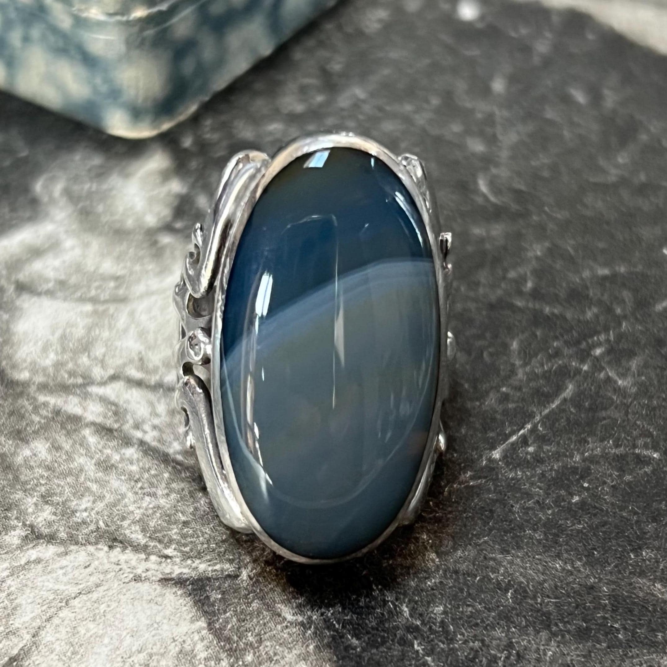 A beautifully crafted vintage sterling silver statement ring by respected British silversmith David Scott Walker (DSW), fully hallmarked and dating to 1998. This striking ring features a large oval blue agate cabochon in a soft, smoky blue tone, deeply bezel set to emphasise the stone’s natural depth and translucence. The agate is perfectly contrasted by the ring’s ornately styled shoulders, while a mother of pearl backing adds an extra layer of subtle iridescence and craftsmanship. The ring bears aged hallmarks for DSW, the Lion Passant, 925 sterling silver, and the 1998 date letter, confirming both authenticity and quality.