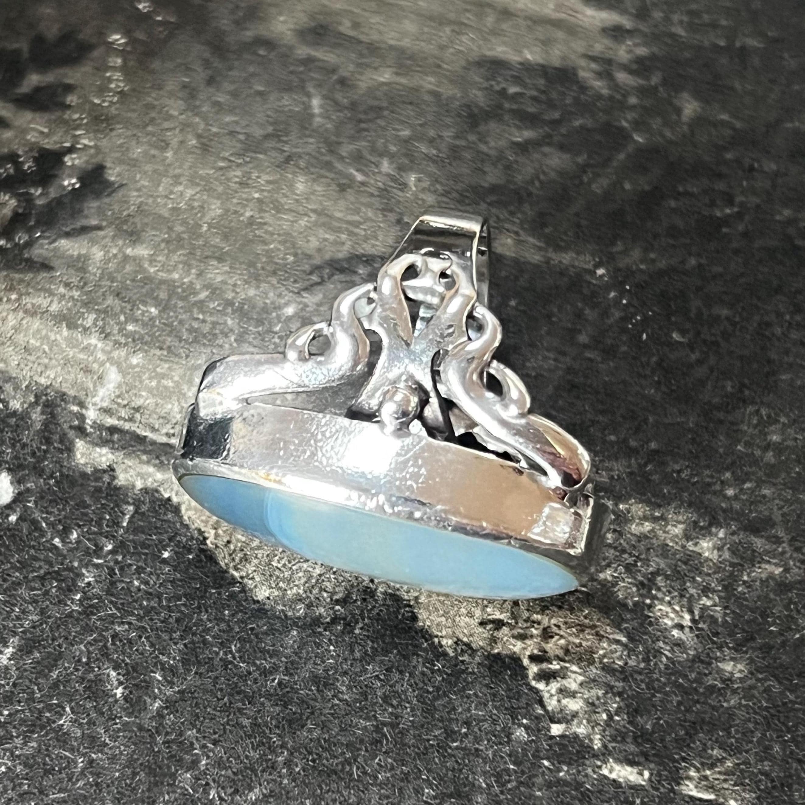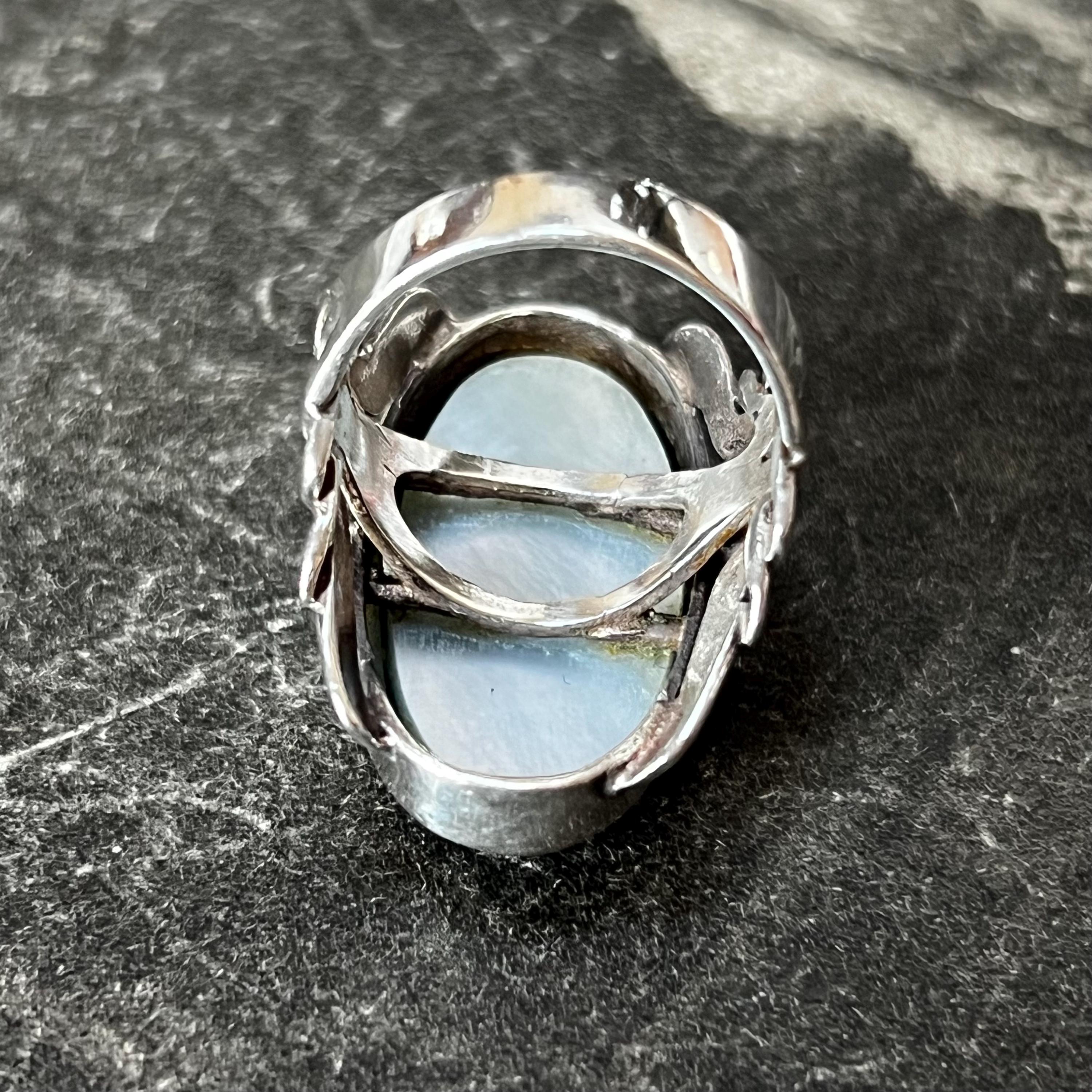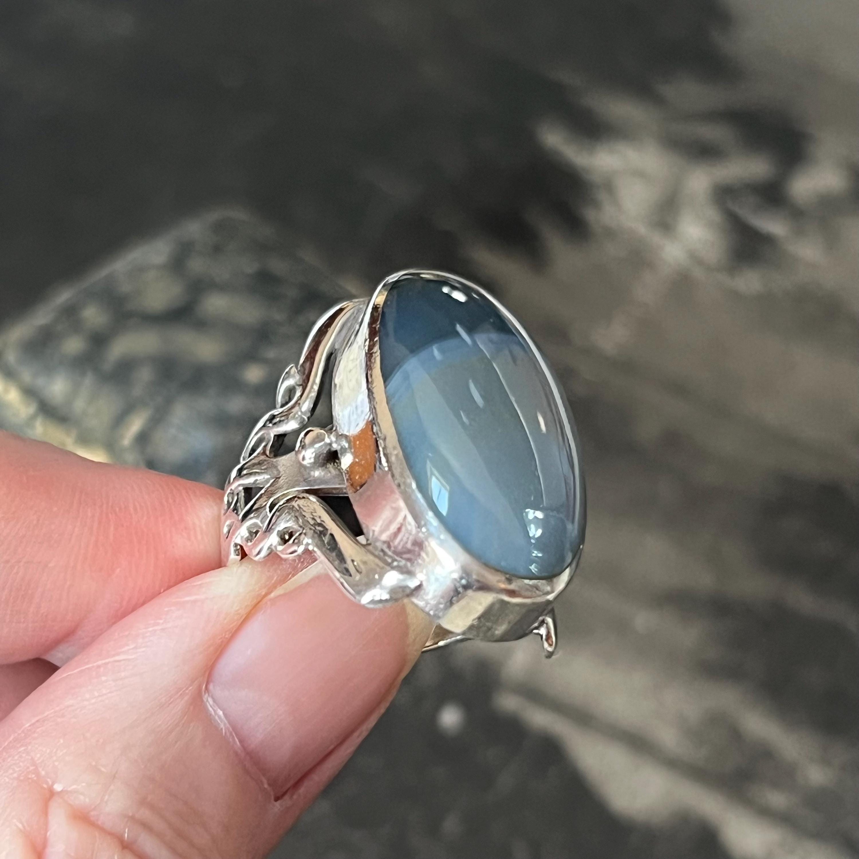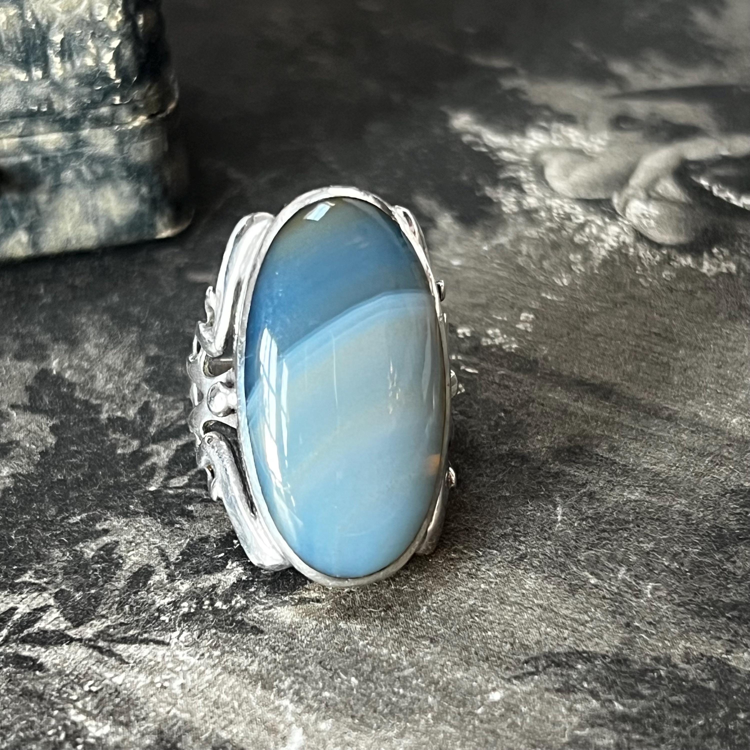 A beautifully crafted vintage sterling silver statement ring by respected British silversmith David Scott Walker (DSW), fully hallmarked and dating to 1998. This striking ring features a large oval blue agate cabochon in a soft, smoky blue tone, deeply bezel set to emphasise the stone’s natural depth and translucence. The agate is perfectly contrasted by the ring’s ornately styled shoulders, while a mother of pearl backing adds an extra layer of subtle iridescence and craftsmanship. The ring bears aged hallmarks for DSW, the Lion Passant, 925 sterling silver, and the 1998 date letter, confirming both authenticity and quality.