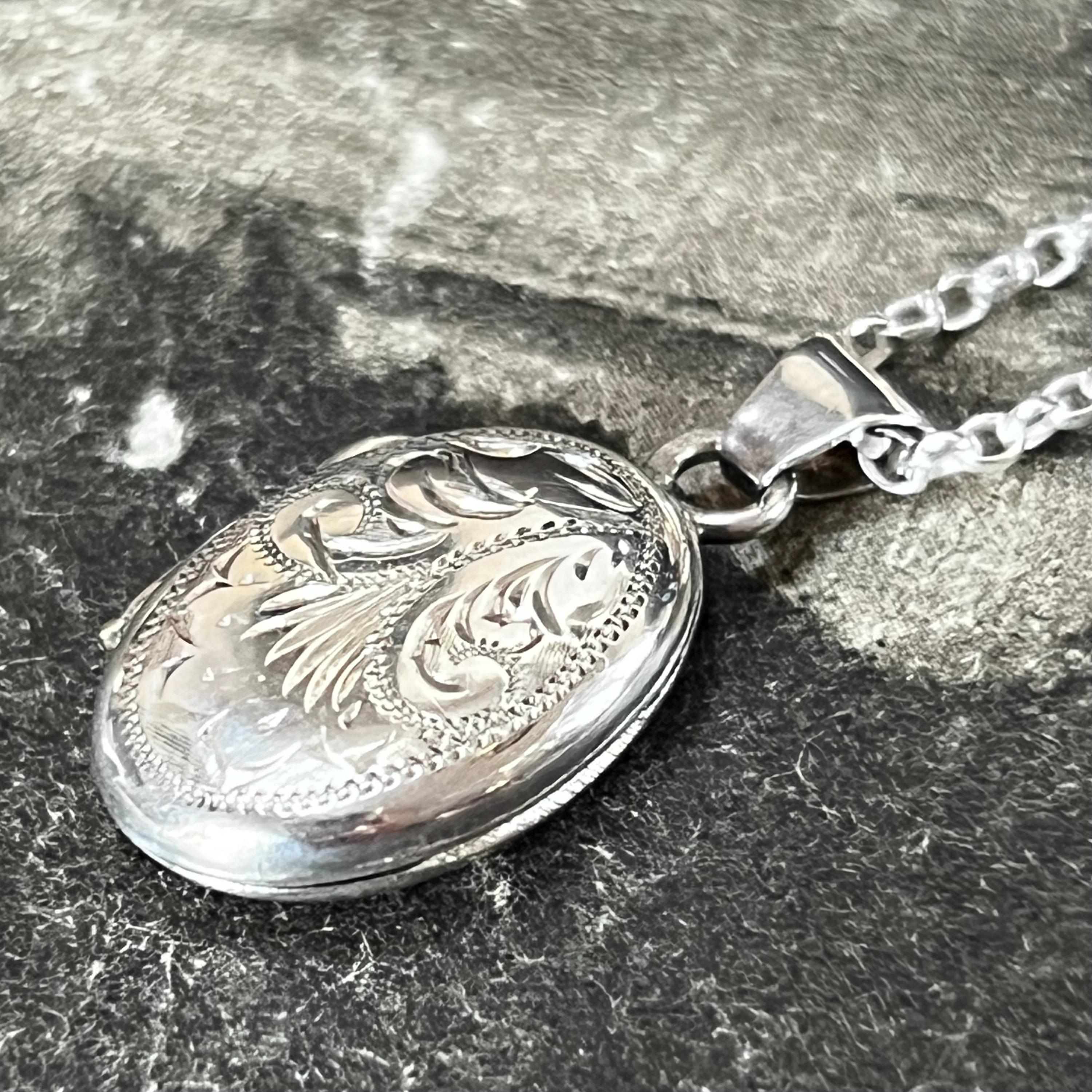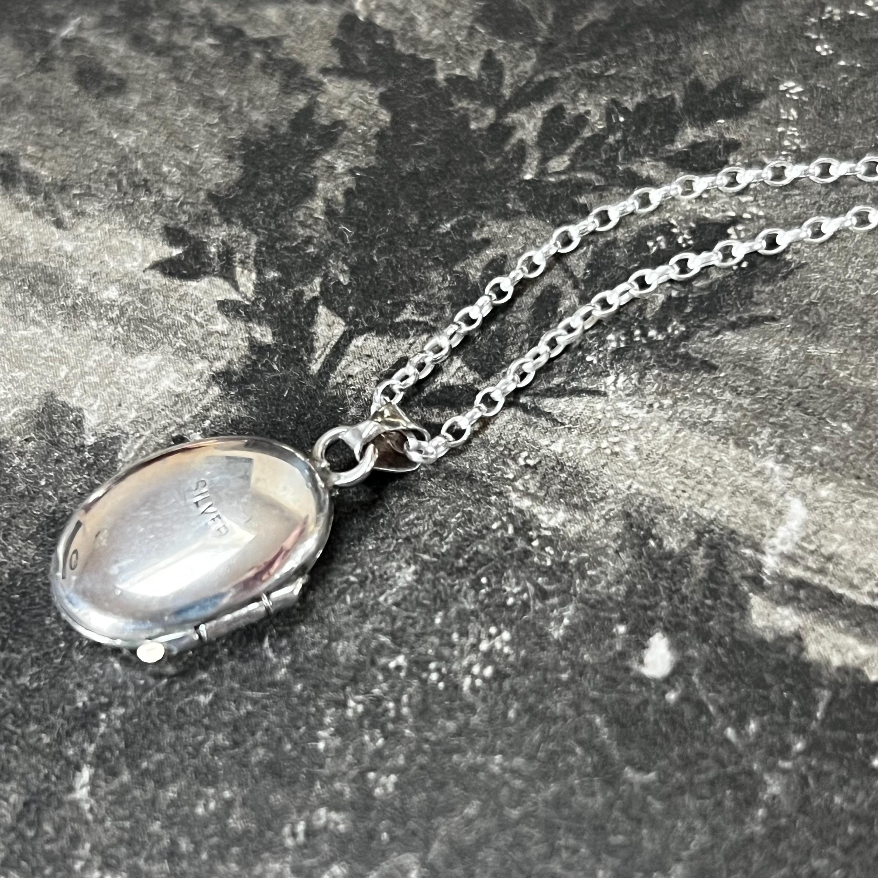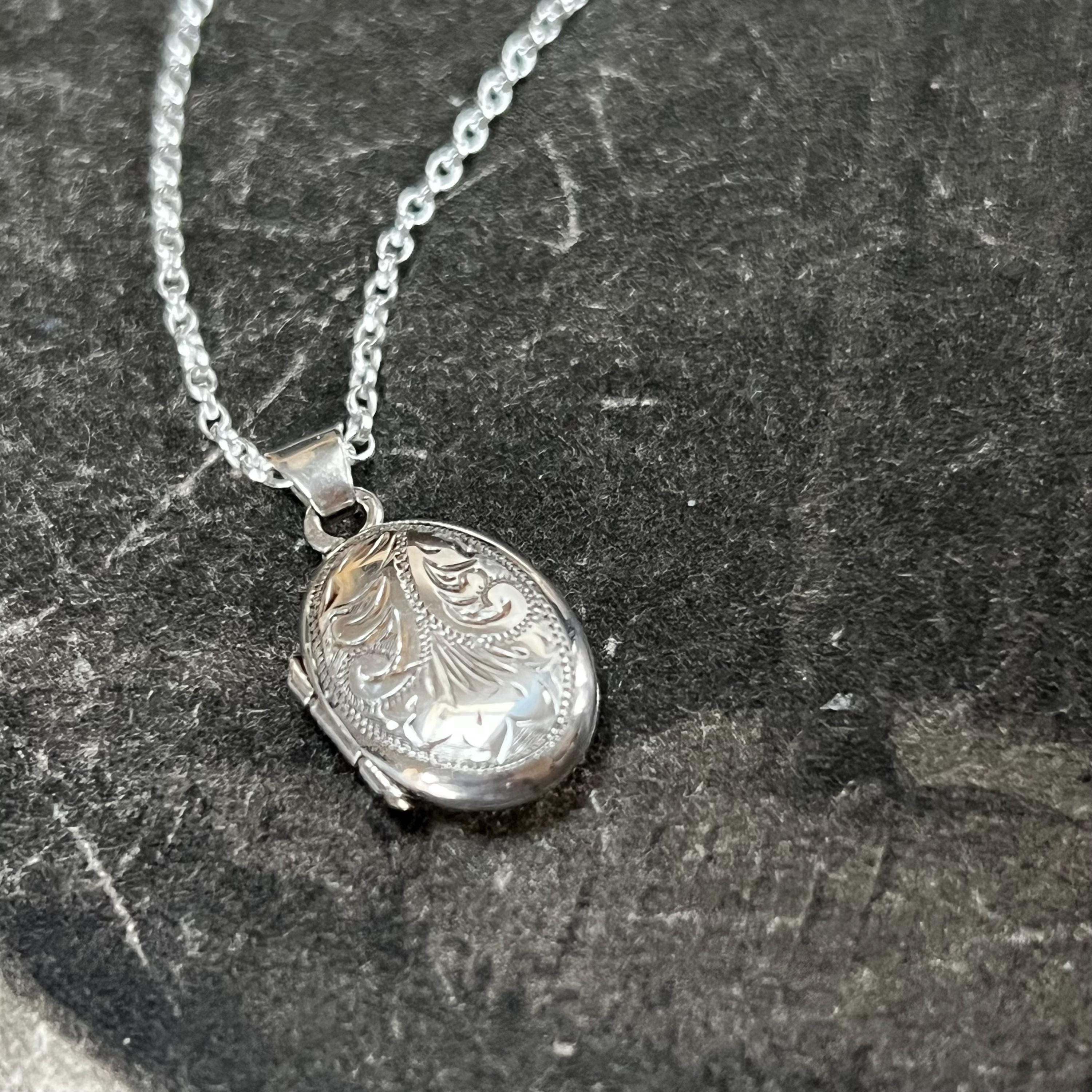 A charming vintage oval sterling silver locket necklace, perfect for holding a tiny photo or keepsake. The locket features delicate engraved detail to the front and is stamped “silver” on the reverse, confirming authenticity.