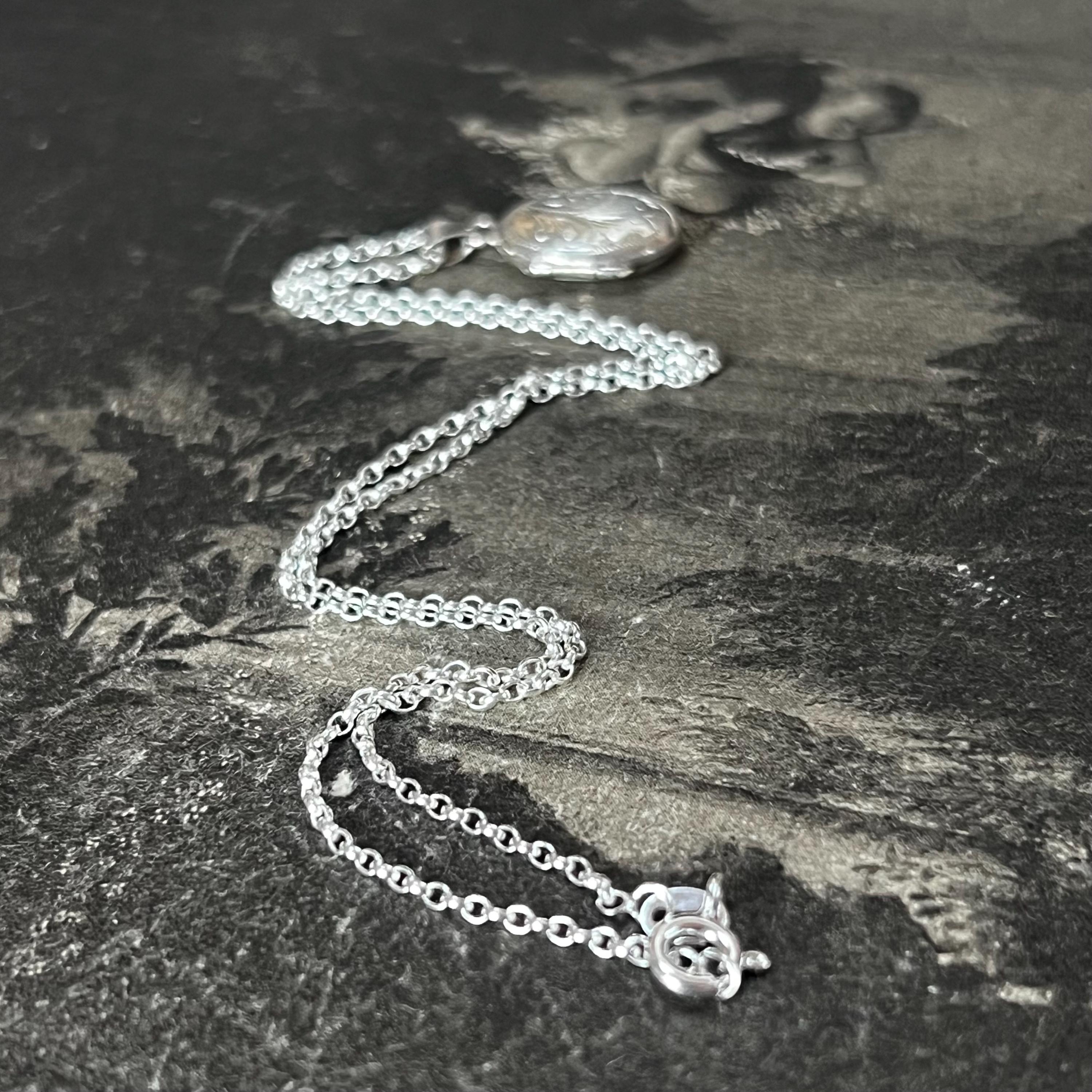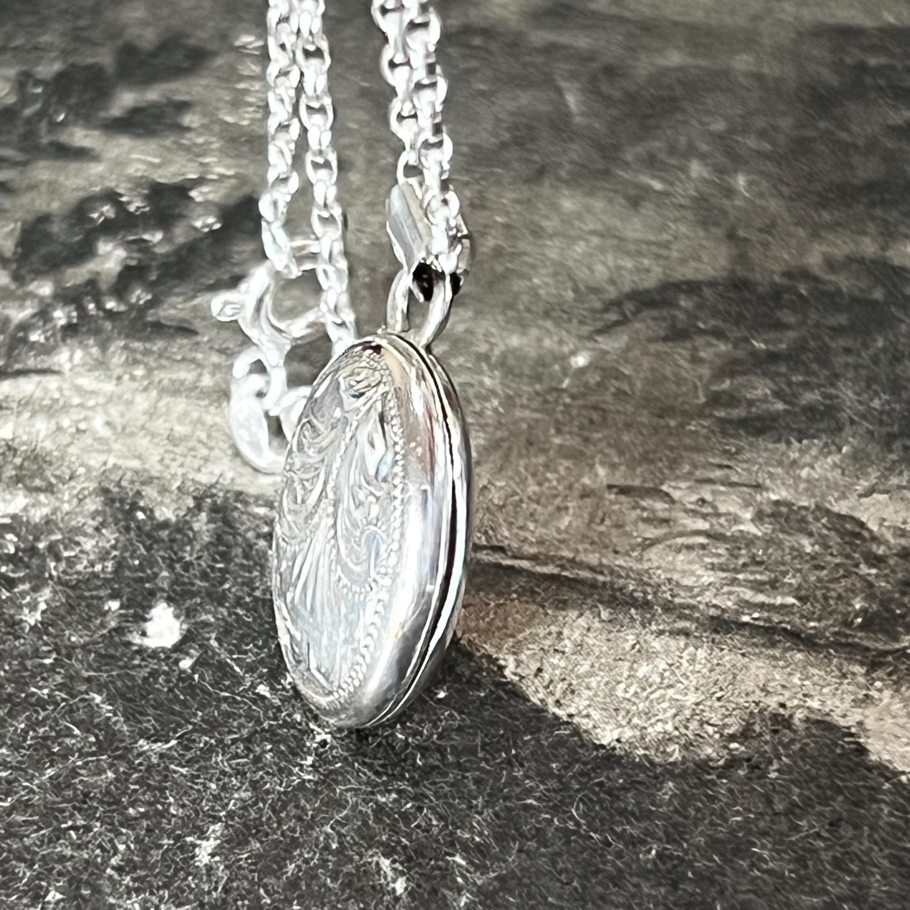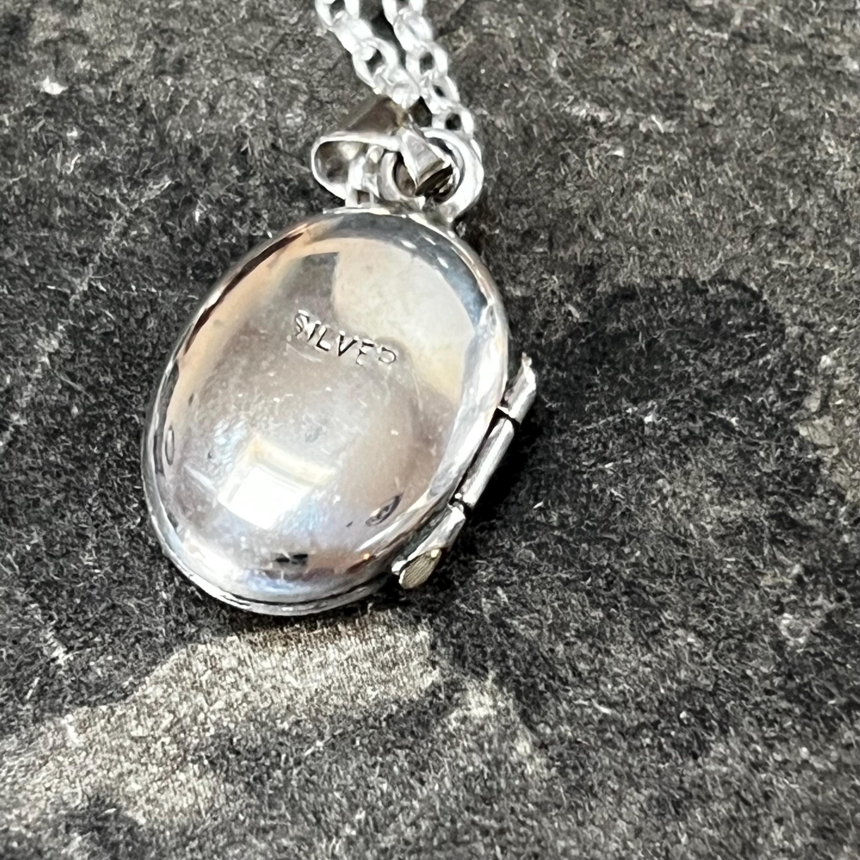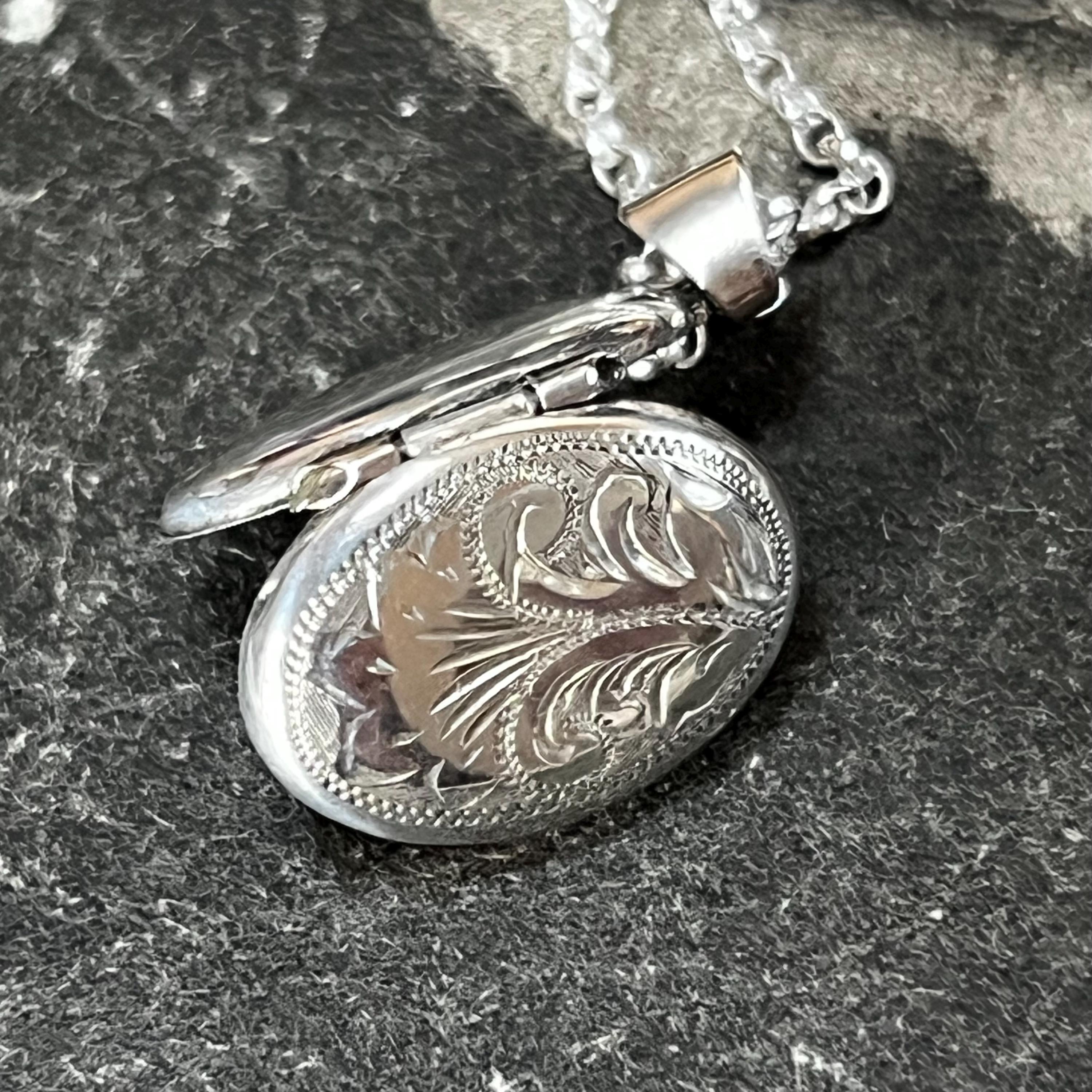 A charming vintage oval sterling silver locket necklace, perfect for holding a tiny photo or keepsake. The locket features delicate engraved detail to the front and is stamped “silver” on the reverse, confirming authenticity.