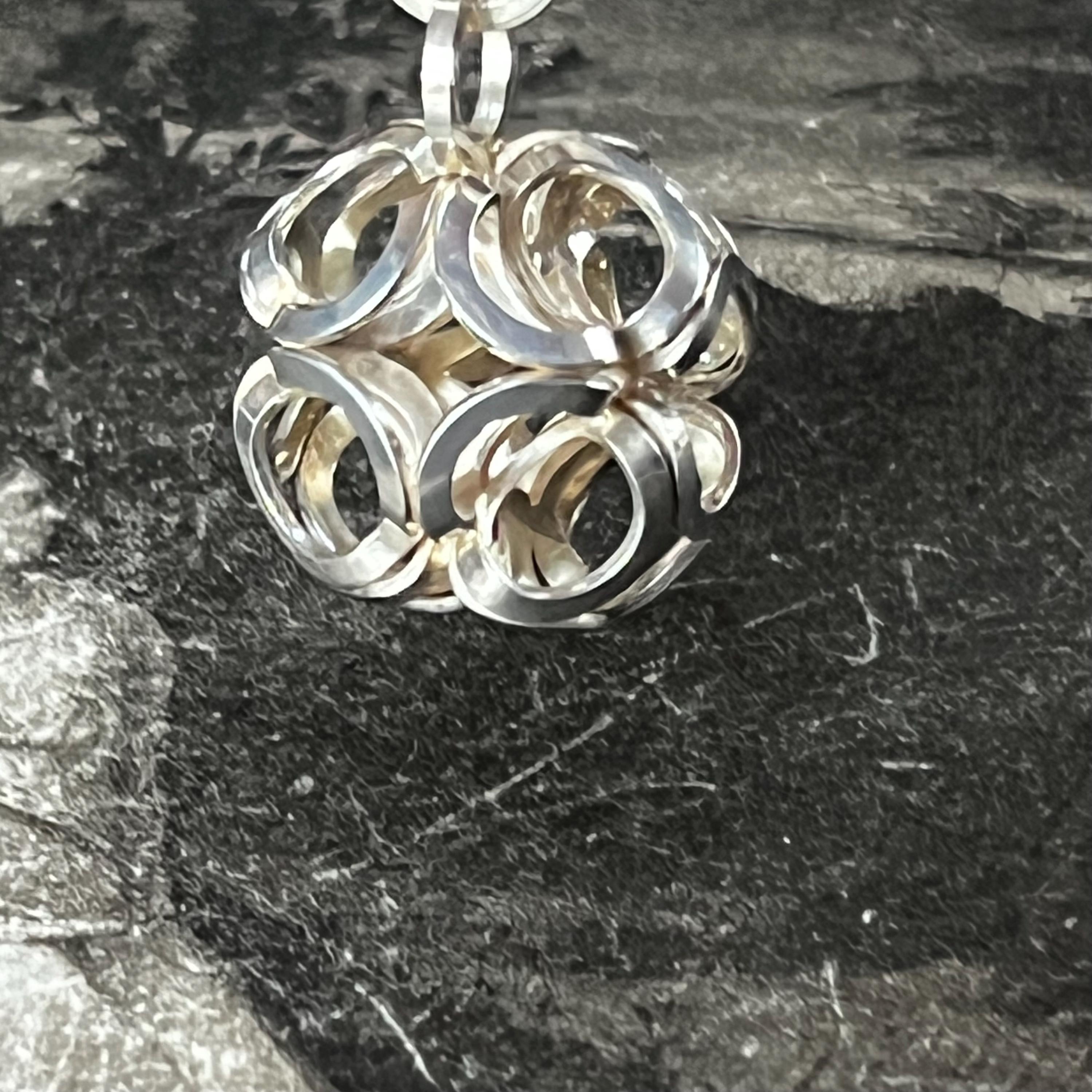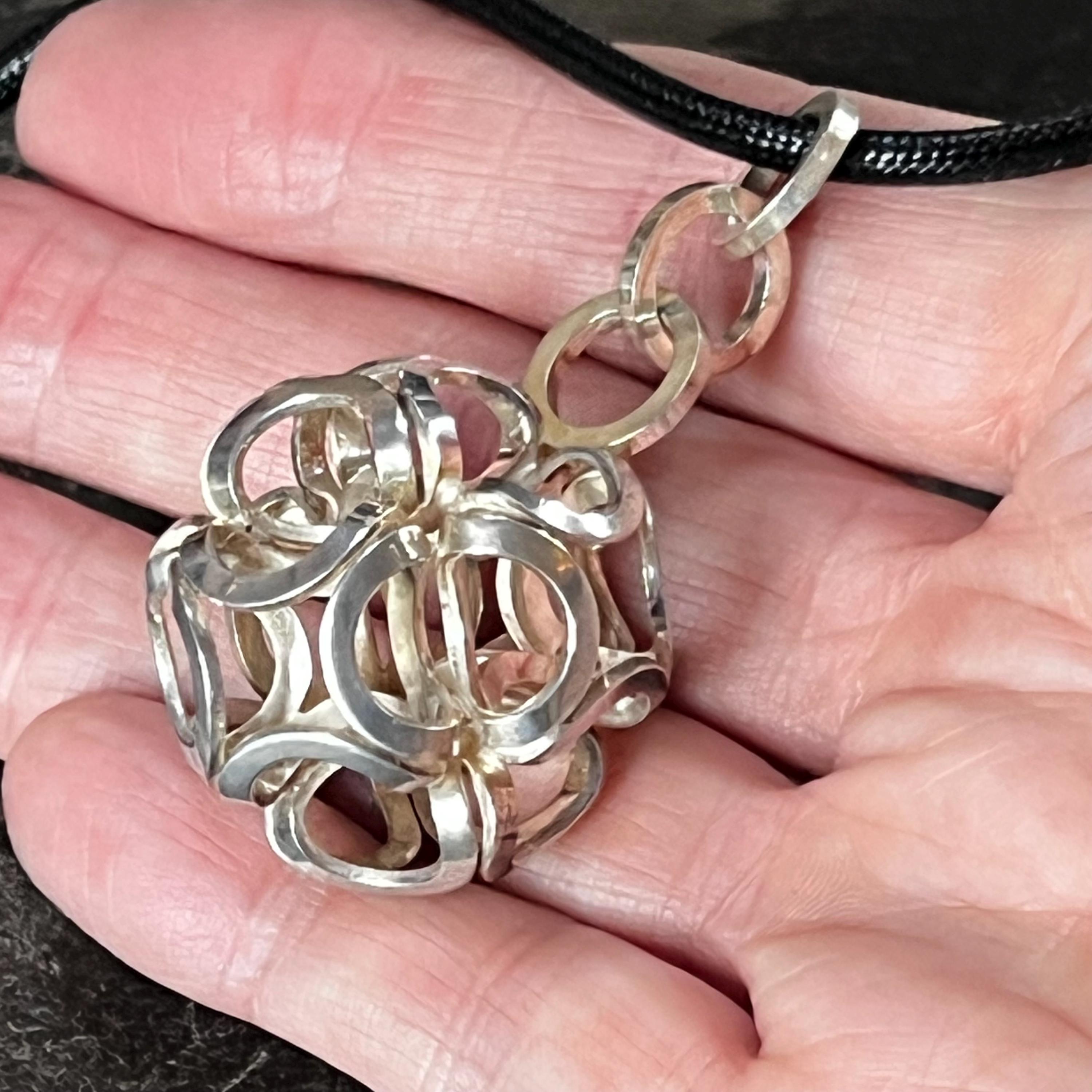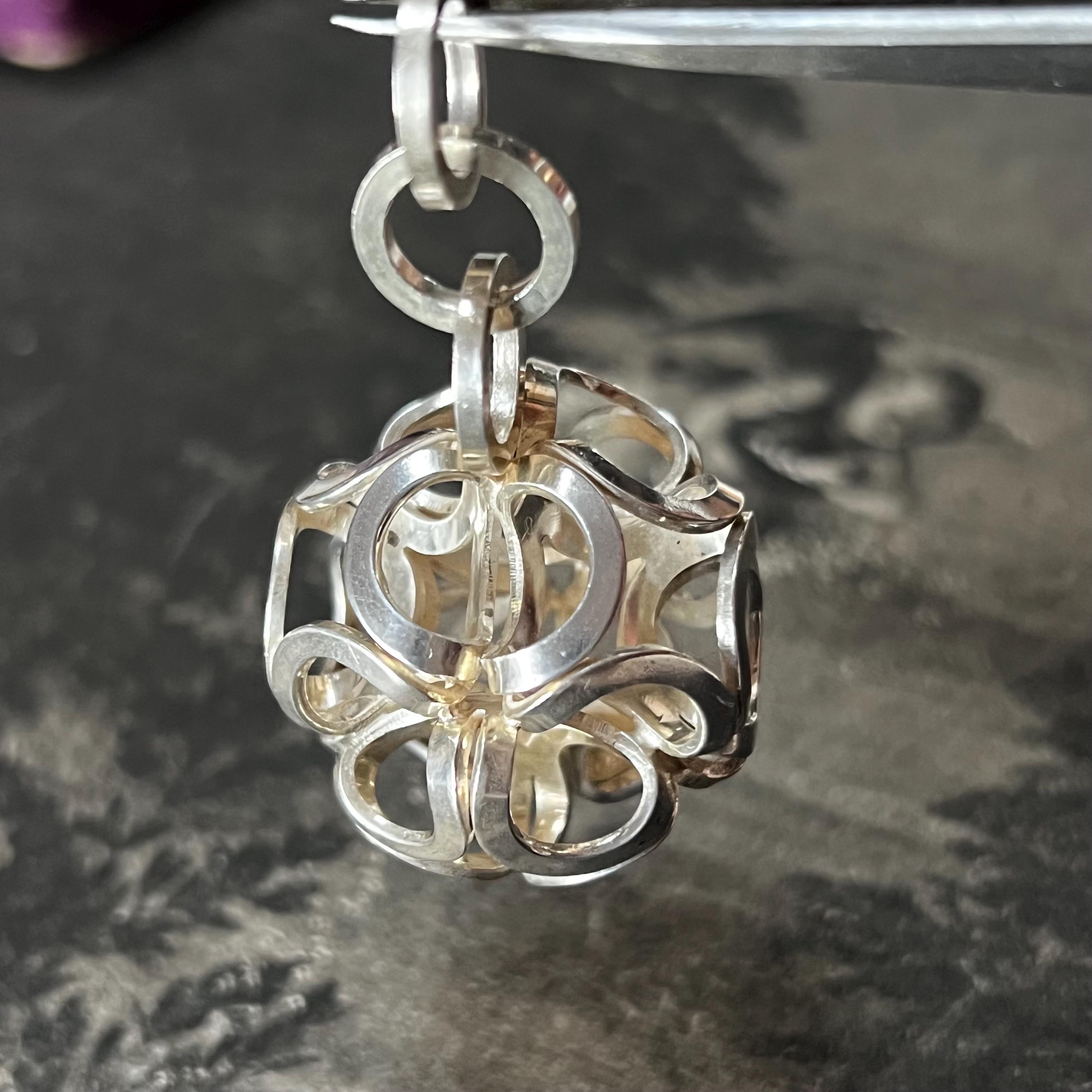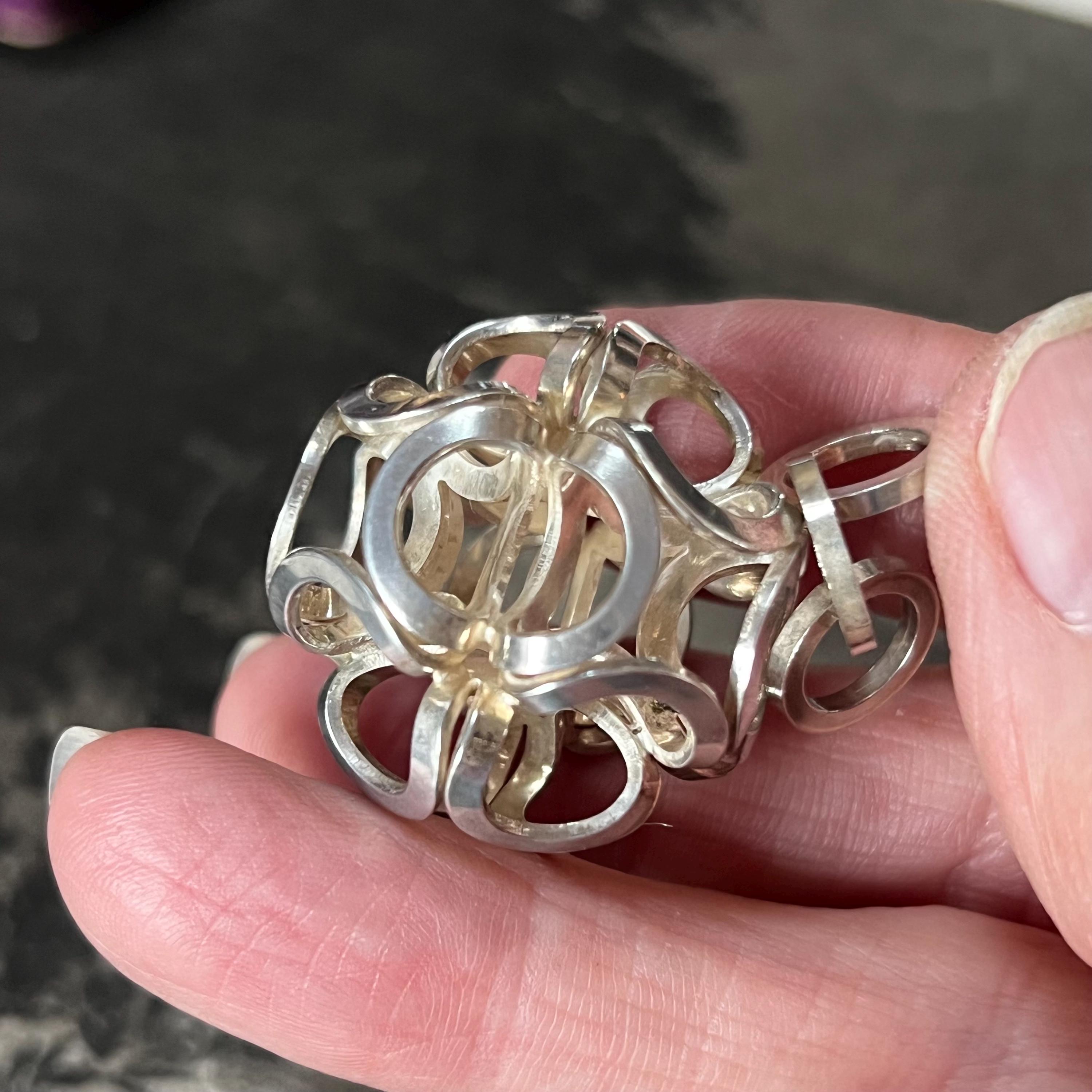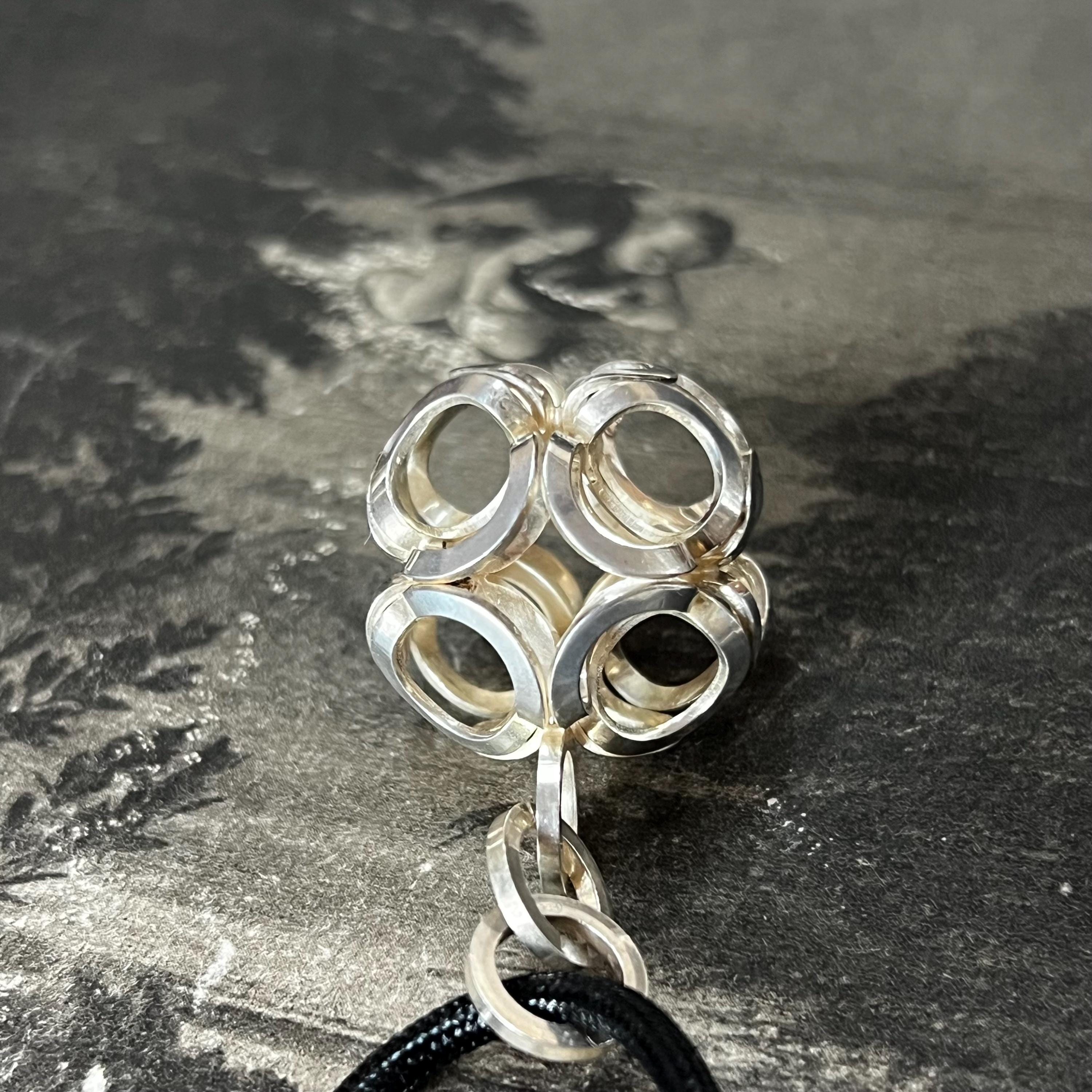 This sculptural globular sphere pendant is fully stamped with the anvil maker’s mark, NB (Nina Breddal), and 925S, confirming solid sterling silver authenticity. A bold, architectural design that is increasingly hard to find.