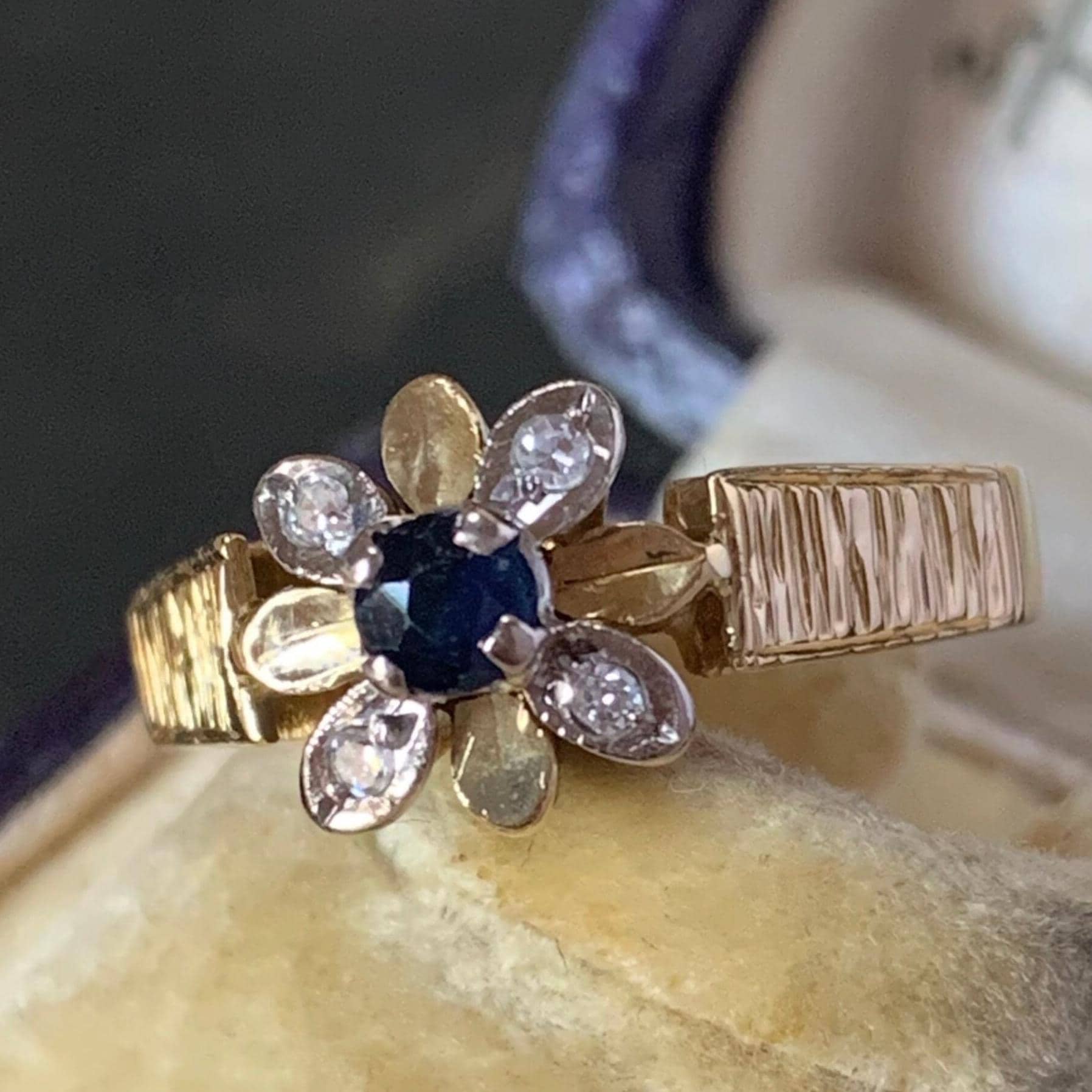 18-carat gold ring with a sapphire and diamond cluster design. Ring size N centre UK or a size 6 1/4 US has a classic vintage look from the 1970s. It's perfect for engagements or special occasions. The ring is designed like a daisy flower, with a beautiful sapphire in the center symbolizing loyalty and wisdom. There are four small diamonds on the petals that add a subtle sparkle. UK hallmarks from Sheffield, including "750" which means it's 18-carat gold, and it's from 1975, giving it a real vintage feel. It weighs 3.3grams and feels substantial on your finger. The ring has detailed gold work on the sides, which was popular in that era.
