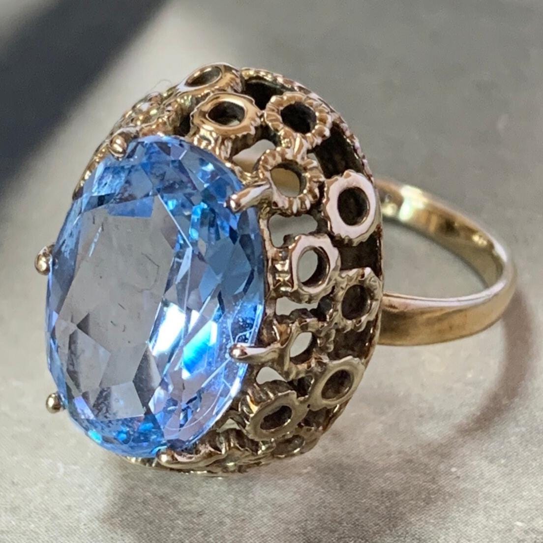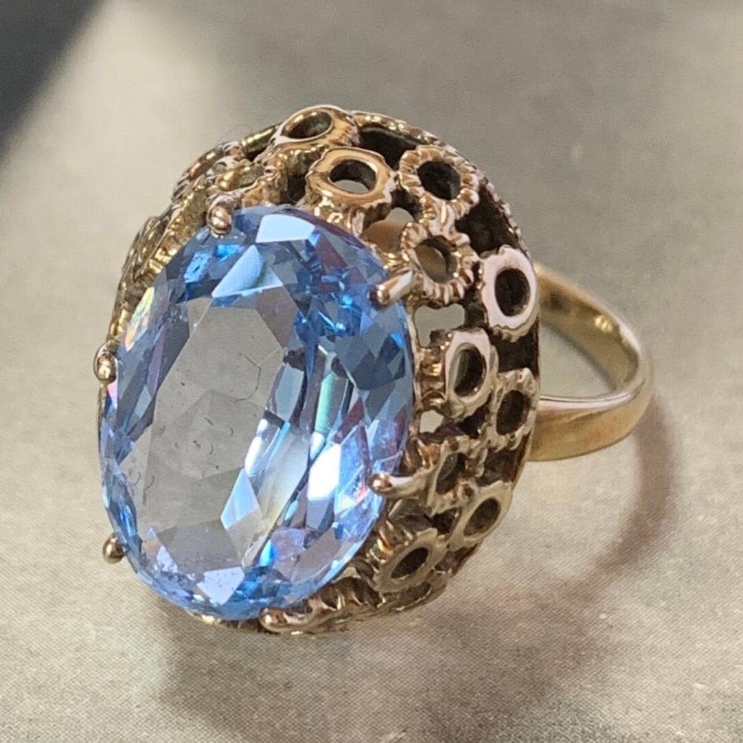 The combination of the rare blue spinel gemstone, the rich yellow gold, and the vintage-inspired design creates a captivating cocktail solitaire ring with a touch of nostalgia and timeless elegance. This unique piece of jewelry is sure to draw attention and become a treasured addition to any collection.