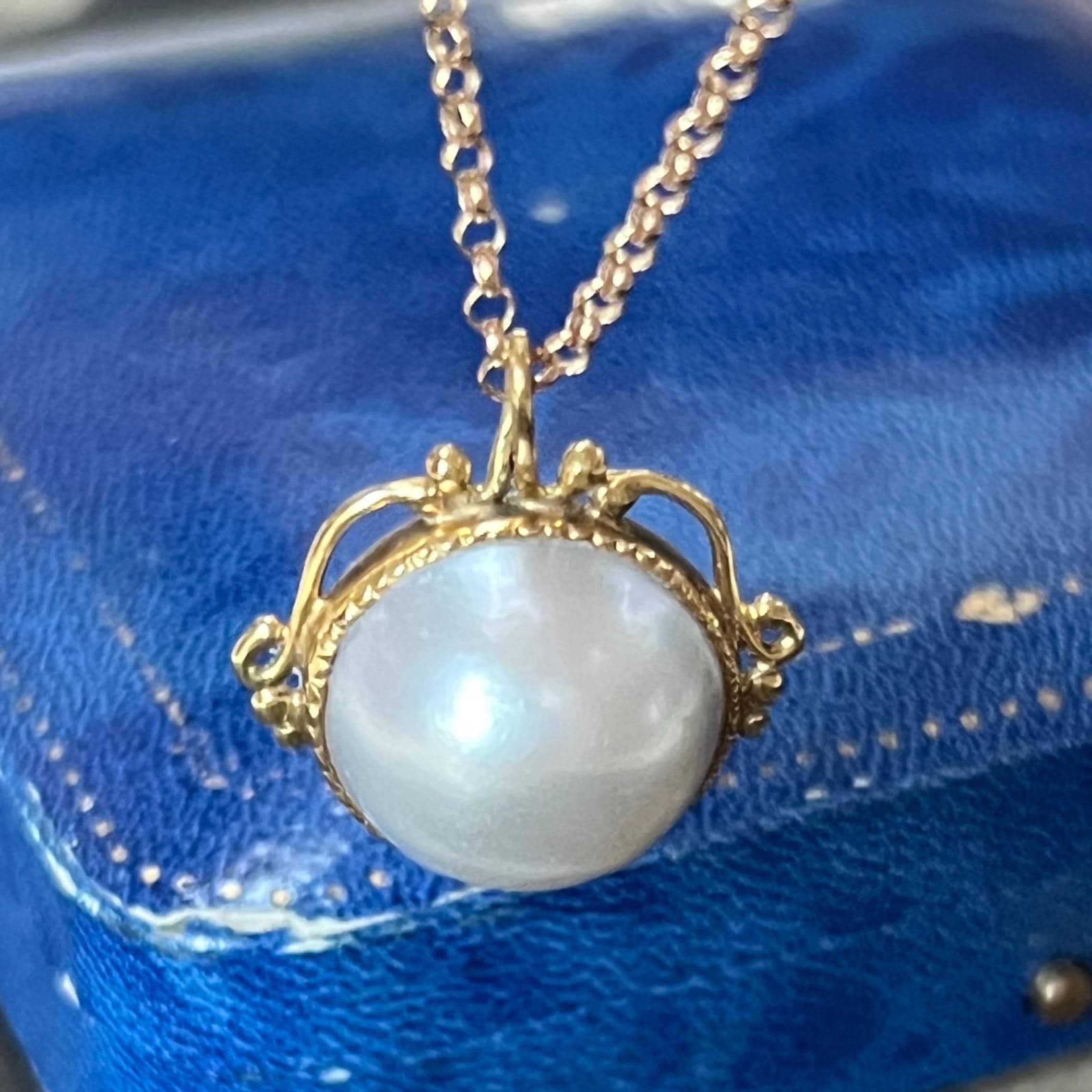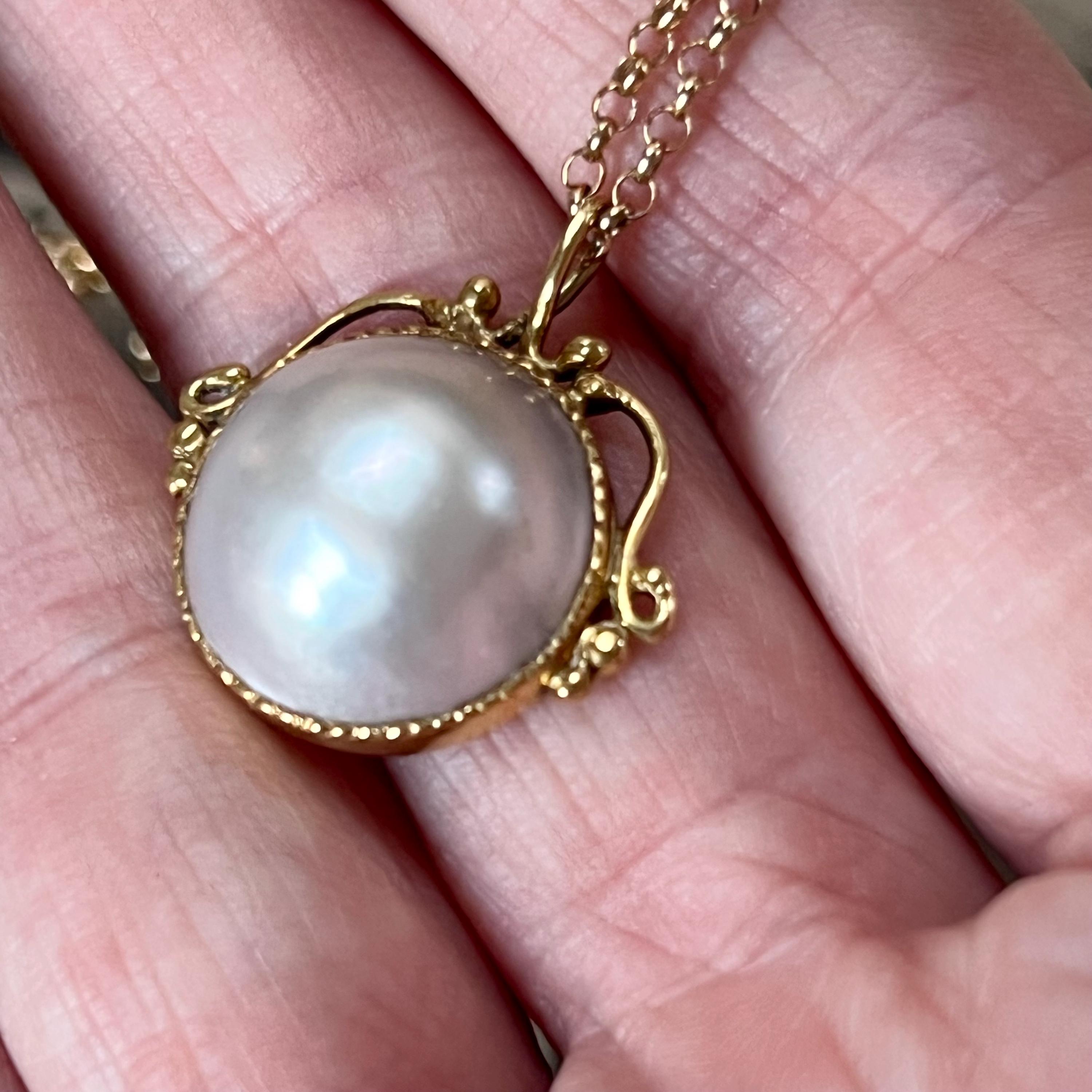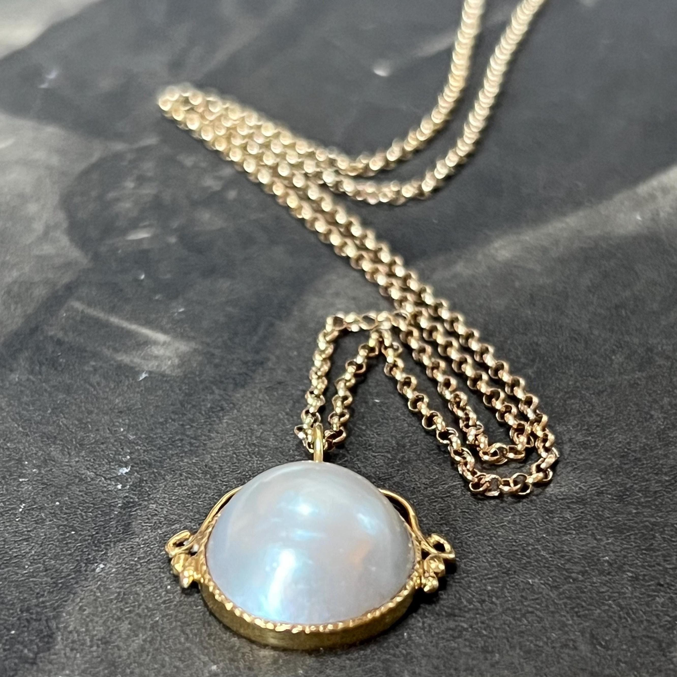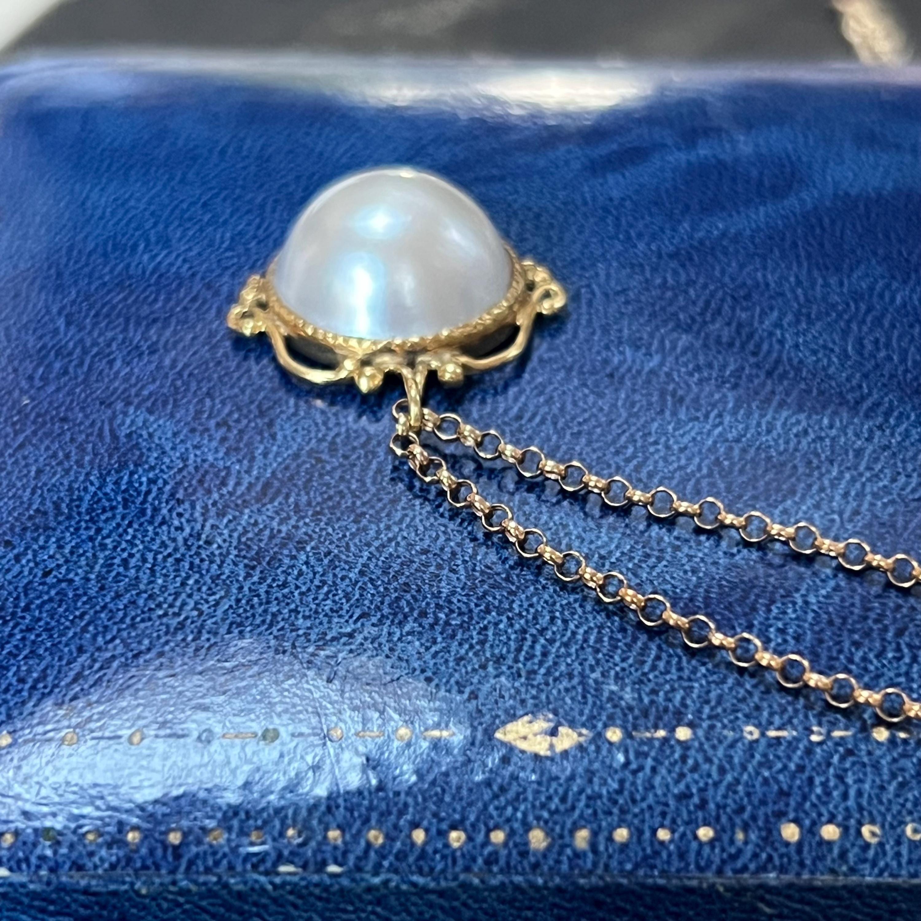 A timeless and elegant vintage 18ct gold Mabe pearl pendant, hallmarked in London and dating to 1982, beautifully paired with a 9ct gold belcher chain for a classic, ready-to-wear piece. The pendant features a large, luminous Mabe pearl measuring an impressive 17mm in diameter with a depth of 9mm, bezel set in rich 18ct yellow gold. The open, scrolled top mount adds a delicate decorative touch while allowing light to enhance the pearl’s natural glow.