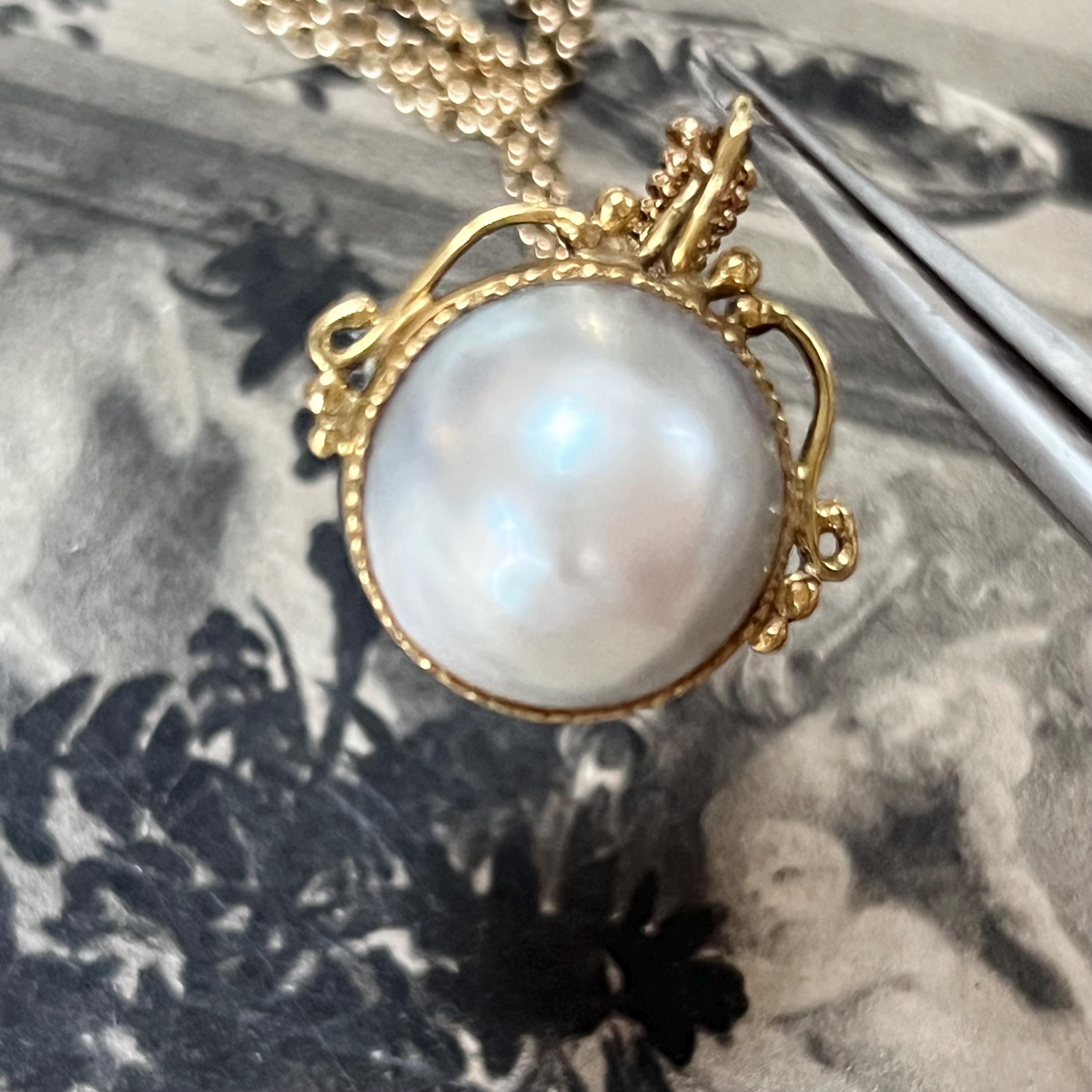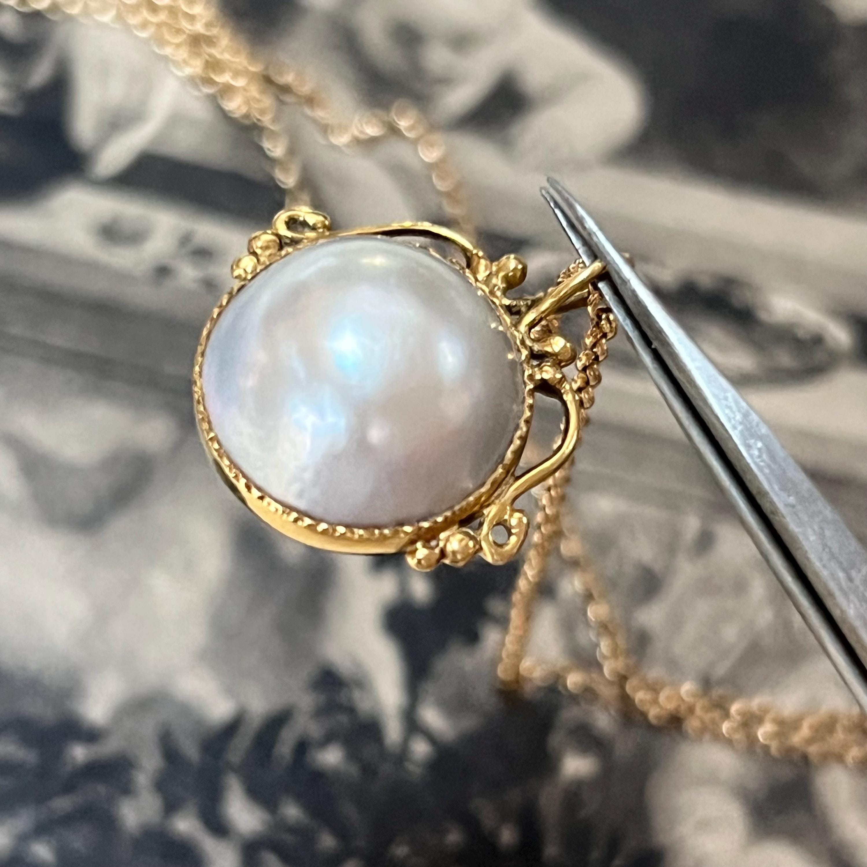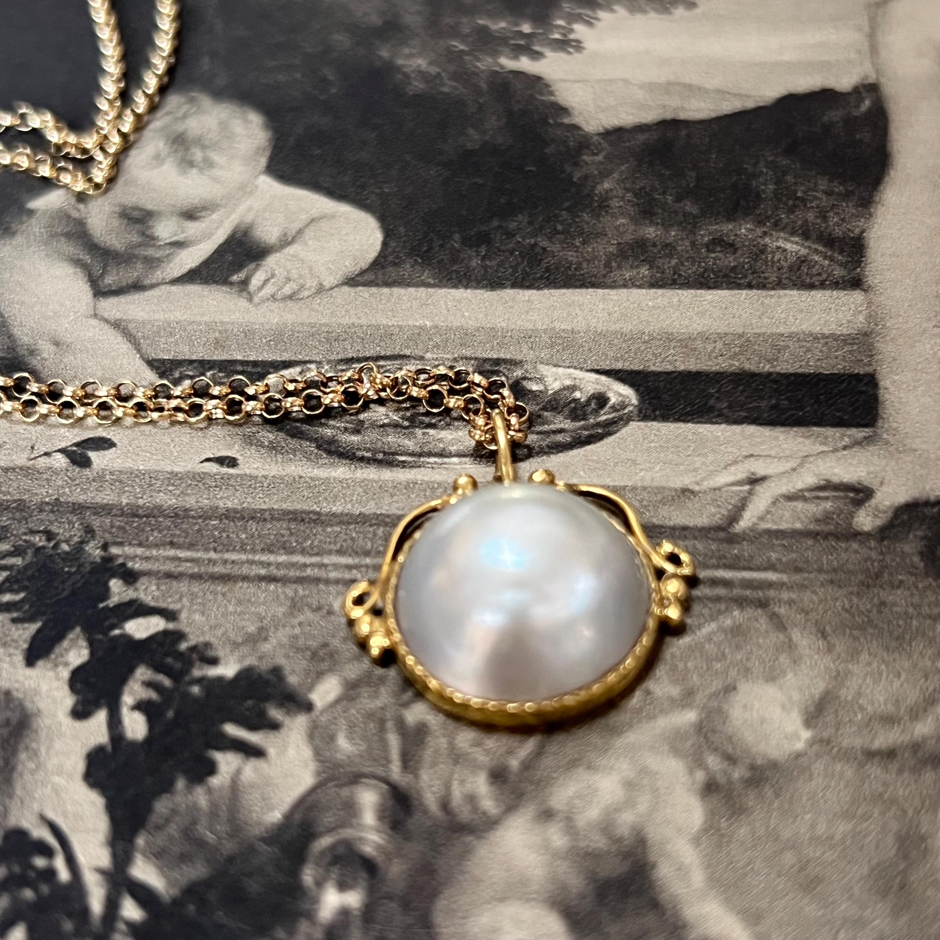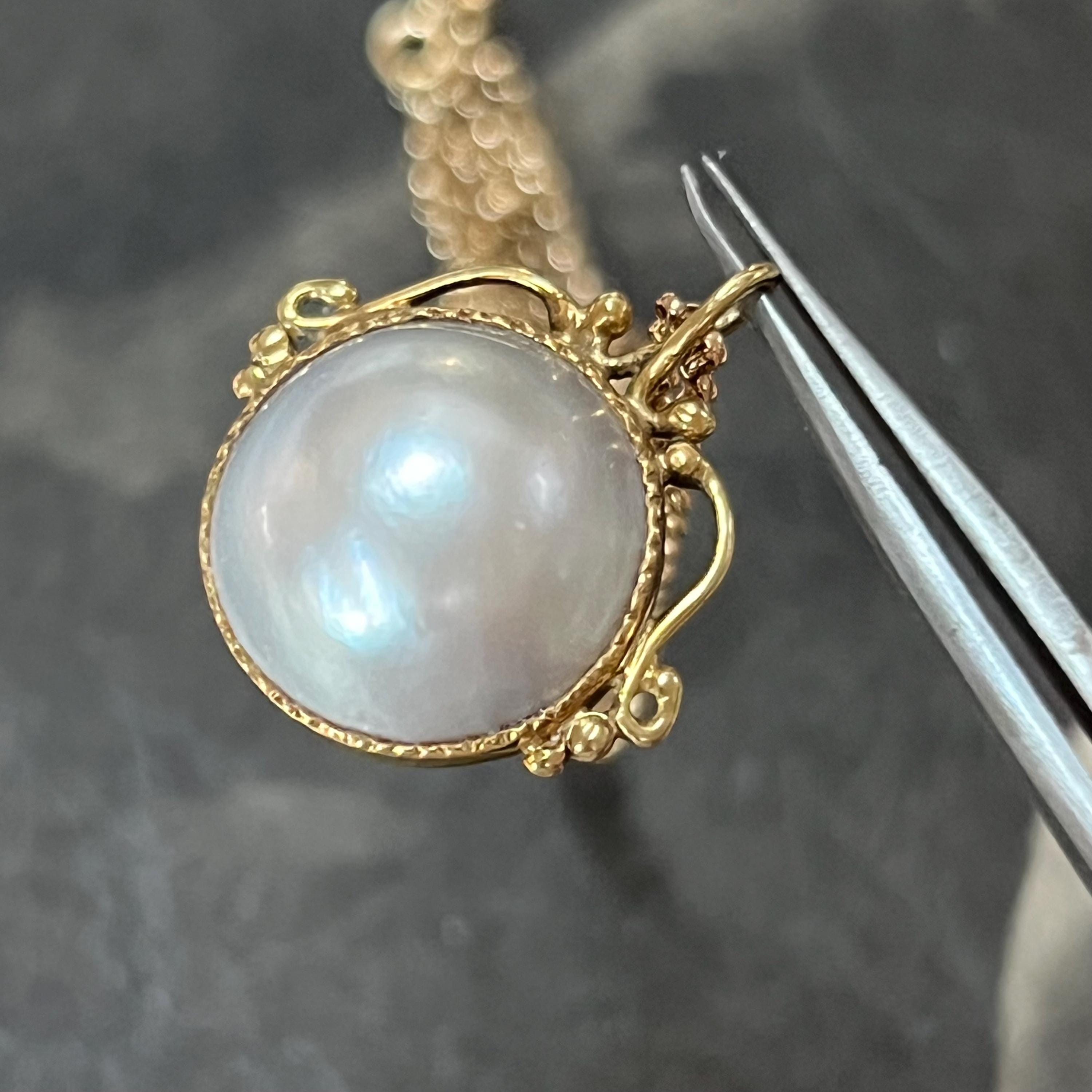 A timeless and elegant vintage 18ct gold Mabe pearl pendant, hallmarked in London and dating to 1982, beautifully paired with a 9ct gold belcher chain for a classic, ready-to-wear piece. The pendant features a large, luminous Mabe pearl measuring an impressive 17mm in diameter with a depth of 9mm, bezel set in rich 18ct yellow gold. The open, scrolled top mount adds a delicate decorative touch while allowing light to enhance the pearl’s natural glow.