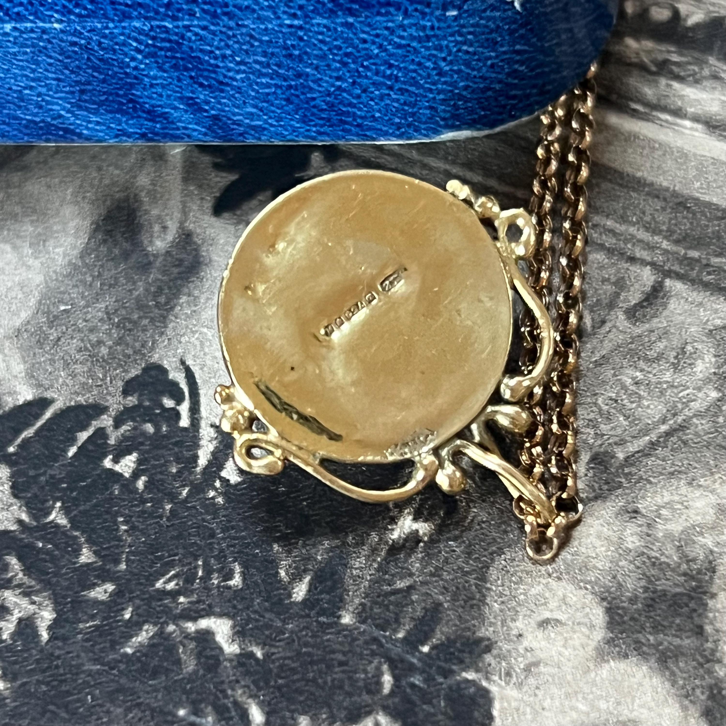The pendant is suspended from a 9ct gold belcher chain, measuring 18 inches in length and stamped 375, offering both durability and everyday wearability.