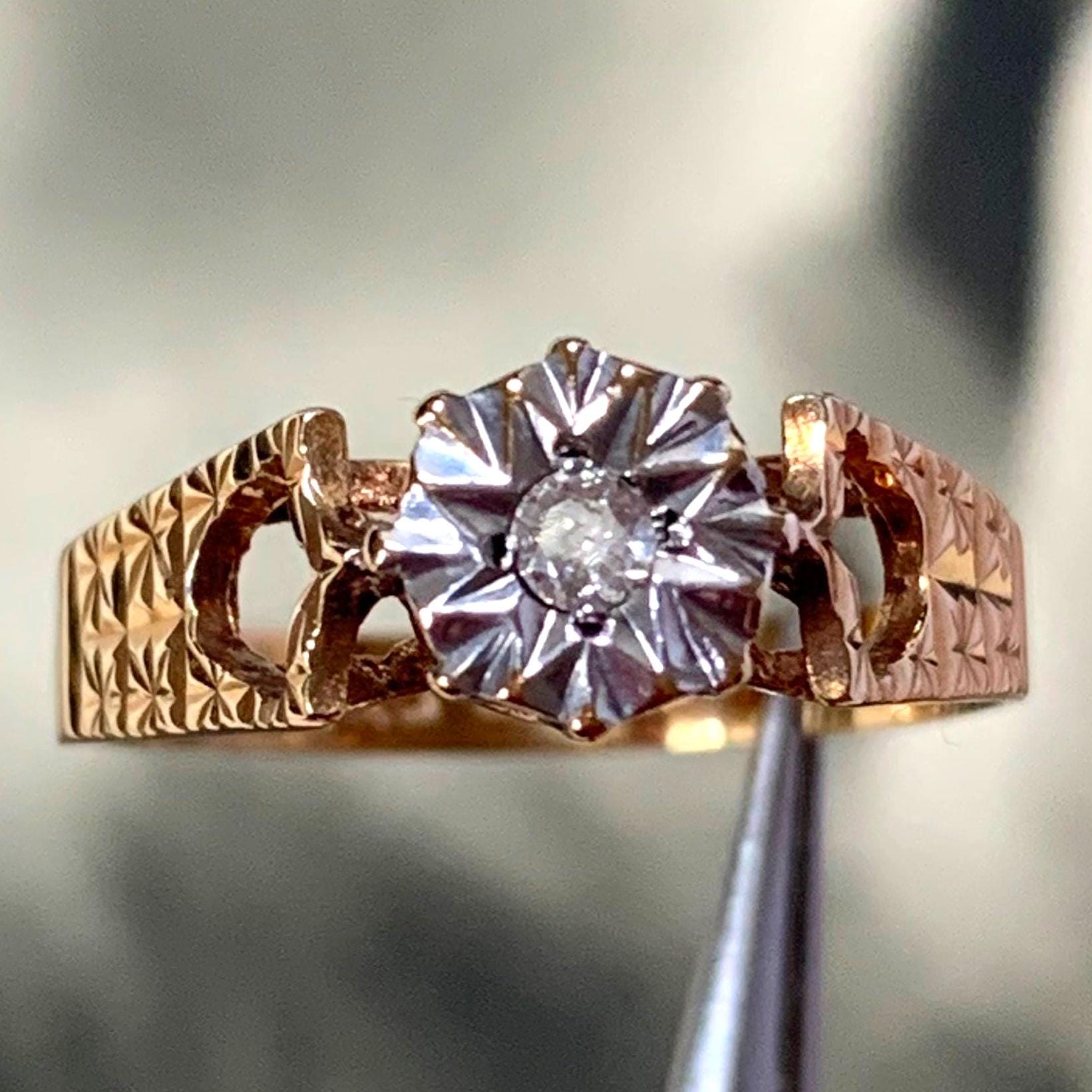 This vintage 9ct gold ring from the 1970s is a true gem, both in terms of its design and historical significance. Crafted with care and precision, this ring boasts an elegant star illusion setting that showcases a small, brilliant-cut diamond. It's a testament to the craftsmanship of its time.