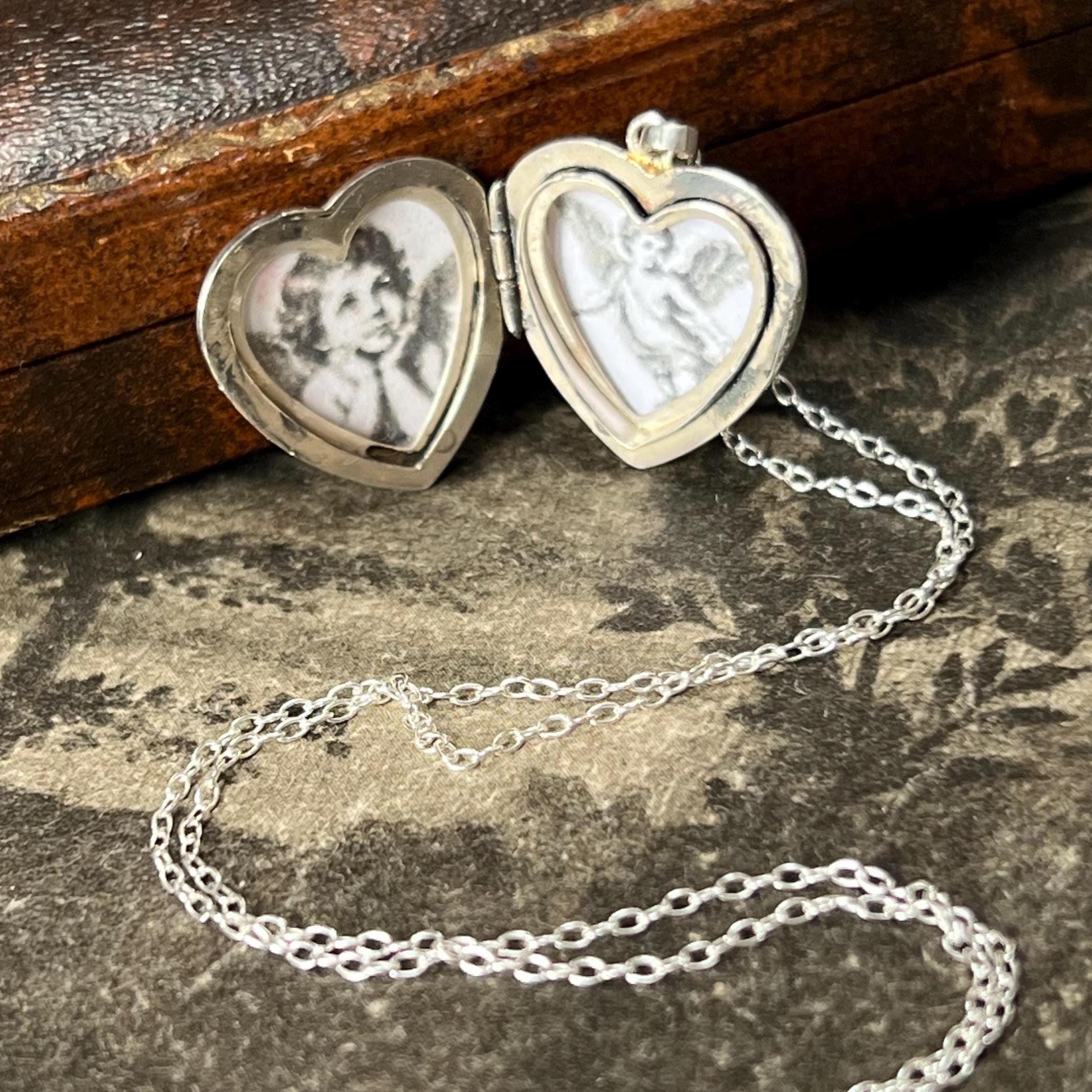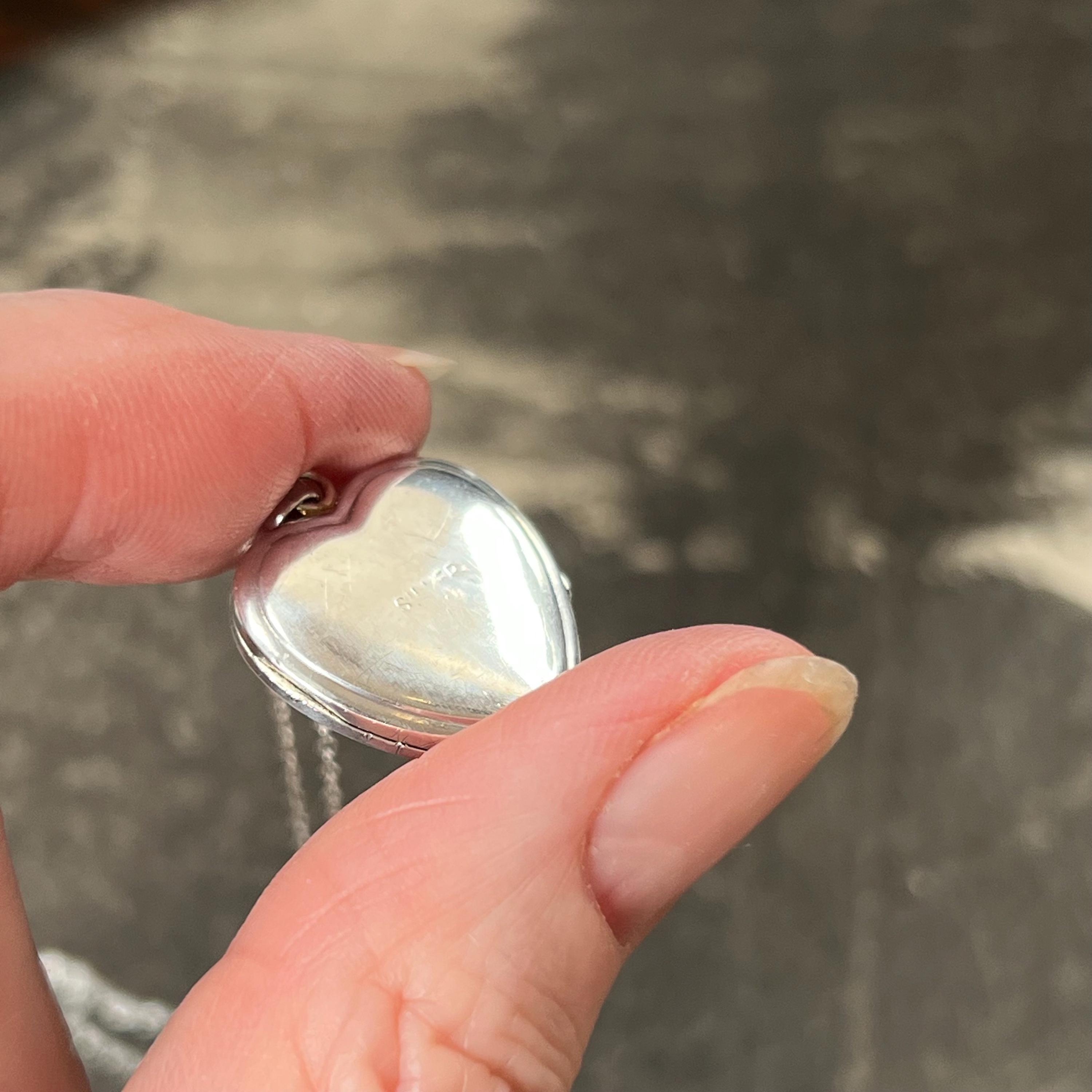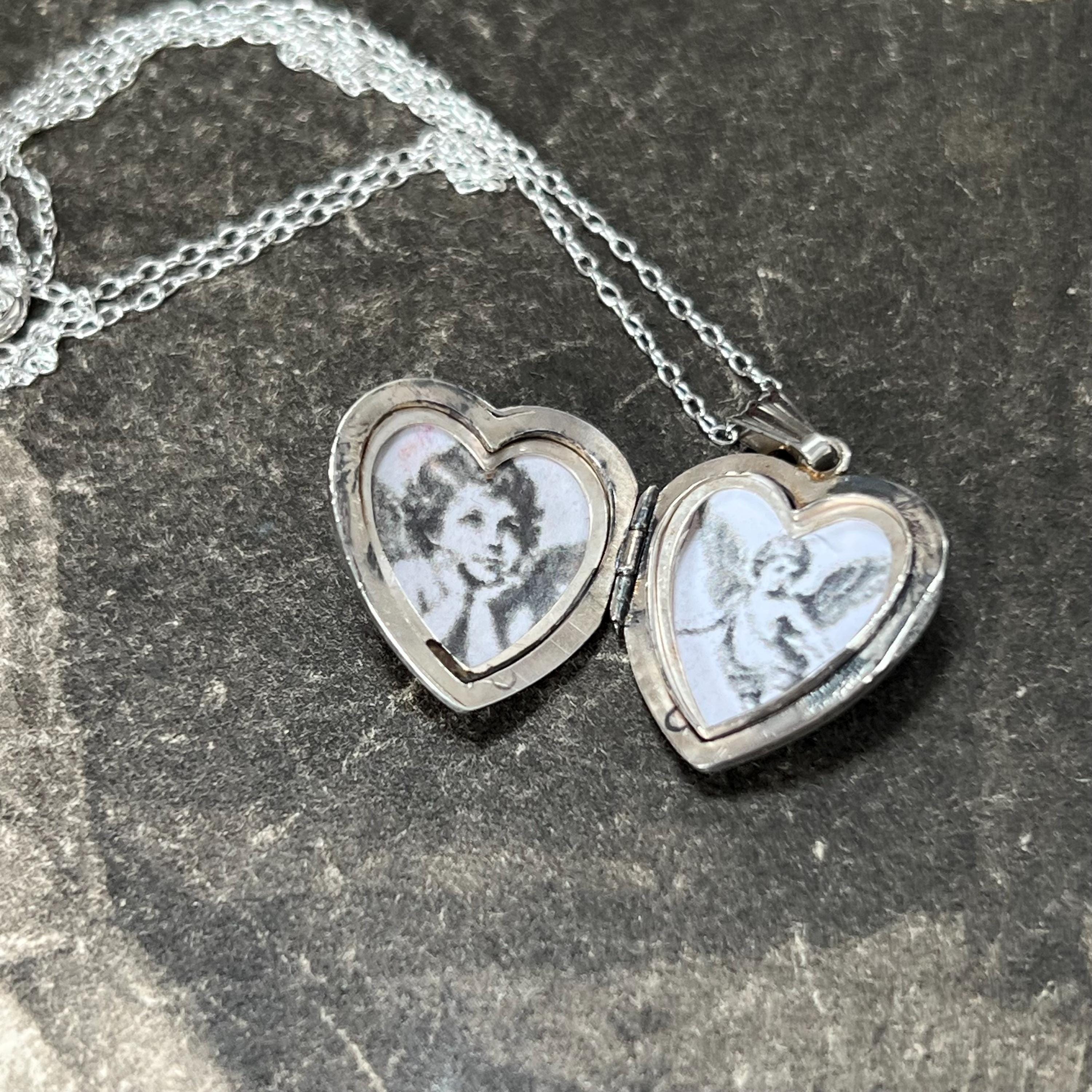 Stamped “silver” to the back, this charming piece opens to hold small photo keepsakes or precious pictorial memories — perfect for carrying something meaningful close to your heart.