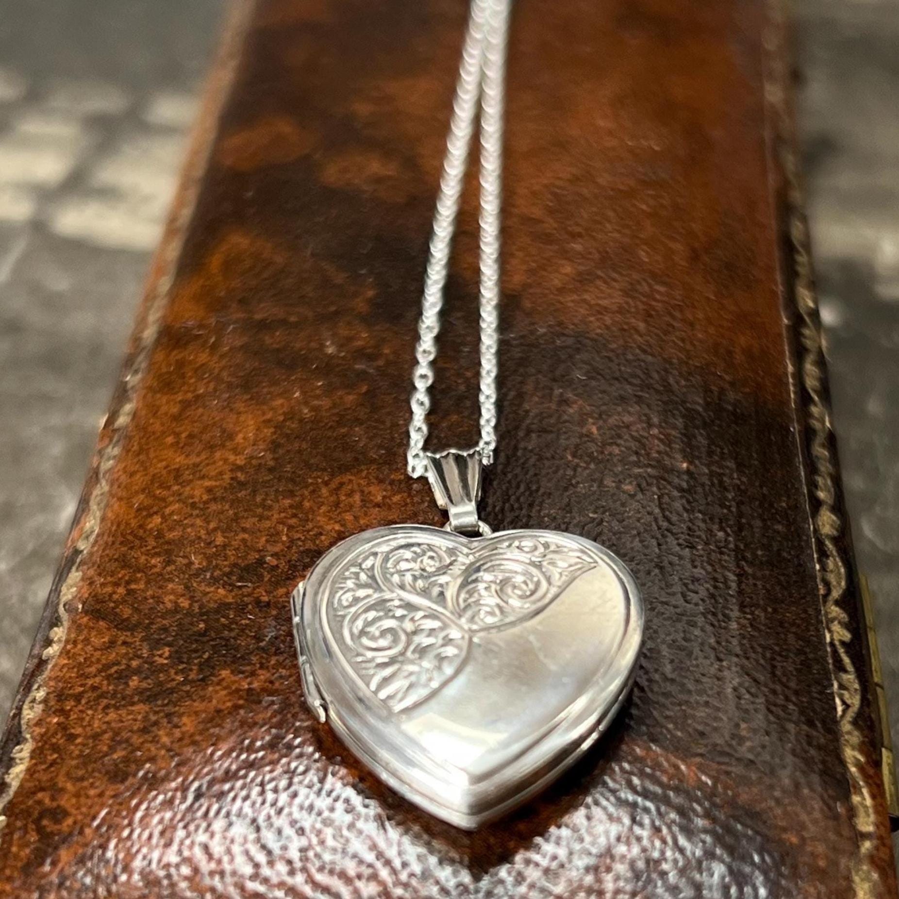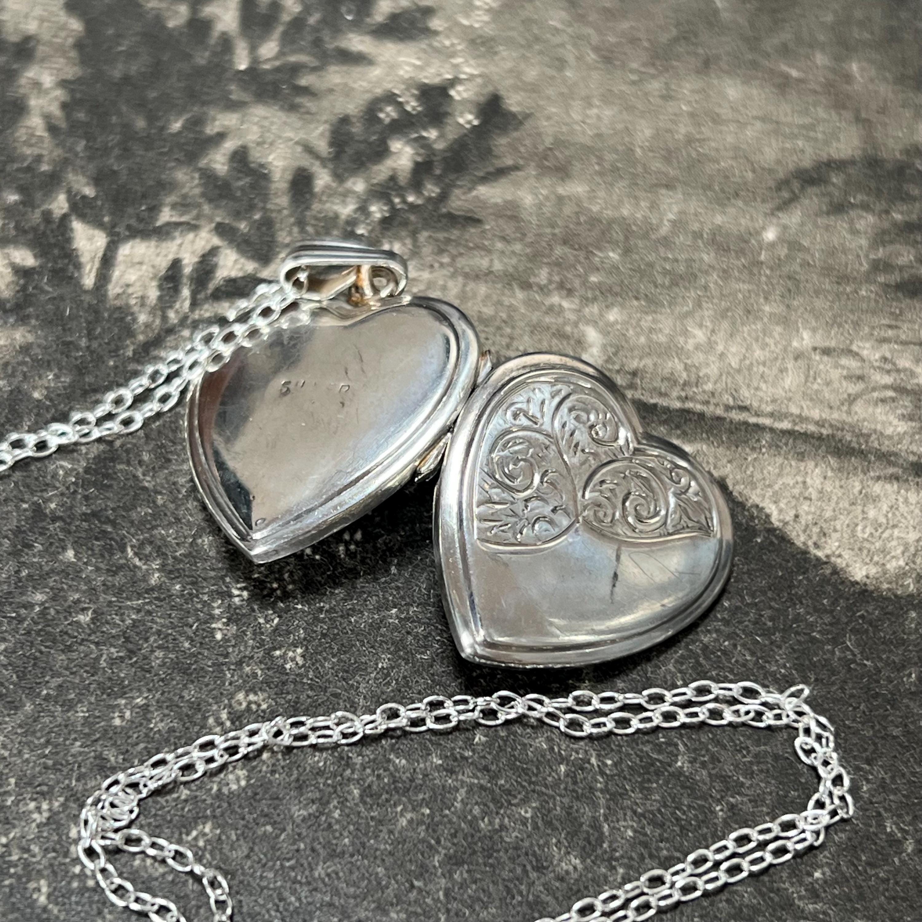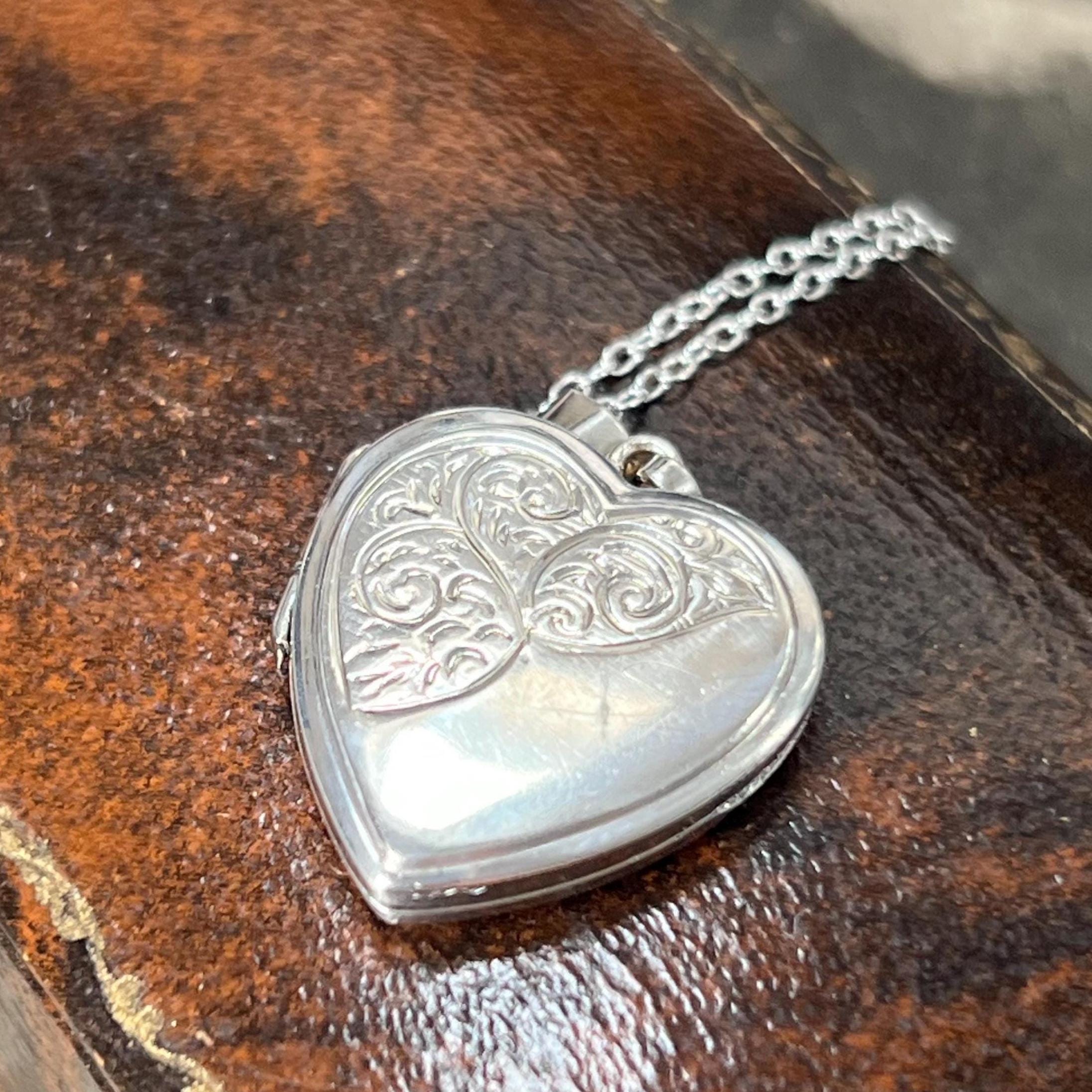A timeless and romantic vintage silver heart locket, featuring delicate engraved detail across half of the front for that classic, softly decorative look.