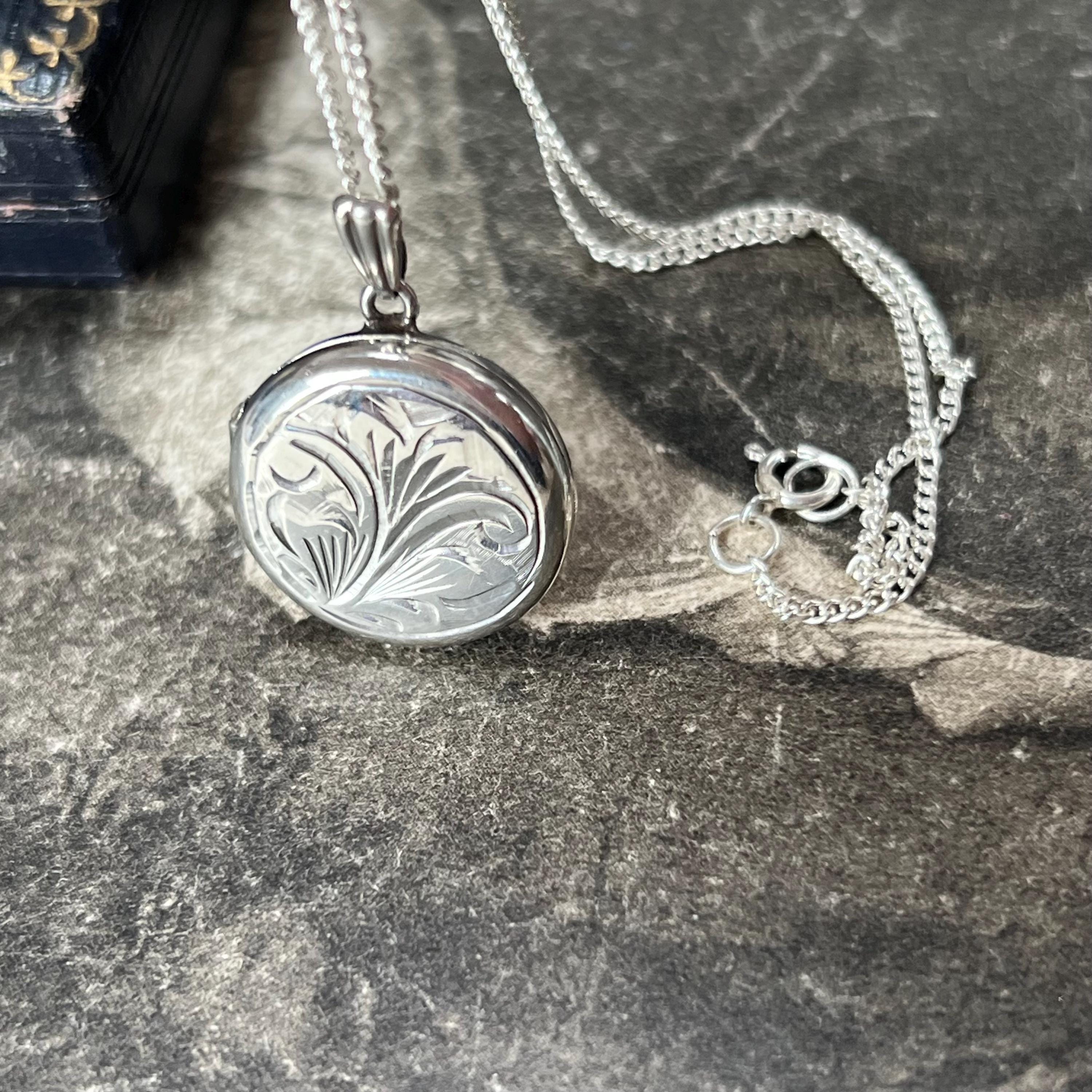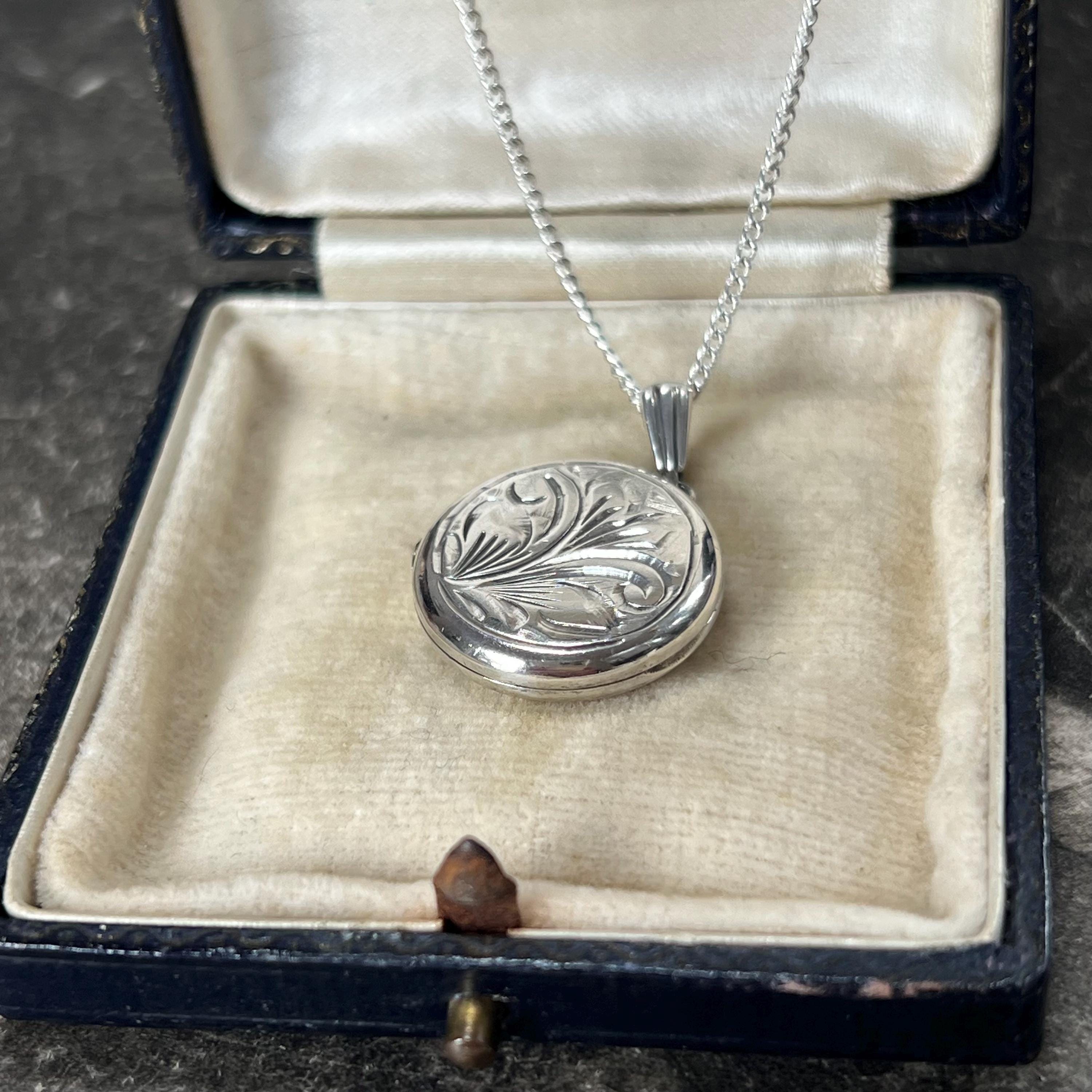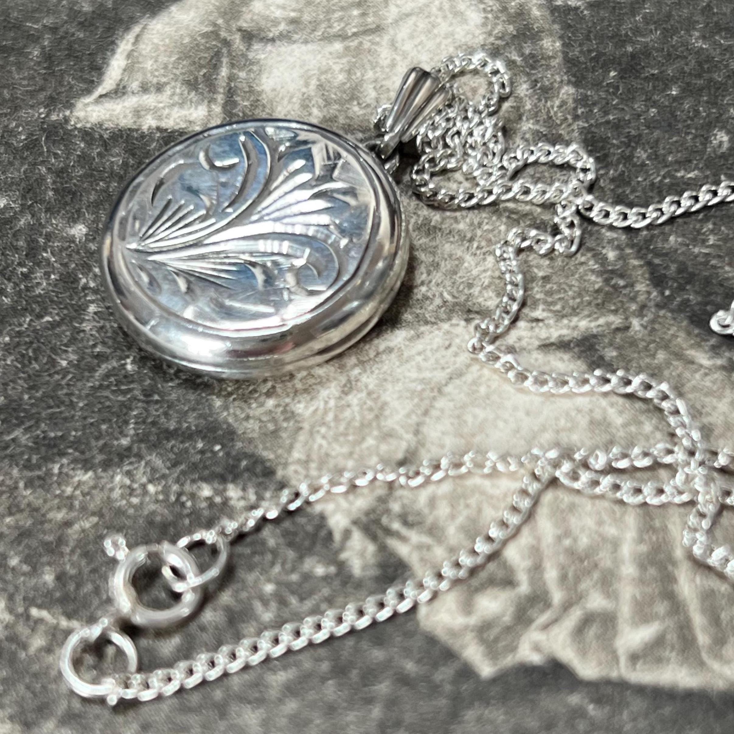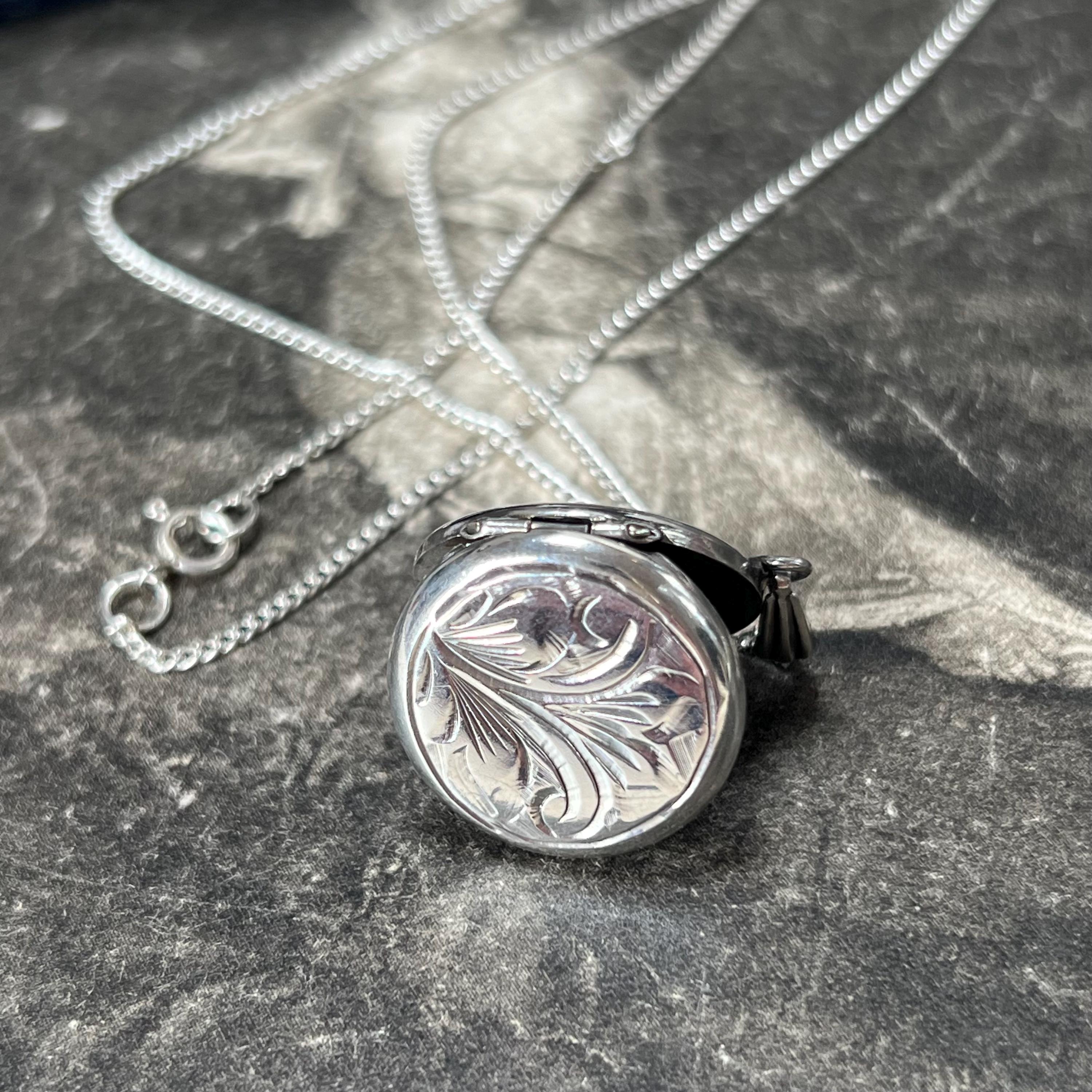 A timeless vintage sterling silver circular locket necklace, featuring delicate engraved detailing and a classic round silhouette.