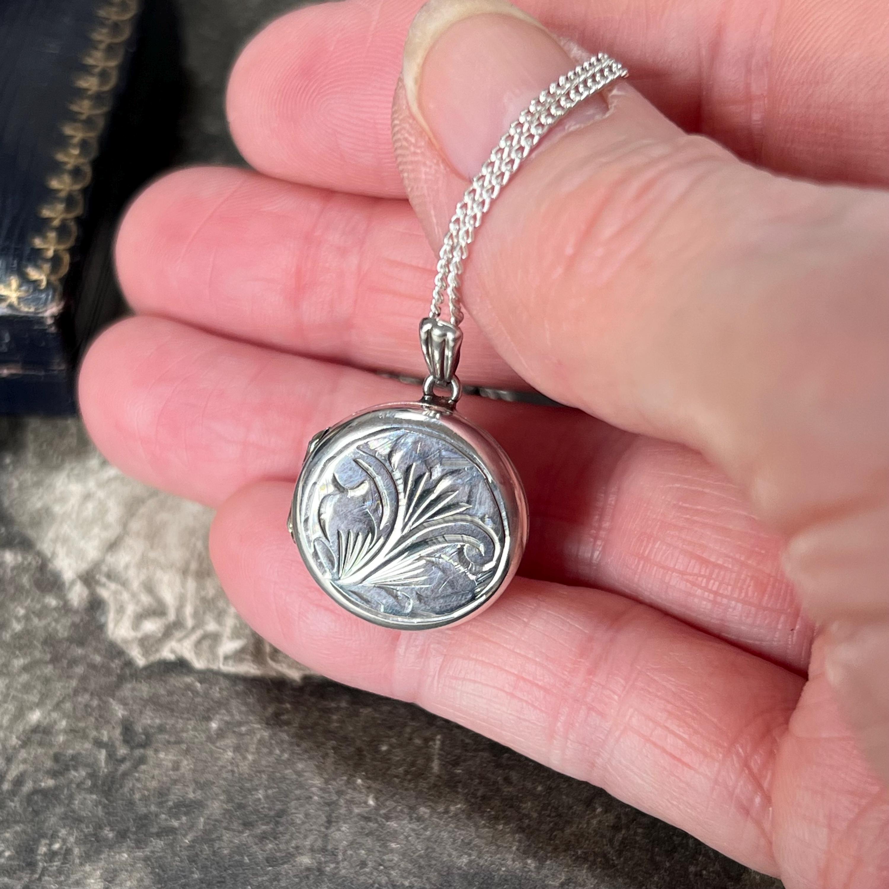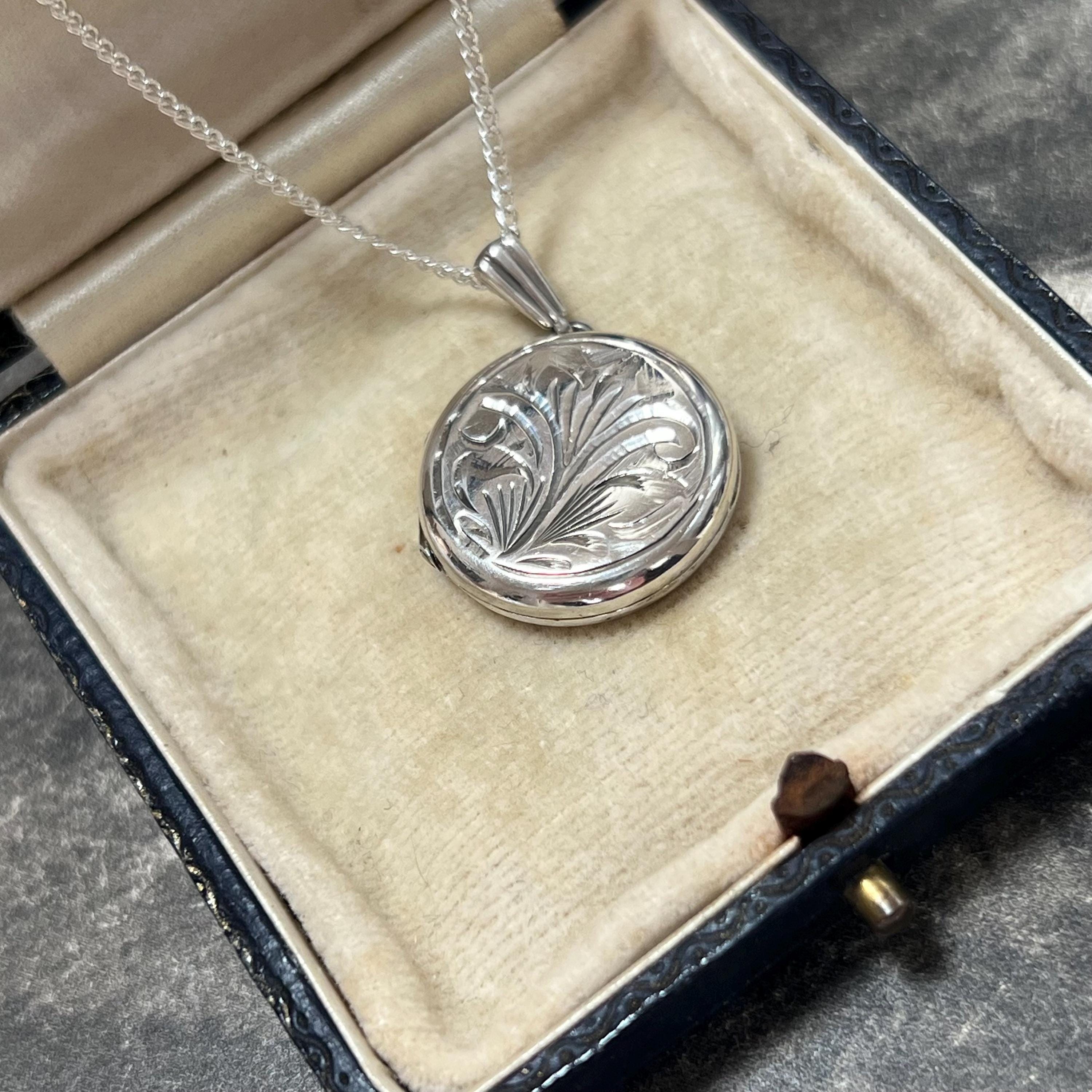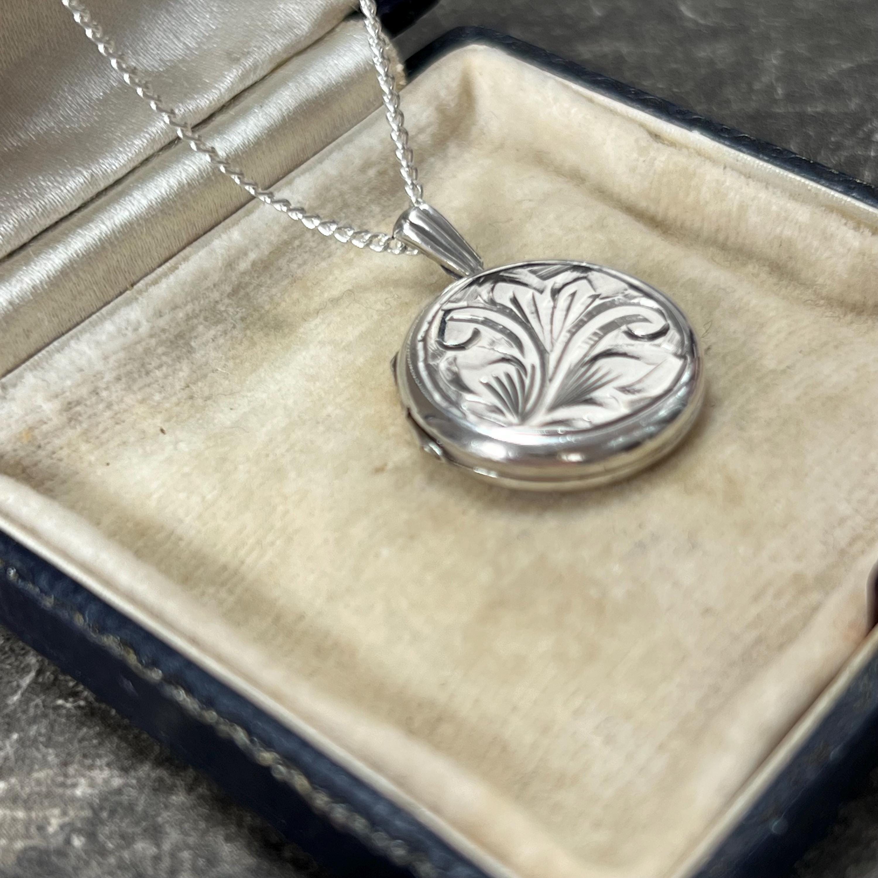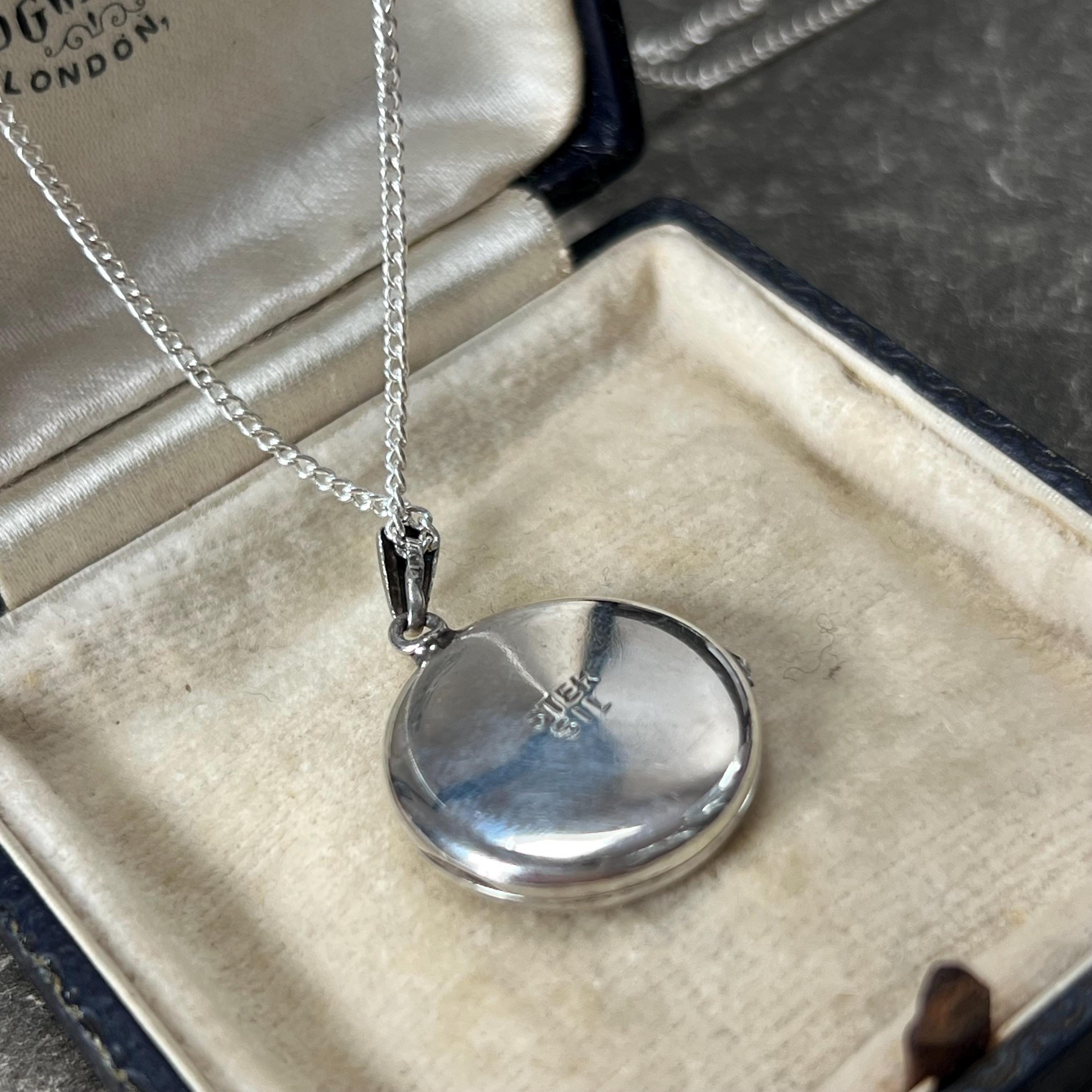 A timeless vintage sterling silver circular locket necklace, featuring delicate engraved detailing and a classic round silhouette.