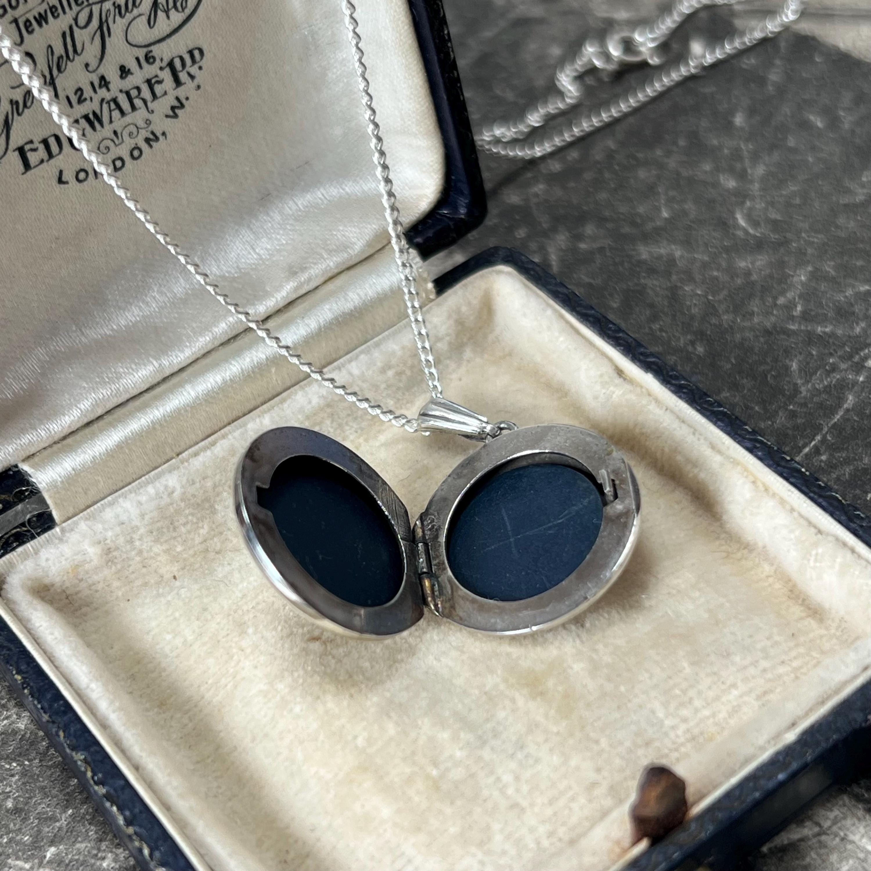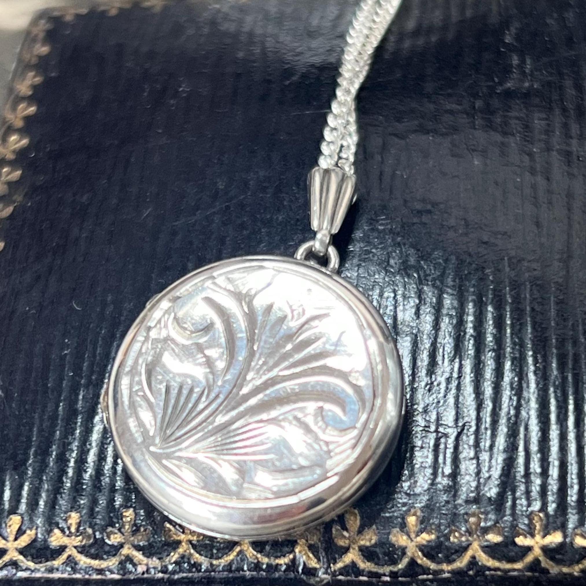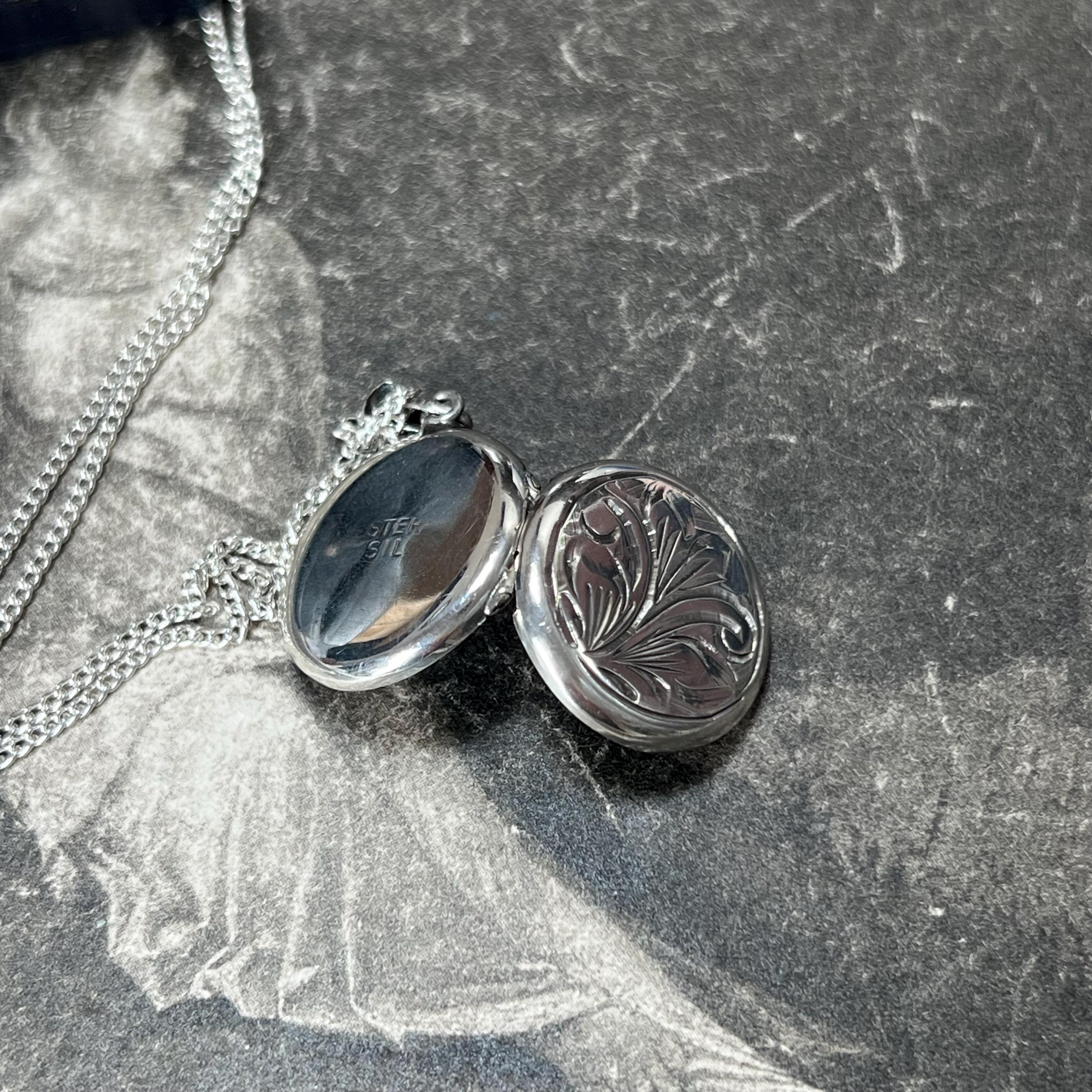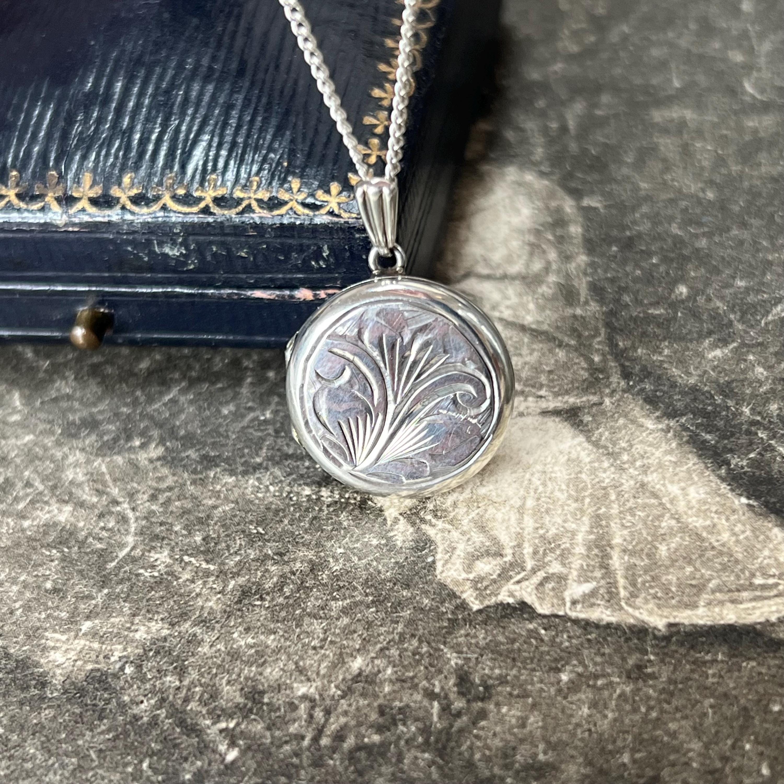 A timeless vintage sterling silver circular locket necklace, featuring delicate engraved detailing and a classic round silhouette.