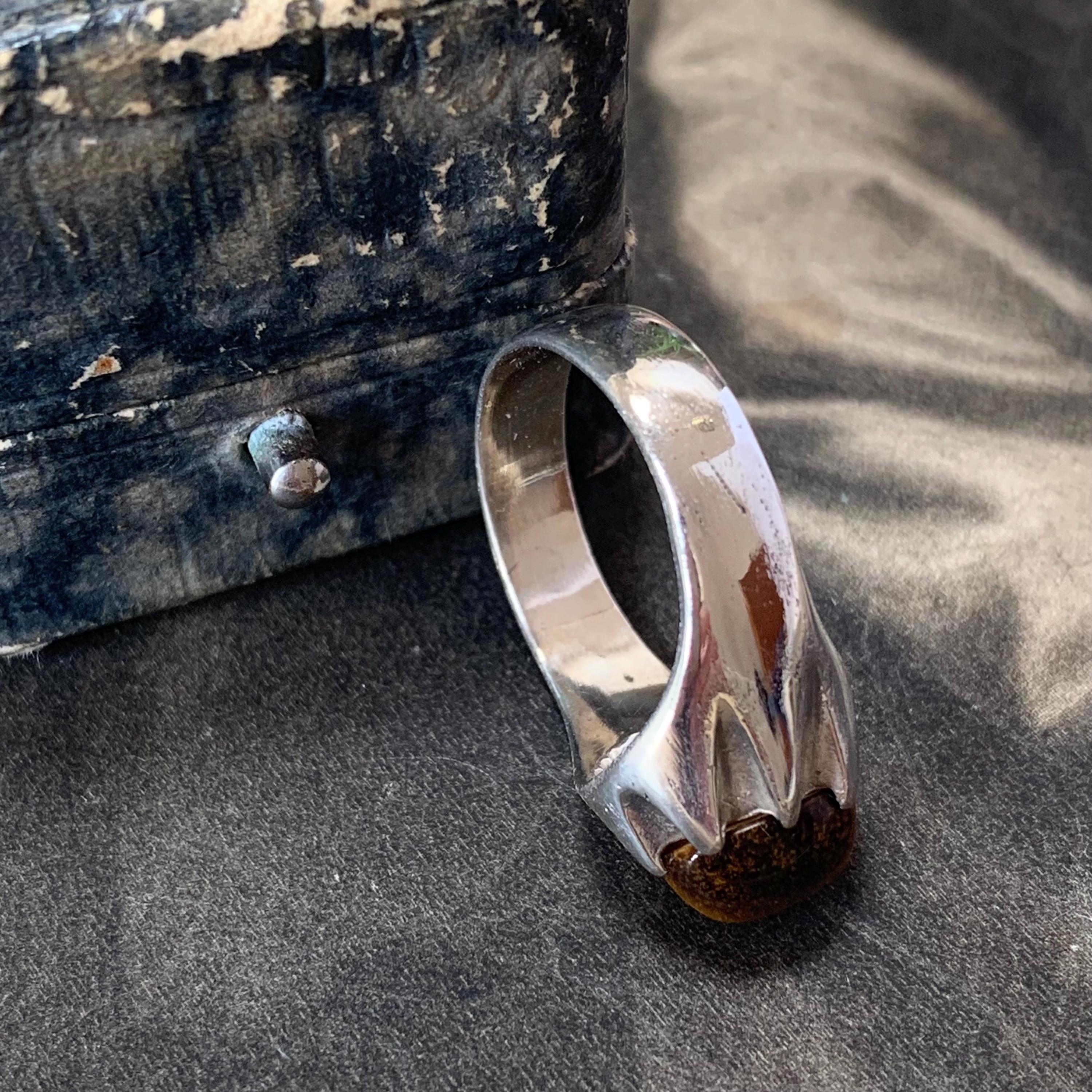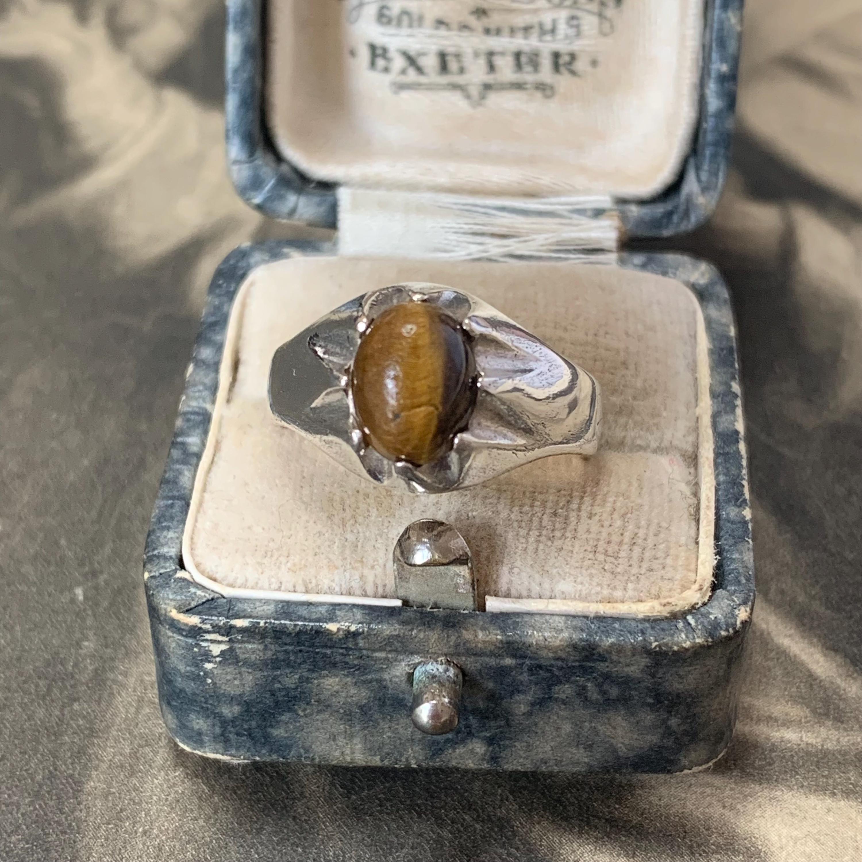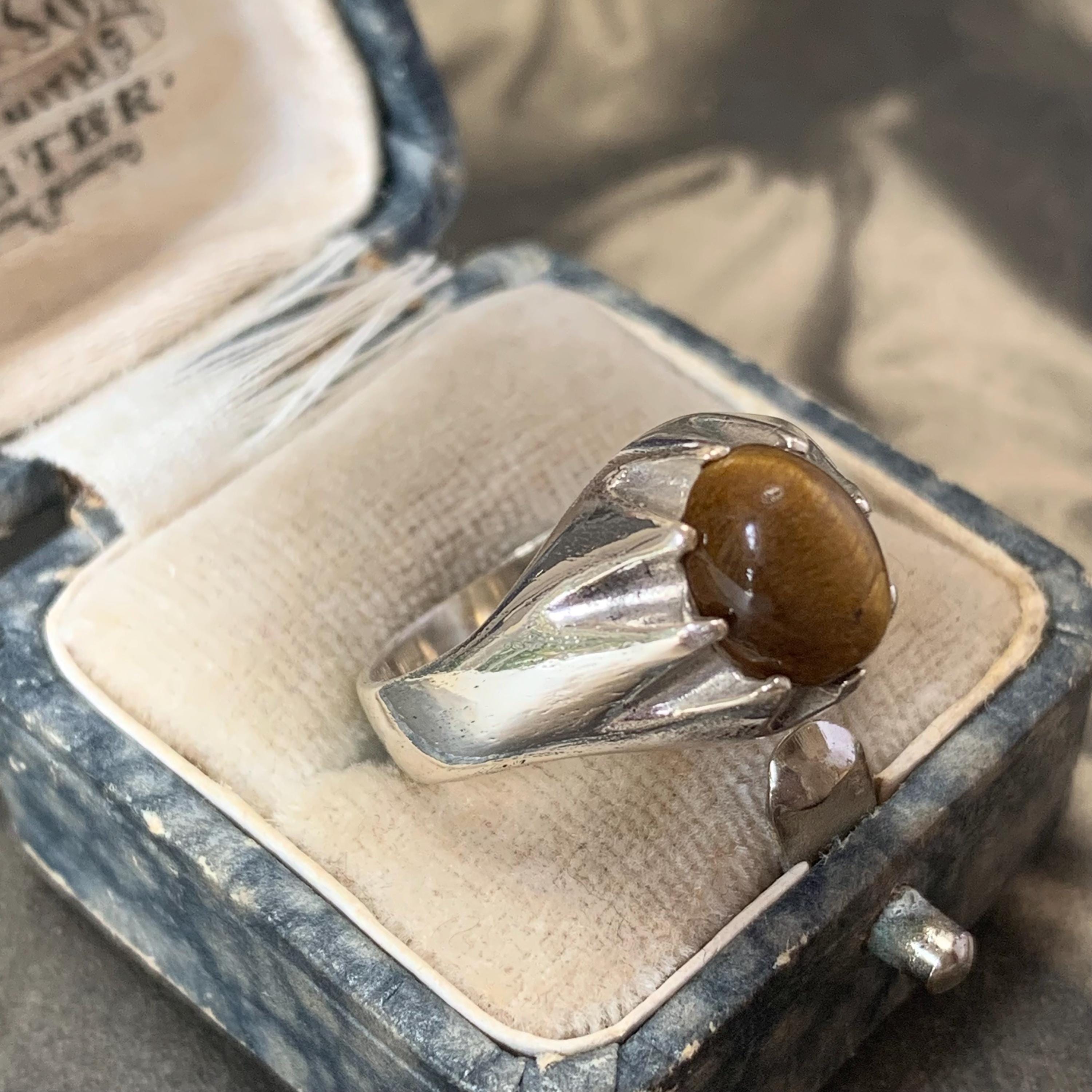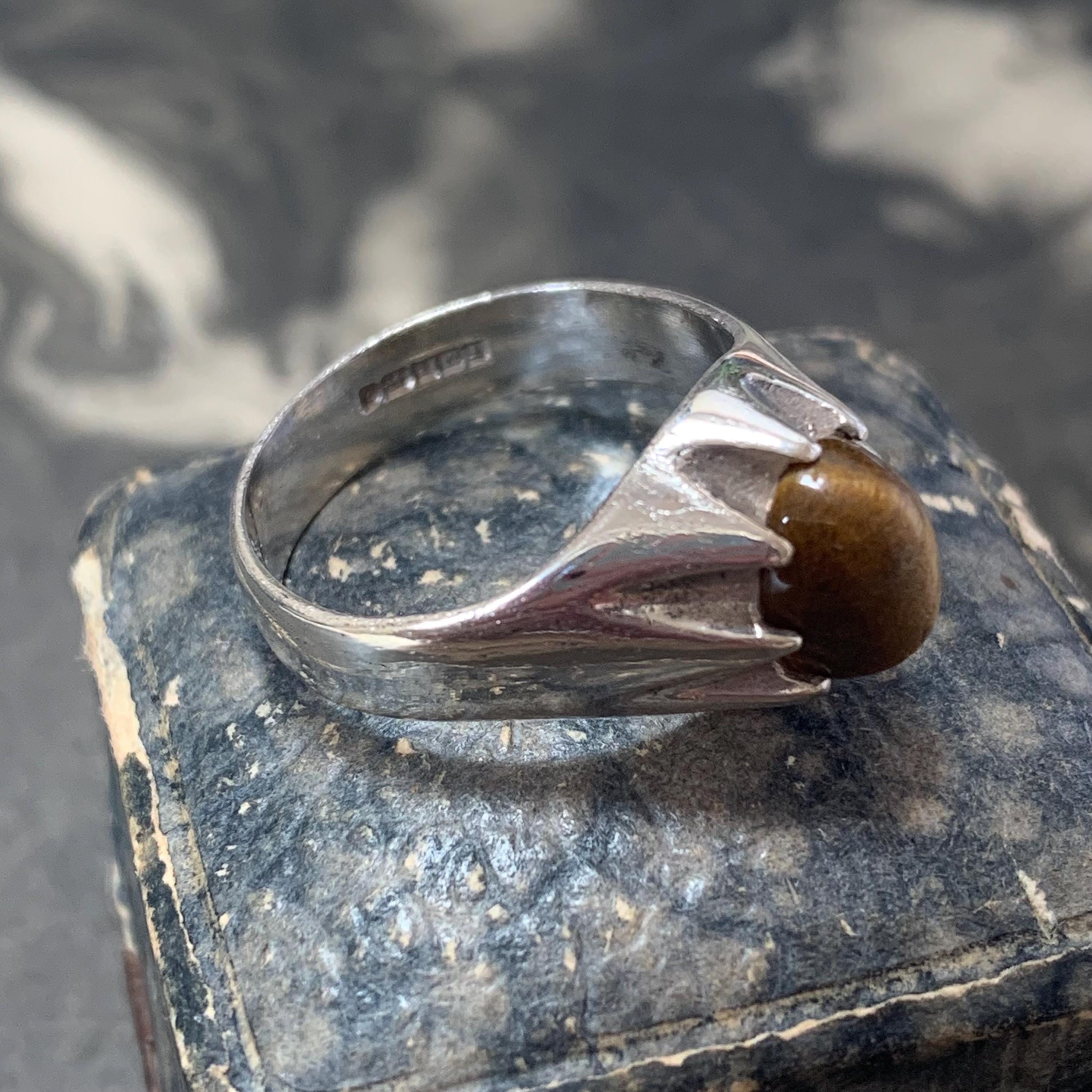 A striking vintage sterling silver tigers eye ring, hallmarked for Birmingham and dated 1980, featuring a warm golden-brown oval cabochon tiger’s eye gemstone. The stone is set in a bold silver mount that widens across the front of the ring.Inside the band you’ll find traditional British hallmarks including the lion passant for sterling silver along with the maker’s mark “TM”, confirming its authenticity and vintage origin. Ring is a size P 1/2 centre UK or a 7 3/4 US.