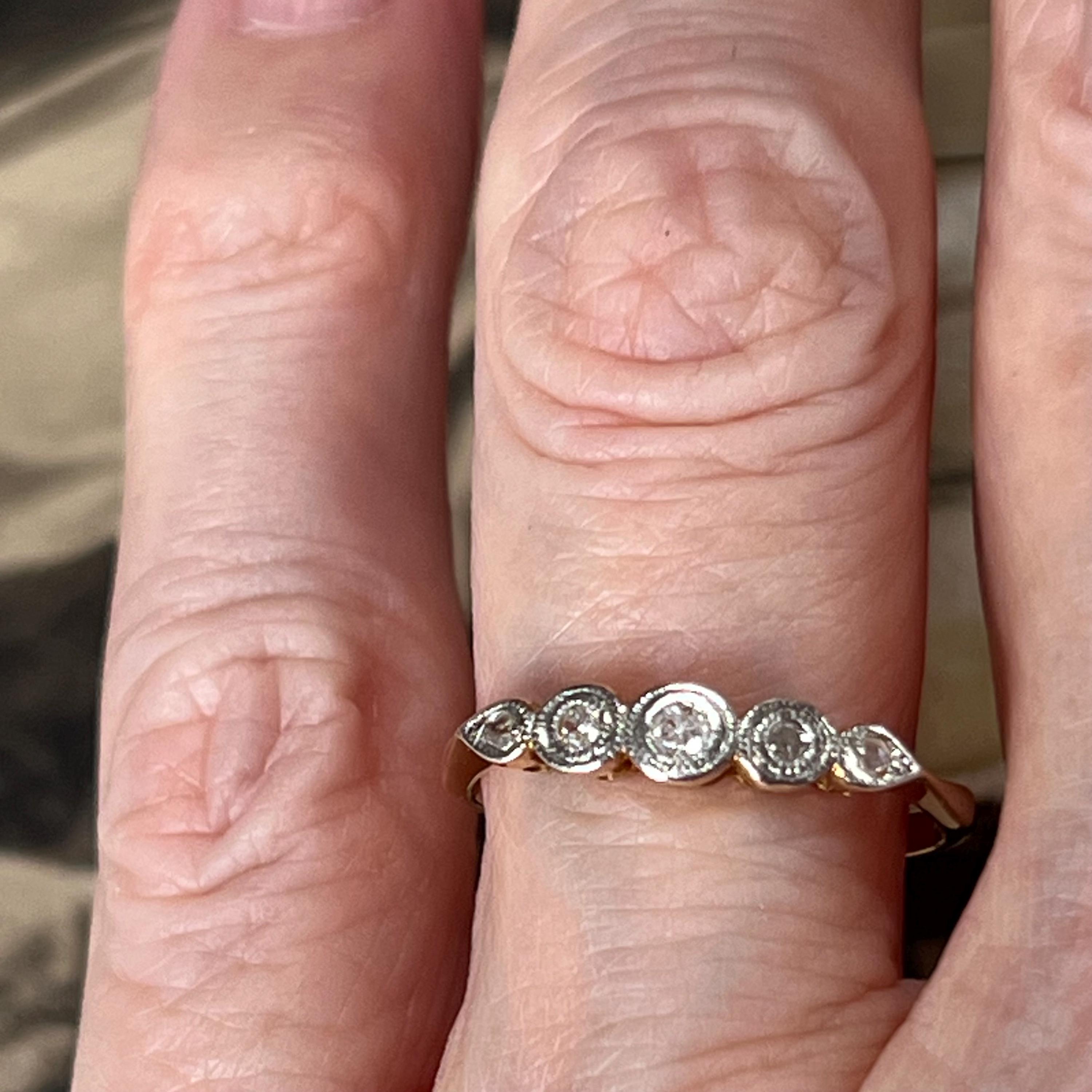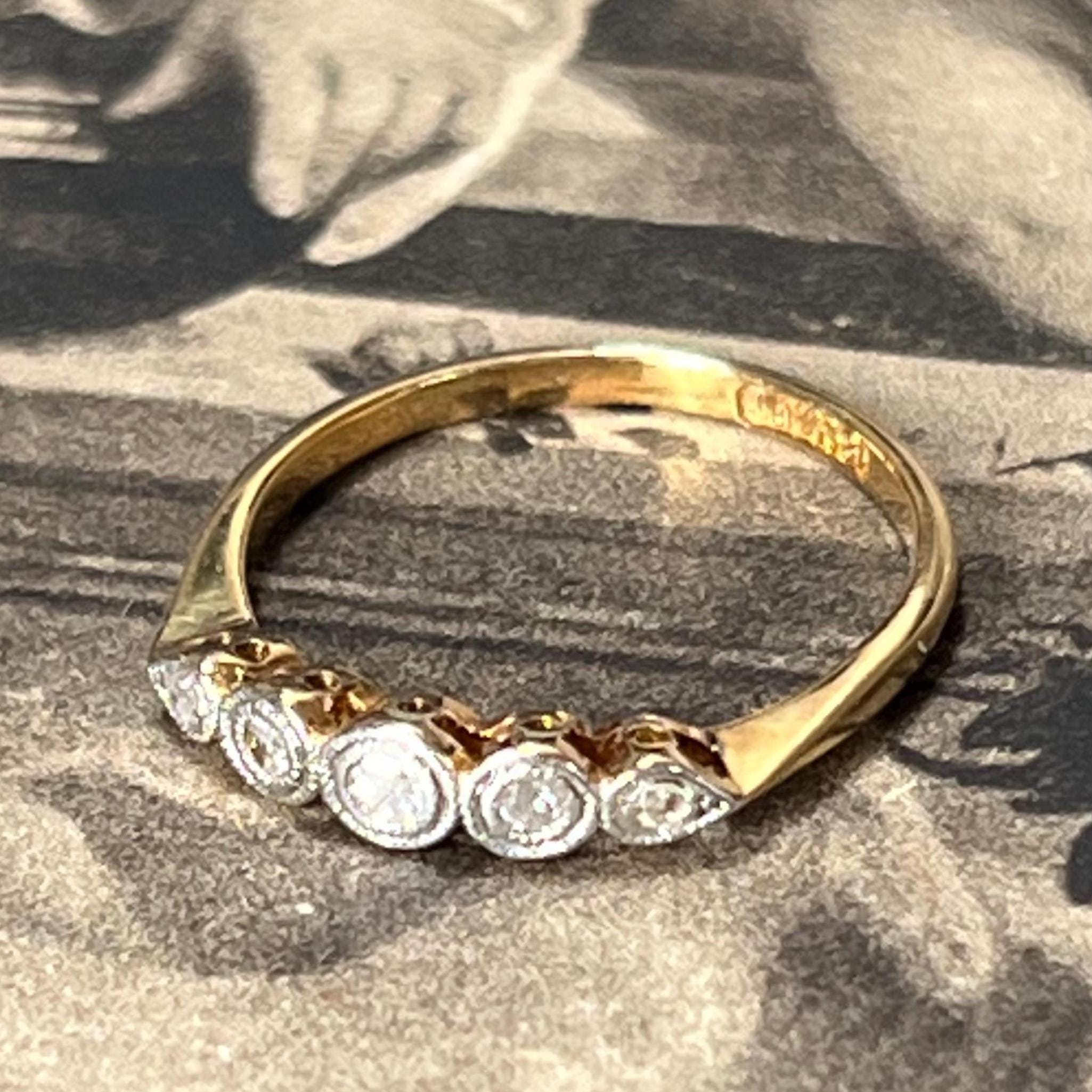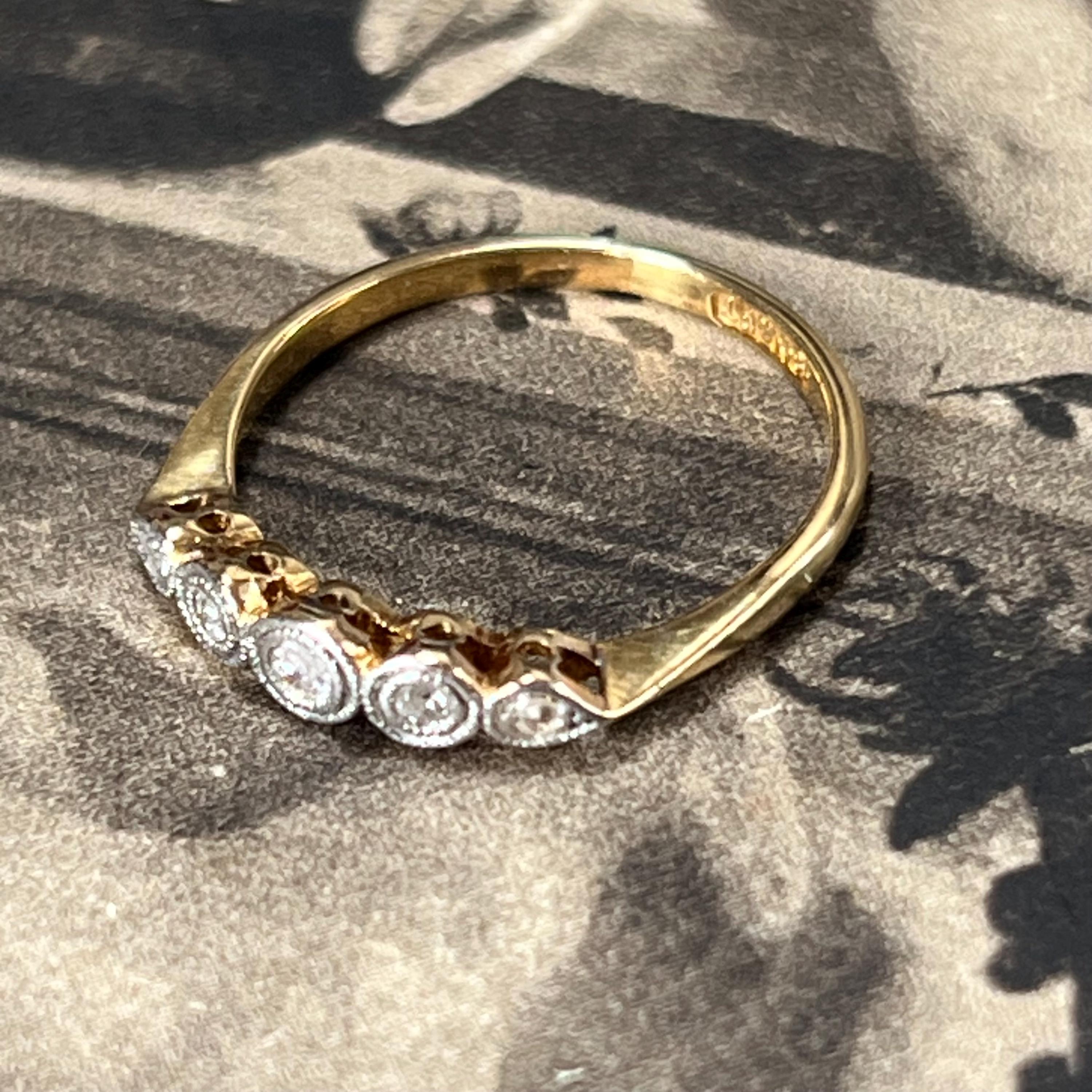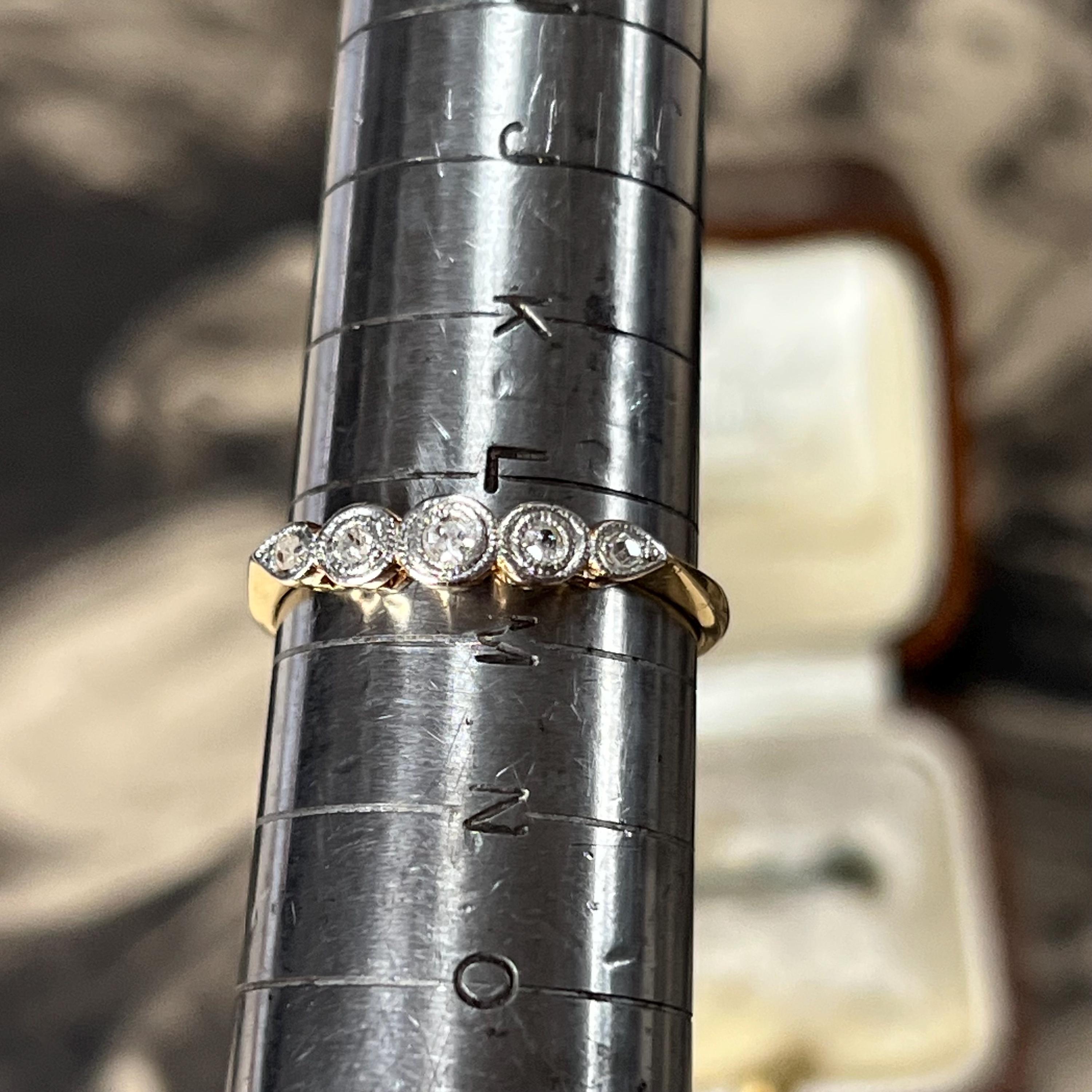 Edwardian diamond ring, early 20th century, 18ct yellow gold, platinum diamond setting. Ring size L.5 (UK) size 5 7/8 (US), Natural diamond gemstones — a classic combination used during the Edwardian era for strength and delicate detailing. The ring is bezel set with five graduated mixed cut diamonds, including traditional mine and rose cuts, giving the stones a soft antique sparkle. Each diamond is framed in platinum with fine milgrain detailing, a signature decorative finish of the period.