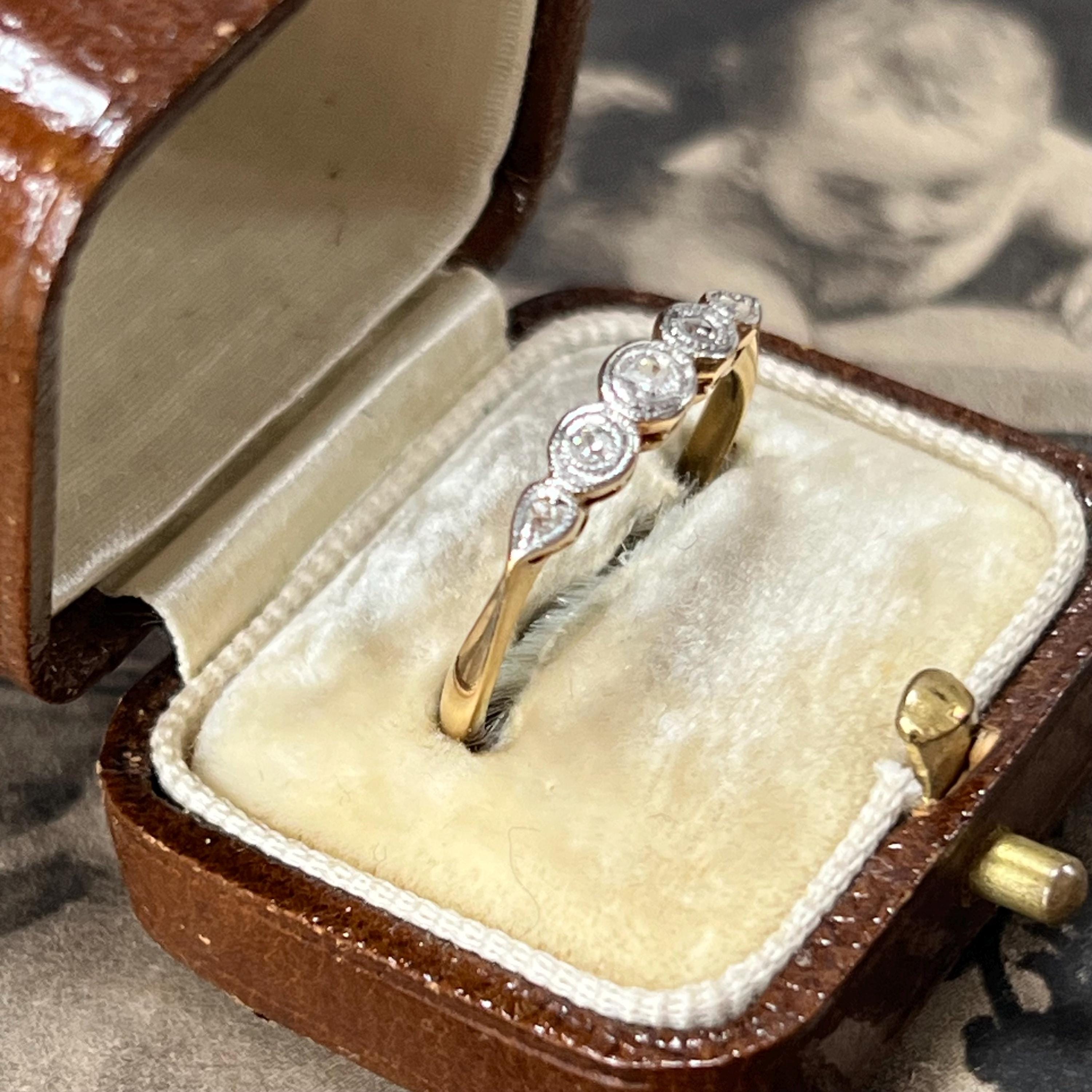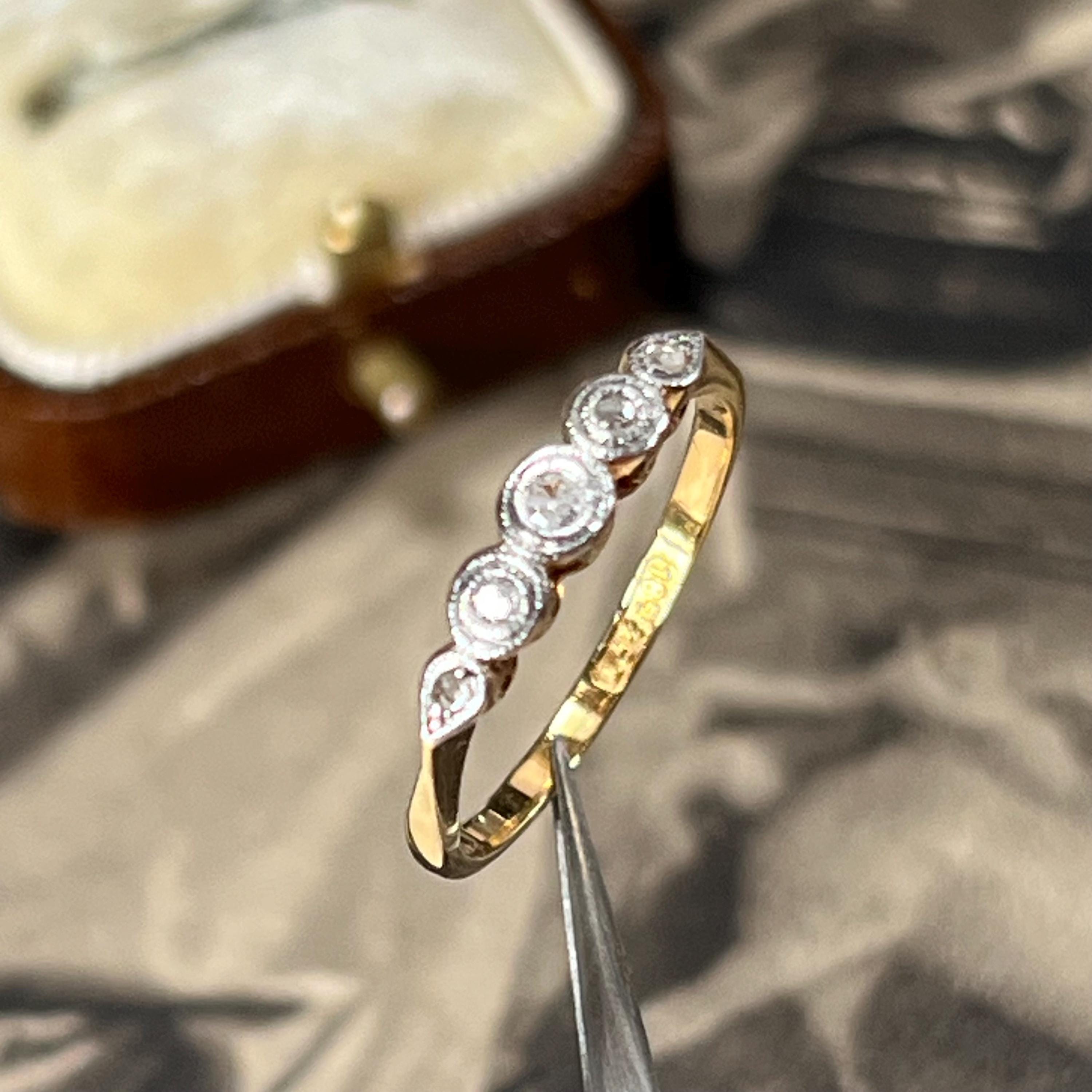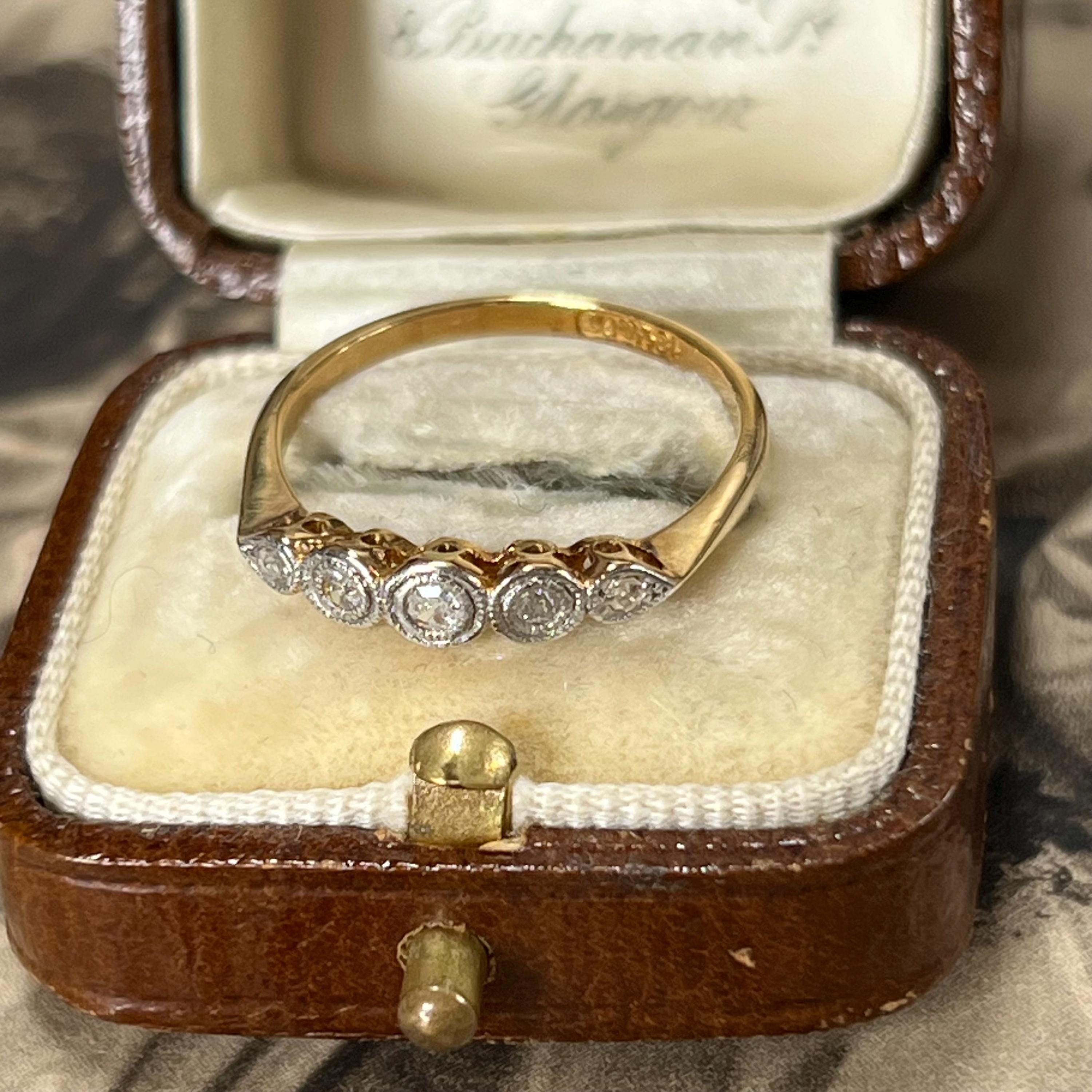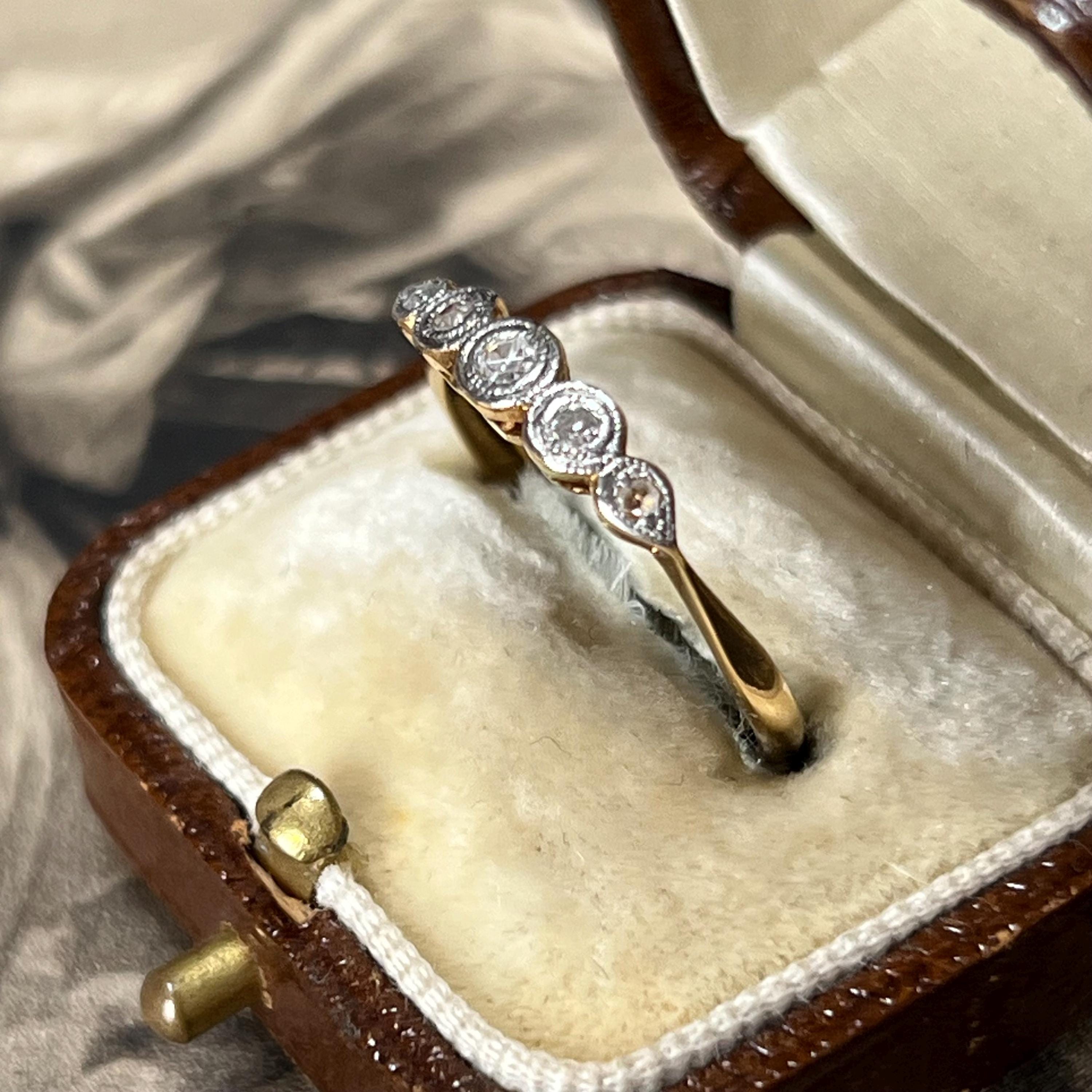 Edwardian diamond ring, early 20th century, 18ct yellow gold, platinum diamond setting. Ring size L.5 (UK) size 5 7/8 (US), Natural diamond gemstones — a classic combination used during the Edwardian era for strength and delicate detailing. The ring is bezel set with five graduated mixed cut diamonds, including traditional mine and rose cuts, giving the stones a soft antique sparkle. Each diamond is framed in platinum with fine milgrain detailing, a signature decorative finish of the period.