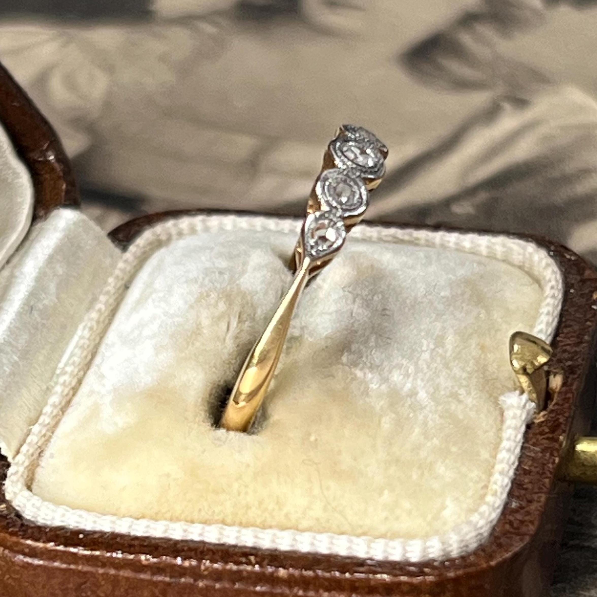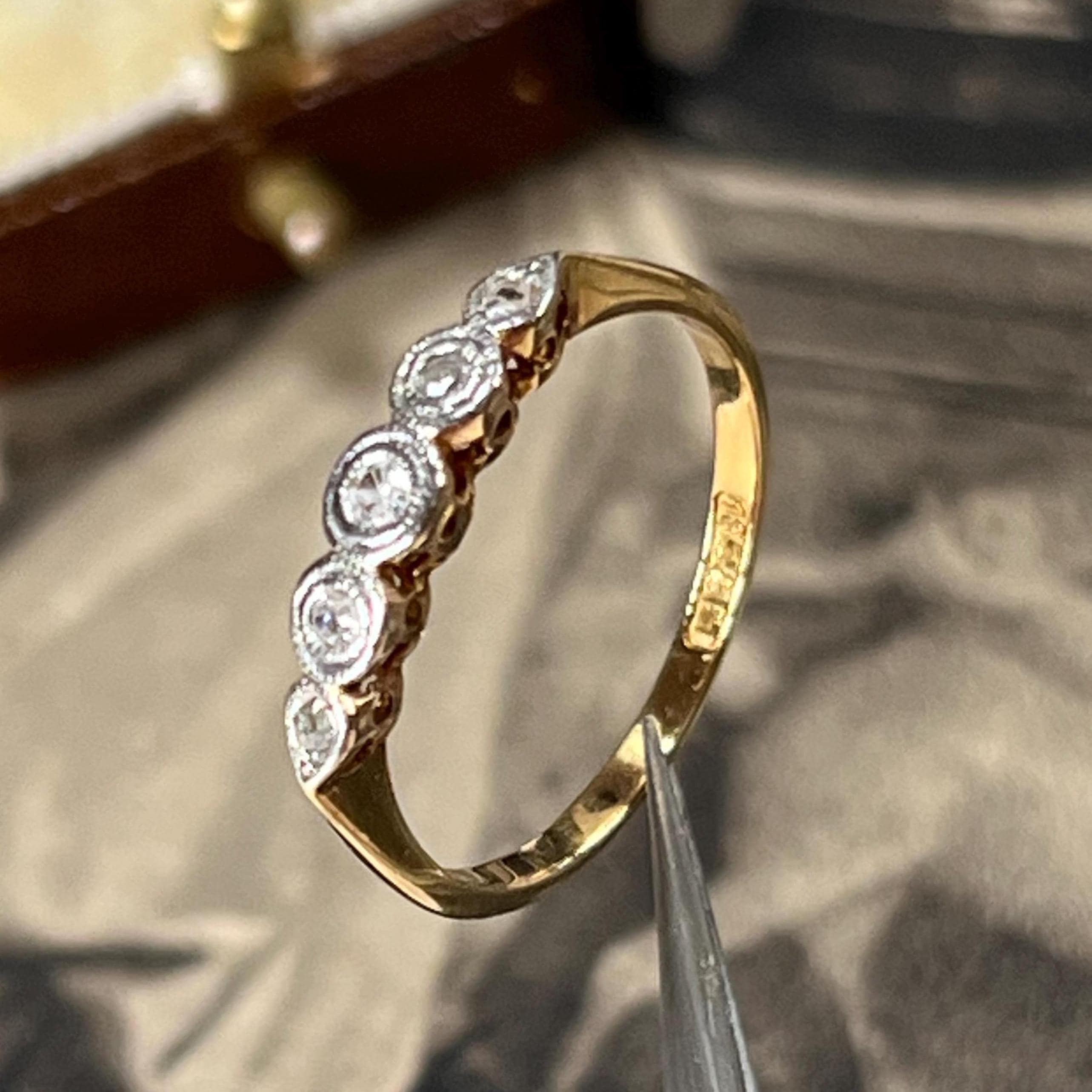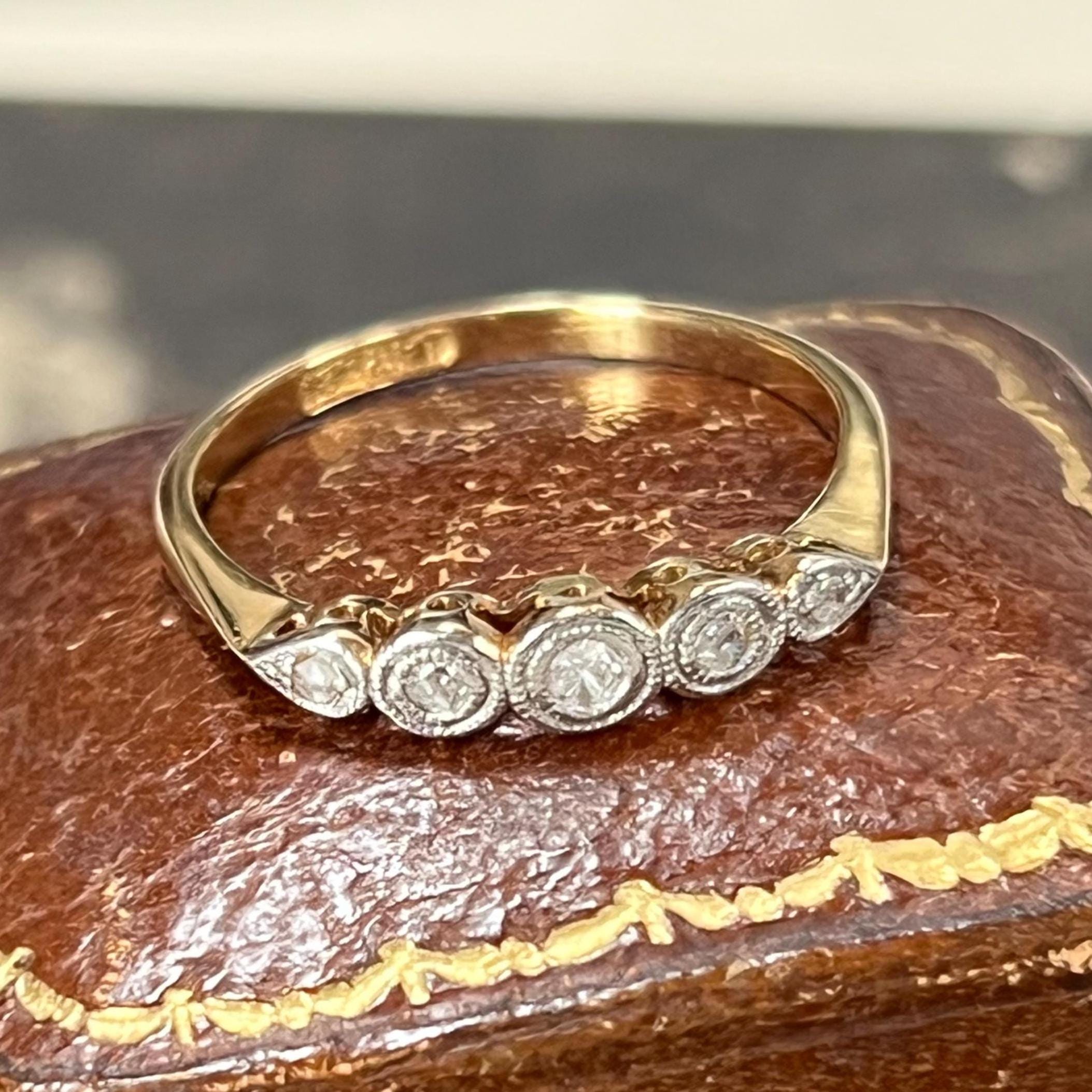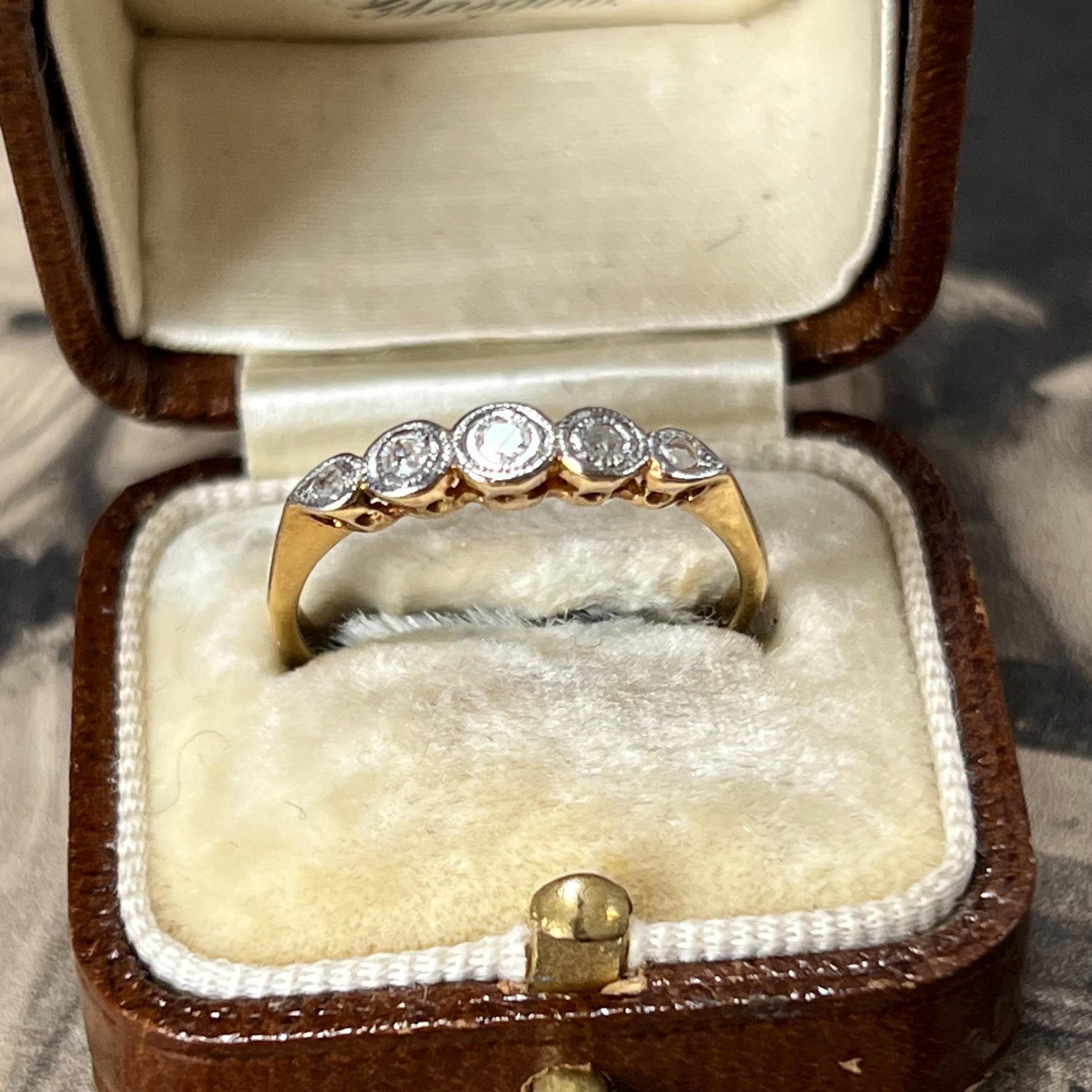 Edwardian diamond ring, early 20th century, 18ct yellow gold, platinum diamond setting. Ring size L.5 (UK) size 5 7/8 (US), Natural diamond gemstones — a classic combination used during the Edwardian era for strength and delicate detailing. The ring is bezel set with five graduated mixed cut diamonds, including traditional mine and rose cuts, giving the stones a soft antique sparkle. Each diamond is framed in platinum with fine milgrain detailing, a signature decorative finish of the period.