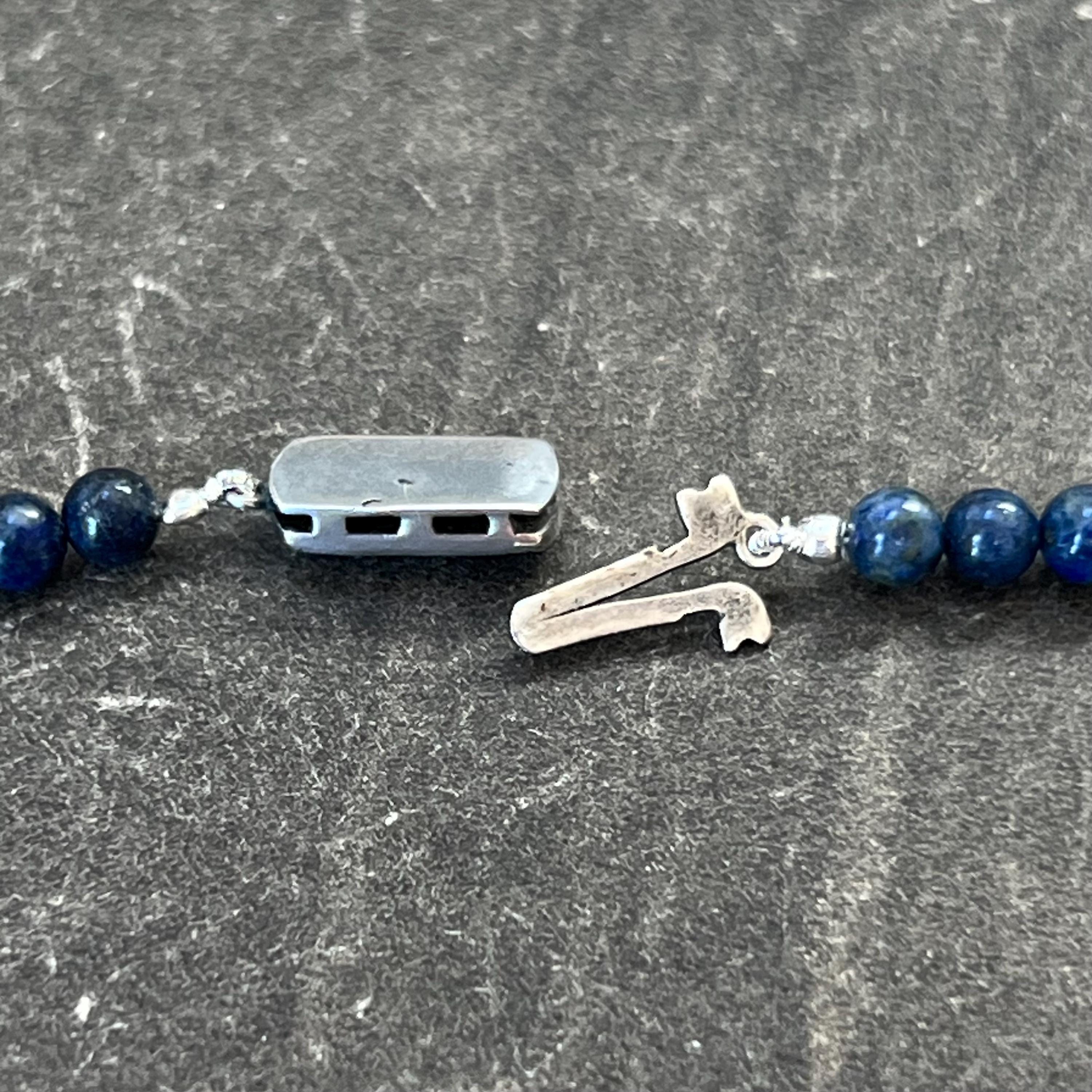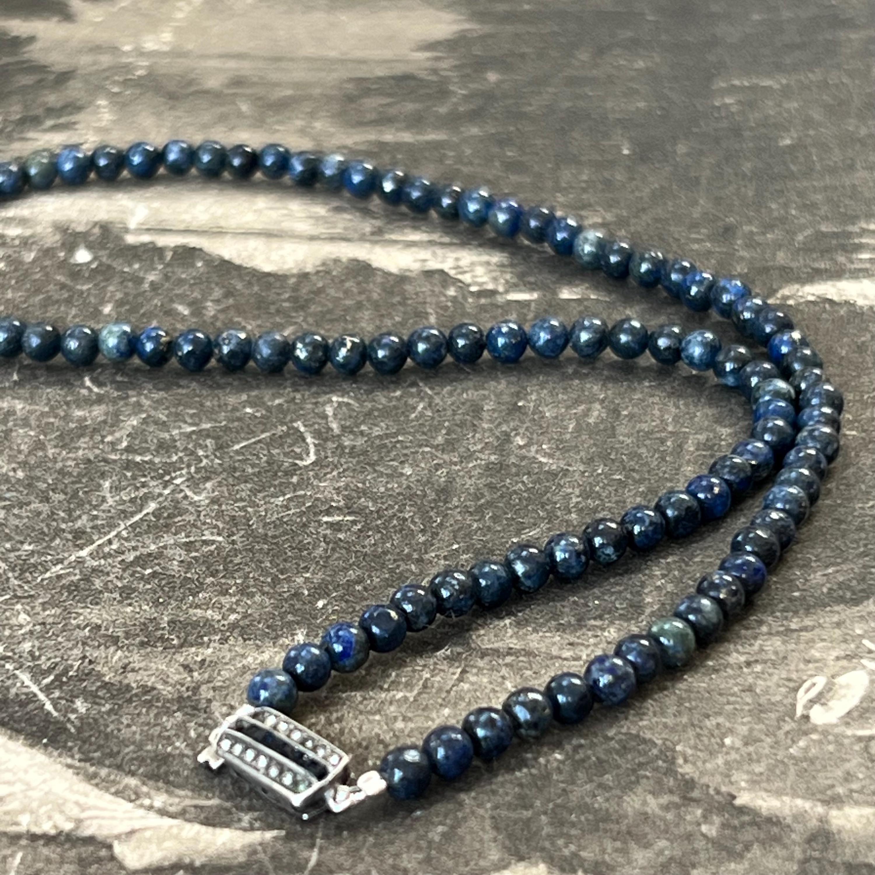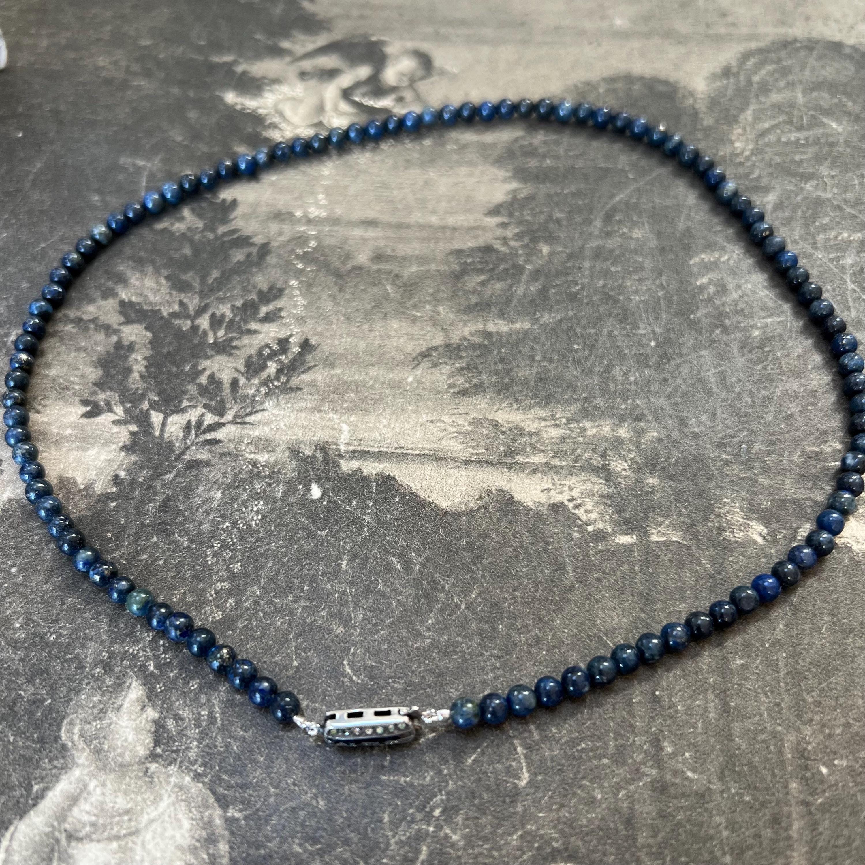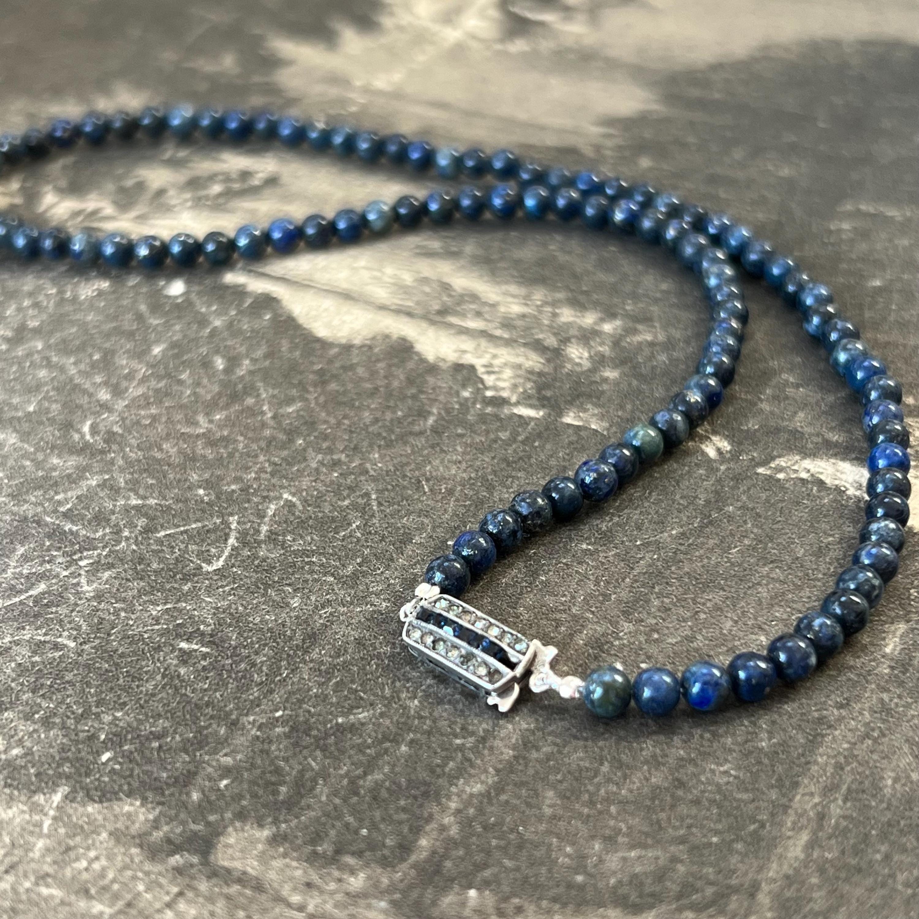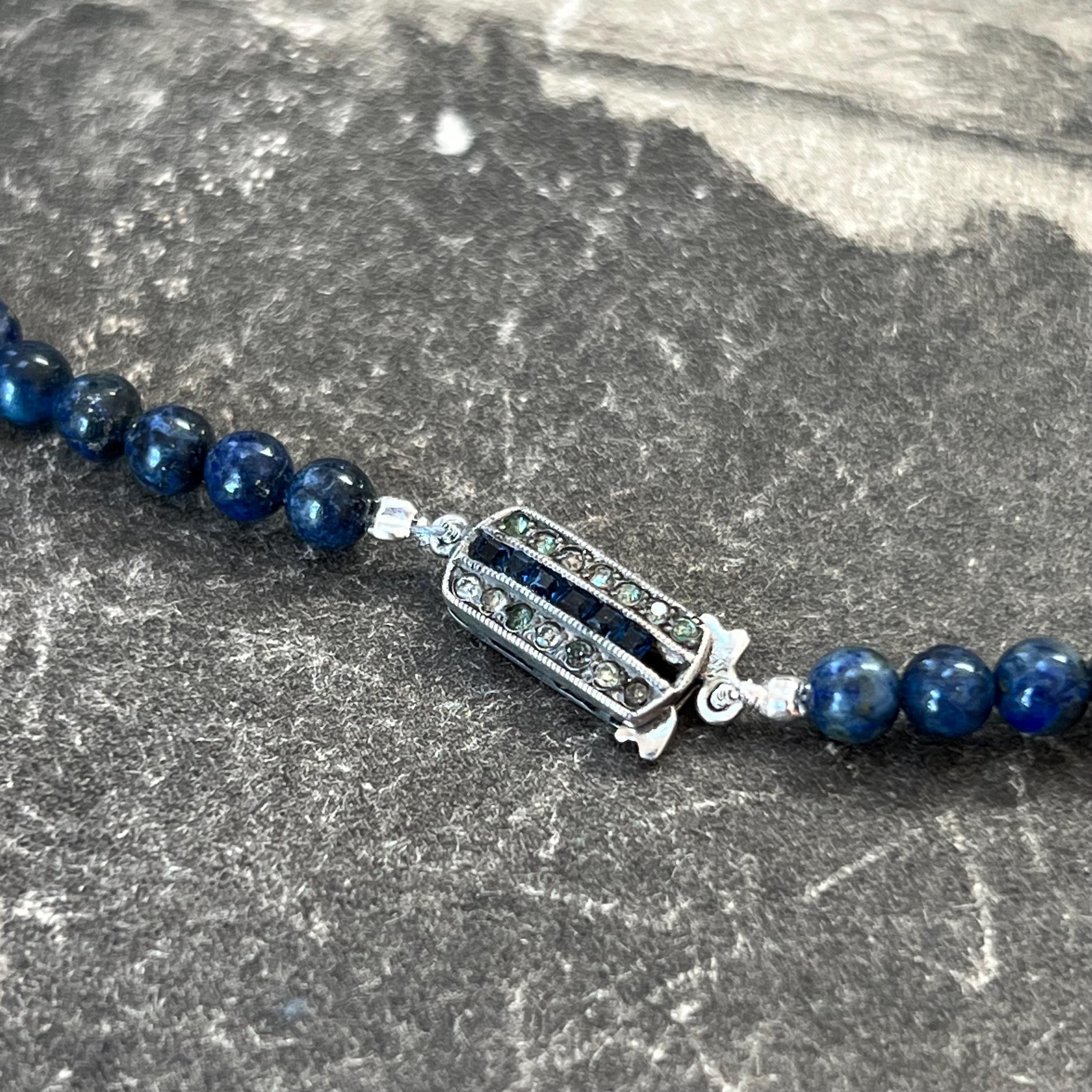 A striking Art Deco lapis lazuli necklace dating to the 1930s, featuring rich blue natural gemstone beads and an ornate silver clasp. The celestial blue tones of the stone makes it a natural beauty. The necklace fastens with a beautifully detailed silver paste-set clasp, set with calibre-cut blue stones to the centre (one stone deficient) and surrounded by white paste stones designed to mimic sapphires and diamonds — perfectly complementing the colour of the lapis.