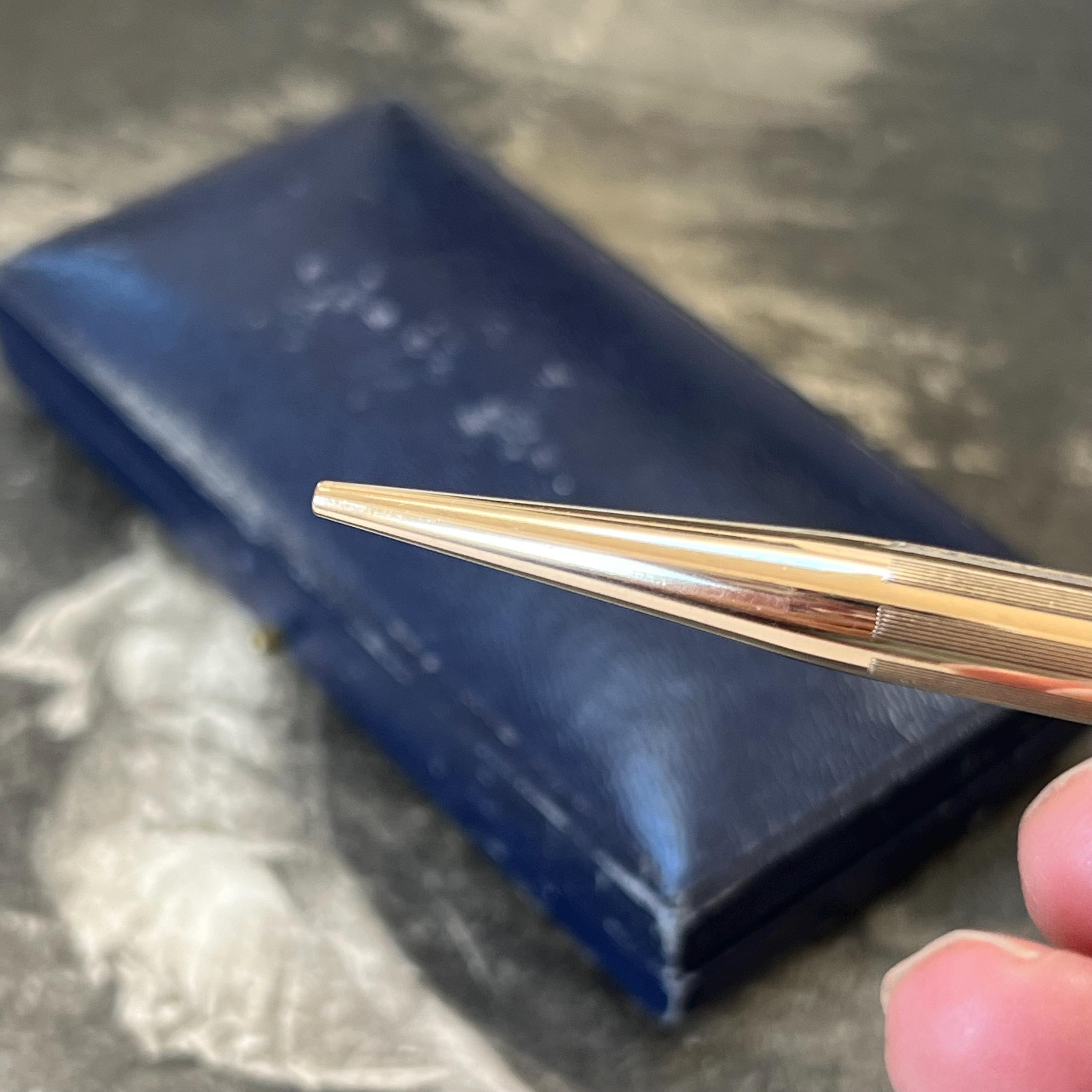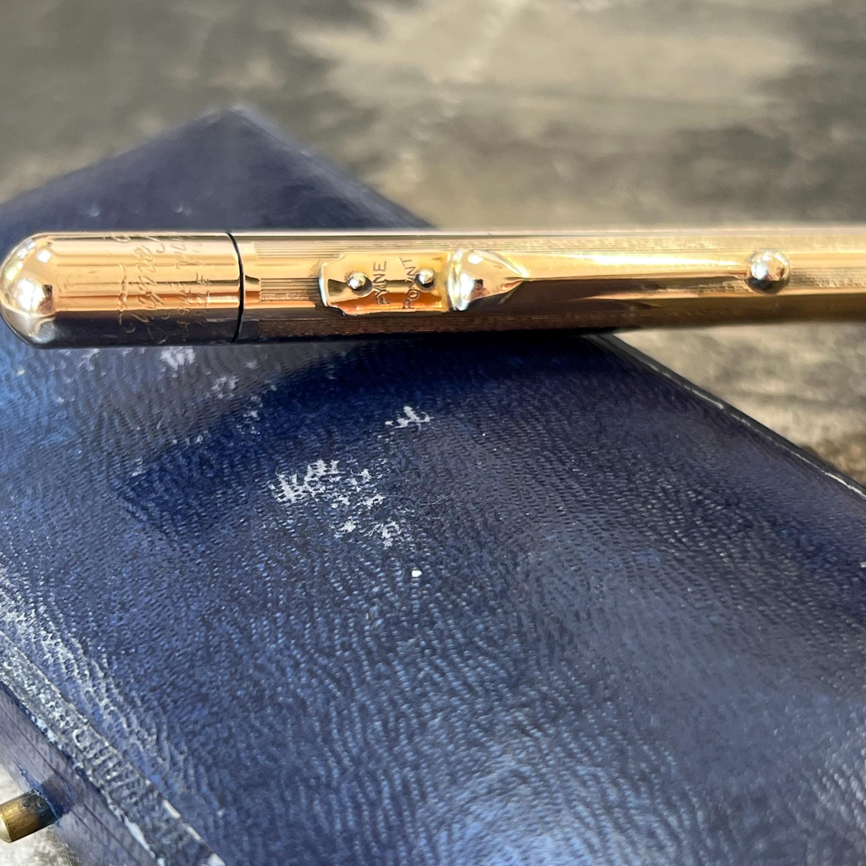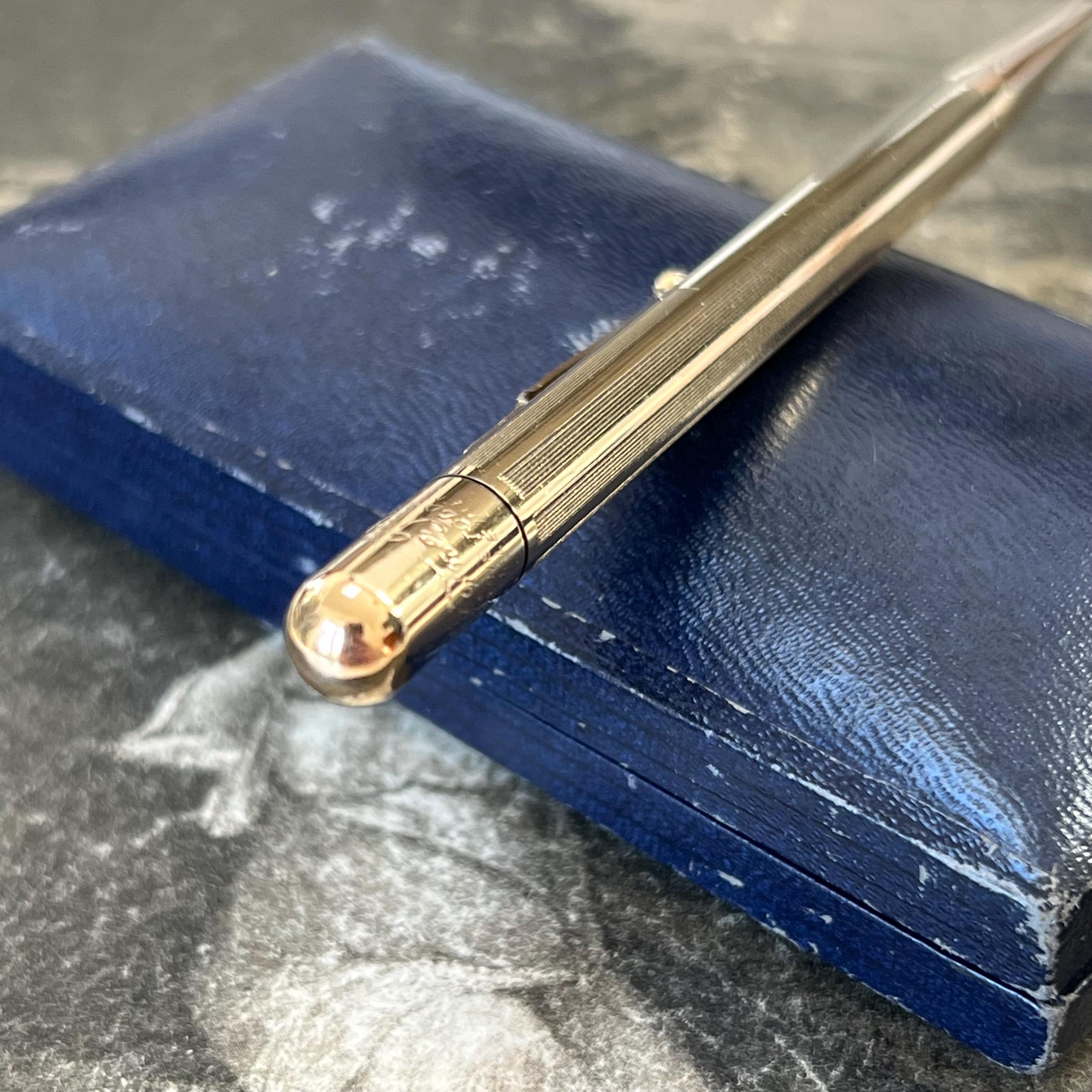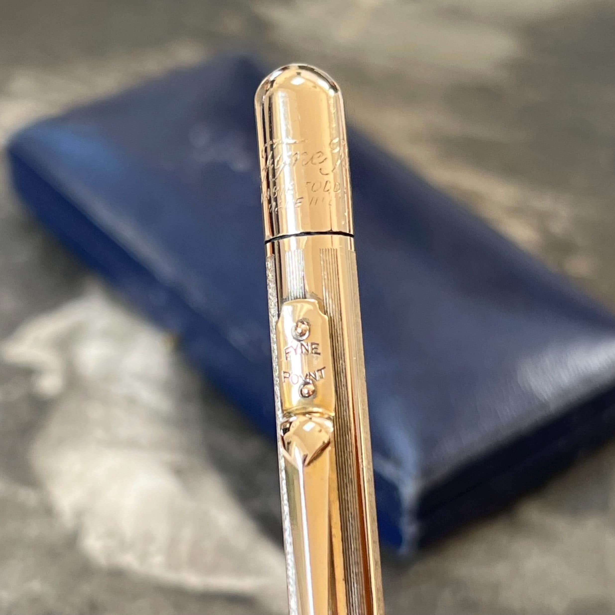 Vintage Mabie Todd & Co. “Fyne Point” propelling pencil, crafted in gold plate and dating to the 1930s–1940s. A classic British writing instrument, engraved “Mabie Todd & Co,” “Fyne Point,” and “Made in England,” reflecting the brand’s reputation for quality and precision engineering.