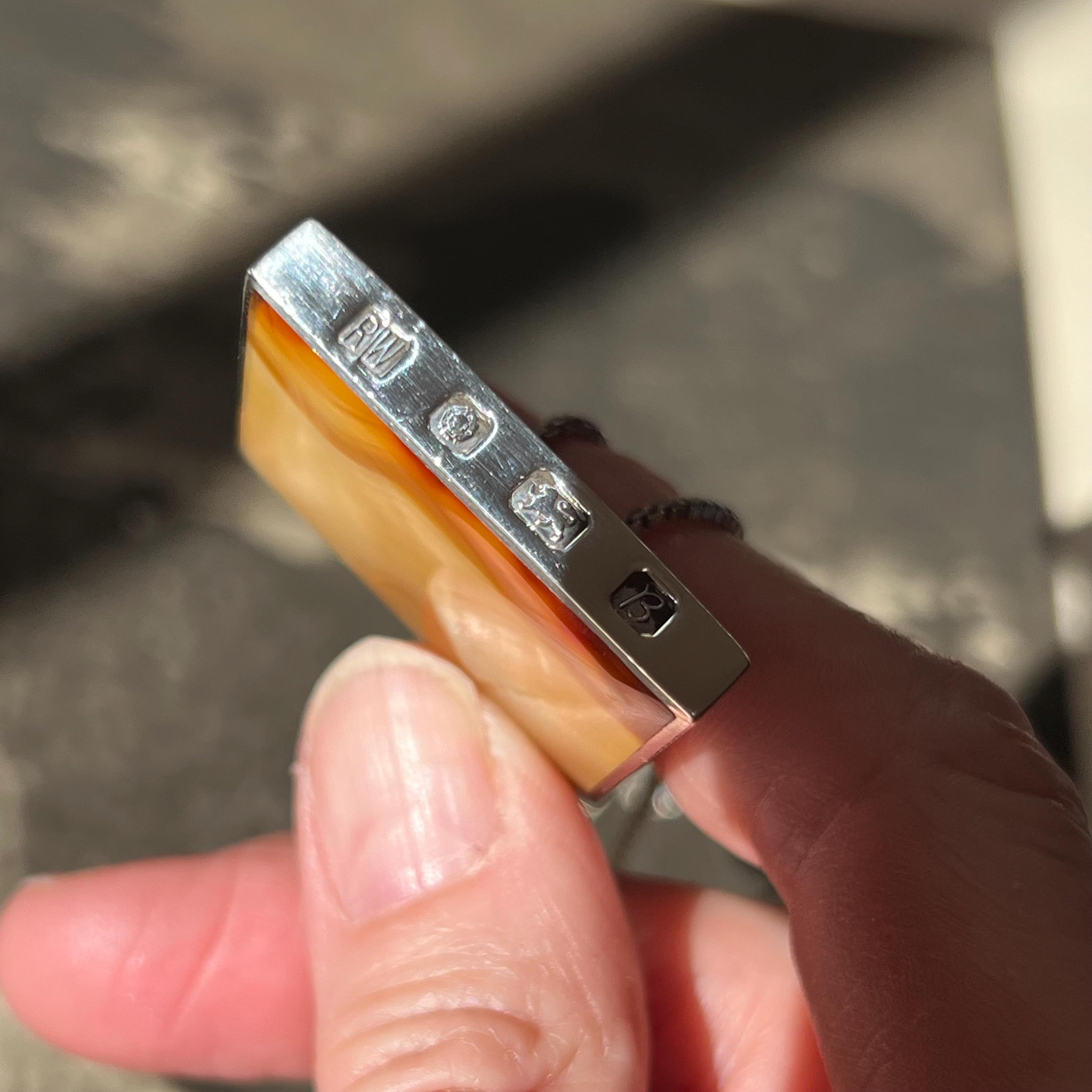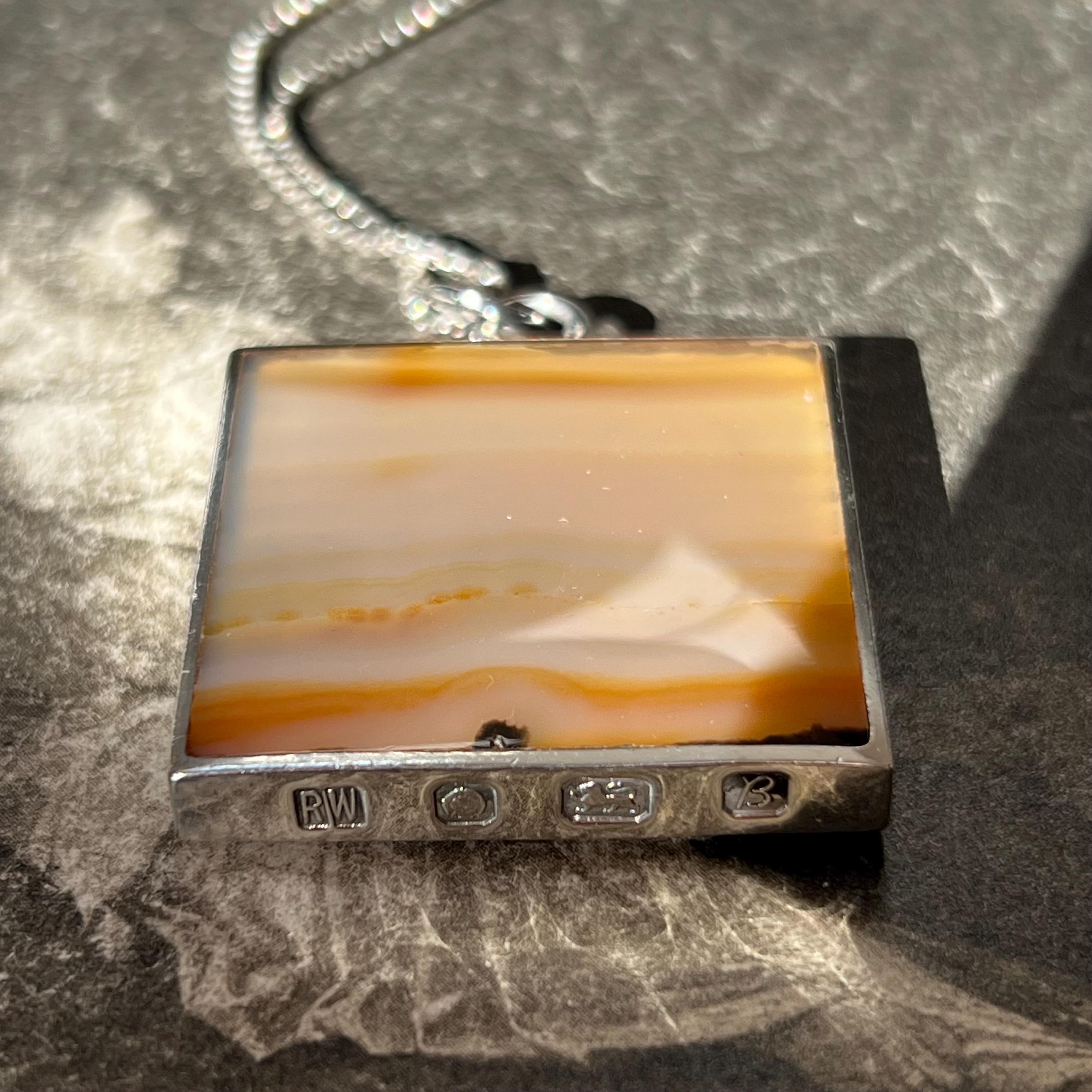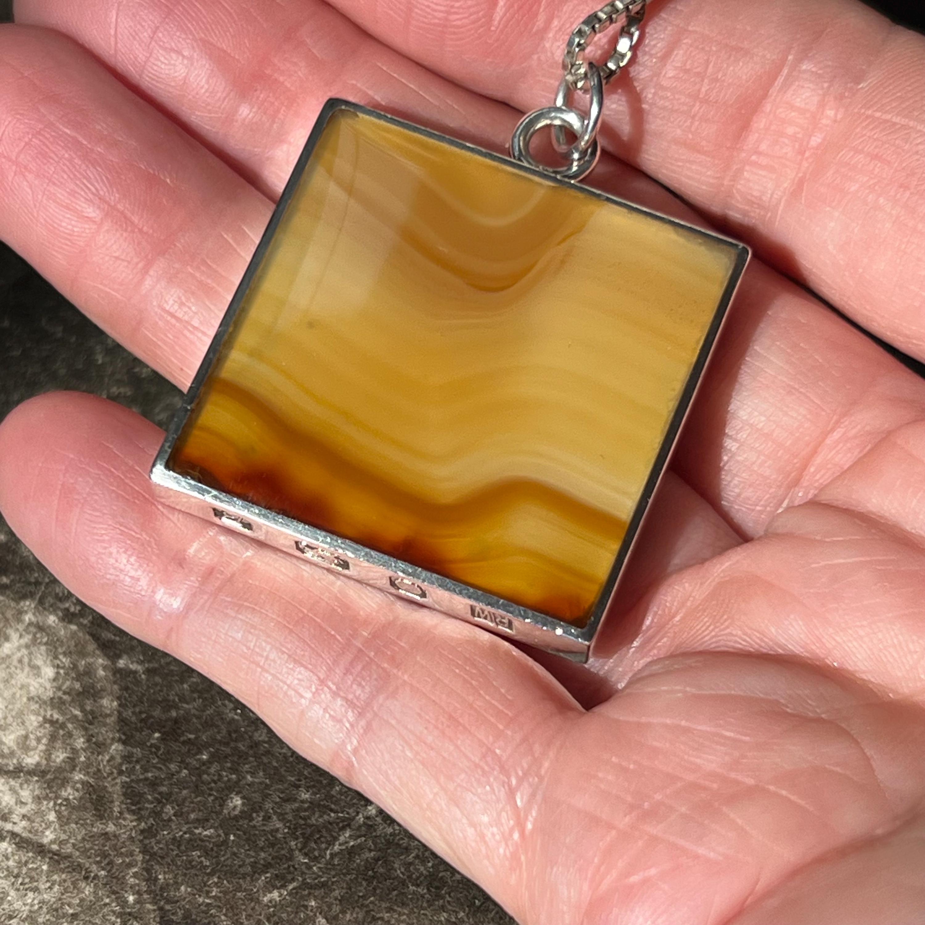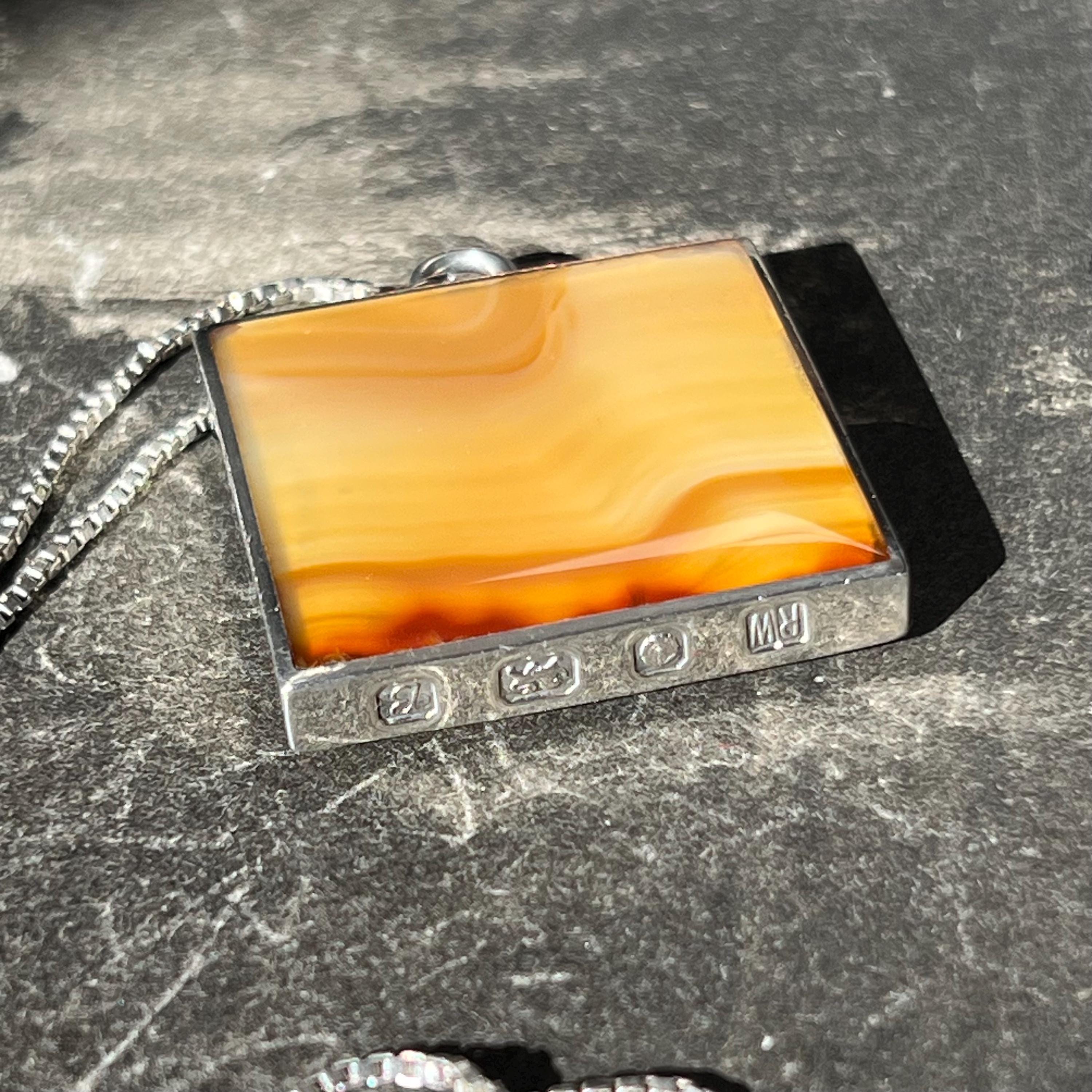A bold and beautifully balanced vintage sterling silver double-sided pendant by British designer Ralph Weston, hallmarked in Sheffield and dated 1976. This striking retro 1970s piece features butterscotch banded agate to both sides of the pendant, each with its own unique natural pattern and warm amber tones. The reversible design allows for subtle variation depending on how it’s worn.