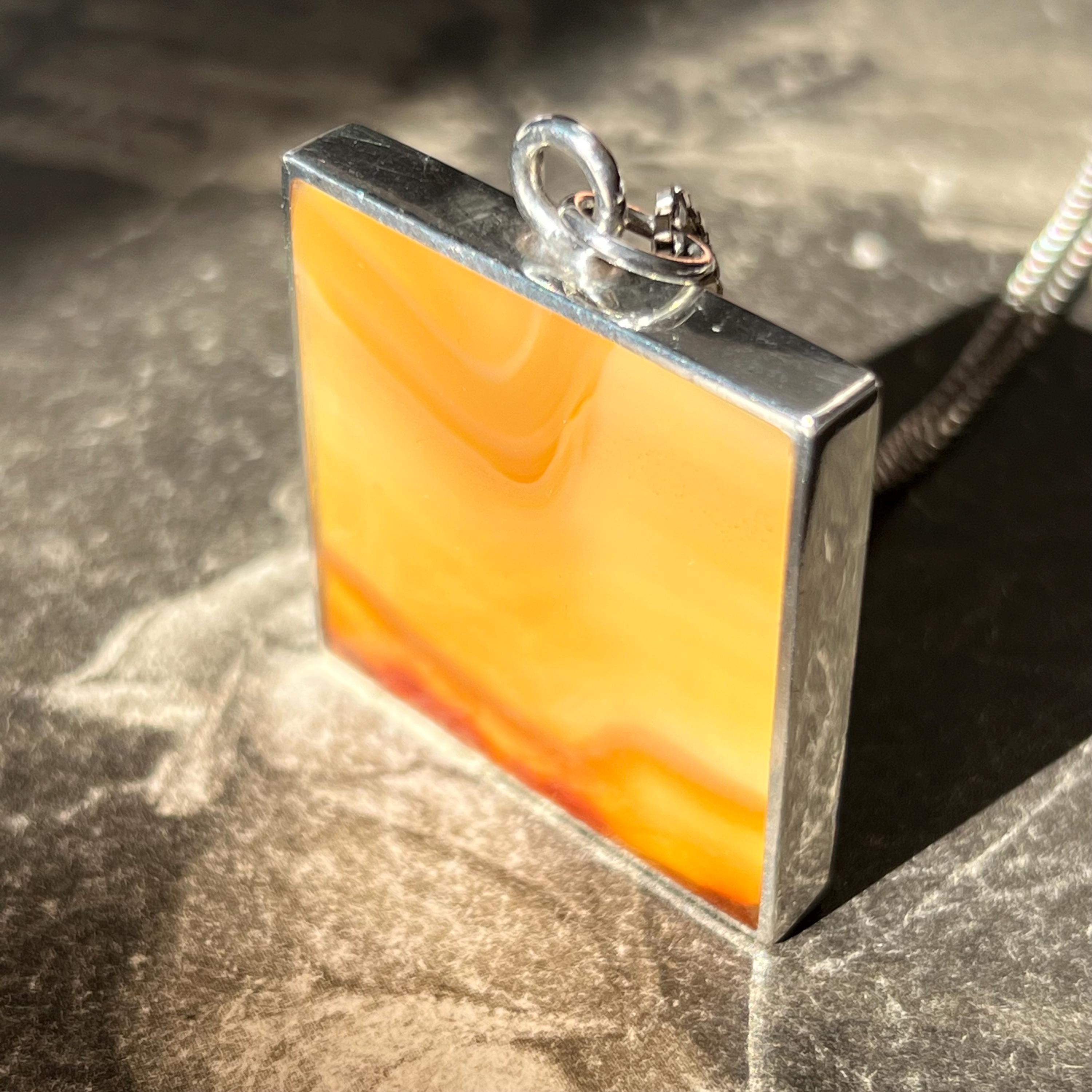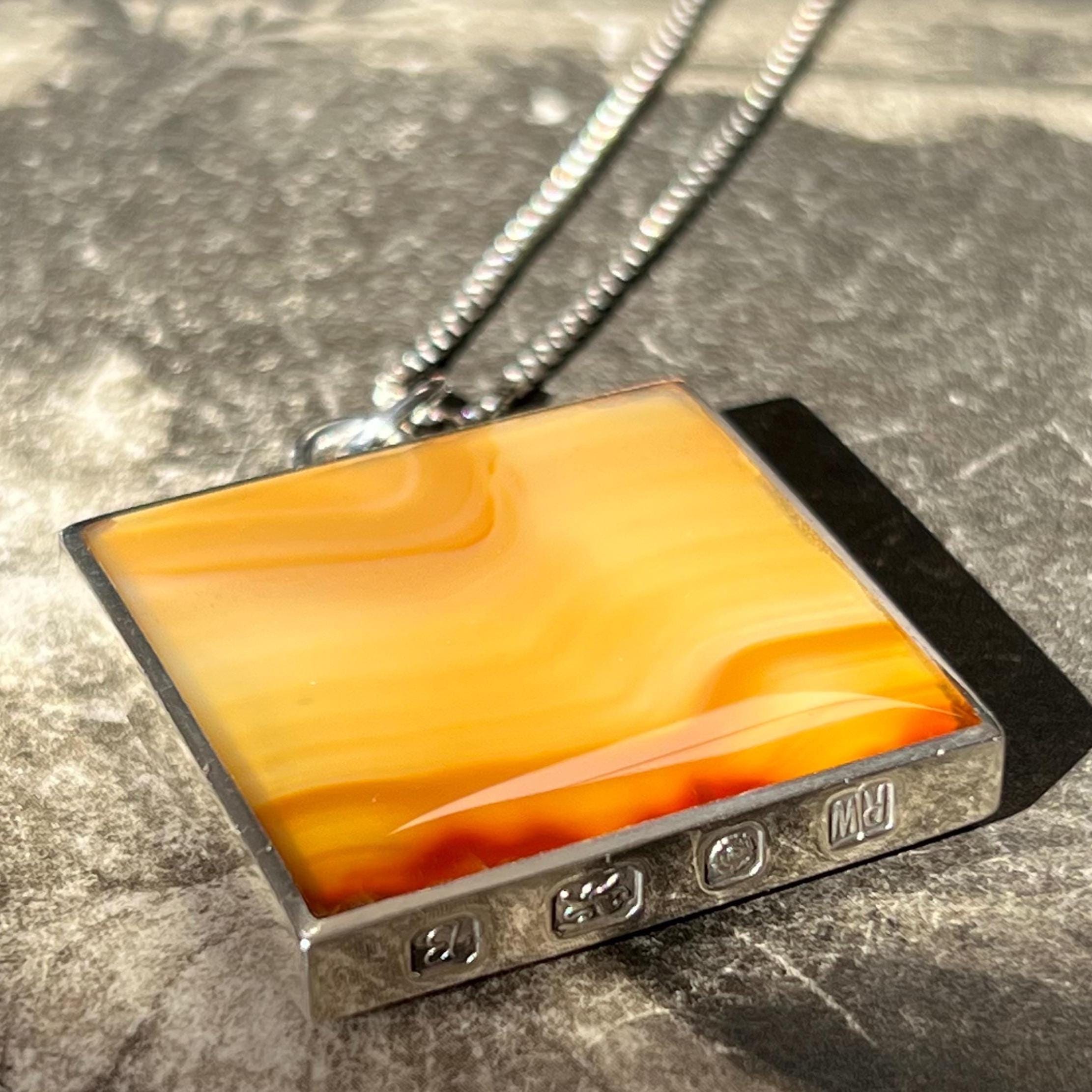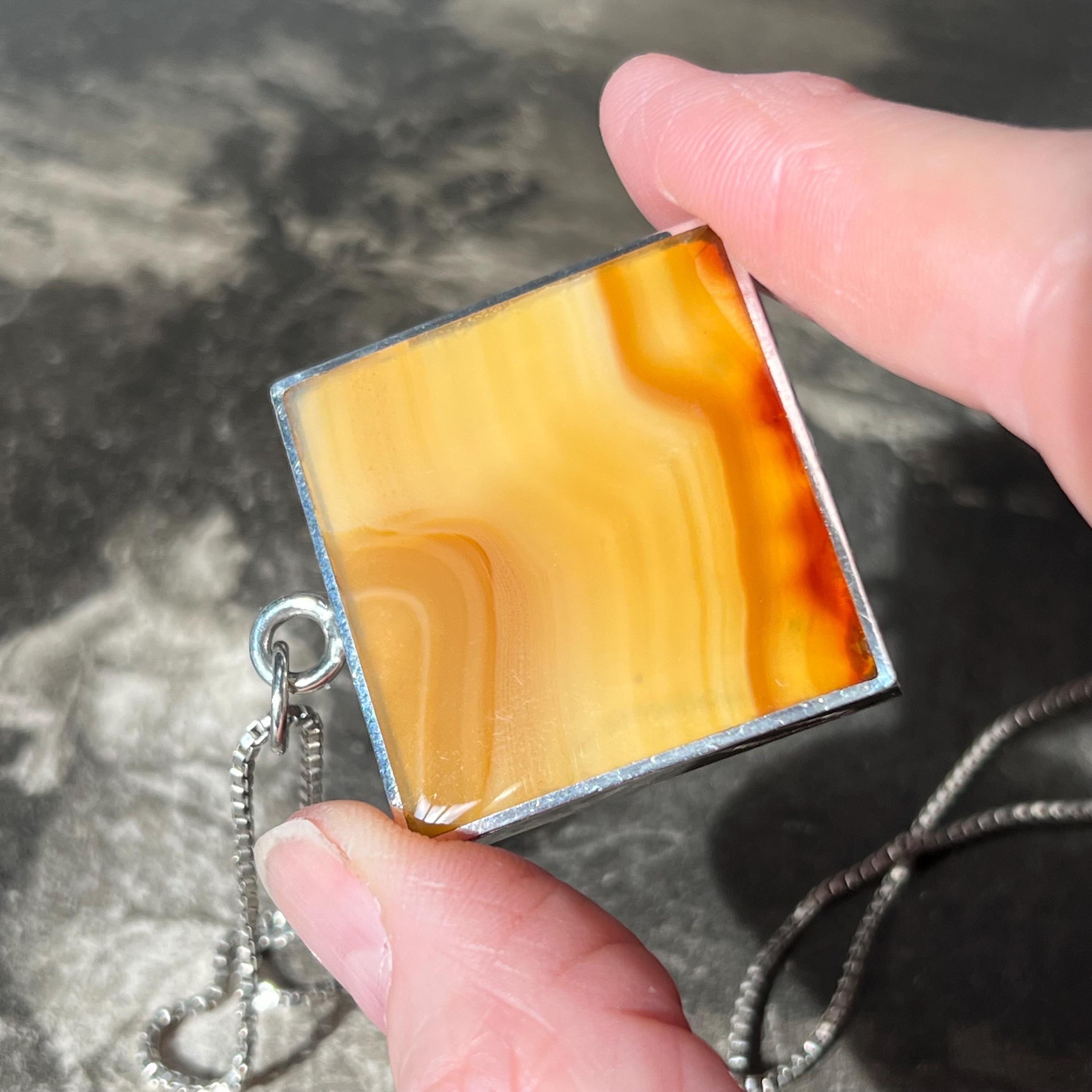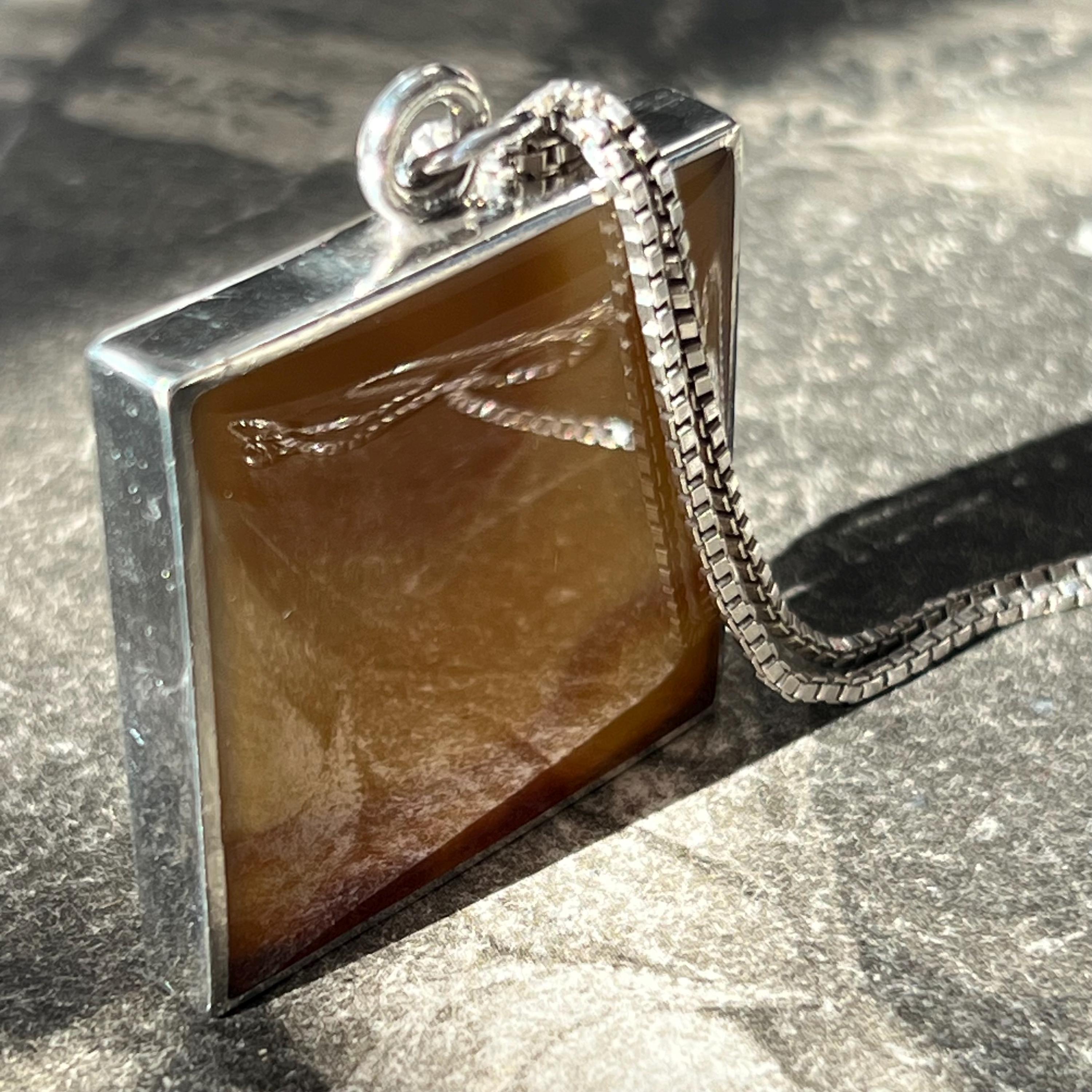 A bold and beautifully balanced vintage sterling silver double-sided pendant by British designer Ralph Weston, hallmarked in Sheffield and dated 1976. This striking retro 1970s piece features butterscotch banded agate to both sides of the pendant, each with its own unique natural pattern and warm amber tones. The reversible design allows for subtle variation depending on how it’s worn.