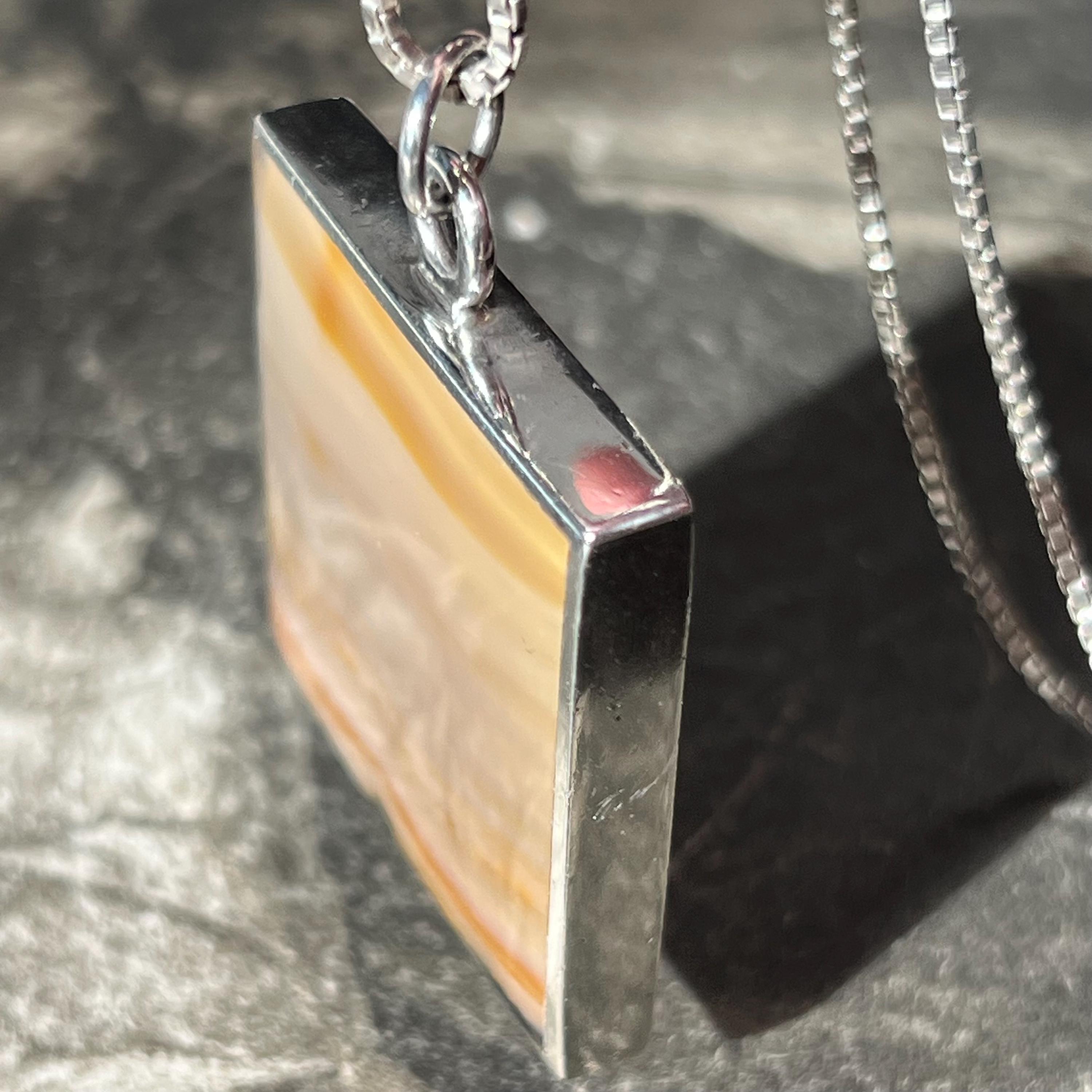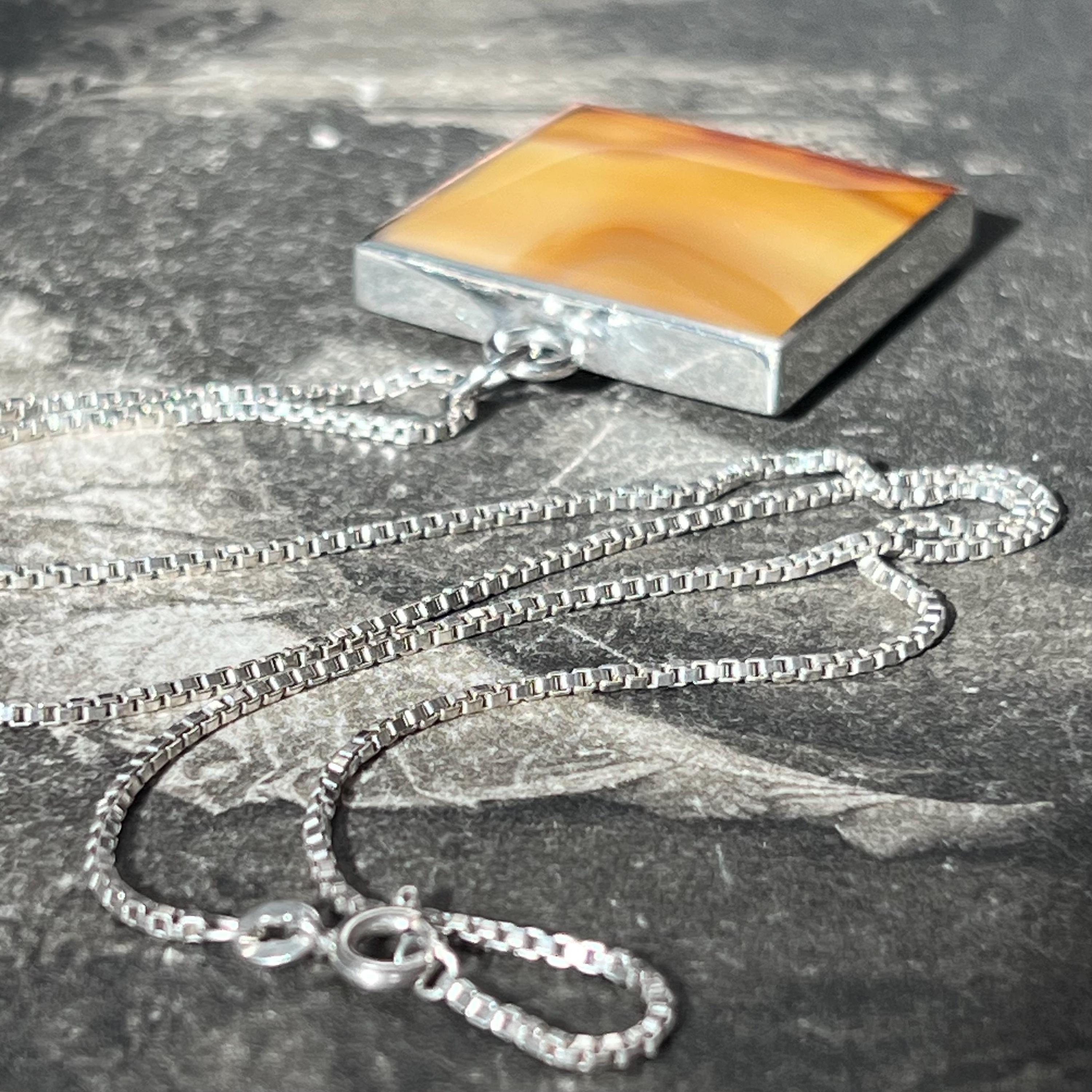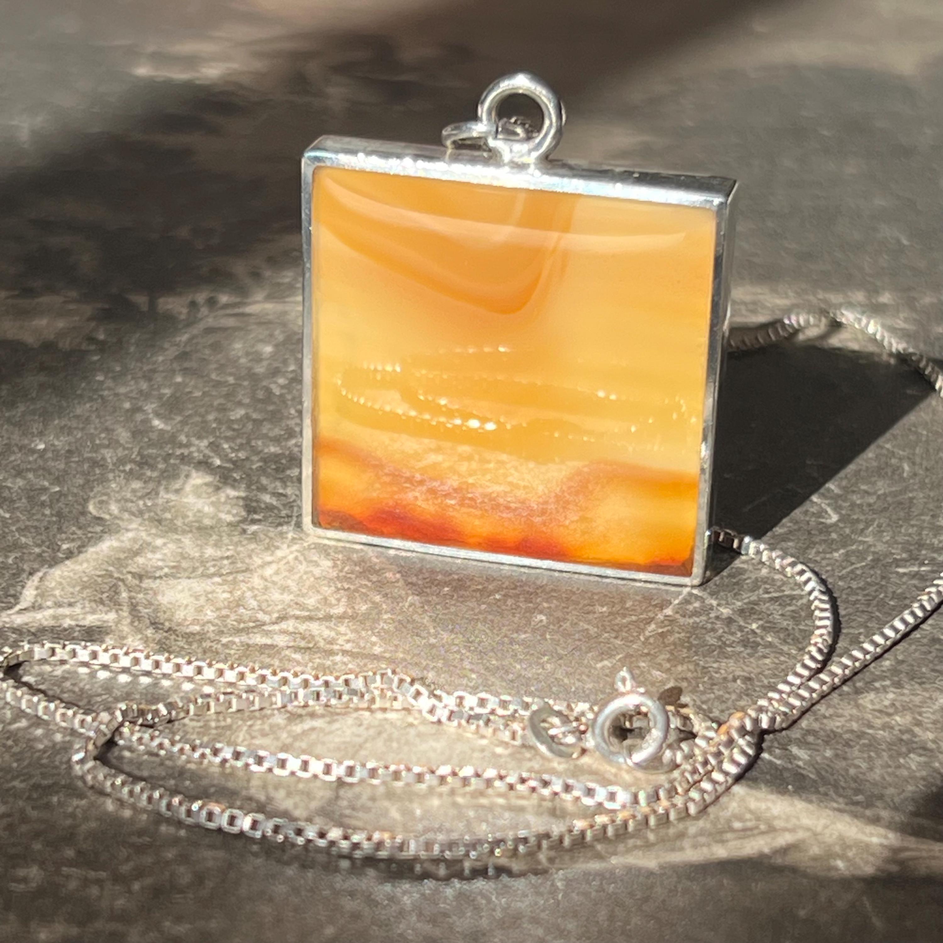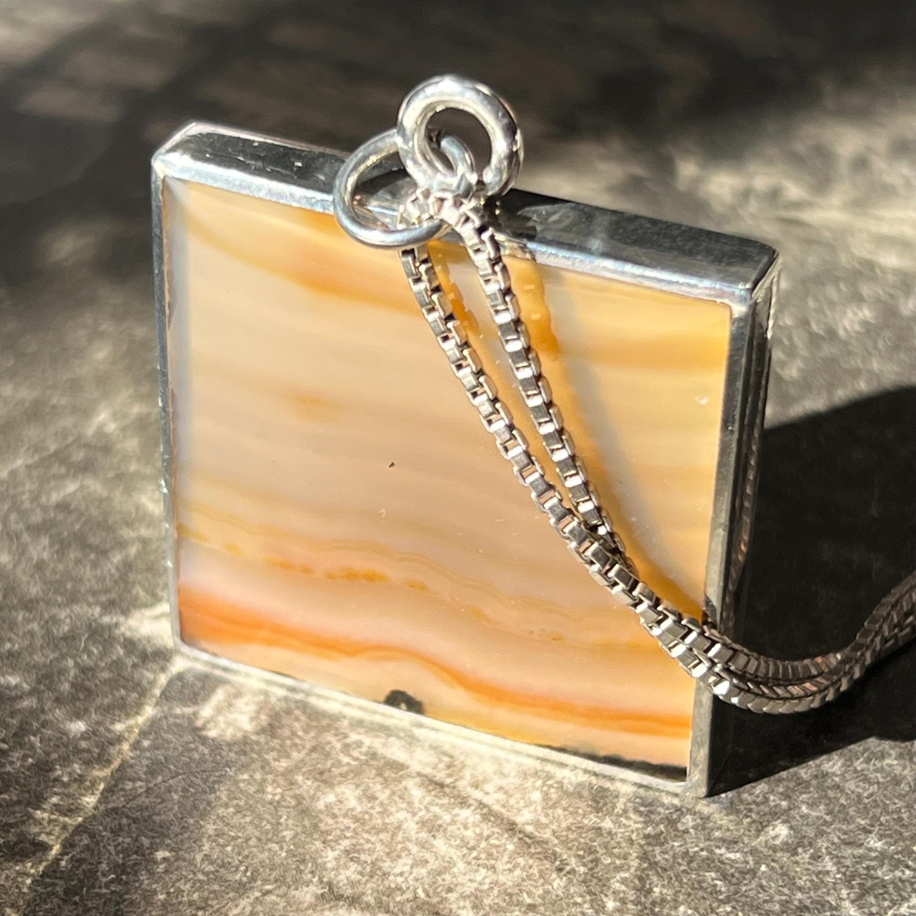 A bold and beautifully balanced vintage sterling silver double-sided pendant by British designer Ralph Weston, hallmarked in Sheffield and dated 1976. This striking retro 1970s piece features butterscotch banded agate to both sides of the pendant, each with its own unique natural pattern and warm amber tones. The reversible design allows for subtle variation depending on how it’s worn.