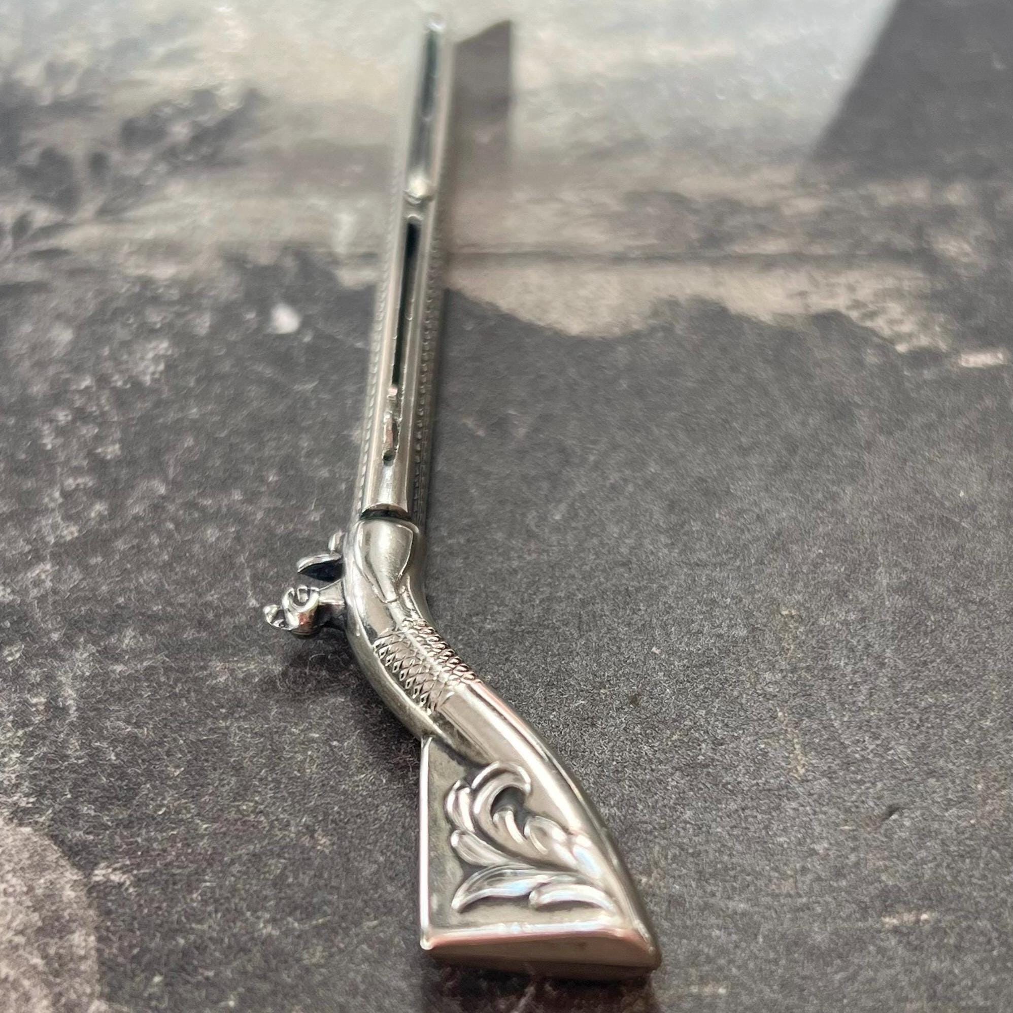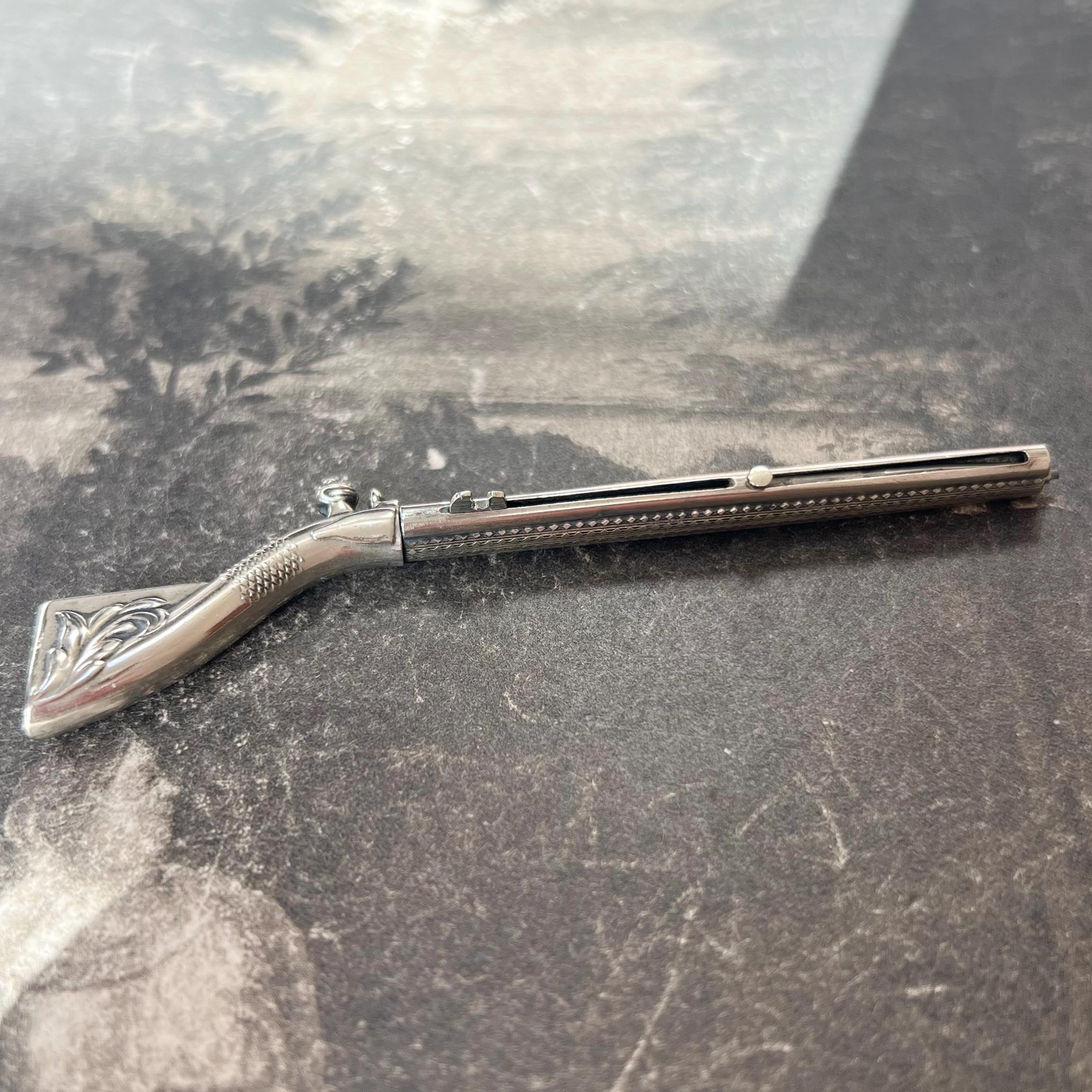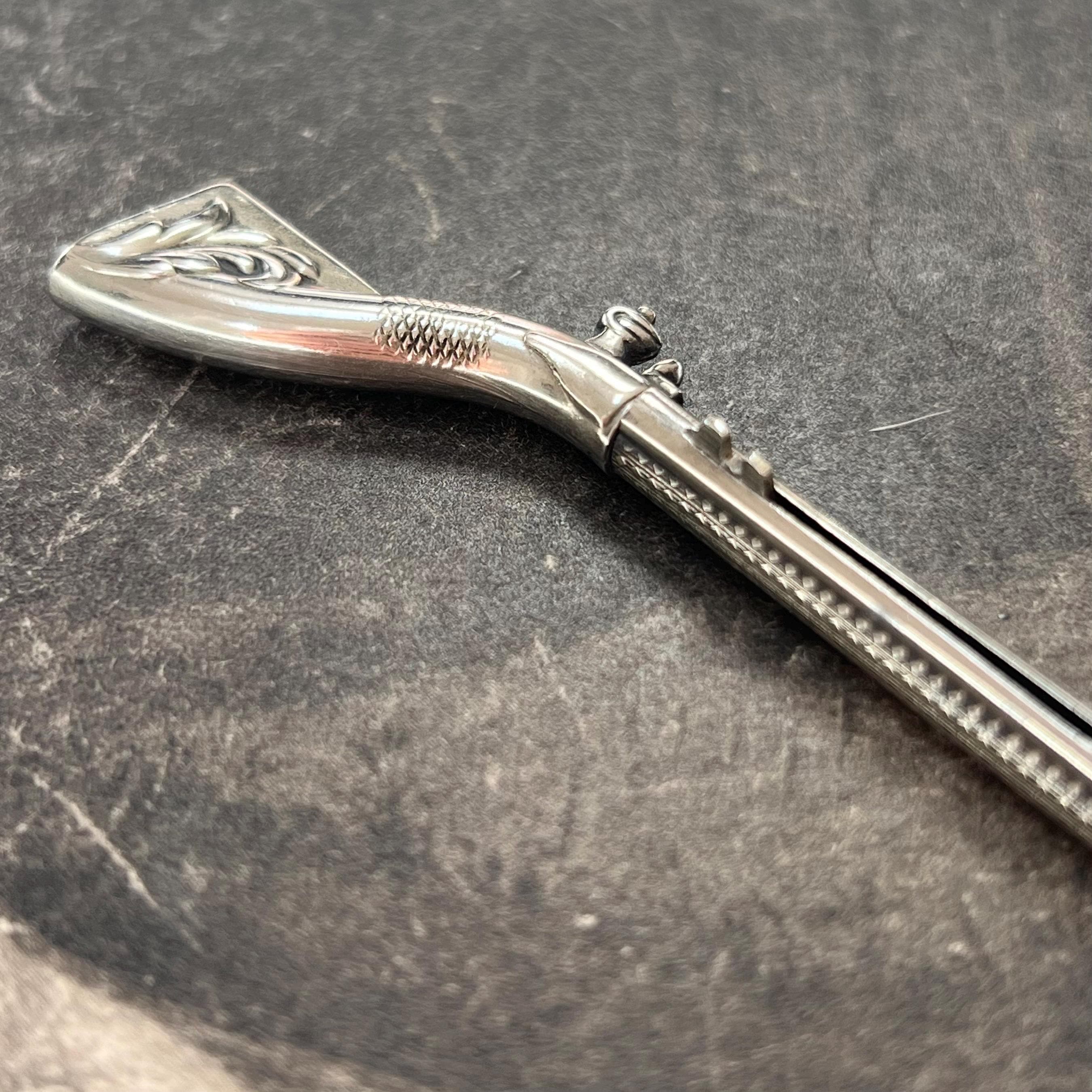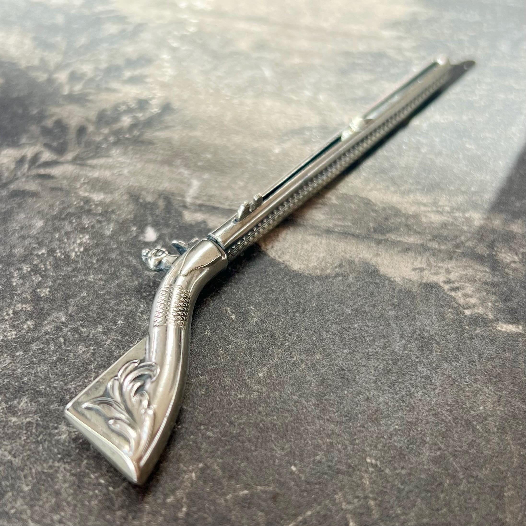 A rare and highly unusual antique novelty propelling pencil and toothpick combination, crafted in the form of a flintlock rifle (musket) and dating to circa 1900. This charming figural piece features fine engraved detailing, capturing the form of a miniature firearm.