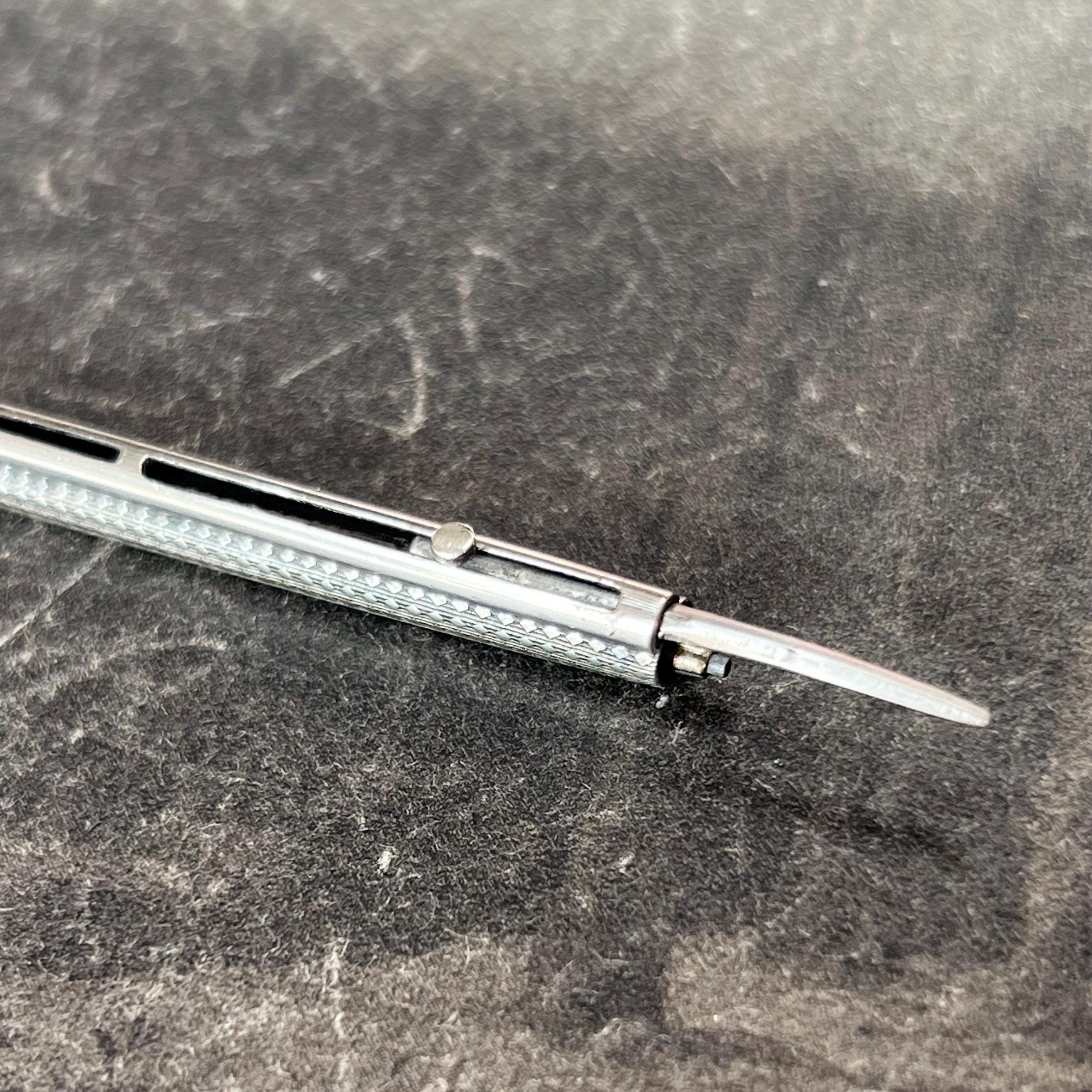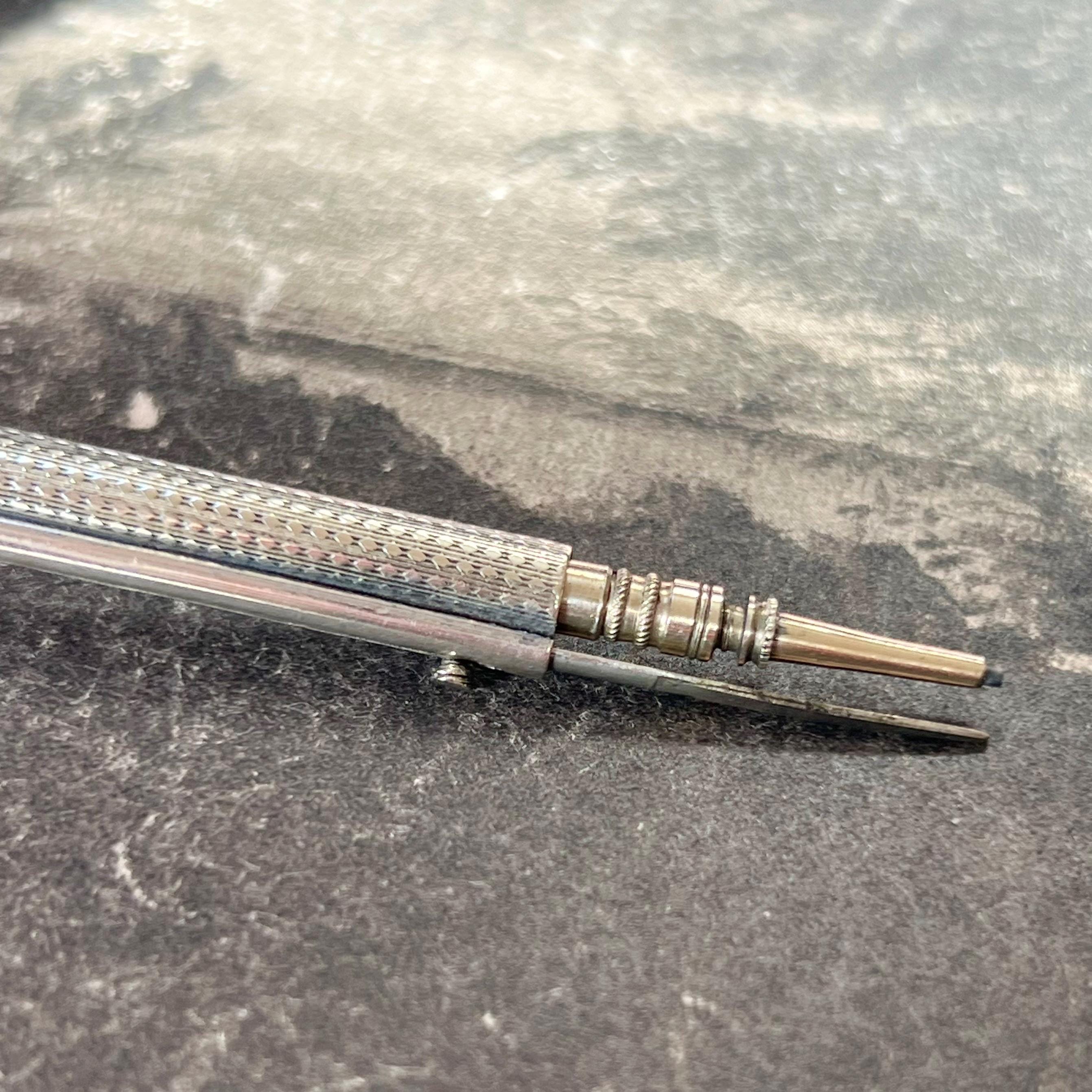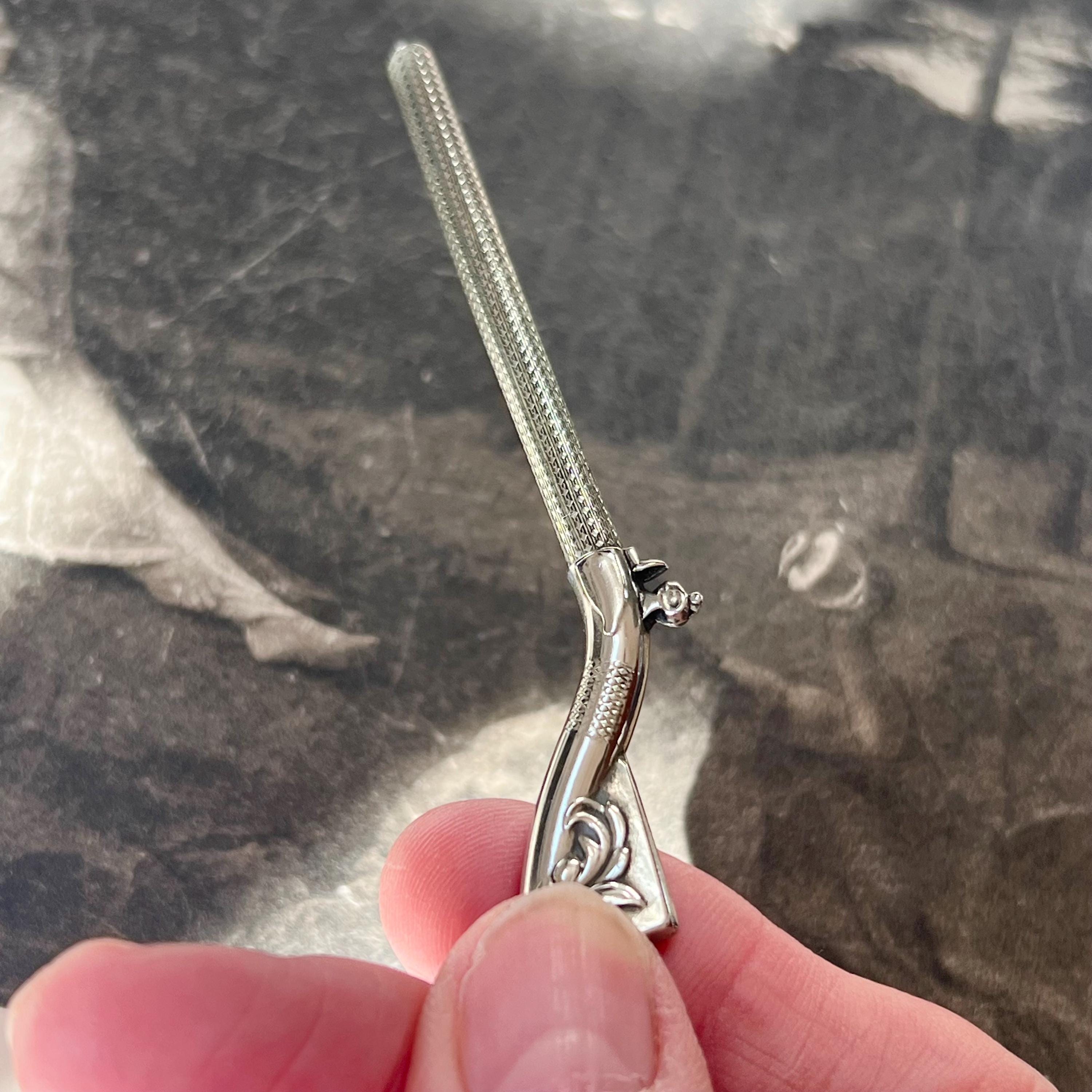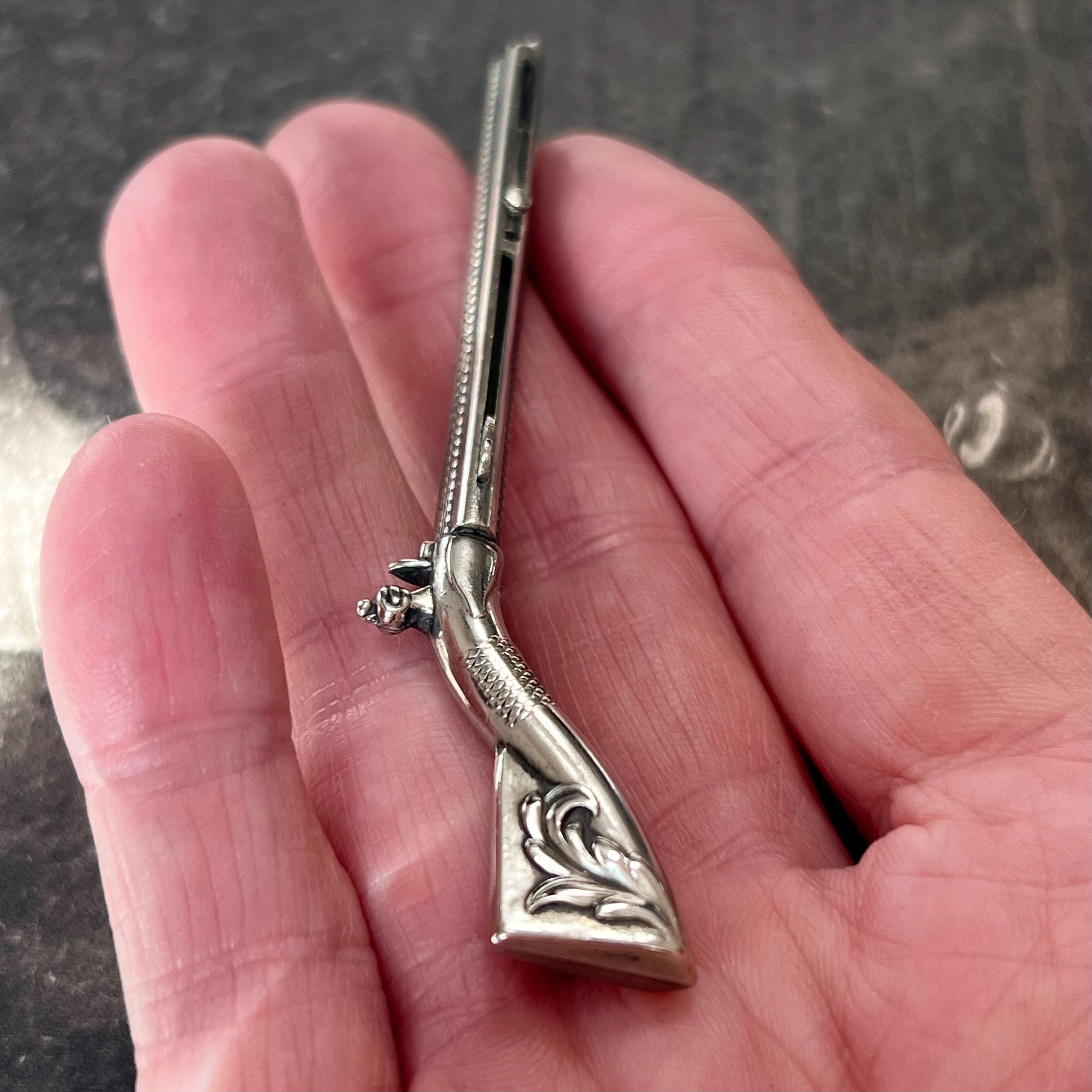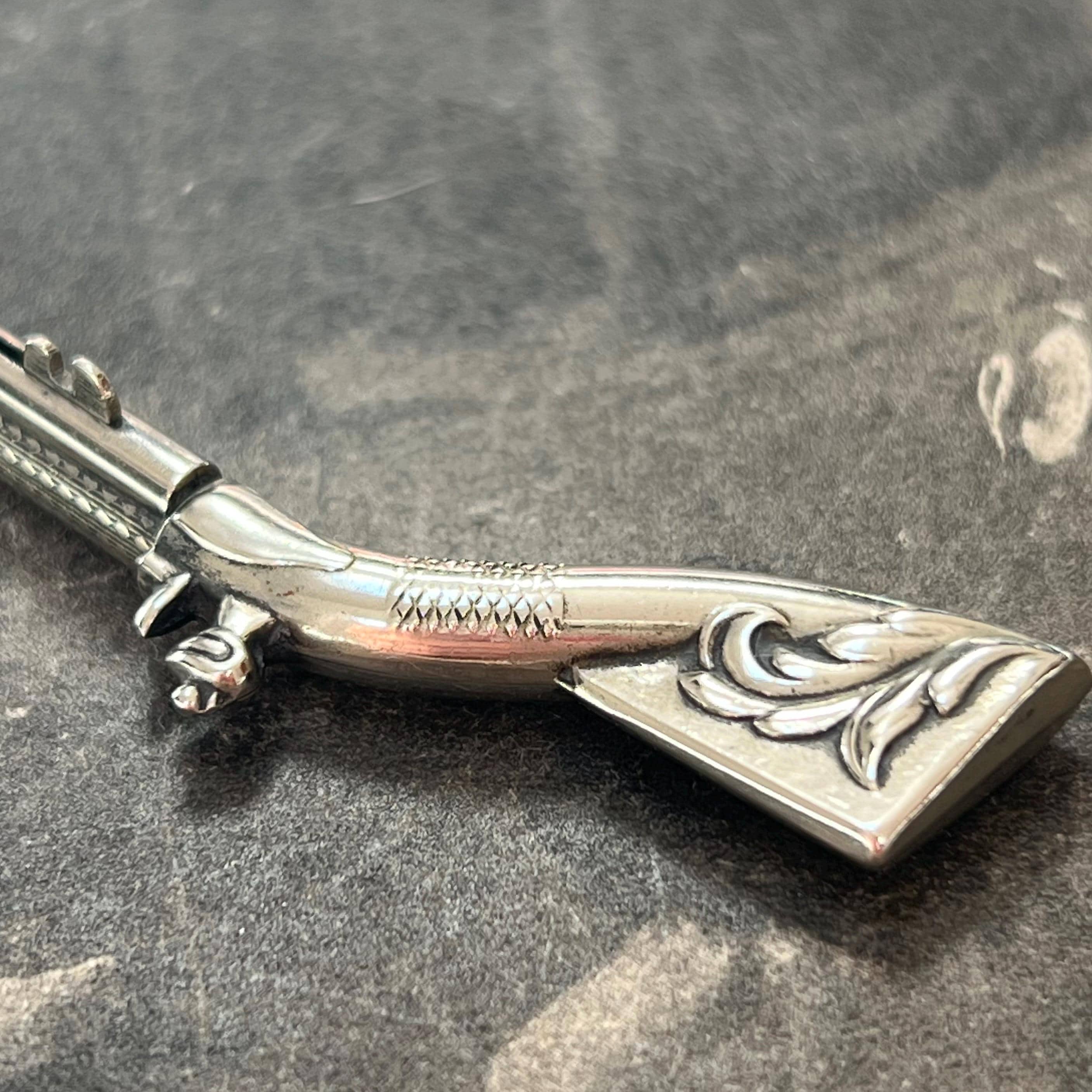 A rare and highly unusual antique novelty propelling pencil and toothpick combination, crafted in the form of a flintlock rifle (musket) and dating to circa 1900. This charming figural piece features fine engraved detailing, capturing the form of a miniature firearm.
