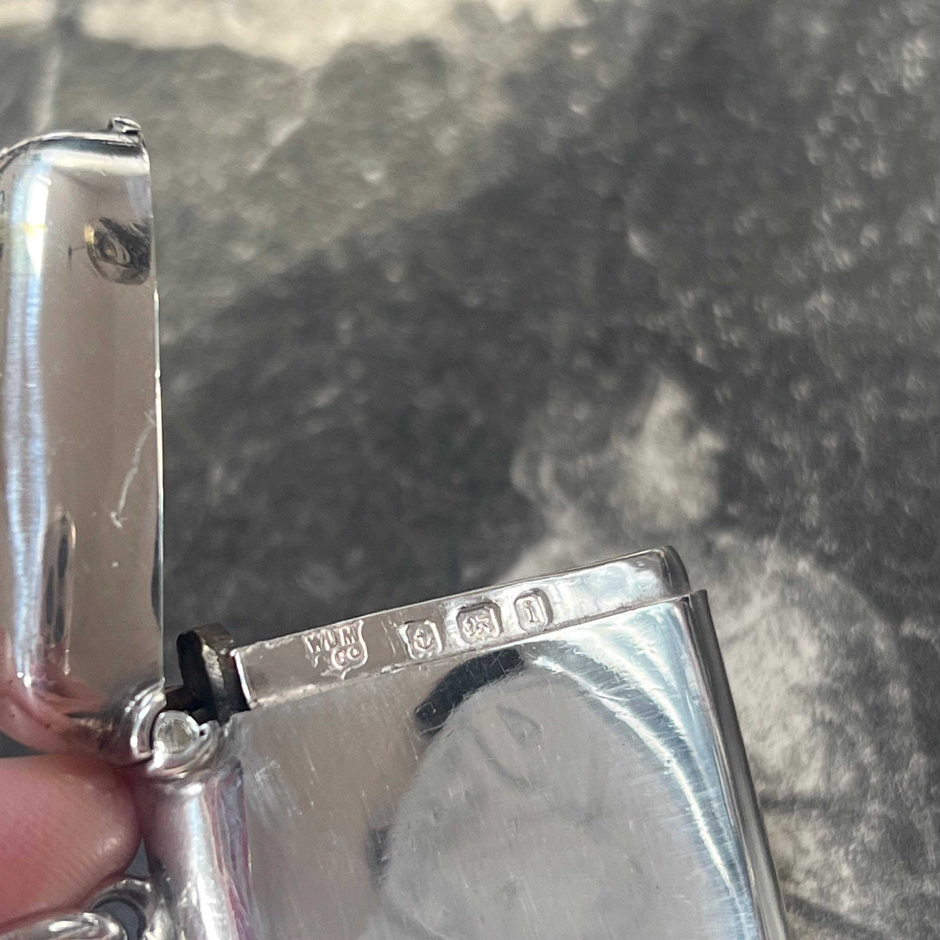 Genuine antique sterling silver (lion passant),Hallmarked Birmingham, 1908–1909,Maker: W.J. Myatt & Co. Edwardian era keepsake / vesta case, Size: 43 mm x 32 mm x 8.7 mm, Weight: 19.7 g.