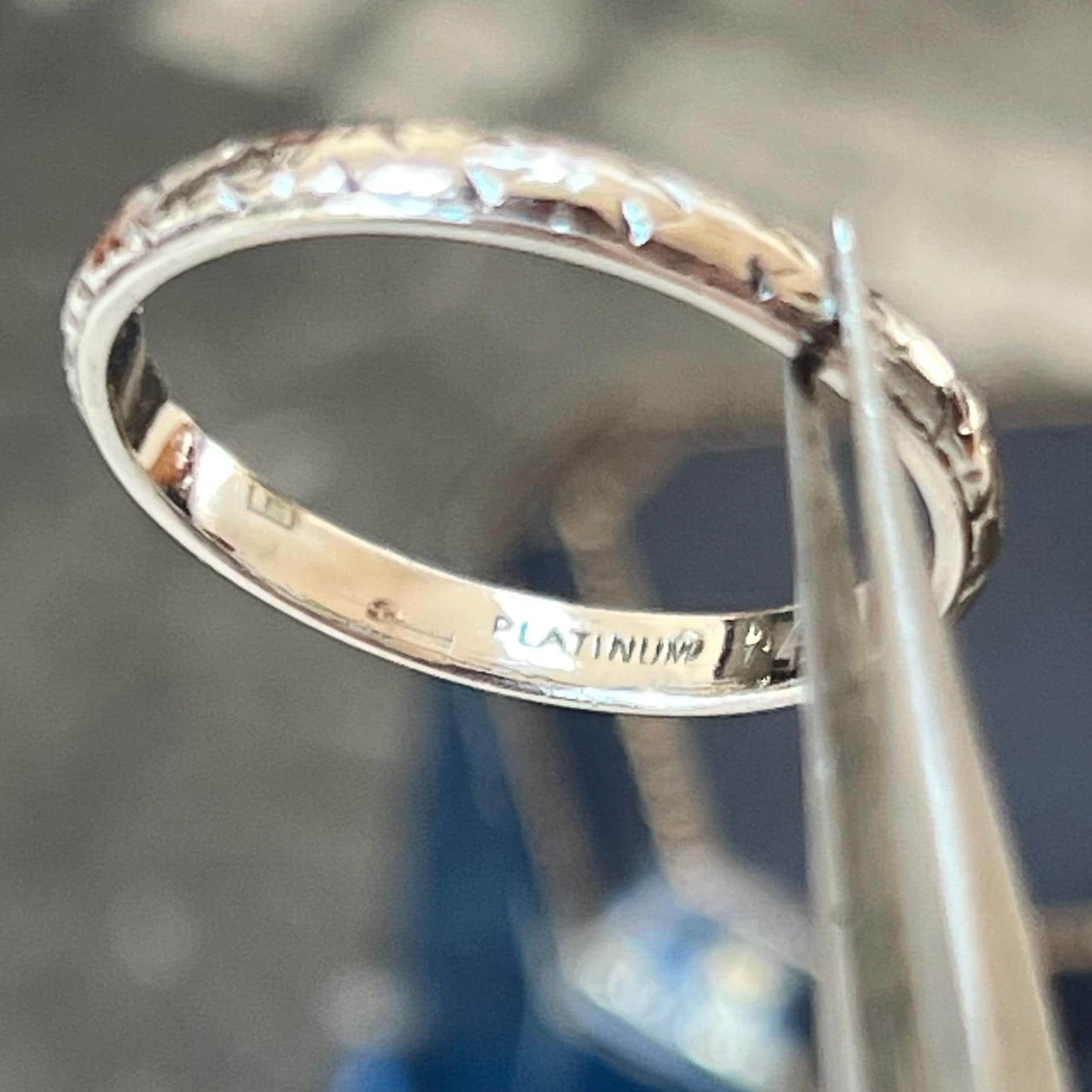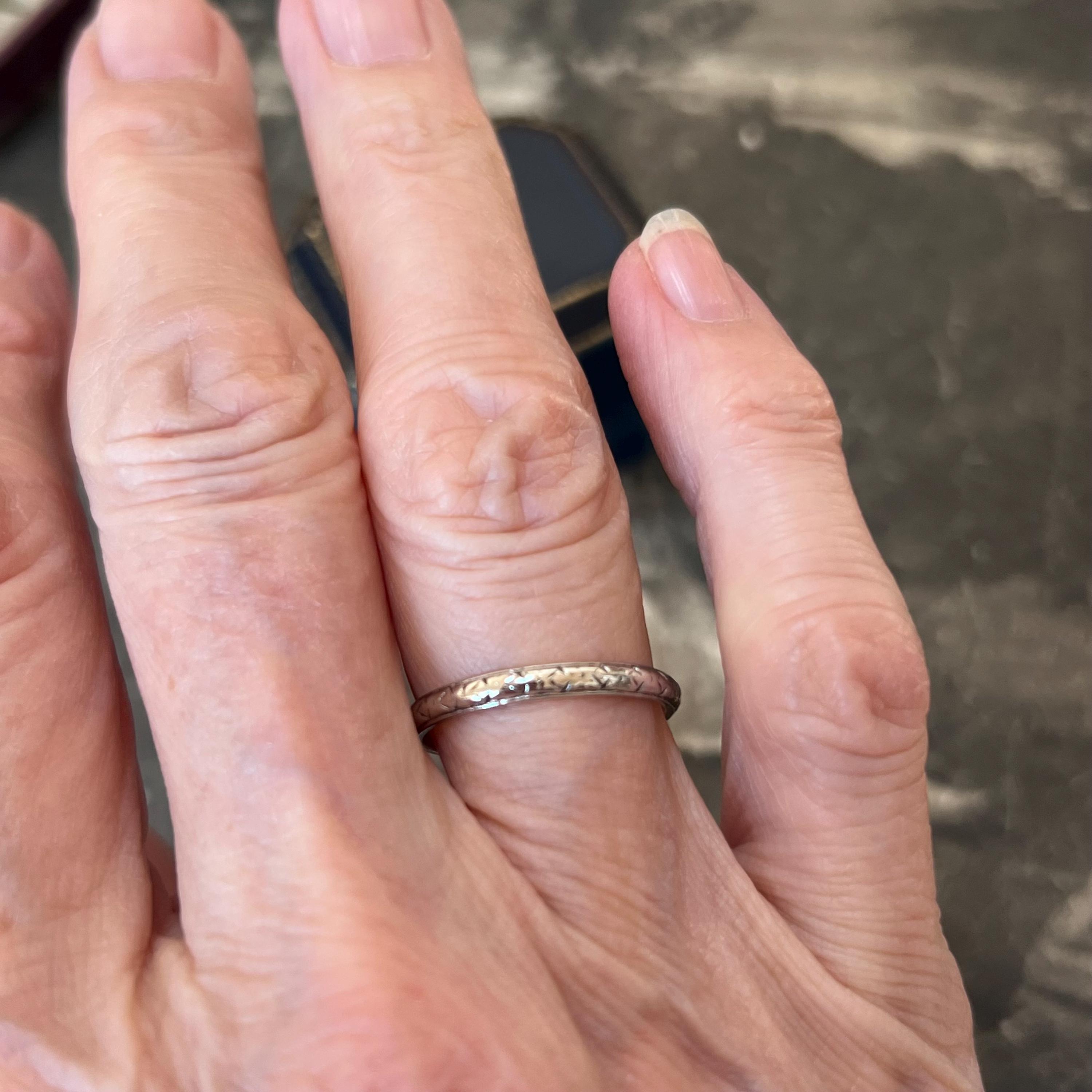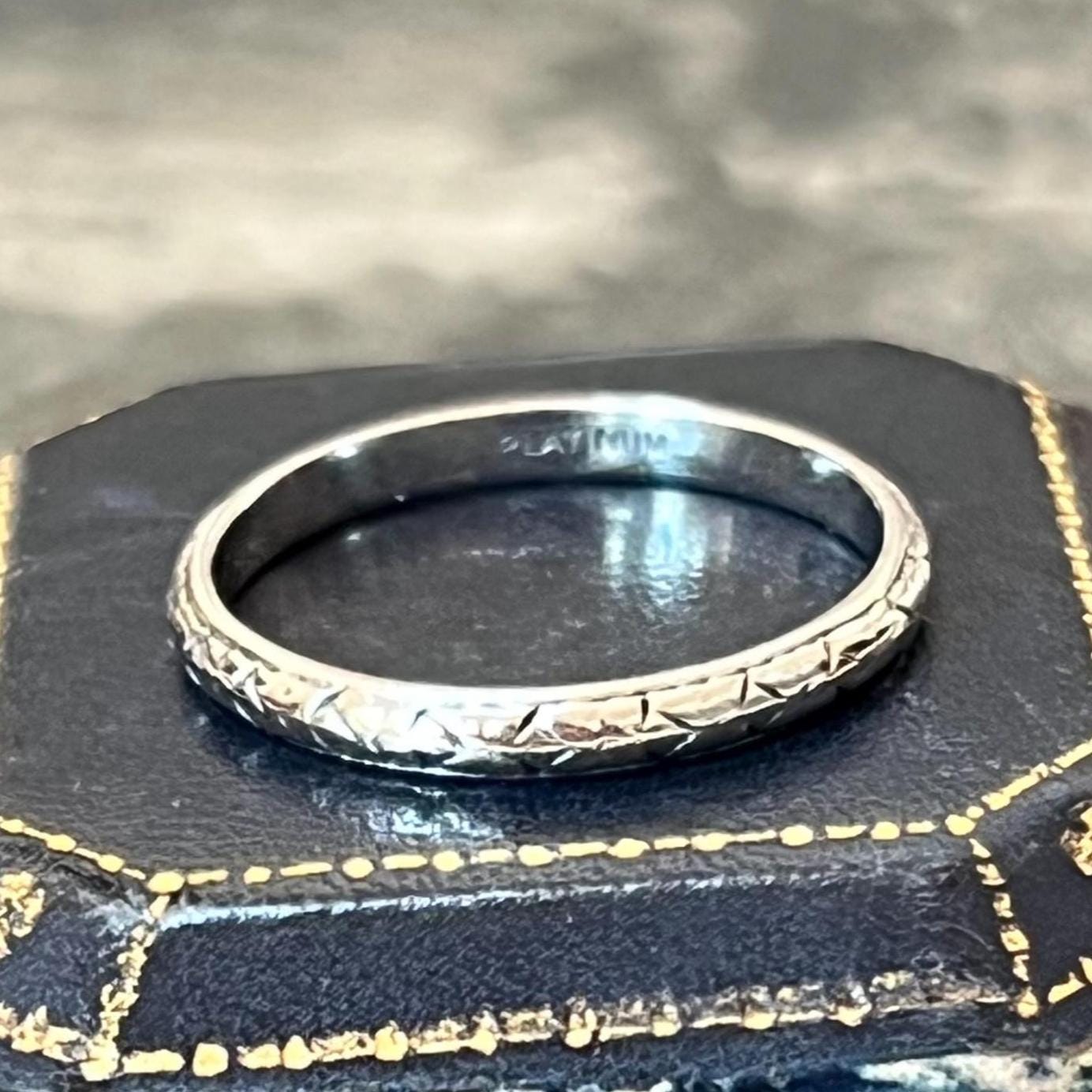 Platinum wedding ring, circa 1920s–1930s. The ring has a D-shaped profile, measuring 2.5mm wide with a depth of 1.5mm, and weighs 3 grams. It is fully stamped PLATINUM and tests as solid platinum. The ring shows light age-related wear consistent with its history, enhancing its authentic antique character and charm.